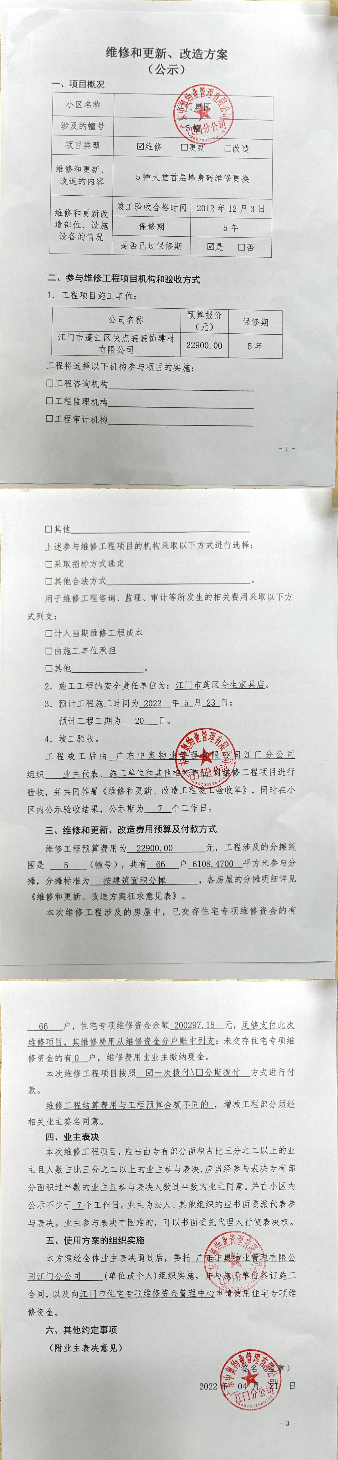 <td VALIGN="top" VALUES="" STYLE="border-width:0" BINDTYPE="0" ROWSPAN="19" COLSPAN="7" DATASOURCE="投票结果" ><font style="font-size:14pt;"><p style="text-align: left; font-family: 宋体; font-size: 16px; line-height: 1.75em;"><span style="font-family: 宋体;">江门奥园江门奥园5幢全体业主:</span></p><p style="text-align: left; font-family: 宋体; font-size: 16px; line-height: 1.75em; text-indent: 2em;">本小区关于江门奥园关于使用维修资金修复5栋大堂首层公共部位墙身砖的投票的投票已表决结束,询异时间从2022年06月11日开始,投票询异公示期间,业主可通过微信查询自己的表决情况或可凭身份证件赴发起机构申请查询自己的表决情况;如公示的业主表决情况与在服务平台查询的本人表决意见不一致的,可以以书面形式向发起机构核查。经核查业主反映情况属实的,发起机构应当予以纠正并重新公示表决结果。</p><p><br/></p><p style="text-align: left; font-family: 宋体; font-size: 16px; line-height: 1.75em;"><strong><span style="font-family: 宋体">附件:</span></strong></p><p style="text-align: left; font-family: 宋体; font-size: 16px; line-height: 1.75em;"><strong>一、投票范围</strong></p><p style="text-align: left; font-family: 宋体; font-size: 16px; line-height: 1.75em; text-indent: 2em;">江门奥园江门奥园5幢</p><p style="text-align: left; font-family: 宋体; font-size: 16px; line-height: 1.75em; text-indent: 2em;">总人数(专有部分人数之和):66</p><p style="text-align: left; font-family: 宋体; font-size: 16px; line-height: 1.75em; text-indent: 2em;">建筑物总面积(专有部分面积之和):6108.47㎡</p><p style="text-align: left; font-family: 宋体; font-size: 16px; line-height: 1.75em;"><strong>二、投票起止时间</strong></p><p dir="ltr" style="text-align: left; font-family: 宋体; font-size: 16px; line-height: 1.75em; text-indent: 2em;">投票表决时间:从2022年04月24日到2022年06月10日止</p><p dir="ltr" style="text-align: left; font-family: 宋体; font-size: 16px; line-height: 1.75em; text-indent: 2em;">投票询异公示时间:从2022年06月11日开始</p><p dir="ltr" style="text-align: left; font-family: 宋体; font-size: 16px; line-height: 1.75em; text-indent: 2em;">投票结果通知公告时间:从2022年06月18日开始<br/></p><p style="text-align: left; font-family: 宋体; font-size: 16px; line-height: 1.75em;"><strong>三、投票详细描述</strong></p><p style="text-align: left; font-family: 宋体; font-size: 16px; line-height: 1.75em; text-indent: 2em;"><p>5栋的首层大堂出现空鼓、脱离,经检查,是由于 时间年限问题,导致瓷砖胶黏接力不足,已过保修期。现需申请使用维修资金对5栋首层大堂维修,工程维修预算金额为 22900.00 元,项目最终费用以施工合同签订金额为准。维修费用的分摊标准为 按建筑面积分摊 每平方约3.75元 ,详见公示附件。如业主手机不能正常通过微信投票,请联系物业公司进行线下纸质投票,物业电话:0750-3288221</p></p><p style="text-align: left; font-family: 宋体; font-size: 16px; line-height: 1.75em;"><strong>四、计票规则</strong></p><p style="text-align: left; font-family: 宋体; font-size: 16px; line-height: 1.75em; text-indent: 2em;">表决事项:使用建筑物及其附属设施的维修资金<br /><p style='text-align: left; font-family: 宋体; font-size: 16px; line-height: 1.75em; text-indent: 2em;'>计票规则:弃权票不并入其它项</p></p><p style="text-align: left; font-family: 宋体; font-size: 16px; line-height: 1.75em;"><strong>五、通过规则</strong></p><p style="text-align: left; font-family: 宋体; font-size: 16px; line-height: 1.75em; text-indent: 2em;"><span style="font-family: 宋体; text-indent: 32px;">表决事项:使用建筑物及其附属设施的维修资金<br /><p style='text-align: left; font-family: 宋体; font-size: 16px; line-height: 1.75em; text-indent: 2em;'>通过规则:参与表决专有部分面积过半数的业主且参与表决人数过半数的业主同意</p></span></p><p style="text-align: left; font-family: 宋体; font-size: 16px; line-height: 1.75em;"><strong>六、投票结果</strong></p><p style="text-align: left; font-family: 宋体; font-size: 16px; line-height: 1.75em; text-indent: 2em;"><div id='resultTable'><table style='table-layout: fixed; font-size:12px; margin-top:10px' width='100%' border='0' cellspacing='0' cellpadding='0'><tr><td height='28' colspan='10' align='center' style='border: 1px solid #666'><strong style='font-size: 14px;'> 使用建筑物及其附属设施的维修资金</strong></td> </tr><tr id='trfirst'><td height='28' colspan='4' style='border-left: 1px solid #666; border-bottom: 1px solid #666'><strong>&nbsp;申报单位:</strong> 广东中奥物业管理有限公司江门分公司</td><td colspan='3' style='border-left: 1px solid #666; border-bottom: 1px solid #666'><strong>&nbsp;联系方式:</strong> </td><td colspan='3' style='border-left: 1px solid #666; border-bottom: 1px solid #666; border-right: 1px solid #666'><strong>&nbsp;申报日期:</strong> 2022年4月21日 </td></tr><tr> <td height='28' colspan='5' style='border-left: 1px solid #666; border-bottom: 1px solid #666'><strong>&nbsp;总人数(专有部分人数之和):</strong>66人 </td><td colspan='5' style='border-left: 1px solid #666; border-bottom: 1px solid #666; border-right: 1px solid #666'><strong>&nbsp;建筑物总面积(专有部分面积之和):</strong>6108.47㎡ </td> </tr><tr><td height='28' colspan='10' style='border: 1px solid #666'><strong>&nbsp;该事项表决是否通过:未通过</strong></td></tr><tr><td height='28' colspan='10' bgcolor='#F3F3F3' style='border-left: 1px solid #666;border-bottom: 1px solid #666;border-right: 1px solid #666'><strong>&nbsp;参与人数及面积统计</strong></td></tr><tr><td height='28' colspan='5' style='border-left: 1px so