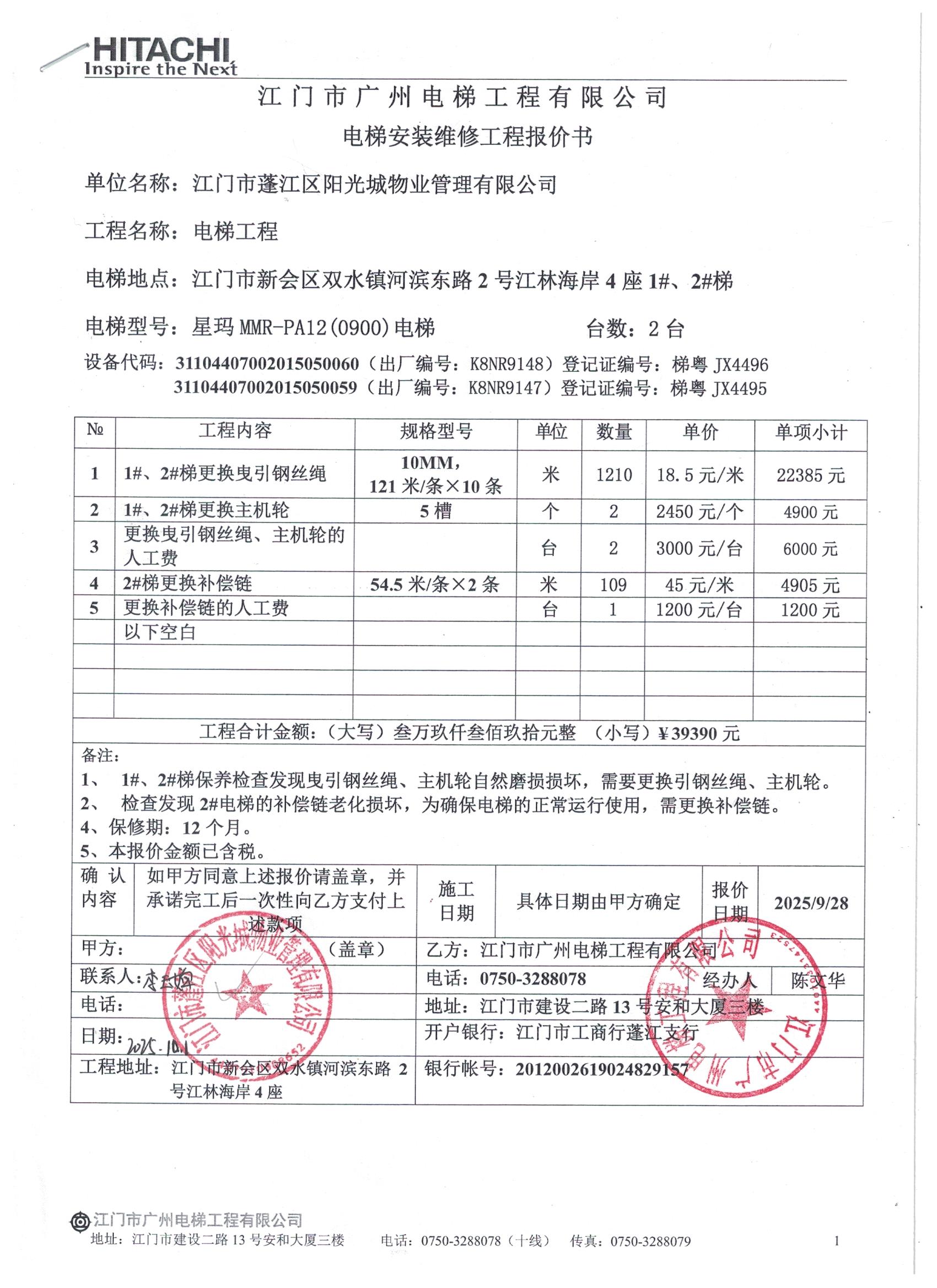 <td VALIGN="top" VALUES="" STYLE="border-width:0" BINDTYPE="0" ROWSPAN="18" COLSPAN="7" DATASOURCE="投票内容" ><font style="font-size:12pt;"><p style="text-align: left; font-family: 宋体; font-size: 16px; line-height: 1.75em;"><strong style="text-align: left; line-height: 1.75em;">一、投票范围</strong><br/></p><p style="white-space: normal; font-family: 宋体; font-size: 16px; line-height: 1.75em; text-indent: 2em;">江林海岸江林海岸4座</p><p style="white-space: normal; font-family: 宋体; font-size: 16px; line-height: 1.75em; text-indent: 2em;">总人数(专有部分人数之和):46</p><p style="white-space: normal; font-family: 宋体; font-size: 16px; line-height: 1.75em; text-indent: 2em;"><span style="font-family: 宋体; text-indent: 32px;">总户数:50</span></p><p style="white-space: normal; font-family: 宋体; font-size: 16px; line-height: 1.75em; text-indent: 2em;">建筑物总面积(专有部分面积之和):6339.03㎡</p><p style="white-space: normal; font-family: 宋体;font-size: 16px; line-height: 1.75em;"><strong>二、投票起止时间</strong></p><p style="white-space: normal; font-family: 宋体; line-height: 1.75em; text-indent: 2em;">投票表决时间:从2025年11月11日到2025年12月11日止</p><p style="white-space: normal; font-family: 宋体; line-height: 1.75em; text-indent: 2em;">投票补录时间:从2025年12月12日到2025年12月17日止</p><p style="white-space: normal; font-family: 宋体;font-size: 16px; line-height: 1.75em;"><strong>三、投票详细描述</strong></p><p style="white-space: normal; font-family: 宋体; font-size: 16px; line-height: 1.75em; text-indent: 2em;"><p>&nbsp; 江林海岸4座1#电梯(梯粤JX4495)和2#电梯(梯粤JX4496)在保养检查发现曳引钢丝绳和主机轮在日常使用中出现自然磨损损坏,钢丝绳拉伸过长、变细,钢丝绳直径比原直径减小10%,已达到国家报废标准,钢丝绳直径减少会使电梯摩檫力减少其承载能力大幅下降存在安全隐患,钢丝绳拉伸过长会使电梯在运行时对重缓冲距离越来越小,压住液压缓冲器,造成开关失效引起电梯故障;同时发现2#电梯(梯粤JX4496)运行时出现异响及抖动,经检查,是由于电梯的补偿链老化破损,导致补偿链在底坑运行的弯曲度连续性发生变化,造成电梯抖动,严重时会刮到导向轮和护板,造成电梯故障,需要停梯更换补偿。</p><p>&nbsp; 现对4座1#电梯进行更换曳引钢丝绳、主机轮和2#电梯更换曳引钢丝绳、主机轮及补偿链,工程维修预算金额为39390元,项目最终费用以施工合同签订金额为准。因已过保修期,维修费用由相关业主按建筑面积分摊,每平方约6.214元,详见公示附件。如业主手机不能正常通过微信投票,请联系物业公司进行线下纸质投票,物业电话:0750-6412233。</p><p><br/></p></p><p style="white-space: normal; font-family: 宋体;font-size: 16px; line-height: 1.75em;"><strong>四、计票规则</strong></p><p style="white-space: normal; font-family: 宋体; font-size: 16px; line-height: 1.75em; text-indent: 2em;"><span style="font-family: 宋体; text-indent: 32px;">表决事项:使用建筑物及其附属设施的维修资金<br /><p style='text-align: left; font-family: 宋体; font-size: 16px; line-height: 1.75em; text-indent: 2em;'>计票规则:弃权票不并入其它项&nbsp;&nbsp;&nbsp;&nbsp;未表决票不并入其它项</p></span></p><p style="white-space: normal; font-family: 宋体;font-size: 16px; line-height: 1.75em;"><strong>五、通过规则</strong></p><p style="white-space: normal; font-family: 宋体;font-size: 16px; line-height: 1.75em;"><strong>&nbsp; 根据《中华人民共和国民法典》第二百七十八条规定:业主共同决定事项,应当由专有部分面积占比三分之二以上的业主且人数占比三分之二以上的业主参与表决。</strong></p><p style="white-space: normal; font-family: 宋体; font-size: 16px; line-height: 1.75em; text-indent: 2em;"><span style="font-family: 宋体; text-indent: 32px;">表决事项:使用建筑物及其附属设施的维修资金<br /><p style='text-align: left; font-family: 宋体; font-size: 16px; line-height: 1.75em; text-indent: 2em;'>通过规则:双2/3以上参与表决,参与表决双过半同意</p></span><span style="font-family: 宋体; text-indent: 32px;"></span></p><p style="text-align: left; font-family: 宋体; font-size: 16px; line-height: 1.75em;"><strong>六、投票方式</strong></p><p style="text-align: left; font-family: 宋体; font-size: 16px; line-height: 1.75em; text-indent: 2em;"><span style="font-size: 16px; font-family: 宋体">在投票事项通知公告日起,请业主扫描二维码或者关注微信公众号(<strong>江门住建</strong>)查看详细情况并进行投票。</span></p><p style="text-align: center; font-family: 宋体; font-size: 16px; line-height: 1.75em; text-indent: 2em;"><span style="font-size: 16px; font-family: 宋体"><strong style="font-family: 宋体; text-align: center; white-space: normal; line-height: 1.75em;"><img src="http://jmzjj.jiangmen.cn:8071/Areas/Custom/Content/images/jmzjybs.jpg"/></strong></span></p><p style="text-align: right; font-family: 宋体; font-size: 16px; line-height: 1.75em; text-indent: 2em;"><span style="text-align: right;">申报单位(盖章):江门市蓬江区阳光城物业管理有限公司</span></p><p style="text-align: right; font-family: 宋体; font-size: 16px; line-height: 1.75em;">2025年11月11日</p></font></td>