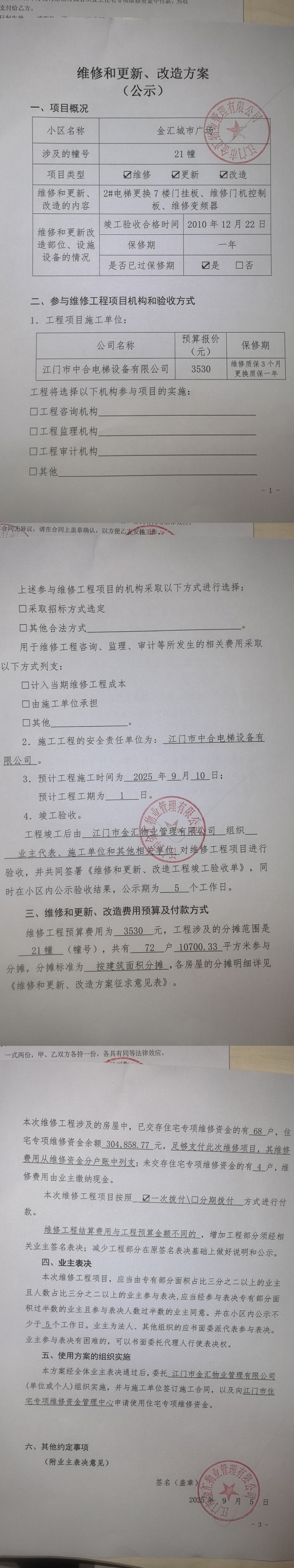 <td VALIGN="top" VALUES="" STYLE="border-width:0" BINDTYPE="0" ROWSPAN="19" COLSPAN="7" DATASOURCE="投票结果" ><font style="font-size:14pt;"><p style="white-space: normal; font-family: 宋体; line-height: 1.75em;">金汇城市广场蓬江区金汇城市广场21幢全体业主:</p><p style="white-space: normal; font-family: 宋体; line-height: 1.75em; text-indent: 2em;">本小区关于金汇城市广场关于21幢2#电梯更换门挂板、维修门机控制板、维修变频器工程维修资金的投票的投票已表决结束,询异时间从2026年03月05日开始,投票询异公示期间,业主可通过微信查询自己的表决情况或可凭身份证件申请查询自己的表决情况;如公示的业主表决情况与查询的本人表决意见不一致的,可以以书面形式向投票组织机构申诉,投票组织机构予以纠正并重新公示表决结果。异议提出人对投票组织机构的处理仍有异议的,可以向街道办事处(镇人民政府)反映处理,涉及住宅专项维修资金的,可向属地住宅专项维修资金管理中心反映处理。</p><p style="white-space: normal;"><br/></p><p style="white-space: normal; font-family: 宋体; line-height: 1.75em;"><strong>附件:</strong></p><p style="white-space: normal; font-family: 宋体; line-height: 1.75em;"><strong>一、投票范围</strong></p><p style="white-space: normal; font-family: 宋体; line-height: 1.75em; text-indent: 2em;">金汇城市广场蓬江区金汇城市广场21幢</p><p style="white-space: normal; font-family: 宋体; line-height: 1.75em; text-indent: 2em;">总人数(专有部分人数之和):72</p><p style="white-space: normal; font-family: 宋体; line-height: 1.75em; text-indent: 2em;"><span style="font-family: 宋体, SimSun;"><span style="font-family: 宋体; text-indent: 32px;"><span style="font-family: 宋体; text-indent: 32px;">总户数:72</span></span></span></p><p style="white-space: normal; font-family: 宋体; line-height: 1.75em; text-indent: 2em;">建筑物总面积(专有部分面积之和):10700.33㎡</p><p style="white-space: normal; font-family: 宋体; line-height: 1.75em;"><strong>二、询异公示起止时间</strong></p><p dir="ltr" style="white-space: normal; font-family: 宋体; line-height: 1.75em; text-indent: 2em;"><span style="text-indent: 36px;">2026年03月05日至2026年03月12日</span></p><p style="white-space: normal; font-family: 宋体; line-height: 1.75em;"><strong>三、投票详细描述</strong></p><p style="white-space: normal; font-family: 宋体; line-height: 1.75em; text-indent: 2em;"><p><span style="font-family: "Helvetica Neue", Helvetica, Arial, sans-serif; font-size: 14px; background-color: rgb(255, 255, 255);">金汇城市广场21幢2#电梯突然出现故障,经检查,由于<span style="font-family: "Helvetica Neue", Helvetica, Arial, sans-serif; font-size: 14px; background-color: rgb(255, 255, 255);">2#电梯</span>门挂板、门机控制板、变频器原件出现老化而不能正常运行。现对<span style="font-family: "Helvetica Neue", Helvetica, Arial, sans-serif; font-size: 14px; background-color: rgb(255, 255, 255);">21幢2#电梯</span>相关设备进行更换、维修,工程维修预算金额为3530元,项目最终费用以施工合同签订金额为准。因已过保修期,维修费用由相关业主按建筑面积分摊,每平方约0.32元,详见公示附件。 如业主手机不能正常通过微信投票,请联系物业公司进行线下纸质投票,物业电话:0750-3929003。</span></p></p><p style="white-space: normal; font-family: 宋体; line-height: 1.75em;"><strong>四、计票规则</strong></p><p style="white-space: normal; font-family: 宋体; line-height: 1.75em; text-indent: 2em;">表决事项:使用建筑物及其附属设施的维修资金<br /><p style='text-align: left; font-family: 宋体; font-size: 16px; line-height: 1.75em; text-indent: 2em;'>计票规则:弃权票不并入其它项 未表决票不并入其它项</p></p><p style="white-space: normal; font-family: 宋体; line-height: 1.75em;"><strong>五、通过规则</strong></p><p style="white-space: normal; font-family: 宋体; line-height: 1.75em;"><strong><strong style="white-space: normal;"><span style="font-family: 宋体, SimSun;"> 根据《中华人民共和国民法典》第二百七十八条规定:业主共同决定事项,应当由专有部分面积占比三分之二以上的业主且人数占比三分之二以上的业主参与表决。</span></strong></strong></p><p style="white-space: normal; font-family: 宋体; line-height: 1.75em; text-indent: 2em;">表决事项:使用建筑物及其附属设施的维修资金<br /><p style='text-align: left; font-family: 宋体; font-size: 16px; line-height: 1.75em; text-indent: 2em;'>通过规则:双2/3以上参与表决,参与表决双过半同意</p></p><p style="white-space: normal; font-family: 宋体; line-height: 1.75em;"><strong>六、投票结果</strong></p><p style="white-space: normal; font-family: 宋体; line-height: 1.75em; text-indent: 2em;"><div id='resultTable'><table style='table-layout: fixed; font-size:12px; margin-top:10px' width='100%' border='0' cellspacing='0' cellpadding='0'><tr><td height='28' colspan='10' align='center' style='border: 1px solid #666'><strong style='font-size: 14px;'> 使用建筑物及其附属设施的维修资金</strong></td> </tr><tr id='trfirst'><td height='28' colspan='4' style='border-left: 1px solid #666; border-bottom: 1px solid #666'><strong> 申报单位:</strong> 江门市金汇物业管理有限公司</td><td colspan='3' style='border-left: 1px solid #666; border-bottom: 1px solid #666'><strong> 联系方式:</strong> 3929003 </td><td colspan='3' style='border-left: 1px solid #666; border-bottom: 1px solid #666; border-right: 1px solid #666'><strong> 申报日期:</strong> 2025年9月19日 </td></tr><tr> <td height='28' colspan='5' style='border-left: 1px solid #666; border-bottom: 1px solid #666'><strong> 总人数(专有部