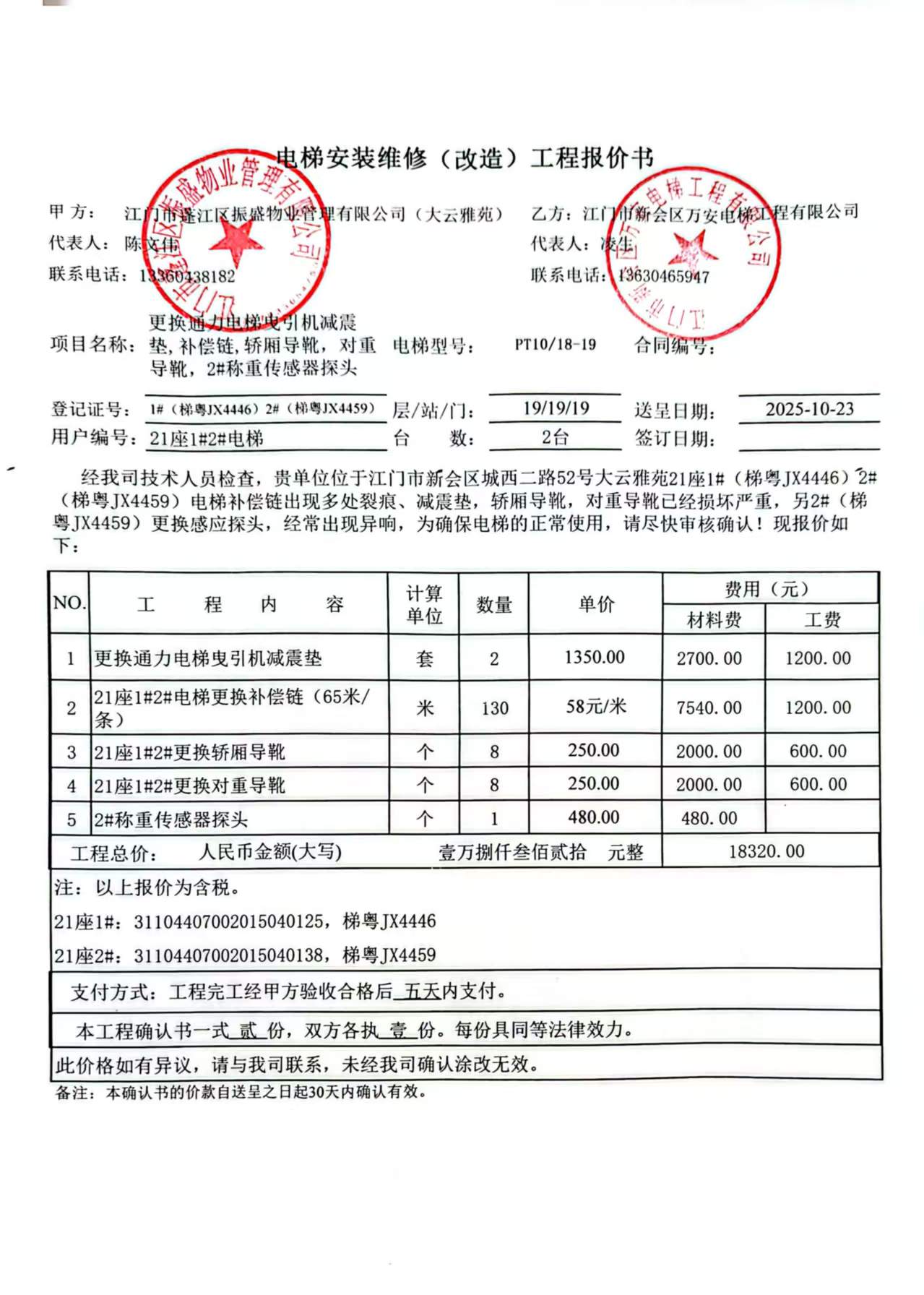 <td VALIGN="top" VALUES="" STYLE="border-width:0" BINDTYPE="0" ROWSPAN="19" COLSPAN="7" DATASOURCE="投票结果" ><font style="font-size:14pt;"><p style="white-space: normal; font-family: 宋体; line-height: 1.75em;">大云雅苑大云雅苑21座全体业主:</p><p style="white-space: normal; font-family: 宋体; line-height: 1.75em; text-indent: 2em;">本小区关于大云雅苑21座电梯1#2#更换曳引机减震垫、补偿链、轿厢导靴、对重导靴,2#更换称重传感器探头使用维修资金的投票的投票已表决结束,询异时间从2025年11月20日开始,投票询异公示期间,业主可通过微信查询自己的表决情况或可凭身份证件申请查询自己的表决情况;如公示的业主表决情况与查询的本人表决意见不一致的,可以以书面形式向投票组织机构申诉,投票组织机构予以纠正并重新公示表决结果。异议提出人对投票组织机构的处理仍有异议的,可以向街道办事处(镇人民政府)反映处理,涉及住宅专项维修资金的,可向属地住宅专项维修资金管理中心反映处理。</p><p style="white-space: normal;"><br/></p><p style="white-space: normal; font-family: 宋体; line-height: 1.75em;"><strong>附件:</strong></p><p style="white-space: normal; font-family: 宋体; line-height: 1.75em;"><strong>一、投票范围</strong></p><p style="white-space: normal; font-family: 宋体; line-height: 1.75em; text-indent: 2em;">大云雅苑大云雅苑21座</p><p style="white-space: normal; font-family: 宋体; line-height: 1.75em; text-indent: 2em;">总人数(专有部分人数之和):53</p><p style="white-space: normal; font-family: 宋体; line-height: 1.75em; text-indent: 2em;"><span style="font-family: 宋体, SimSun;"><span style="font-family: 宋体; text-indent: 32px;"><span style="font-family: 宋体; text-indent: 32px;">总户数:54</span></span></span></p><p style="white-space: normal; font-family: 宋体; line-height: 1.75em; text-indent: 2em;">建筑物总面积(专有部分面积之和):5904.28㎡</p><p style="white-space: normal; font-family: 宋体; line-height: 1.75em;"><strong>二、询异公示起止时间</strong></p><p dir="ltr" style="white-space: normal; font-family: 宋体; line-height: 1.75em; text-indent: 2em;"><span style="text-indent: 36px;">2025年11月20日至2025年11月30日</span></p><p style="white-space: normal; font-family: 宋体; line-height: 1.75em;"><strong>三、投票详细描述</strong></p><p style="white-space: normal; font-family: 宋体; line-height: 1.75em; text-indent: 2em;"><p> 大云雅苑21座<span style="text-wrap-mode: wrap;">电梯</span>1#(梯粤JX4446)2#(梯粤JX4459)日常运行时出现异响导致电梯停梯,经检查是由于<span style="text-wrap-mode: wrap;">21座<span style="text-wrap-mode: wrap;">电梯</span>1#(梯粤JX4446)2#(梯粤JX4459)</span>曳引机减震垫破损严重,补偿链多处出现裂痕、轿厢导靴、对重导靴磨损严重,2#(梯粤JX4459)称重传感器探头故障导致不能正常运行。</p><p> 现对21座<span style="text-wrap-mode: wrap;">电梯</span><span style="text-wrap-mode: wrap;">1#(梯粤JX4446)2#(梯粤JX4459)进行更换新件和维修,工程维修预算金额为18320元,项目最终费用以施工合同签订金额为准。因已过保修期,维修费用由相关业主按建筑面积分摊,每平方米约3.1028元,说见公示附件。如业主手机不能正常通过微信投票,请联系物业公司进行线下纸质投票,物业电话:0750-6685883。</span></p></p><p style="white-space: normal; font-family: 宋体; line-height: 1.75em;"><strong>四、计票规则</strong></p><p style="white-space: normal; font-family: 宋体; line-height: 1.75em; text-indent: 2em;">表决事项:使用建筑物及其附属设施的维修资金<br /><p style='text-align: left; font-family: 宋体; font-size: 16px; line-height: 1.75em; text-indent: 2em;'>计票规则:弃权票不并入其它项 未表决票不并入其它项</p></p><p style="white-space: normal; font-family: 宋体; line-height: 1.75em;"><strong>五、通过规则</strong></p><p style="white-space: normal; font-family: 宋体; line-height: 1.75em;"><strong><strong style="white-space: normal;"><span style="font-family: 宋体, SimSun;"> 根据《中华人民共和国民法典》第二百七十八条规定:业主共同决定事项,应当由专有部分面积占比三分之二以上的业主且人数占比三分之二以上的业主参与表决。</span></strong></strong></p><p style="white-space: normal; font-family: 宋体; line-height: 1.75em; text-indent: 2em;">表决事项:使用建筑物及其附属设施的维修资金<br /><p style='text-align: left; font-family: 宋体; font-size: 16px; line-height: 1.75em; text-indent: 2em;'>通过规则:双2/3以上参与表决,参与表决双过半同意</p></p><p style="white-space: normal; font-family: 宋体; line-height: 1.75em;"><strong>六、投票结果</strong></p><p style="white-space: normal; font-family: 宋体; line-height: 1.75em; text-indent: 2em;"><div id='resultTable'><table style='table-layout: fixed; font-size:12px; margin-top:10px' width='100%' border='0' cellspacing='0' cellpadding='0'><tr><td height='28' colspan='10' align='center' style='border: 1px solid #666'><strong style='font-size: 14px;'> 使用建筑物及其附属设施的维修资金</strong></td> </tr><tr id='trfirst'><td height='28' colspan='4' style='border-left: 1px solid #666; border-bottom: 1px solid #666'><strong> 申报单位:</strong> 江门市蓬江区振盛物业管理有限公司</td><td colspan='3' style='border-left: 1px solid #666; border-bottom: 1px solid #666'><strong> 联系方式:</strong> 0750-6685883 </td><td colspan='3' style='border-left: 1px solid #666; border-bottom: 1px solid #666; border-right: 1px solid #666'><strong> 申报日期:</strong> 2025年10月30日 </td></tr><tr> <td height='28' colspan='5' style='border-left: 1px solid #666; border-bottom: 1px solid #666'><strong