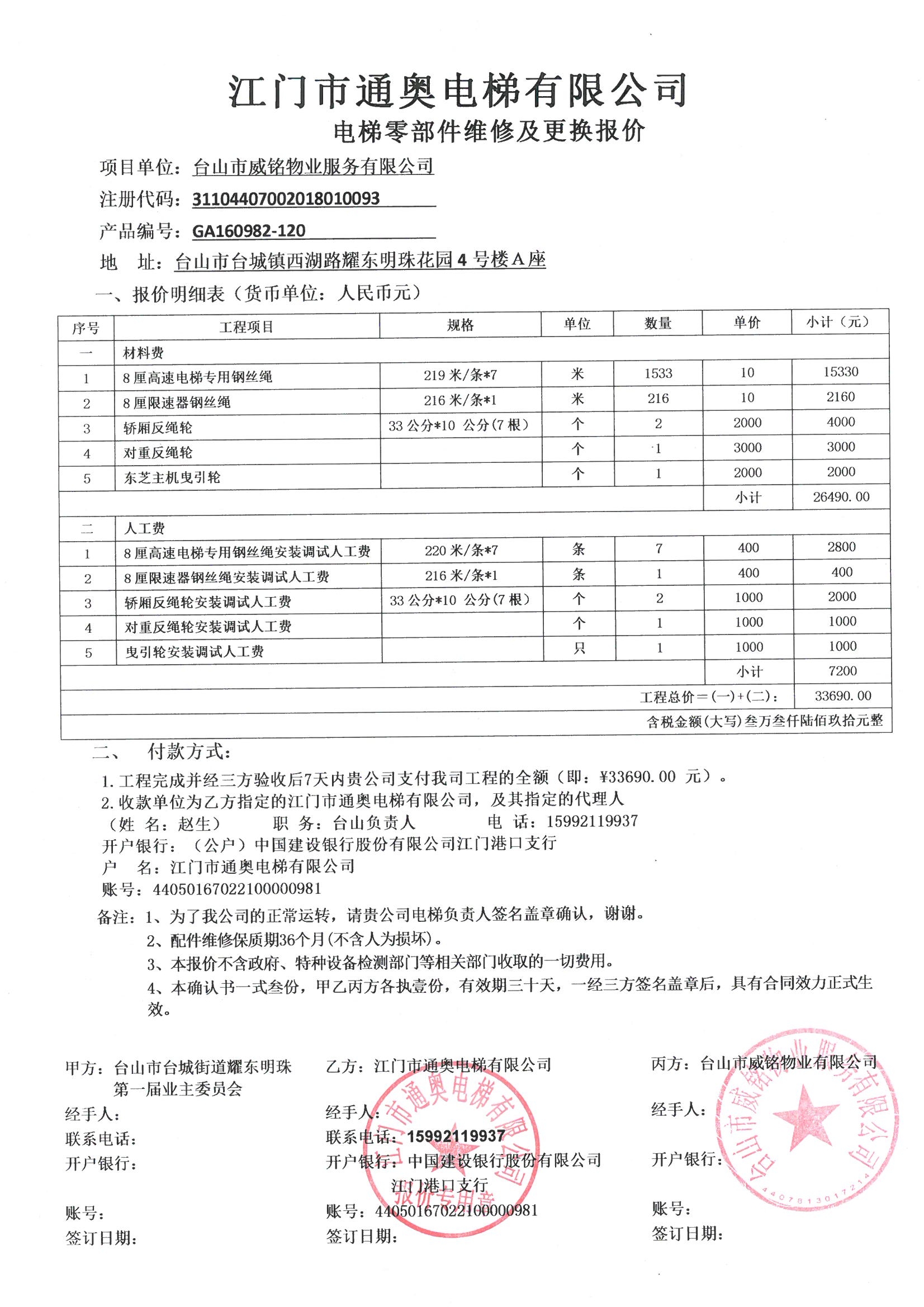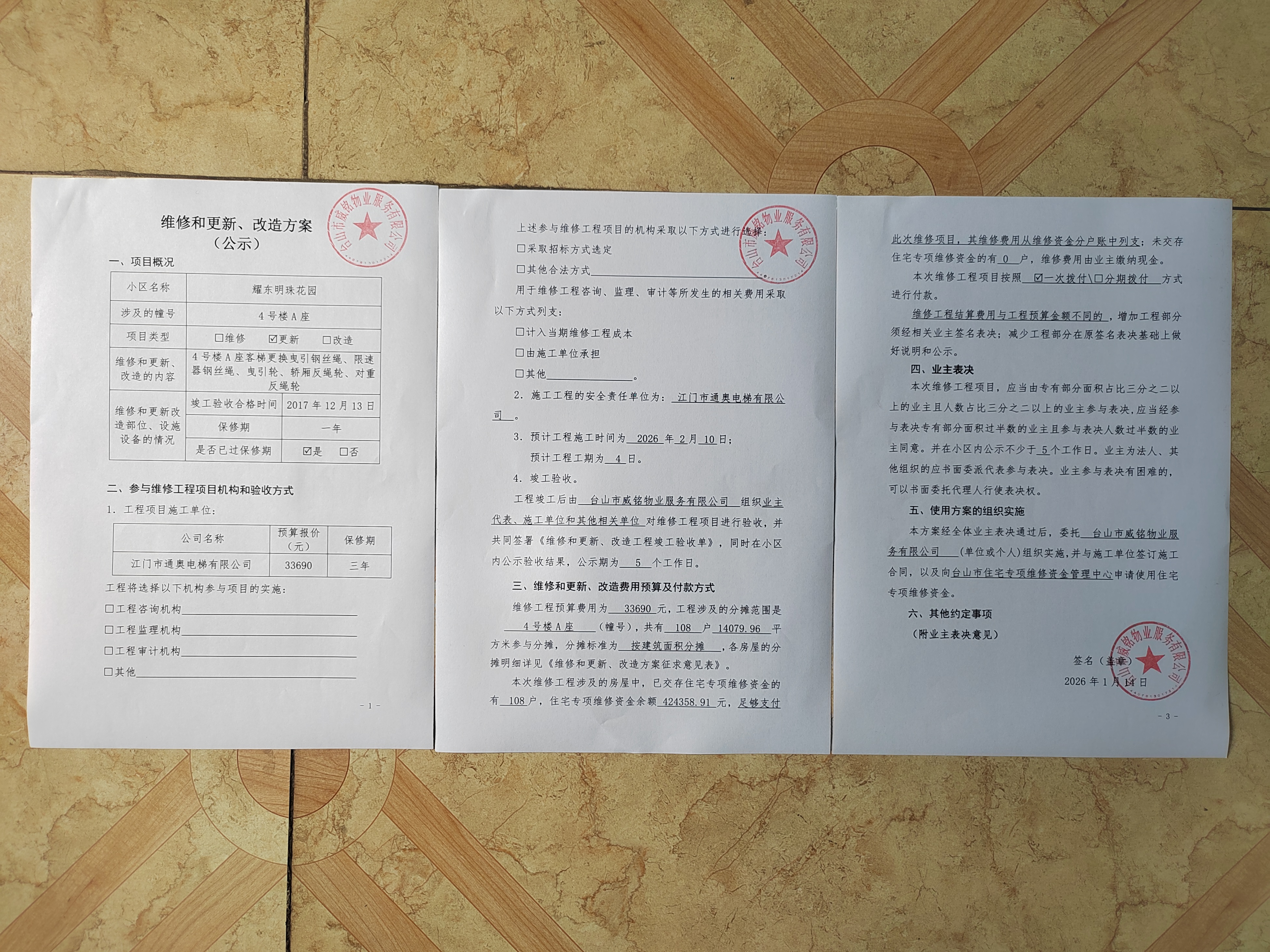 <td VALIGN="top" VALUES="" STYLE="border-width:0" BINDTYPE="0" ROWSPAN="19" COLSPAN="7" DATASOURCE="投票结果" ><font style="font-size:14pt;"><p style="white-space: normal; font-family: 宋体; line-height: 1.75em;">耀东明珠花园4号楼A座全体业主:</p><p style="white-space: normal; font-family: 宋体; line-height: 1.75em; text-indent: 2em;">本小区关于4号楼A座客梯更换钢丝绳、曳引轮、轿厢反绳轮、对重反绳轮使用维修资金的投票的投票已表决结束,询异时间从2026年03月02日开始,投票询异公示期间,业主可通过微信查询自己的表决情况或可凭身份证件申请查询自己的表决情况;如公示的业主表决情况与查询的本人表决意见不一致的,可以以书面形式向投票组织机构申诉,投票组织机构予以纠正并重新公示表决结果。异议提出人对投票组织机构的处理仍有异议的,可以向街道办事处(镇人民政府)反映处理,涉及住宅专项维修资金的,可向属地住宅专项维修资金管理中心反映处理。</p><p style="white-space: normal;"><br/></p><p style="white-space: normal; font-family: 宋体; line-height: 1.75em;"><strong>附件:</strong></p><p style="white-space: normal; font-family: 宋体; line-height: 1.75em;"><strong>一、投票范围</strong></p><p style="white-space: normal; font-family: 宋体; line-height: 1.75em; text-indent: 2em;">耀东明珠花园4号楼A座</p><p style="white-space: normal; font-family: 宋体; line-height: 1.75em; text-indent: 2em;">总人数(专有部分人数之和):108</p><p style="white-space: normal; font-family: 宋体; line-height: 1.75em; text-indent: 2em;"><span style="font-family: 宋体, SimSun;"><span style="font-family: 宋体; text-indent: 32px;"><span style="font-family: 宋体; text-indent: 32px;">总户数:108</span></span></span></p><p style="white-space: normal; font-family: 宋体; line-height: 1.75em; text-indent: 2em;">建筑物总面积(专有部分面积之和):14079.96㎡</p><p style="white-space: normal; font-family: 宋体; line-height: 1.75em;"><strong>二、询异公示起止时间</strong></p><p dir="ltr" style="white-space: normal; font-family: 宋体; line-height: 1.75em; text-indent: 2em;"><span style="text-indent: 36px;">2026年03月02日至2026年03月12日</span></p><p style="white-space: normal; font-family: 宋体; line-height: 1.75em;"><strong>三、投票详细描述</strong></p><p style="white-space: normal; font-family: 宋体; line-height: 1.75em; text-indent: 2em;"><p> 小区4号楼A座的客梯进行年检时,发现该台电梯“空载上行曳引能力试验”项目不符合《电梯监督检验和定期检验规则》(TSG T7001)的相关安全技术规范要求,存在上行曳引力不足(俗称“打滑”)的严重安全隐患,该电梯的检验结论为不合格,要求整改完成符合安全后才能完成电梯年检。电梯年检结束后,电梯维保公司进行现场勘查和检查,发现曳引轮和轿厢反绳轮磨损严重、曳引钢丝绳磨损,限速器钢丝绳磨损光滑等情况;建议更换以上配件。</p><p> 现对4号楼A座的客梯进行维修,工程维修预算金额为33690元,项目最终费用以施工合同签订金额为准。因已过保修期,维修费用由相关业主按建筑面积分摊,每平方约2.39元,详见公示附件。如业主手机不能正常通过微信投票,请联系物业公司进行线下纸质投票,物业电话:0750-5586289。</p></p><p style="white-space: normal; font-family: 宋体; line-height: 1.75em;"><strong>四、计票规则</strong></p><p style="white-space: normal; font-family: 宋体; line-height: 1.75em; text-indent: 2em;">表决事项:使用建筑物及其附属设施的维修资金<br /><p style='text-align: left; font-family: 宋体; font-size: 16px; line-height: 1.75em; text-indent: 2em;'>计票规则:弃权票不并入其它项 未表决票不并入其它项</p></p><p style="white-space: normal; font-family: 宋体; line-height: 1.75em;"><strong>五、通过规则</strong></p><p style="white-space: normal; font-family: 宋体; line-height: 1.75em;"><strong><strong style="white-space: normal;"><span style="font-family: 宋体, SimSun;"> 根据《中华人民共和国民法典》第二百七十八条规定:业主共同决定事项,应当由专有部分面积占比三分之二以上的业主且人数占比三分之二以上的业主参与表决。</span></strong></strong></p><p style="white-space: normal; font-family: 宋体; line-height: 1.75em; text-indent: 2em;">表决事项:使用建筑物及其附属设施的维修资金<br /><p style='text-align: left; font-family: 宋体; font-size: 16px; line-height: 1.75em; text-indent: 2em;'>通过规则:双2/3以上参与表决,参与表决双过半同意</p></p><p style="white-space: normal; font-family: 宋体; line-height: 1.75em;"><strong>六、投票结果</strong></p><p style="white-space: normal; font-family: 宋体; line-height: 1.75em; text-indent: 2em;"><div id='resultTable'><table style='table-layout: fixed; font-size:12px; margin-top:10px' width='100%' border='0' cellspacing='0' cellpadding='0'><tr><td height='28' colspan='10' align='center' style='border: 1px solid #666'><strong style='font-size: 14px;'> 使用建筑物及其附属设施的维修资金</strong></td> </tr><tr id='trfirst'><td height='28' colspan='4' style='border-left: 1px solid #666; border-bottom: 1px solid #666'><strong> 申报单位:</strong> 台山市威铭物业服务有限公司</td><td colspan='3' style='border-left: 1px solid #666; border-bottom: 1px solid #666'><strong> 联系方式:</strong> 5586289 </td><td colspan='3' style='border-left: 1px solid #666; border-bottom: 1px solid #666; border-right: 1px solid #666'><strong> 申报日期:</strong> 2026年1月15日 </td></tr><tr> <td height='28' colspan='5' style='border-left: 1px solid #666; border-bottom: 1px solid #666'><strong> 总人数(专有部分人数之和):</strong>108人 </td><td colspan='5'