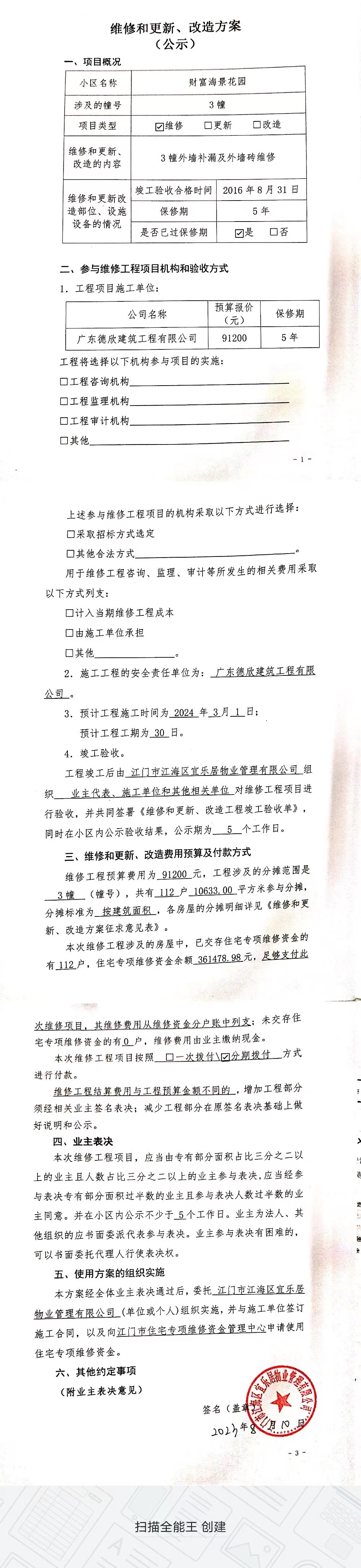 <td valign="top" values="" style="border-width:0" bindtype="0" rowspan="17" colspan="7" datasource="投票结果"><font style=" font-family:方正小标宋简体;font-size:14pt;"><p style="line-height: 1.75em;"><span style="font-family: 宋体, SimSun;">各位尊敬的业主:</span><br></p><p style="text-indent: 2em; line-height: 1.75em;"><span style="font-family: 宋体, SimSun;">根据法律法规的规定,本小区业主利用“江门市物业事项表决管理系统”已对本小区公共事务决策事项进行了表决,在经过7日的询异公示期后,未收到业主有效的异议。现将投票结果公告,并就产生的法律效力说明如下:</span></p><p style="line-height: 1.75em; text-indent: 0em;"><strong style="text-indent: 2em;"><span style="font-family: 宋体, SimSun;">一、投票范围</span></strong></p><p style="text-indent: 2em; line-height: 1.75em;"><span style="font-family: 宋体, SimSun;">江海区外海财富海景花园江海区外海财富海景花园3幢</span></p><p style="text-indent: 2em; line-height: 1.75em;"><span style="font-family: 宋体, SimSun;">总人数(专有部分人数之和):111</span></p><p style="text-indent: 2em; line-height: 1.75em;"><span style="font-family: 宋体, SimSun;"><span style="font-family: 宋体, SimSun; text-indent: 32px;"><span style="font-family: 宋体; text-indent: 32px;">总户数:112</span></span></span></p><p style="text-indent: 2em; line-height: 1.75em;"><span style="font-family: 宋体, SimSun;">建筑物总面积(专有部分面积之和):10633.00㎡</span></p><p style="line-height: 1.75em;"><strong><span style="font-family: 宋体, SimSun;">二、投票结果公告时间</span></strong></p><p style="text-indent: 2em; line-height: 1.75em;"><span style="font-family: 宋体, SimSun;">从2023年10月08日开始</span></p><p style="line-height: 1.75em;"><strong><span style="font-family: 宋体, SimSun;">三、计票规则</span></strong></p><p style="text-indent: 2em; line-height: 1.75em;"><span style="font-family: 宋体, SimSun;">表决事项:使用建筑物及其附属设施的维修资金<br></span></p><p style="font-family: 宋体, SimSun;line-height: 1.75em; text-indent: 2em;">计票规则:弃权票不并入其它项 未表决票不并入其它项</p><p></p><p style="line-height: 1.75em;"><strong><span style="font-family: 宋体, SimSun;">四、通过规则</span></strong></p><p style="text-indent: 2em; line-height: 1.75em;"><span style="font-family: 宋体, SimSun;"><span style="font-family: 宋体, SimSun; text-indent: 32px;">表决事项:使用建筑物及其附属设施的维修资金<br></span></span></p><p style="font-family: 宋体, SimSun;line-height: 1.75em; text-indent: 2em;">通过规则:参与表决专有部分面积过半数的业主且参与表决人数过半数的业主同意</p><p></p><p style="line-height: 1.75em;"><strong><span style="font-family: 宋体, SimSun;">五、投票结果</span></strong></p><p style="line-height: 1.75em; text-indent: 2em;"><span style="font-family: 宋体, SimSun; text-indent: 2em;"></span></p><div id="resultTable"><table style="table-layout: fixed; font-size:12px; margin-top:10px" width="100%" border="0" cellspacing="0" cellpadding="0"><tbody><tr><td height="28" colspan="10" align="center" style="border: 1px solid #666"><strong style="font-size: 14px;"> 使用建筑物及其附属设施的维修资金</strong></td> </tr><tr id="trfirst"><td height="28" colspan="4" style="border-left: 1px solid #666; border-bottom: 1px solid #666"><strong> 申报单位:</strong> 江门市江海区宜乐居物业管理有限公司</td><td colspan="3" style="border-left: 1px solid #666; border-bottom: 1px solid #666"><strong> 联系方式:</strong> </td><td colspan="3" style="border-left: 1px solid #666; border-bottom: 1px solid #666; border-right: 1px solid #666"><strong> 申报日期:</strong> 2023年8月18日 </td></tr><tr> <td height="28" colspan="5" style="border-left: 1px solid #666; border-bottom: 1px solid #666"><strong> 总人数(专有部分人数之和):</strong>111人 </td><td colspan="5" style="border-left: 1px solid #666; border-bottom: 1px solid #666; border-right: 1px solid #666"><strong> 建筑物总面积(专有部分面积之和):</strong>10633.00㎡ </td> </tr><tr><td height="28" colspan="10" bgcolor="#F3F3F3" style="border-left: 1px solid #666;border-bottom: 1px solid #666;border-right: 1px solid #666"><strong> 参与人数及面积统计</strong></td></tr><tr><td height="28" colspan="5" style="border-left: 1px solid #666; border-bottom: 1px solid #666"><strong> 参与表决专有部分人数之和:</strong>28人</td><td colspan="5" style="border-left: 1px solid #666; border-bottom: 1px solid #666; border-right: 1px solid #666"><strong> 参与表决占有表决权总人数比例:</strong>25.23%</td></tr><tr><td height="28" colspan="5" style="border-left: 1px solid #666; border-bottom: 1px solid #666"><strong> 参与表决专有部分面积之和:</strong>2662.95㎡</td><td colspan="5" style="border-left: 1px solid #666; border-bottom: 1px solid #666; border-right: 1px solid #666"><strong> 参与表决占有表决权总面积比例:</strong>25.04%</td></tr><tr><td height="28" colspan="10" bgcolor="#F3F3F3" style="border-left: 1px solid #666; border-bottom: 1px solid #666;border-right: 1px solid #666"> <strong> 未参与人数及面积统计</strong></td> </tr><tr><td height="28" colspan="5" style="border-left: 1px solid #666; border-bottom: 1px solid #666"><strong> 未参与表决专有部分人数之和:</strong>83人 </td><td colspan="5" style="border-left: 1px solid #666; border-bottom: 1px solid #666; border-right: 1px solid #666"><strong> 未参与表决占有表决权总人数比例:</strong>74.77%</td></tr><tr><td height="28" colspan="5" style="border-left: 1px solid #666; border-bottom: 1px solid #666"><strong> 未参与表决专有部分面积之和:</strong>7970.05㎡</td><td colspan="5" style="border-left: 1px solid #666; border-bottom: 1px solid #6