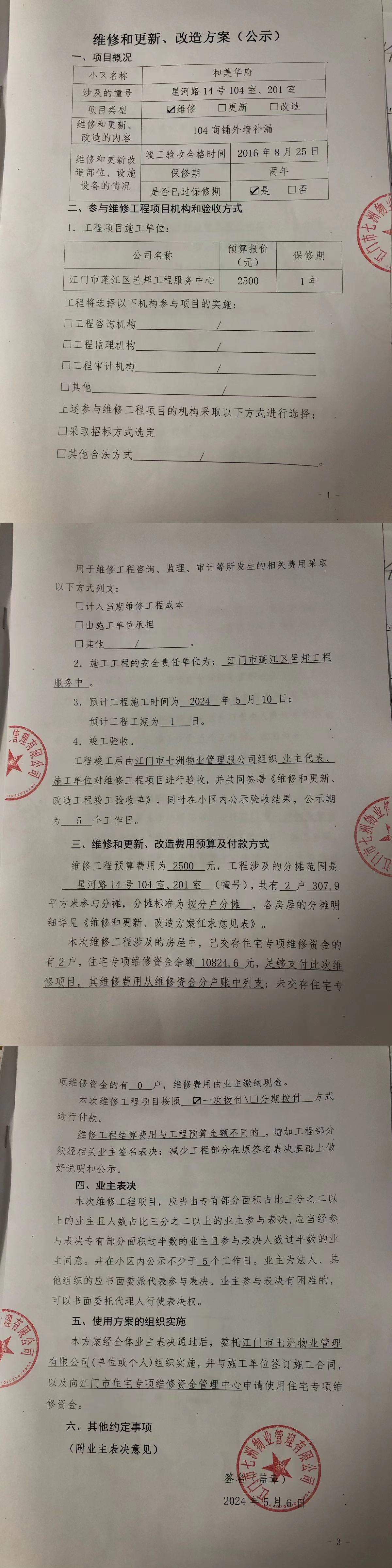<td VALIGN="top" VALUES="" STYLE="border-width:0" BINDTYPE="0" ROWSPAN="17" COLSPAN="7" DATASOURCE="投票结果" ><font style=" font-family:方正小标宋简体;font-size:14pt;"><p style="line-height: 1.75em;"><span style="font-family: 宋体, SimSun;">各位尊敬的业主:</span><br/></p><p style="text-indent: 2em; line-height: 1.75em;"><span style="font-family: 宋体, SimSun;">根据法律法规的规定,本小区业主利用“江门市物业事项表决管理系统”已对本小区公共事务决策事项进行了表决,在经过7日的询异公示期后,未收到业主有效的异议。现将投票结果公告,并就产生的法律效力说明如下:</span></p><p style="line-height: 1.75em; text-indent: 0em;"><strong style="text-indent: 2em;"><span style="font-family: 宋体, SimSun;">一、投票范围</span></strong></p><p style="text-indent: 2em; line-height: 1.75em;"><span style="font-family: 宋体, SimSun;">和美华府蓬江区星河路14号</span></p><p style="text-indent: 2em; line-height: 1.75em;"><span style="font-family: 宋体, SimSun;">总人数(专有部分人数之和):2</span></p><p style="text-indent: 2em; line-height: 1.75em;"><span style="font-family: 宋体, SimSun;"><span style="font-family: 宋体, SimSun; text-indent: 32px;"><span style="font-family: 宋体; text-indent: 32px;"><span style="font-family: 宋体; text-indent: 32px;">总户数:2</span></span></span></span></p><p style="text-indent: 2em; line-height: 1.75em;"><span style="font-family: 宋体, SimSun;">建筑物总面积(专有部分面积之和):307.90㎡</span></p><p style="line-height: 1.75em;"><strong><span style="font-family: 宋体, SimSun;">二、投票结果公告时间</span></strong></p><p style="text-indent: 2em; line-height: 1.75em;"><span style="font-family: 宋体, SimSun;">从2024年05月30日开始</span></p><p style="line-height: 1.75em;"><strong><span style="font-family: 宋体, SimSun;">三、计票规则</span></strong></p><p style="text-indent: 2em; line-height: 1.75em;"><span style="font-family: 宋体, SimSun;">表决事项:使用建筑物及其附属设施的维修资金<br /><p style='font-family: 宋体, SimSun;line-height: 1.75em; text-indent: 2em;'>计票规则:弃权票不并入其它项&nbsp;&nbsp;&nbsp;&nbsp;未表决票不并入其它项</p></span></p><p style="line-height: 1.75em;"><strong><span style="font-family: 宋体, SimSun;">四、通过规则</span></strong></p><p style="line-height: 1.75em;"><strong><span style="font-family: 宋体, SimSun;">&nbsp; 根据《中华人民共和国民法典》第二百七十八条规定:业主共同决定事项,应当由专有部分面积占比三分之二以上的业主且人数占比三分之二以上的业主参与表决。</span></strong></p><p style="text-indent: 2em; line-height: 1.75em;"><span style="font-family: 宋体, SimSun;"><span style="font-family: 宋体, SimSun; text-indent: 32px;">表决事项:使用建筑物及其附属设施的维修资金<br /><p style='font-family: 宋体, SimSun;line-height: 1.75em; text-indent: 2em;'>通过规则:双2/3以上参与表决,参与表决双过半同意</p></span></span></p><p style="line-height: 1.75em;"><strong><span style="font-family: 宋体, SimSun;">五、投票结果</span></strong></p><p style="line-height: 1.75em; text-indent: 2em;"><span style="font-family: 宋体, SimSun; text-indent: 2em;"><div id='resultTable'><table style='table-layout: fixed; font-size:12px; margin-top:10px' width='100%' border='0' cellspacing='0' cellpadding='0'><tr><td height='28' colspan='10' align='center' style='border: 1px solid #666'><strong style='font-size: 14px;'> 使用建筑物及其附属设施的维修资金</strong></td> </tr><tr id='trfirst'><td height='28' colspan='4' style='border-left: 1px solid #666; border-bottom: 1px solid #666'><strong>&nbsp;申报单位:</strong> 江门市七洲物业管理有限公司</td><td colspan='3' style='border-left: 1px solid #666; border-bottom: 1px solid #666'><strong>&nbsp;联系方式:</strong> 0750-3338969 </td><td colspan='3' style='border-left: 1px solid #666; border-bottom: 1px solid #666; border-right: 1px solid #666'><strong>&nbsp;申报日期:</strong> 2024年5月6日 </td></tr><tr> <td height='28' colspan='5' style='border-left: 1px solid #666; border-bottom: 1px solid #666'><strong>&nbsp;列支总人数(专有部分人数之和):</strong>2人 </td><td colspan='5' style='border-left: 1px solid #666; border-bottom: 1px solid #666; border-right: 1px solid #666'><strong>&nbsp;列支建筑物总面积(专有部分面积之和):</strong>307.90㎡ </td> </tr><tr><td height='28' colspan='10' bgcolor='#F3F3F3' style='border-left: 1px solid #666;border-bottom: 1px solid #666;border-right: 1px solid #666'><strong>&nbsp;参与表决人数及面积统计</strong></td></tr><tr><td height='28' colspan='5' style='border-left: 1px solid #666; border-bottom: 1px solid #666'><strong>&nbsp;参与表决人数:</strong>2人</td><td colspan='5' style='border-left: 1px solid #666; border-bottom: 1px solid #666; border-right: 1px solid #666'><strong>&nbsp;参与表决人数占总人数比例:</strong>100.00%</td></tr><tr><td height='28' colspan='5' style='border-left: 1px solid #666; border-bottom: 1px solid #666'><strong>&nbsp;参与表决面积:</strong>307.90㎡</td><td colspan='5' style='border-left: 1px solid #666; border-bottom: 1px solid #666; border-right: 1px solid #666'><strong>&nbsp;参与表决面积占总面积比例:</strong>100.00%</td></tr><tr><td height='28' colspan='10' bgcolor='#F3F3F3' style='border-left: 1px solid #666; border-bottom: 1px solid #666;border-right: 1px solid #666'> <strong>&nbsp;参与表决同意人数及面积统计</strong></td> </tr><tr><td height='28' colspan='5' style='border-left: 1px solid #666; border-bottom: 1px solid #666'><strong>&nbsp;参与表决同意人数:</strong>2人 </td><td colspan='5' style='border-left: 1px solid #666; border-bottom: 1px solid #666; border-right: 1px solid #666'><strong>&nbsp;