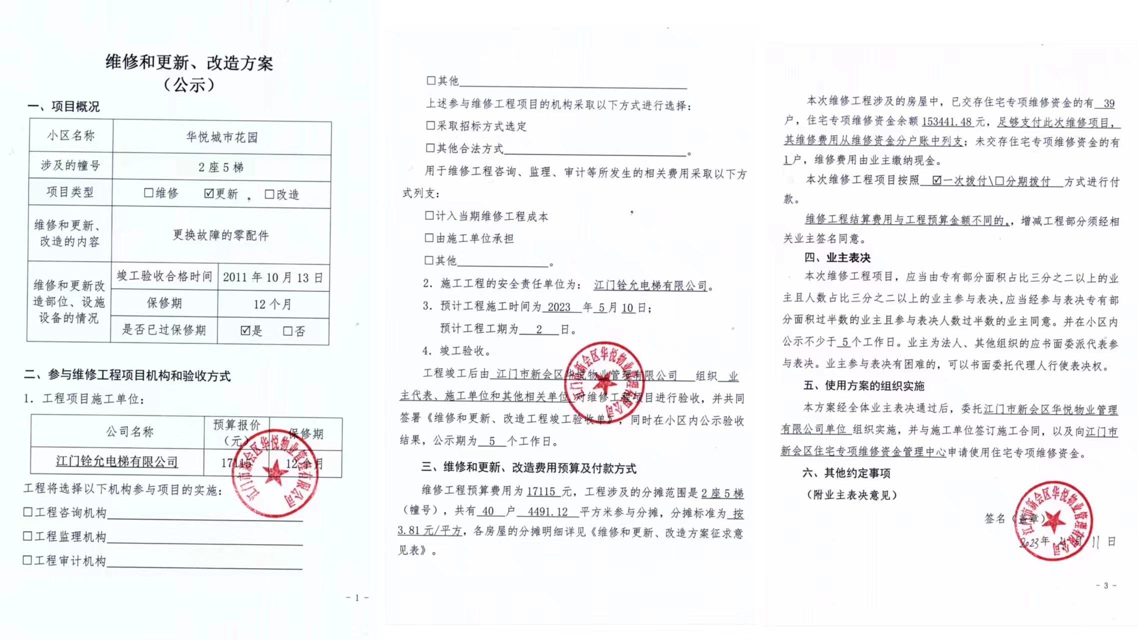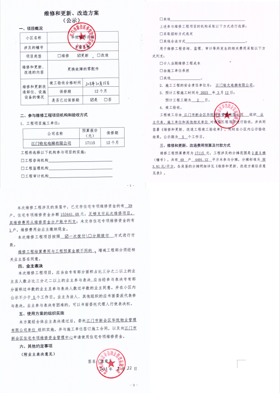 <td valign="top" values="" style="border-width:0" bindtype="0" rowspan="17" colspan="7" datasource="投票结果"><font style=" font-family:方正小标宋简体;font-size:14pt;"><p style="line-height: 1.75em;"><span style="font-family: 宋体, SimSun;">各位尊敬的业主:</span><br></p><p style="text-indent: 2em; line-height: 1.75em;"><span style="font-family: 宋体, SimSun;">根据法律法规的规定,本小区业主利用“物业公共事务决策系统”已对本小区公共事务决策事项进行了表决,在经过7日的询异公示期后,未收到业主有效的异议。现将投票结果公告,并就产生的法律效力说明如下:</span></p><p style="line-height: 1.75em; text-indent: 0em;"><strong style="text-indent: 2em;"><span style="font-family: 宋体, SimSun;">一、投票范围</span></strong></p><p style="text-indent: 2em; line-height: 1.75em;"><span style="font-family: 宋体, SimSun;">华悦城市花园司前镇迎宾南路1号2座</span></p><p style="text-indent: 2em; line-height: 1.75em;"><span style="font-family: 宋体, SimSun;">总人数(专有部分人数之和):40</span></p><p style="text-indent: 2em; line-height: 1.75em;"><span style="font-family: 宋体, SimSun;"><span style="font-family: 宋体, SimSun; text-indent: 32px;">总户数:40</span></span></p><p style="text-indent: 2em; line-height: 1.75em;"><span style="font-family: 宋体, SimSun;">建筑物总面积(专有部分面积之和):4491.12㎡</span></p><p style="line-height: 1.75em;"><strong><span style="font-family: 宋体, SimSun;">二、投票起止时间</span></strong></p><p style="text-indent: 2em; line-height: 1.75em;"><span style="font-family: 宋体, SimSun;">投票表决时间:从2023年04月11日到2023年04月17日止</span></p><p style="text-indent: 2em; line-height: 1.75em;"><span style="font-family: 宋体, SimSun;">投票询异公示时间:从2023年04月18日开始</span></p><p style="text-indent: 2em; line-height: 1.75em;"><span style="font-family: 宋体, SimSun;">投票结果通知公告时间:从2023年04月25日开始</span></p><p style="line-height: 1.75em;"><strong><span style="font-family: 宋体, SimSun;">三、计票规则</span></strong></p><p style="text-indent: 2em; line-height: 1.75em;"><span style="font-family: 宋体, SimSun;">表决事项:使用建筑物及其附属设施的维修资金<br></span></p><p style="font-family: 宋体, SimSun;line-height: 1.75em; text-indent: 2em;">计票规则:弃权票不并入其它项 未表决票不并入其它项</p><p></p><p style="line-height: 1.75em;"><strong><span style="font-family: 宋体, SimSun;">四、通过规则</span></strong></p><p style="text-indent: 2em; line-height: 1.75em;"><span style="font-family: 宋体, SimSun;"><span style="font-family: 宋体, SimSun; text-indent: 32px;">表决事项:使用建筑物及其附属设施的维修资金<br></span></span></p><p style="font-family: 宋体, SimSun;line-height: 1.75em; text-indent: 2em;">通过规则:参与表决专有部分面积过半数的业主且参与表决人数过半数的业主同意</p><p></p><p style="line-height: 1.75em;"><strong><span style="font-family: 宋体, SimSun;">五、投票结果</span></strong></p><p style="line-height: 1.75em; text-indent: 2em;"><span style="font-family: 宋体, SimSun; text-indent: 2em;"></span></p><div id="resultTable"><table style="table-layout: fixed; font-size:12px; margin-top:10px" width="100%" border="0" cellspacing="0" cellpadding="0"><tbody><tr><td height="28" colspan="10" align="center" style="border: 1px solid #666"><strong style="font-size: 14px;"> 使用建筑物及其附属设施的维修资金</strong></td> </tr><tr id="trfirst"><td height="28" colspan="4" style="border-left: 1px solid #666; border-bottom: 1px solid #666"><strong> 申报单位:</strong> 江门市新会区华悦物业管理有限公司</td><td colspan="3" style="border-left: 1px solid #666; border-bottom: 1px solid #666"><strong> 联系方式:</strong> 07506566123 </td><td colspan="3" style="border-left: 1px solid #666; border-bottom: 1px solid #666; border-right: 1px solid #666"><strong> 申报日期:</strong> 2023年4月6日 </td></tr><tr> <td height="28" colspan="5" style="border-left: 1px solid #666; border-bottom: 1px solid #666"><strong> 总人数(专有部分人数之和):</strong>40人 </td><td colspan="5" style="border-left: 1px solid #666; border-bottom: 1px solid #666; border-right: 1px solid #666"><strong> 建筑物总面积(专有部分面积之和):</strong>4491.12㎡ </td> </tr><tr><td height="28" colspan="10" bgcolor="#F3F3F3" style="border-left: 1px solid #666;border-bottom: 1px solid #666;border-right: 1px solid #666"><strong> 参与人数及面积统计</strong></td></tr><tr><td height="28" colspan="5" style="border-left: 1px solid #666; border-bottom: 1px solid #666"><strong> 参与表决专有部分人数之和:</strong>28人</td><td colspan="5" style="border-left: 1px solid #666; border-bottom: 1px solid #666; border-right: 1px solid #666"><strong> 参与表决占有表决权总人数比例:</strong>70.00%</td></tr><tr><td height="28" colspan="5" style="border-left: 1px solid #666; border-bottom: 1px solid #666"><strong> 参与表决专有部分面积之和:</strong>3217.17㎡</td><td colspan="5" style="border-left: 1px solid #666; border-bottom: 1px solid #666; border-right: 1px solid #666"><strong> 参与表决占有表决权总面积比例:</strong>71.63%</td></tr><tr><td height="28" colspan="10" bgcolor="#F3F3F3" style="border-left: 1px solid #666; border-bottom: 1px solid #666;border-right: 1px solid #666"> <strong> 未参与人数及面积统计</strong></td> </tr><tr><td height="28" colspan="5" style="border-left: 1px solid #666; border-bottom: 1px solid #666"><strong> 未参与表决专有部分人数之和:</strong>12人 </td><td colspan="5" style="border-left: 1px solid #666; border-bottom: 1px solid #666; border-right: 1px solid #666"><strong> 未参与表决占有表决权总人数比例:</strong>30.00%</td>
