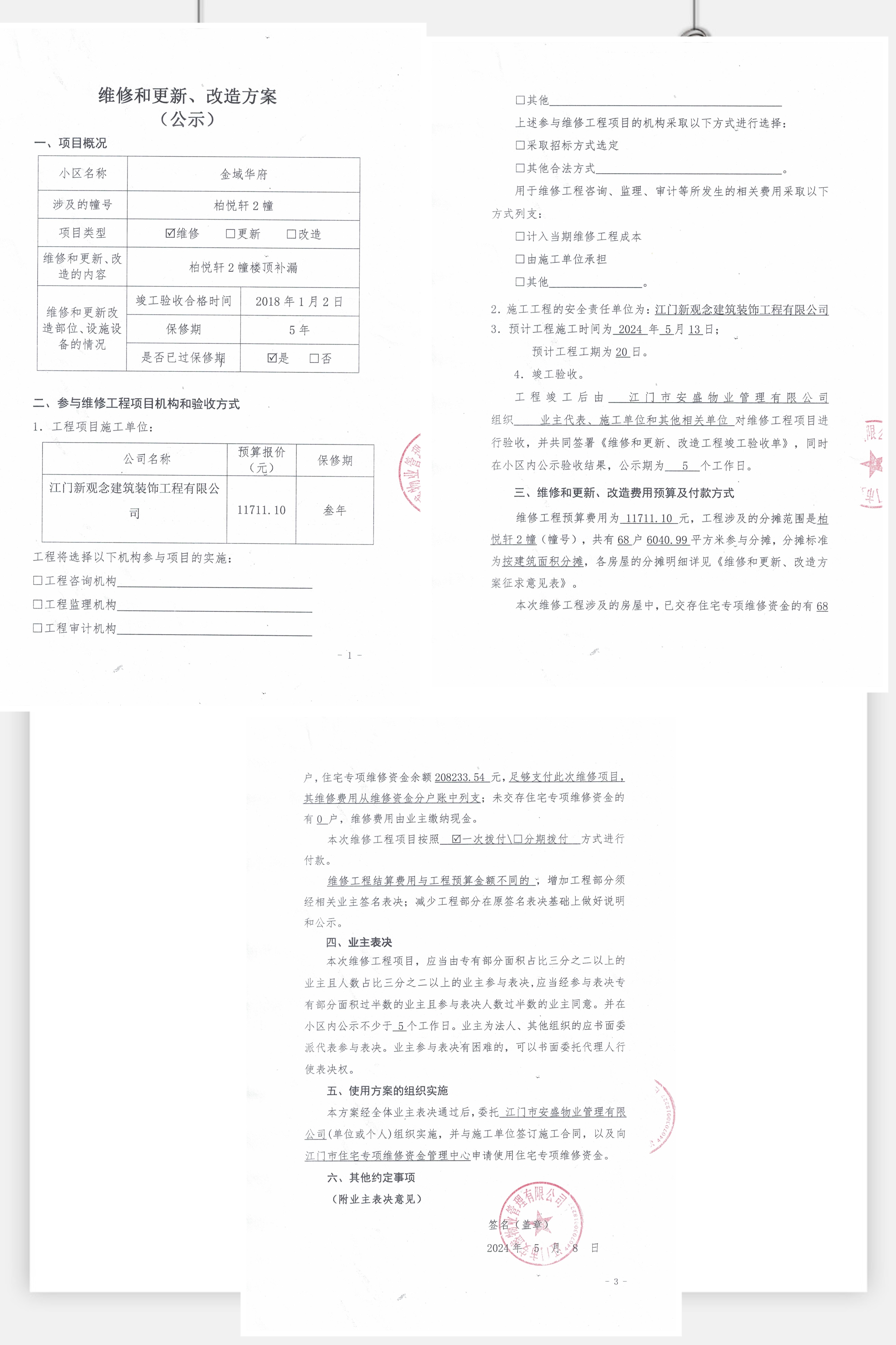 <td VALIGN="top" VALUES="" STYLE="border-width:0" BINDTYPE="0" ROWSPAN="17" COLSPAN="7" DATASOURCE="投票结果" ><font style=" font-family:方正小标宋简体;font-size:14pt;"><p style="line-height: 1.75em;"><span style="font-family: 宋体, SimSun;">各位尊敬的业主:</span><br/></p><p style="text-indent: 2em; line-height: 1.75em;"><span style="font-family: 宋体, SimSun;">根据法律法规的规定,本小区业主利用“江门市物业事项表决管理系统”已对本小区公共事务决策事项进行了表决,在经过7日的询异公示期后,未收到业主有效的异议。现将投票结果公告,并就产生的法律效力说明如下:</span></p><p style="line-height: 1.75em; text-indent: 0em;"><strong style="text-indent: 2em;"><span style="font-family: 宋体, SimSun;">一、投票范围</span></strong></p><p style="text-indent: 2em; line-height: 1.75em;"><span style="font-family: 宋体, SimSun;">金域华府江门市蓬江区金域华府柏悦轩2幢</span></p><p style="text-indent: 2em; line-height: 1.75em;"><span style="font-family: 宋体, SimSun;">总人数(专有部分人数之和):67</span></p><p style="text-indent: 2em; line-height: 1.75em;"><span style="font-family: 宋体, SimSun;"><span style="font-family: 宋体, SimSun; text-indent: 32px;"><span style="font-family: 宋体; text-indent: 32px;"><span style="font-family: 宋体; text-indent: 32px;">总户数:68</span></span></span></span></p><p style="text-indent: 2em; line-height: 1.75em;"><span style="font-family: 宋体, SimSun;">建筑物总面积(专有部分面积之和):6040.99㎡</span></p><p style="line-height: 1.75em;"><strong><span style="font-family: 宋体, SimSun;">二、投票结果公告时间</span></strong></p><p style="text-indent: 2em; line-height: 1.75em;"><span style="font-family: 宋体, SimSun;">从2024年07月08日开始</span></p><p style="line-height: 1.75em;"><strong><span style="font-family: 宋体, SimSun;">三、计票规则</span></strong></p><p style="text-indent: 2em; line-height: 1.75em;"><span style="font-family: 宋体, SimSun;">表决事项:使用建筑物及其附属设施的维修资金<br /><p style='font-family: 宋体, SimSun;line-height: 1.75em; text-indent: 2em;'>计票规则:弃权票不并入其它项&nbsp;&nbsp;&nbsp;&nbsp;未表决票不并入其它项</p></span></p><p style="line-height: 1.75em;"><strong><span style="font-family: 宋体, SimSun;">四、通过规则</span></strong></p><p style="line-height: 1.75em;"><strong><span style="font-family: 宋体, SimSun;">&nbsp; 根据《中华人民共和国民法典》第二百七十八条规定:业主共同决定事项,应当由专有部分面积占比三分之二以上的业主且人数占比三分之二以上的业主参与表决。</span></strong></p><p style="text-indent: 2em; line-height: 1.75em;"><span style="font-family: 宋体, SimSun;"><span style="font-family: 宋体, SimSun; text-indent: 32px;">表决事项:使用建筑物及其附属设施的维修资金<br /><p style='font-family: 宋体, SimSun;line-height: 1.75em; text-indent: 2em;'>通过规则:双2/3以上参与表决,参与表决双过半同意</p></span></span></p><p style="line-height: 1.75em;"><strong><span style="font-family: 宋体, SimSun;">五、投票结果</span></strong></p><p style="line-height: 1.75em; text-indent: 2em;"><span style="font-family: 宋体, SimSun; text-indent: 2em;"><div id='resultTable'><table style='table-layout: fixed; font-size:12px; margin-top:10px' width='100%' border='0' cellspacing='0' cellpadding='0'><tr><td height='28' colspan='10' align='center' style='border: 1px solid #666'><strong style='font-size: 14px;'> 使用建筑物及其附属设施的维修资金</strong></td> </tr><tr id='trfirst'><td height='28' colspan='4' style='border-left: 1px solid #666; border-bottom: 1px solid #666'><strong>&nbsp;申报单位:</strong> 江门市安盛物业管理有限公司</td><td colspan='3' style='border-left: 1px solid #666; border-bottom: 1px solid #666'><strong>&nbsp;联系方式:</strong> 3303688 </td><td colspan='3' style='border-left: 1px solid #666; border-bottom: 1px solid #666; border-right: 1px solid #666'><strong>&nbsp;申报日期:</strong> 2024年5月16日 </td></tr><tr> <td height='28' colspan='5' style='border-left: 1px solid #666; border-bottom: 1px solid #666'><strong>&nbsp;列支总人数(专有部分人数之和):</strong>67人 </td><td colspan='5' style='border-left: 1px solid #666; border-bottom: 1px solid #666; border-right: 1px solid #666'><strong>&nbsp;列支建筑物总面积(专有部分面积之和):</strong>6040.99㎡ </td> </tr><tr><td height='28' colspan='10' bgcolor='#F3F3F3' style='border-left: 1px solid #666;border-bottom: 1px solid #666;border-right: 1px solid #666'><strong>&nbsp;参与表决人数及面积统计</strong></td></tr><tr><td height='28' colspan='5' style='border-left: 1px solid #666; border-bottom: 1px solid #666'><strong>&nbsp;参与表决人数:</strong>59人</td><td colspan='5' style='border-left: 1px solid #666; border-bottom: 1px solid #666; border-right: 1px solid #666'><strong>&nbsp;参与表决人数占总人数比例:</strong>88.06%</td></tr><tr><td height='28' colspan='5' style='border-left: 1px solid #666; border-bottom: 1px solid #666'><strong>&nbsp;参与表决面积:</strong>5394.94㎡</td><td colspan='5' style='border-left: 1px solid #666; border-bottom: 1px solid #666; border-right: 1px solid #666'><strong>&nbsp;参与表决面积占总面积比例:</strong>89.31%</td></tr><tr><td height='28' colspan='10' bgcolor='#F3F3F3' style='border-left: 1px solid #666; border-bottom: 1px solid #666;border-right: 1px solid #666'> <strong>&nbsp;参与表决同意人数及面积统计</strong></td> </tr><tr><td height='28' colspan='5' style='border-left: 1px solid #666; border-bottom: 1px solid #666'><strong>&nbsp;参与表决同意人数:</strong>13人 </td><td colspan='5' style='border-left: 1px solid #666; border-bottom: 1px solid #666; border-right: 1px soli