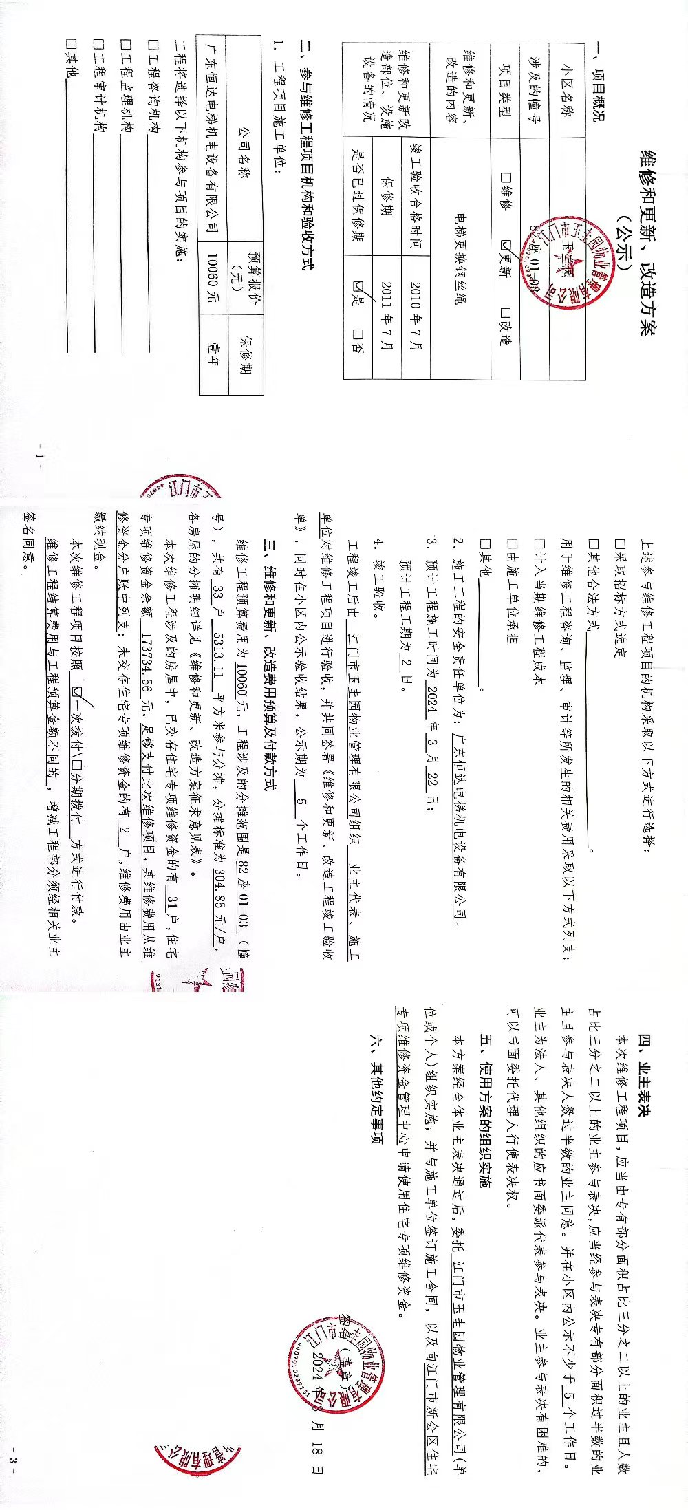 <td VALIGN="top" VALUES="" STYLE="border-width:0" BINDTYPE="0" ROWSPAN="19" COLSPAN="7" DATASOURCE="投票结果" ><font style="font-size:14pt;"><p style="white-space: normal; font-family: 宋体; line-height: 1.75em;">玉圭园玉圭园82座全体业主:</p><p style="white-space: normal; font-family: 宋体; line-height: 1.75em; text-indent: 2em;">本小区关于玉圭园82座01-03电梯更换钢丝绳工程使用维修资金的投票的投票已表决结束,询异时间从2024年03月27日开始,投票询异公示期间,业主可通过微信查询自己的表决情况或可凭身份证件申请查询自己的表决情况;如公示的业主表决情况与查询的本人表决意见不一致的,可以以书面形式向投票组织机构申诉,投票组织机构予以纠正并重新公示表决结果。异议提出人对投票组织机构的处理仍有异议的,可以向街道办事处(镇人民政府)反映处理,涉及住宅专项维修资金的,可向属地住宅专项维修资金管理中心反映处理。</p><p style="white-space: normal;"><br/></p><p style="white-space: normal; font-family: 宋体; line-height: 1.75em;"><strong>附件:</strong></p><p style="white-space: normal; font-family: 宋体; line-height: 1.75em;"><strong>一、投票范围</strong></p><p style="white-space: normal; font-family: 宋体; line-height: 1.75em; text-indent: 2em;">玉圭园玉圭园82座</p><p style="white-space: normal; font-family: 宋体; line-height: 1.75em; text-indent: 2em;">总人数(专有部分人数之和):31</p><p style="white-space: normal; font-family: 宋体; line-height: 1.75em; text-indent: 2em;"><span style="font-family: 宋体, SimSun;"><span style="font-family: 宋体; text-indent: 32px;"><span style="font-family: 宋体; text-indent: 32px;">总户数:33</span></span></span></p><p style="white-space: normal; font-family: 宋体; line-height: 1.75em; text-indent: 2em;">建筑物总面积(专有部分面积之和):5313.11㎡</p><p style="white-space: normal; font-family: 宋体; line-height: 1.75em;"><strong>二、询异公示起止时间</strong></p><p dir="ltr" style="white-space: normal; font-family: 宋体; line-height: 1.75em; text-indent: 2em;"><span style="text-indent: 36px;">2024年03月27日至2024年04月02日</span></p><p style="white-space: normal; font-family: 宋体; line-height: 1.75em;"><strong>三、投票详细描述</strong></p><p style="white-space: normal; font-family: 宋体; line-height: 1.75em; text-indent: 2em;"><p><span style="font-family: "Helvetica Neue", Helvetica, Arial, sans-serif; font-size: 14px; background-color: rgb(255, 255, 255);">玉圭园小区82座01-03的电梯钢丝绳损坏,经检查,是由于电梯钢丝绳使用时间较长,出现损坏不能使用。现需申请使用维修资金对82座01-03电梯更换钢丝绳,工程维修预算金额为10060元,项目最终费用以施工合同签订金额为准。维修费用的分摊标准为 按分户分摊,每户:304.85元,详见公示附件。物业公司联系电话:0750-6551181</span></p></p><p style="white-space: normal; font-family: 宋体; line-height: 1.75em;"><strong>四、计票规则</strong></p><p style="white-space: normal; font-family: 宋体; line-height: 1.75em; text-indent: 2em;">表决事项:玉圭园82座01-03电梯更换钢丝绳工程使用维修资金的投票<br /><p style='text-align: left; font-family: 宋体; font-size: 16px; line-height: 1.75em; text-indent: 2em;'>计票规则:弃权票不并入其它项 未表决票不并入其它项</p></p><p style="white-space: normal; font-family: 宋体; line-height: 1.75em;"><strong>五、通过规则</strong></p><p style="white-space: normal; font-family: 宋体; line-height: 1.75em;"><strong><strong style="white-space: normal;"><span style="font-family: 宋体, SimSun;"> 根据《中华人民共和国民法典》第二百七十八条规定:业主共同决定事项,应当由专有部分面积占比三分之二以上的业主且人数占比三分之二以上的业主参与表决。</span></strong></strong></p><p style="white-space: normal; font-family: 宋体; line-height: 1.75em; text-indent: 2em;">表决事项:玉圭园82座01-03电梯更换钢丝绳工程使用维修资金的投票<br /><p style='text-align: left; font-family: 宋体; font-size: 16px; line-height: 1.75em; text-indent: 2em;'>通过规则:双2/3以上参与表决,参与表决双过半同意</p></p><p style="white-space: normal; font-family: 宋体; line-height: 1.75em;"><strong>六、投票结果</strong></p><p style="white-space: normal; font-family: 宋体; line-height: 1.75em; text-indent: 2em;"><div id='resultTable'><table style='table-layout: fixed; font-size:12px; margin-top:10px' width='100%' border='0' cellspacing='0' cellpadding='0'><tr><td height='28' colspan='10' align='center' style='border: 1px solid #666'><strong style='font-size: 14px;'> 玉圭园82座01-03电梯更换钢丝绳工程使用维修资金的投票</strong></td> </tr><tr id='trfirst'><td height='28' colspan='4' style='border-left: 1px solid #666; border-bottom: 1px solid #666'><strong> 申报单位:</strong> 江门市玉圭园物业管理有限公司</td><td colspan='3' style='border-left: 1px solid #666; border-bottom: 1px solid #666'><strong> 联系方式:</strong> 0750-6178809 </td><td colspan='3' style='border-left: 1px solid #666; border-bottom: 1px solid #666; border-right: 1px solid #666'><strong> 申报日期:</strong> 2024年3月20日 </td></tr><tr> <td height='28' colspan='5' style='border-left: 1px solid #666; border-bottom: 1px solid #666'><strong> 总人数(专有部分人数之和):</strong>31人 </td><td colspan='5' style='border-left: 1px solid #666; border-bottom: 1px solid #666; border-right: 1px solid #666'><strong> 建筑物总面积(专有部分面积之和):</strong>5313.11㎡ </td> </tr><tr><td height='28' colspan='10' bgcolor='#F3F3F3' style='border-left: 1px solid #666;border-bottom: 1px solid #666;border-right: 1px solid #666'><strong> 参与人数及面积统