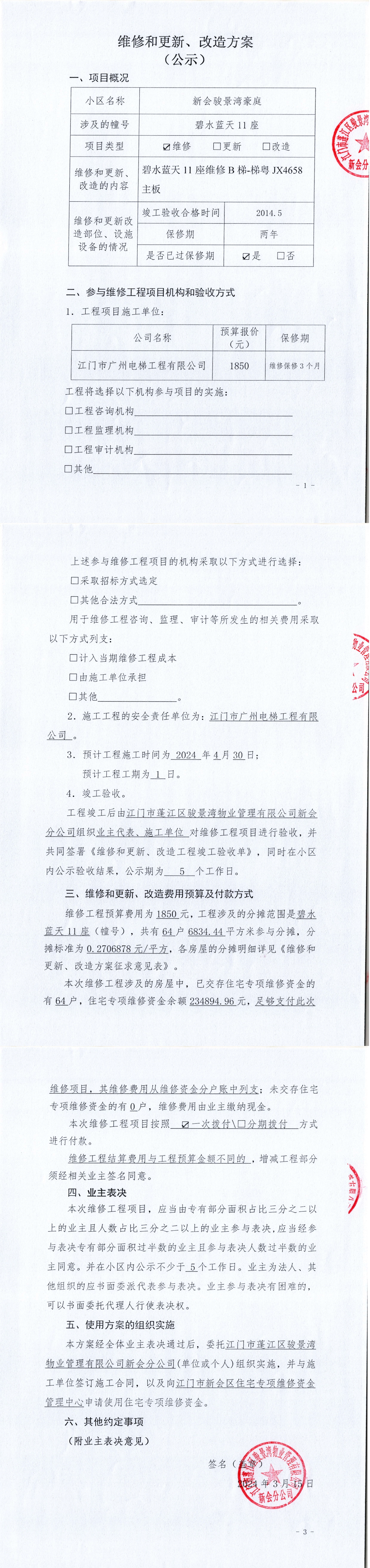 <td VALIGN="top" VALUES="" STYLE="border-width:0" BINDTYPE="0" ROWSPAN="19" COLSPAN="7" DATASOURCE="投票结果" ><font style="font-size:14pt;"><p style="white-space: normal; font-family: 宋体; line-height: 1.75em;">新会骏景湾豪庭碧水蓝天11座全体业主:</p><p style="white-space: normal; font-family: 宋体; line-height: 1.75em; text-indent: 2em;">本小区关于新会骏景湾豪庭碧水蓝天11座B电梯维修主板使用维修资金的投票的投票已表决结束,询异时间从2024年03月29日开始,投票询异公示期间,业主可通过微信查询自己的表决情况或可凭身份证件申请查询自己的表决情况;如公示的业主表决情况与查询的本人表决意见不一致的,可以以书面形式向投票组织机构申诉,投票组织机构予以纠正并重新公示表决结果。异议提出人对投票组织机构的处理仍有异议的,可以向街道办事处(镇人民政府)反映处理,涉及住宅专项维修资金的,可向属地住宅专项维修资金管理中心反映处理。</p><p style="white-space: normal;"><br/></p><p style="white-space: normal; font-family: 宋体; line-height: 1.75em;"><strong>附件:</strong></p><p style="white-space: normal; font-family: 宋体; line-height: 1.75em;"><strong>一、投票范围</strong></p><p style="white-space: normal; font-family: 宋体; line-height: 1.75em; text-indent: 2em;">新会骏景湾豪庭碧水蓝天11座</p><p style="white-space: normal; font-family: 宋体; line-height: 1.75em; text-indent: 2em;">总人数(专有部分人数之和):63</p><p style="white-space: normal; font-family: 宋体; line-height: 1.75em; text-indent: 2em;"><span style="font-family: 宋体, SimSun;"><span style="font-family: 宋体; text-indent: 32px;"><span style="font-family: 宋体; text-indent: 32px;">总户数:64</span></span></span></p><p style="white-space: normal; font-family: 宋体; line-height: 1.75em; text-indent: 2em;">建筑物总面积(专有部分面积之和):6834.44㎡</p><p style="white-space: normal; font-family: 宋体; line-height: 1.75em;"><strong>二、询异公示起止时间</strong></p><p dir="ltr" style="white-space: normal; font-family: 宋体; line-height: 1.75em; text-indent: 2em;"><span style="text-indent: 36px;">2024年03月29日至2024年04月04日</span></p><p style="white-space: normal; font-family: 宋体; line-height: 1.75em;"><strong>三、投票详细描述</strong></p><p style="white-space: normal; font-family: 宋体; line-height: 1.75em; text-indent: 2em;"><p> 小区碧水蓝天11座电梯同时上落,经检查,发现B梯主板自然损坏,需要维修。</p><p> 现对碧水蓝天11座B梯进行维修,工程维修预算金额为1850元,项目最终费用以施工合同签订金额为准。因已过保修期,维修费用由相关业主按建筑面积分摊,每平方约0.2706878元,详见公示附件。如业主手机不能正常通过微信投票,请联系物业公司进行线下纸质投票,物业电话:0750-6179992。</p><p><br/></p></p><p style="white-space: normal; font-family: 宋体; line-height: 1.75em;"><strong>四、计票规则</strong></p><p style="white-space: normal; font-family: 宋体; line-height: 1.75em; text-indent: 2em;">表决事项:使用建筑物及其附属设施的维修资金<br /><p style='text-align: left; font-family: 宋体; font-size: 16px; line-height: 1.75em; text-indent: 2em;'>计票规则:弃权票不并入其它项 未表决票不并入其它项</p></p><p style="white-space: normal; font-family: 宋体; line-height: 1.75em;"><strong>五、通过规则</strong></p><p style="white-space: normal; font-family: 宋体; line-height: 1.75em;"><strong><strong style="white-space: normal;"><span style="font-family: 宋体, SimSun;"> 根据《中华人民共和国民法典》第二百七十八条规定:业主共同决定事项,应当由专有部分面积占比三分之二以上的业主且人数占比三分之二以上的业主参与表决。</span></strong></strong></p><p style="white-space: normal; font-family: 宋体; line-height: 1.75em; text-indent: 2em;">表决事项:使用建筑物及其附属设施的维修资金<br /><p style='text-align: left; font-family: 宋体; font-size: 16px; line-height: 1.75em; text-indent: 2em;'>通过规则:双2/3以上参与表决,参与表决双过半同意</p></p><p style="white-space: normal; font-family: 宋体; line-height: 1.75em;"><strong>六、投票结果</strong></p><p style="white-space: normal; font-family: 宋体; line-height: 1.75em; text-indent: 2em;"><div id='resultTable'><table style='table-layout: fixed; font-size:12px; margin-top:10px' width='100%' border='0' cellspacing='0' cellpadding='0'><tr><td height='28' colspan='10' align='center' style='border: 1px solid #666'><strong style='font-size: 14px;'> 使用建筑物及其附属设施的维修资金</strong></td> </tr><tr id='trfirst'><td height='28' colspan='4' style='border-left: 1px solid #666; border-bottom: 1px solid #666'><strong> 申报单位:</strong> 江门市蓬江区骏景湾物业管理有限公司新会分公司</td><td colspan='3' style='border-left: 1px solid #666; border-bottom: 1px solid #666'><strong> 联系方式:</strong> </td><td colspan='3' style='border-left: 1px solid #666; border-bottom: 1px solid #666; border-right: 1px solid #666'><strong> 申报日期:</strong> 2024年3月15日 </td></tr><tr> <td height='28' colspan='5' style='border-left: 1px solid #666; border-bottom: 1px solid #666'><strong> 总人数(专有部分人数之和):</strong>63人 </td><td colspan='5' style='border-left: 1px solid #666; border-bottom: 1px solid #666; border-right: 1px solid #666'><strong> 建筑物总面积(专有部分面积之和):</strong>6834.44㎡ </td> </tr><tr><td height='28' colspan='10' bgcolor='#F3F3F3' style='border-left: 1px solid #666;border-bottom: 1px solid #666;border-right: 1px solid #666'><strong> 参与人数及面积统计</strong></td></tr><tr><td height='28' colspan='5' style='border-left: 1px solid #66