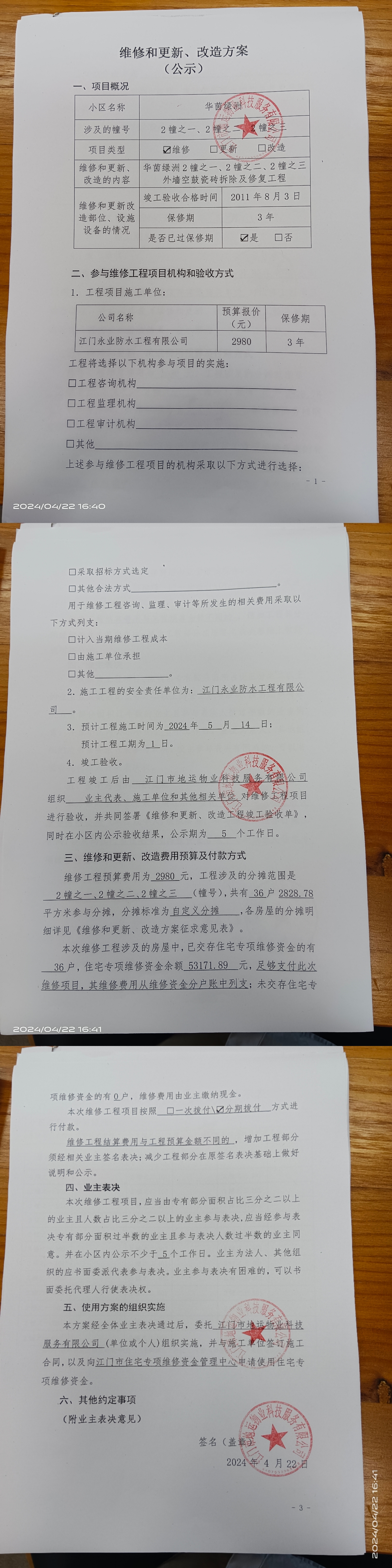 <td VALIGN="top" VALUES="" STYLE="border-width:0" BINDTYPE="0" ROWSPAN="17" COLSPAN="7" DATASOURCE="投票结果" ><font style=" font-family:方正小标宋简体;font-size:14pt;"><p style="line-height: 1.75em;"><span style="font-family: 宋体, SimSun;">各位尊敬的业主:</span><br/></p><p style="text-indent: 2em; line-height: 1.75em;"><span style="font-family: 宋体, SimSun;">根据法律法规的规定,本小区业主利用“江门市物业事项表决管理系统”已对本小区公共事务决策事项进行了表决,在经过7日的询异公示期后,未收到业主有效的异议。现将投票结果公告,并就产生的法律效力说明如下:</span></p><p style="line-height: 1.75em; text-indent: 0em;"><strong style="text-indent: 2em;"><span style="font-family: 宋体, SimSun;">一、投票范围</span></strong></p><p style="text-indent: 2em; line-height: 1.75em;"><span style="font-family: 宋体, SimSun;">华茵绿洲江门市江海区华茵绿洲2幢</span></p><p style="text-indent: 2em; line-height: 1.75em;"><span style="font-family: 宋体, SimSun;">总人数(专有部分人数之和):36</span></p><p style="text-indent: 2em; line-height: 1.75em;"><span style="font-family: 宋体, SimSun;"><span style="font-family: 宋体, SimSun; text-indent: 32px;"><span style="font-family: 宋体; text-indent: 32px;"><span style="font-family: 宋体; text-indent: 32px;">总户数:36</span></span></span></span></p><p style="text-indent: 2em; line-height: 1.75em;"><span style="font-family: 宋体, SimSun;">建筑物总面积(专有部分面积之和):2828.78㎡</span></p><p style="line-height: 1.75em;"><strong><span style="font-family: 宋体, SimSun;">二、投票结果公告时间</span></strong></p><p style="text-indent: 2em; line-height: 1.75em;"><span style="font-family: 宋体, SimSun;">从2024年05月21日开始</span></p><p style="line-height: 1.75em;"><strong><span style="font-family: 宋体, SimSun;">三、计票规则</span></strong></p><p style="text-indent: 2em; line-height: 1.75em;"><span style="font-family: 宋体, SimSun;">表决事项:使用建筑物及其附属设施的维修资金<br /><p style='font-family: 宋体, SimSun;line-height: 1.75em; text-indent: 2em;'>计票规则:弃权票不并入其它项&nbsp;&nbsp;&nbsp;&nbsp;未表决票不并入其它项</p></span></p><p style="line-height: 1.75em;"><strong><span style="font-family: 宋体, SimSun;">四、通过规则</span></strong></p><p style="line-height: 1.75em;"><strong><span style="font-family: 宋体, SimSun;">&nbsp; 根据《中华人民共和国民法典》第二百七十八条规定:业主共同决定事项,应当由专有部分面积占比三分之二以上的业主且人数占比三分之二以上的业主参与表决。</span></strong></p><p style="text-indent: 2em; line-height: 1.75em;"><span style="font-family: 宋体, SimSun;"><span style="font-family: 宋体, SimSun; text-indent: 32px;">表决事项:使用建筑物及其附属设施的维修资金<br /><p style='font-family: 宋体, SimSun;line-height: 1.75em; text-indent: 2em;'>通过规则:双2/3以上参与表决,参与表决双过半同意</p></span></span></p><p style="line-height: 1.75em;"><strong><span style="font-family: 宋体, SimSun;">五、投票结果</span></strong></p><p style="line-height: 1.75em; text-indent: 2em;"><span style="font-family: 宋体, SimSun; text-indent: 2em;"><div id='resultTable'><table style='table-layout: fixed; font-size:12px; margin-top:10px' width='100%' border='0' cellspacing='0' cellpadding='0'><tr><td height='28' colspan='10' align='center' style='border: 1px solid #666'><strong style='font-size: 14px;'> 使用建筑物及其附属设施的维修资金</strong></td> </tr><tr id='trfirst'><td height='28' colspan='4' style='border-left: 1px solid #666; border-bottom: 1px solid #666'><strong>&nbsp;申报单位:</strong> 江门市地运物业科技服务有限公司</td><td colspan='3' style='border-left: 1px solid #666; border-bottom: 1px solid #666'><strong>&nbsp;联系方式:</strong> </td><td colspan='3' style='border-left: 1px solid #666; border-bottom: 1px solid #666; border-right: 1px solid #666'><strong>&nbsp;申报日期:</strong> 2024年4月21日 </td></tr><tr> <td height='28' colspan='5' style='border-left: 1px solid #666; border-bottom: 1px solid #666'><strong>&nbsp;列支总人数(专有部分人数之和):</strong>36人 </td><td colspan='5' style='border-left: 1px solid #666; border-bottom: 1px solid #666; border-right: 1px solid #666'><strong>&nbsp;列支建筑物总面积(专有部分面积之和):</strong>2828.78㎡ </td> </tr><tr><td height='28' colspan='10' bgcolor='#F3F3F3' style='border-left: 1px solid #666;border-bottom: 1px solid #666;border-right: 1px solid #666'><strong>&nbsp;参与表决人数及面积统计</strong></td></tr><tr><td height='28' colspan='5' style='border-left: 1px solid #666; border-bottom: 1px solid #666'><strong>&nbsp;参与表决人数:</strong>29人</td><td colspan='5' style='border-left: 1px solid #666; border-bottom: 1px solid #666; border-right: 1px solid #666'><strong>&nbsp;参与表决人数占总人数比例:</strong>80.56%</td></tr><tr><td height='28' colspan='5' style='border-left: 1px solid #666; border-bottom: 1px solid #666'><strong>&nbsp;参与表决面积:</strong>2278.08㎡</td><td colspan='5' style='border-left: 1px solid #666; border-bottom: 1px solid #666; border-right: 1px solid #666'><strong>&nbsp;参与表决面积占总面积比例:</strong>80.53%</td></tr><tr><td height='28' colspan='10' bgcolor='#F3F3F3' style='border-left: 1px solid #666; border-bottom: 1px solid #666;border-right: 1px solid #666'> <strong>&nbsp;参与表决同意人数及面积统计</strong></td> </tr><tr><td height='28' colspan='5' style='border-left: 1px solid #666; border-bottom: 1px solid #666'><strong>&nbsp;参与表决同意人数:</strong>23人 </td><td colspan='5' style='border-left: 1px solid #666; border-bottom: 1px solid #666; border-right: 1px solid #666'><st