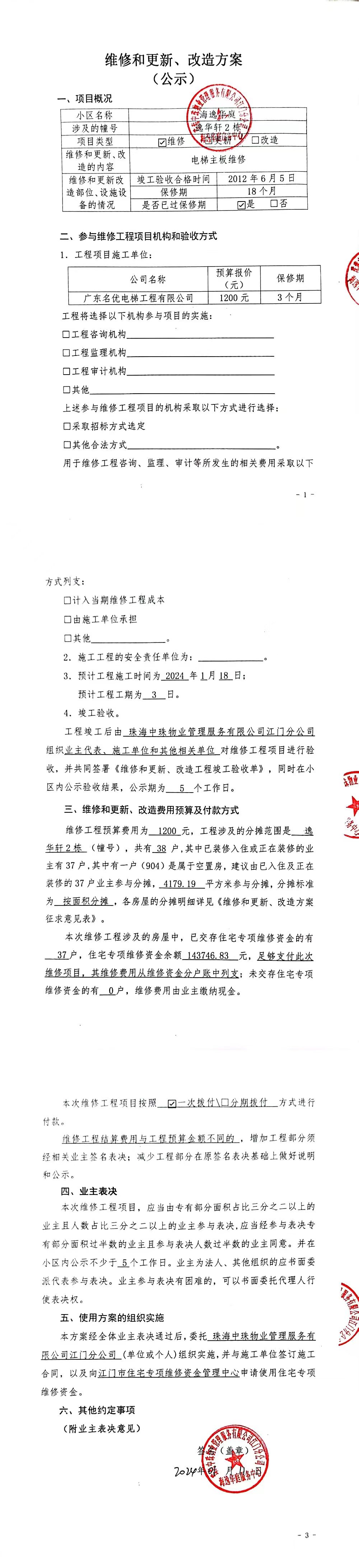 <td VALIGN="top" VALUES="" STYLE="border-width:0" BINDTYPE="0" ROWSPAN="19" COLSPAN="7" DATASOURCE="投票结果" ><font style="font-size:14pt;"><p style="white-space: normal; font-family: 宋体; line-height: 1.75em;">海逸华庭江海区海逸华庭逸华轩2幢全体业主:</p><p style="white-space: normal; font-family: 宋体; line-height: 1.75em; text-indent: 2em;">本小区关于海逸华庭逸华轩2栋电梯主板维修资金的投票的投票已表决结束,询异时间从2024年01月28日开始,投票询异公示期间,业主可通过微信查询自己的表决情况或可凭身份证件申请查询自己的表决情况;如公示的业主表决情况与查询的本人表决意见不一致的,可以以书面形式向投票组织机构申诉,投票组织机构予以纠正并重新公示表决结果。异议提出人对投票组织机构的处理仍有异议的,可以向街道办事处(镇人民政府)反映处理,涉及住宅专项维修资金的,可向属地住宅专项维修资金管理中心反映处理。</p><p style="white-space: normal;"><br/></p><p style="white-space: normal; font-family: 宋体; line-height: 1.75em;"><strong>附件:</strong></p><p style="white-space: normal; font-family: 宋体; line-height: 1.75em;"><strong>一、投票范围</strong></p><p style="white-space: normal; font-family: 宋体; line-height: 1.75em; text-indent: 2em;">海逸华庭江海区海逸华庭逸华轩2幢</p><p style="white-space: normal; font-family: 宋体; line-height: 1.75em; text-indent: 2em;">总人数(专有部分人数之和):37</p><p style="white-space: normal; font-family: 宋体; line-height: 1.75em; text-indent: 2em;"><span style="font-family: 宋体, SimSun;"><span style="font-family: 宋体; text-indent: 32px;"><span style="font-family: 宋体; text-indent: 32px;">总户数:37</span></span></span></p><p style="white-space: normal; font-family: 宋体; line-height: 1.75em; text-indent: 2em;">建筑物总面积(专有部分面积之和):4179.19㎡</p><p style="white-space: normal; font-family: 宋体; line-height: 1.75em;"><strong>二、询异公示起止时间</strong></p><p dir="ltr" style="white-space: normal; font-family: 宋体; line-height: 1.75em; text-indent: 2em;"><span style="text-indent: 36px;">2024年01月28日至2024年02月03日</span></p><p style="white-space: normal; font-family: 宋体; line-height: 1.75em;"><strong>三、投票详细描述</strong></p><p style="white-space: normal; font-family: 宋体; line-height: 1.75em; text-indent: 2em;"><p><span style="font-size: 14px; letter-spacing: 0px; text-wrap: wrap; font-family: 宋体; background: rgb(255, 255, 255);">本小区海逸华庭逸</span><span style="font-size: 14px; letter-spacing: 0px; text-wrap: wrap; font-family: 宋体; background: rgb(255, 255, 255);">华</span><span style="font-size: 14px; letter-spacing: 0px; text-wrap: wrap; font-family: 宋体; background: rgb(255, 255, 255);">轩</span><span style="font-size: 14px; letter-spacing: 0px; text-wrap: wrap; font-family: 宋体; background: rgb(255, 255, 255);">2</span><span style="font-size: 14px; letter-spacing: 0px; text-wrap: wrap; font-family: 宋体; background: rgb(255, 255, 255);">栋的电梯</span><span style="font-size: 14px; letter-spacing: 0px; text-wrap: wrap; font-family: 宋体; background: rgb(255, 255, 255);">,服务中心</span><span style="font-size: 14px; letter-spacing: 0px; text-wrap: wrap; font-family: 宋体; background: rgb(255, 255, 255);">接到业主反映该电梯停止运行,经维保公司现场检查</span><span style="font-size: 14px; letter-spacing: 0px; text-wrap: wrap; font-family: 宋体; background: rgb(255, 255, 255);">,主板信号灯不亮,经反复测试确认为主板故障,</span><span style="font-size: 14px; letter-spacing: 0px; text-wrap: wrap; font-family: 宋体; background: rgb(255, 255, 255);">需对该栋电梯</span><span style="font-size: 14px; text-wrap: wrap; font-family: 宋体; background-color: rgb(255, 255, 255);">主板</span><span style="font-size: 14px; letter-spacing: 0px; text-wrap: wrap; font-family: 宋体; background: rgb(255, 255, 255);">进行维修,已过保修期。现需申请使用维修资金对海逸华庭逸</span><span style="font-size: 14px; letter-spacing: 0px; text-wrap: wrap; font-family: 宋体; background: rgb(255, 255, 255);">华</span><span style="font-size: 14px; letter-spacing: 0px; text-wrap: wrap; font-family: 宋体; background: rgb(255, 255, 255);">轩</span><span style="font-size: 14px; letter-spacing: 0px; text-wrap: wrap; font-family: 宋体; background: rgb(255, 255, 255);"><span style="font-family: Calibri;">2</span></span><span style="font-size: 14px; letter-spacing: 0px; text-wrap: wrap; font-family: 宋体; background: rgb(255, 255, 255);">栋</span><span style="font-size: 14px; letter-spacing: 0px; text-wrap: wrap; font-family: 宋体; background: rgb(255, 255, 255);">电梯</span><span style="font-size: 14px; letter-spacing: 0px; text-wrap: wrap; font-family: 宋体; background: rgb(255, 255, 255);">维修,工程维修预算金额为</span><span style="font-size: 14px; letter-spacing: 0px; text-wrap: wrap; font-family: 宋体; background: rgb(255, 255, 255);"><span style="font-family: Calibri;">1200</span></span><span style="font-size: 14px; letter-spacing: 0px; text-wrap: wrap; font-family: 宋体; background: rgb(255, 255, 255);">元,项目最终费用以施工合同签订金额为准,维修费用的分摊标准为按建筑面积分摊,每平方约:</span><span style="font-size: 14px; letter-spacing: 0px; text-wrap: wrap; font-family: 宋体; background: rgb(255, 255, 255);"><span style="font-family: Calibri;">0.29</span></span><span style="font-size: 14px; letter-spacing: 0px; text-wrap: wrap; font-family: 宋体; background: rgb(255, 255, 255);">元,详细公示附件。如业主手机不能通过正常的微信投票,请联系物业服务中心进行线下或短信投票,物业服务中心电话:</span><span style="font-size: 14px; letter