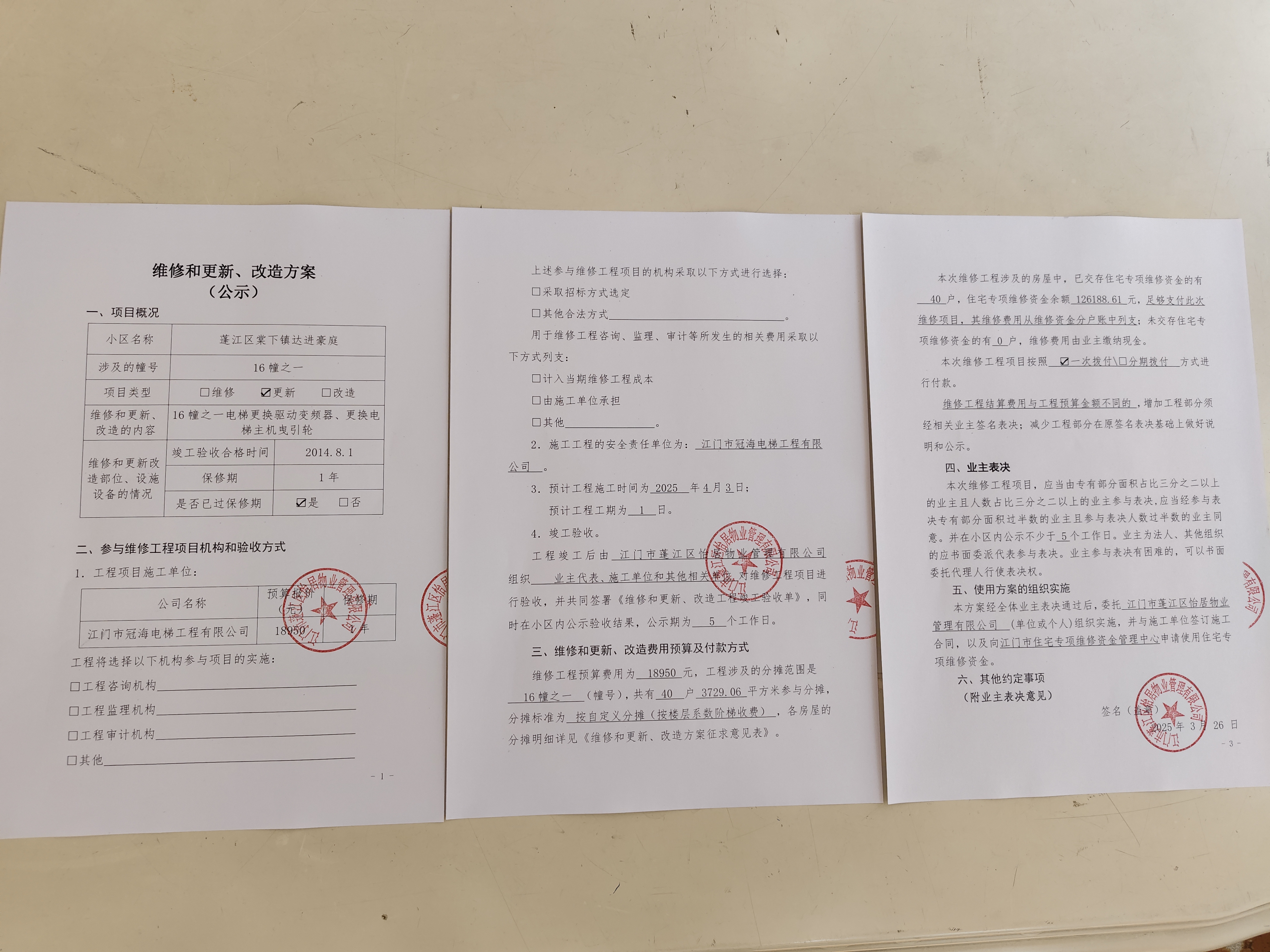 <td VALIGN="top" VALUES="" STYLE="border-width:0" BINDTYPE="0" ROWSPAN="19" COLSPAN="7" DATASOURCE="投票结果" ><font style="font-size:14pt;"><p style="white-space: normal; font-family: 宋体; line-height: 1.75em;">达进豪庭蓬江区棠下镇达进豪庭16幢之一全体业主:</p><p style="white-space: normal; font-family: 宋体; line-height: 1.75em; text-indent: 2em;">本小区关于达进豪庭小区16幢之一电梯更换驱动变频器、更换电梯主机曳引轮工程的投票已表决结束,询异时间从2025年03月28日开始,投票询异公示期间,业主可通过微信查询自己的表决情况或可凭身份证件申请查询自己的表决情况;如公示的业主表决情况与查询的本人表决意见不一致的,可以以书面形式向投票组织机构申诉,投票组织机构予以纠正并重新公示表决结果。异议提出人对投票组织机构的处理仍有异议的,可以向街道办事处(镇人民政府)反映处理,涉及住宅专项维修资金的,可向属地住宅专项维修资金管理中心反映处理。</p><p style="white-space: normal;"><br/></p><p style="white-space: normal; font-family: 宋体; line-height: 1.75em;"><strong>附件:</strong></p><p style="white-space: normal; font-family: 宋体; line-height: 1.75em;"><strong>一、投票范围</strong></p><p style="white-space: normal; font-family: 宋体; line-height: 1.75em; text-indent: 2em;">达进豪庭蓬江区棠下镇达进豪庭16幢之一</p><p style="white-space: normal; font-family: 宋体; line-height: 1.75em; text-indent: 2em;">总人数(专有部分人数之和):40</p><p style="white-space: normal; font-family: 宋体; line-height: 1.75em; text-indent: 2em;"><span style="font-family: 宋体, SimSun;"><span style="font-family: 宋体; text-indent: 32px;"><span style="font-family: 宋体; text-indent: 32px;">总户数:40</span></span></span></p><p style="white-space: normal; font-family: 宋体; line-height: 1.75em; text-indent: 2em;">建筑物总面积(专有部分面积之和):3729.06㎡</p><p style="white-space: normal; font-family: 宋体; line-height: 1.75em;"><strong>二、询异公示起止时间</strong></p><p dir="ltr" style="white-space: normal; font-family: 宋体; line-height: 1.75em; text-indent: 2em;"><span style="text-indent: 36px;">2025年03月28日至2025年04月07日</span></p><p style="white-space: normal; font-family: 宋体; line-height: 1.75em;"><strong>三、投票详细描述</strong></p><p style="white-space: normal; font-family: 宋体; line-height: 1.75em; text-indent: 2em;"><p><span style="font-size: 14px; text-wrap: wrap; background-color: rgb(255, 255, 255); font-family: 宋体;">小区</span><span style="font-size: 14px; text-wrap: wrap;"><span style="font-family:Calibri;"><span style="background-color: rgb(255, 255, 255);">16幢之一</span></span></span><span style="font-size: 14px; text-wrap: wrap; background-color: rgb(255, 255, 255); font-family: 宋体;">的电梯故障</span><span style="font-size: 14px; text-wrap: wrap; background-color: rgb(255, 255, 255); font-family: 宋体;">,经检查,是由于</span><span style="font-size: 14px; text-wrap: wrap; background-color: rgb(255, 255, 255); font-family: 宋体;">驱动变频器故障,主机曳引轮严重磨损而不能正常运行</span><span style="font-size: 14px; text-wrap: wrap; background-color: rgb(255, 255, 255); font-family: 宋体;">。<br/></span><span style="font-family: "Helvetica Neue", Helvetica, Arial, sans-serif; font-size: 14px; text-wrap: wrap; background-color: rgb(255, 255, 255);"></span><span style="font-size: 14px; text-wrap: wrap; background-color: rgb(255, 255, 255); font-family: 宋体;"> 现对</span><span style="font-size: 14px; text-wrap: wrap; font-family: 宋体; background: rgb(255, 255, 0);"><span style="font-family: Calibri;"></span><span style="text-wrap: wrap; font-size: 14px;"><span style="font-family:Calibri"><span style="background-color: rgb(255, 255, 255);">16幢之一</span></span></span><span style="text-wrap: wrap; font-size: 14px; background-color: rgb(255, 255, 255); font-family: 宋体;">电梯</span></span><span style="background: rgb(255, 255, 255); text-wrap: wrap; font-size: 14px; font-family: 宋体;">进行更换驱动变频器、更换主机曳引轮</span><span style="font-size: 14px; text-wrap: wrap; background-color: rgb(255, 255, 255); font-family: 宋体;">,工程维修预算金额为</span><span style="font-size: 14px; text-wrap: wrap; background-color: rgb(255, 255, 255); font-family: 宋体;">18950元</span><span style="font-size: 14px; text-wrap: wrap; background-color: rgb(255, 255, 255); font-family: 宋体;">,项目最终费用以施工合同签订金额为准。因已过保修期,维修费用由相关业主</span><span style="background-color: rgb(255, 255, 255); font-family: 宋体; font-size: 14px;">按自定义分摊(按楼层系数阶梯收费)</span><span style="font-size: 14px; background-color: rgb(255, 255, 255); font-family: 宋体;">,</span><span style="font-size: 14px; font-family: 宋体;"><span style="background-color: rgb(255, 255, 255);">详见公示附件。</span><span style="background-color: rgb(255, 255, 255); font-size: 14px; text-wrap: wrap; font-family: 宋体;">如业主手机不能正常通过微信投票,请联系物业公司进行线下纸质投票,物业电话:</span></span><span style="background-color: rgb(255, 255, 255); font-size: 14px; text-wrap: wrap; font-family: 宋体;">0750-3594118。</span></p></p><p style="white-space: normal; font-family: 宋体; line-height: 1.75em;"><strong>四、计票规则</strong></p><p style="white-space: normal; font-family: 宋体; line-height: 1.75em; text-indent: 2em;">表决事项:达进豪庭小区16幢之一电梯更换驱动变频器、更换电梯主机曳引轮工程<br /><p style='text-align: left; font-family: 宋体; font-size: 16px; line-height: 1.75em; text-indent: 2em;'>计票规则:弃权票不并入其它项 未表决票不并入其