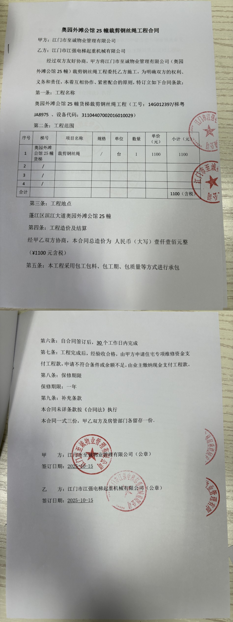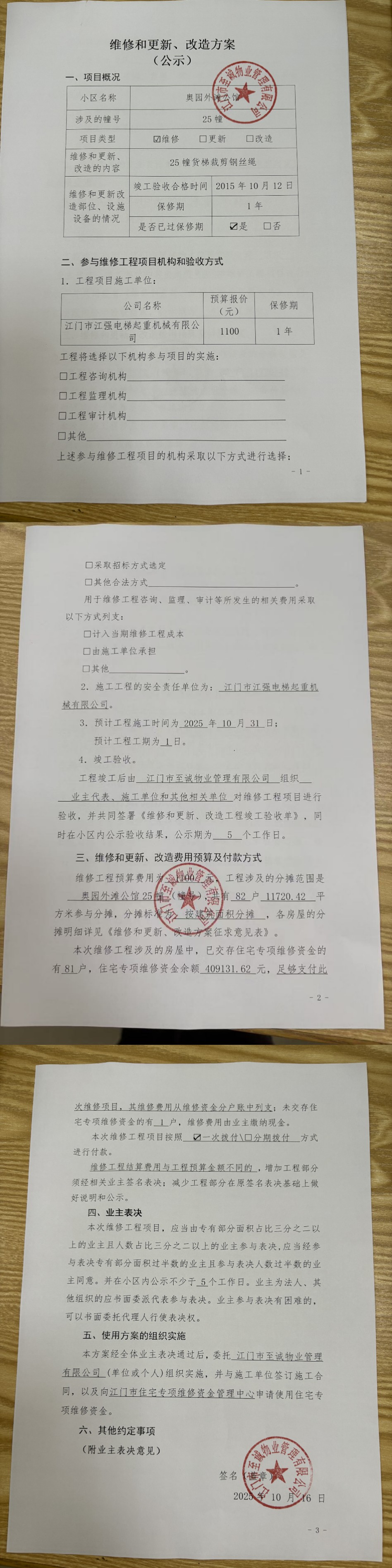 <td VALIGN="top" VALUES="" STYLE="border-width:0" BINDTYPE="0" ROWSPAN="17" COLSPAN="7" DATASOURCE="投票结果" ><font style=" font-family:方正小标宋简体;font-size:14pt;"><p style="line-height: 1.75em;"><span style="font-family: 宋体, SimSun;">各位尊敬的业主:</span><br/></p><p style="text-indent: 2em; line-height: 1.75em;"><span style="font-family: 宋体, SimSun;">根据法律法规的规定,本小区业主利用“江门市物业事项表决管理系统”已对本小区公共事务决策事项(<span style="font-family: 宋体; text-indent: 32px;">奥园外滩公馆25幢货梯裁剪钢丝绳使用维修资金的投票</span>)进行了表决,在经过7日的询异公示期后,未收到业主有效的异议。现将投票结果公告,并就产生的法律效力说明如下:</span></p><p style="line-height: 1.75em; text-indent: 0em;"><strong style="text-indent: 2em;"><span style="font-family: 宋体, SimSun;">一、投票范围</span></strong></p><p style="text-indent: 2em; line-height: 1.75em;"><span style="font-family: 宋体, SimSun;">奥园外滩公馆蓬江区棠下镇奥园外滩公馆25幢</span></p><p style="text-indent: 2em; line-height: 1.75em;"><span style="font-family: 宋体, SimSun;">总人数(专有部分人数之和):82</span></p><p style="text-indent: 2em; line-height: 1.75em;"><span style="font-family: 宋体, SimSun;"><span style="font-family: 宋体, SimSun; text-indent: 32px;"><span style="font-family: 宋体; text-indent: 32px;"><span style="font-family: 宋体; text-indent: 32px;">总户数:82</span></span></span></span></p><p style="text-indent: 2em; line-height: 1.75em;"><span style="font-family: 宋体, SimSun;">建筑物总面积(专有部分面积之和):11720.42㎡</span></p><p style="line-height: 1.75em;"><strong><span style="font-family: 宋体, SimSun;">二、投票结果公告时间</span></strong></p><p style="text-indent: 2em; line-height: 1.75em;"><span style="font-family: 宋体, SimSun;"><span style="font-family: 宋体, SimSun; text-indent: 32px;">从2025年11月30日开始</span></span></p><p style="line-height: 1.75em;"><strong><span style="font-family: 宋体, SimSun;">三、计票规则</span></strong></p><p style="text-indent: 2em; line-height: 1.75em;"><span style="font-family: 宋体, SimSun;">表决事项:使用建筑物及其附属设施的维修资金<br /><p style='font-family: 宋体, SimSun;line-height: 1.75em; text-indent: 2em;'>计票规则:弃权票不并入其它项&nbsp;&nbsp;&nbsp;&nbsp;未表决票不并入其它项</p></span></p><p style="line-height: 1.75em;"><strong><span style="font-family: 宋体, SimSun;">四、通过规则</span></strong></p><p style="line-height: 1.75em;"><strong><span style="font-family: 宋体, SimSun;">&nbsp; 根据《中华人民共和国民法典》第二百七十八条规定:业主共同决定事项,应当由专有部分面积占比三分之二以上的业主且人数占比三分之二以上的业主参与表决。</span></strong></p><p style="text-indent: 2em; line-height: 1.75em;"><span style="font-family: 宋体, SimSun;"><span style="font-family: 宋体, SimSun; text-indent: 32px;">表决事项:使用建筑物及其附属设施的维修资金<br /><p style='font-family: 宋体, SimSun;line-height: 1.75em; text-indent: 2em;'>通过规则:双2/3以上参与表决,参与表决双过半同意</p></span></span></p><p style="line-height: 1.75em;"><strong><span style="font-family: 宋体, SimSun;">五、投票结果</span></strong></p><p style="line-height: 1.75em; text-indent: 2em;"><span style="font-family: 宋体, SimSun; text-indent: 2em;"><div id='resultTable'><table style='table-layout: fixed; font-size:12px; margin-top:10px' width='100%' border='0' cellspacing='0' cellpadding='0'><tr><td height='28' colspan='10' align='center' style='border: 1px solid #666'><strong style='font-size: 14px;'> 使用建筑物及其附属设施的维修资金</strong></td> </tr><tr id='trfirst'><td height='28' colspan='4' style='border-left: 1px solid #666; border-bottom: 1px solid #666'><strong>&nbsp;申报单位:</strong> 江门市至诚物业管理有限公司</td><td colspan='3' style='border-left: 1px solid #666; border-bottom: 1px solid #666'><strong>&nbsp;联系方式:</strong> 3851968 </td><td colspan='3' style='border-left: 1px solid #666; border-bottom: 1px solid #666; border-right: 1px solid #666'><strong>&nbsp;申报日期:</strong> 2025年10月16日 </td></tr><tr> <td height='28' colspan='5' style='border-left: 1px solid #666; border-bottom: 1px solid #666'><strong>&nbsp;列支总人数(专有部分人数之和):</strong>82人 </td><td colspan='5' style='border-left: 1px solid #666; border-bottom: 1px solid #666; border-right: 1px solid #666'><strong>&nbsp;列支建筑物总面积(专有部分面积之和):</strong>11720.42㎡ </td> </tr><tr><td height='28' colspan='10' bgcolor='#F3F3F3' style='border-left: 1px solid #666;border-bottom: 1px solid #666;border-right: 1px solid #666'><strong>&nbsp;参与表决人数及面积统计</strong></td></tr><tr><td height='28' colspan='5' style='border-left: 1px solid #666; border-bottom: 1px solid #666'><strong>&nbsp;参与表决人数:</strong>61人</td><td colspan='5' style='border-left: 1px solid #666; border-bottom: 1px solid #666; border-right: 1px solid #666'><strong>&nbsp;参与表决人数占总人数比例:</strong>74.39%</td></tr><tr><td height='28' colspan='5' style='border-left: 1px solid #666; border-bottom: 1px solid #666'><strong>&nbsp;参与表决面积:</strong>8732.59㎡</td><td colspan='5' style='border-left: 1px solid #666; border-bottom: 1px solid #666; border-right: 1px solid #666'><strong>&nbsp;参与表决面积占总面积比例:</strong>74.51%</td></tr><tr><td height='28' colspan='10' bgcolor='#F3F3F3' style='border-left: 1px solid #666; border-bottom: 1px solid #666;border-right: 1px solid #666'> <strong>&nbsp;参与表决同意人数及面积统计</strong></td> </tr><tr><td height='28' colspan='5' style='border-left: 1