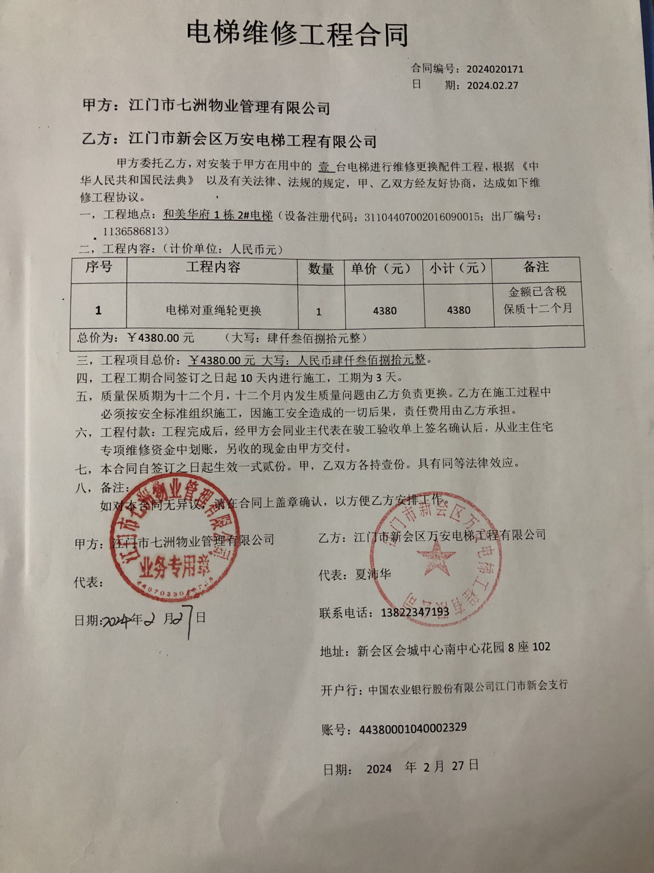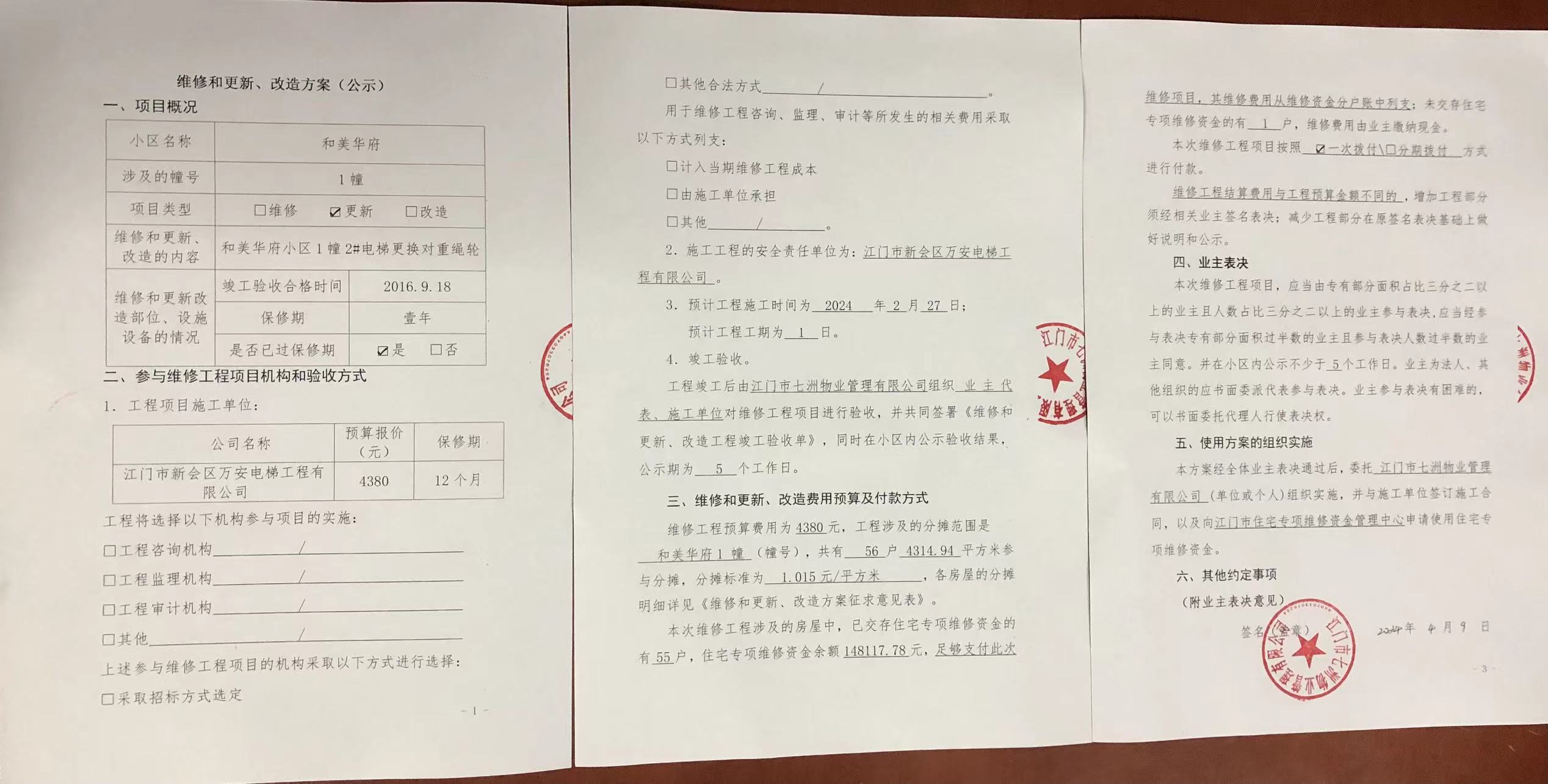 <td VALIGN="top" VALUES="" STYLE="border-width:0" BINDTYPE="0" ROWSPAN="19" COLSPAN="7" DATASOURCE="投票结果" ><font style="font-size:14pt;"><p style="white-space: normal; font-family: 宋体; line-height: 1.75em;">和美华府蓬江区和美华府1幢全体业主:</p><p style="white-space: normal; font-family: 宋体; line-height: 1.75em; text-indent: 2em;">本小区关于和美华府1幢2#电梯更换对重绳轮使用维修资金投票的投票已表决结束,询异时间从2024年04月27日开始,投票询异公示期间,业主可通过微信查询自己的表决情况或可凭身份证件申请查询自己的表决情况;如公示的业主表决情况与查询的本人表决意见不一致的,可以以书面形式向投票组织机构申诉,投票组织机构予以纠正并重新公示表决结果。异议提出人对投票组织机构的处理仍有异议的,可以向街道办事处(镇人民政府)反映处理,涉及住宅专项维修资金的,可向属地住宅专项维修资金管理中心反映处理。</p><p style="white-space: normal;"><br/></p><p style="white-space: normal; font-family: 宋体; line-height: 1.75em;"><strong>附件:</strong></p><p style="white-space: normal; font-family: 宋体; line-height: 1.75em;"><strong>一、投票范围</strong></p><p style="white-space: normal; font-family: 宋体; line-height: 1.75em; text-indent: 2em;">和美华府蓬江区和美华府1幢</p><p style="white-space: normal; font-family: 宋体; line-height: 1.75em; text-indent: 2em;">总人数(专有部分人数之和):55</p><p style="white-space: normal; font-family: 宋体; line-height: 1.75em; text-indent: 2em;"><span style="font-family: 宋体, SimSun;"><span style="font-family: 宋体; text-indent: 32px;"><span style="font-family: 宋体; text-indent: 32px;">总户数:56</span></span></span></p><p style="white-space: normal; font-family: 宋体; line-height: 1.75em; text-indent: 2em;">建筑物总面积(专有部分面积之和):4314.94㎡</p><p style="white-space: normal; font-family: 宋体; line-height: 1.75em;"><strong>二、询异公示起止时间</strong></p><p dir="ltr" style="white-space: normal; font-family: 宋体; line-height: 1.75em; text-indent: 2em;"><span style="text-indent: 36px;">2024年04月27日至2024年05月03日</span></p><p style="white-space: normal; font-family: 宋体; line-height: 1.75em;"><strong>三、投票详细描述</strong></p><p style="white-space: normal; font-family: 宋体; line-height: 1.75em; text-indent: 2em;"><p>小区1幢2#电梯日常运行时出常异响,经检查,是对重轴承损坏导致。现对1幢2#电梯更换对重绳轮,工程维修金额是4380元。因已过保修期,维修费用由相关业主按建筑面积分摊,每平方约1.015元,详见公示附件。如业主手机不能正常通过微信投票,请联系物业公司进行线下纸质投票,物业电话:0750-3692920。<br/></p></p><p style="white-space: normal; font-family: 宋体; line-height: 1.75em;"><strong>四、计票规则</strong></p><p style="white-space: normal; font-family: 宋体; line-height: 1.75em; text-indent: 2em;">表决事项:使用建筑物及其附属设施的维修资金<br /><p style='text-align: left; font-family: 宋体; font-size: 16px; line-height: 1.75em; text-indent: 2em;'>计票规则:弃权票不并入其它项 未表决票不并入其它项</p></p><p style="white-space: normal; font-family: 宋体; line-height: 1.75em;"><strong>五、通过规则</strong></p><p style="white-space: normal; font-family: 宋体; line-height: 1.75em;"><strong><strong style="white-space: normal;"><span style="font-family: 宋体, SimSun;"> 根据《中华人民共和国民法典》第二百七十八条规定:业主共同决定事项,应当由专有部分面积占比三分之二以上的业主且人数占比三分之二以上的业主参与表决。</span></strong></strong></p><p style="white-space: normal; font-family: 宋体; line-height: 1.75em; text-indent: 2em;">表决事项:使用建筑物及其附属设施的维修资金<br /><p style='text-align: left; font-family: 宋体; font-size: 16px; line-height: 1.75em; text-indent: 2em;'>通过规则:双2/3以上参与表决,参与表决双过半同意</p></p><p style="white-space: normal; font-family: 宋体; line-height: 1.75em;"><strong>六、投票结果</strong></p><p style="white-space: normal; font-family: 宋体; line-height: 1.75em; text-indent: 2em;"><div id='resultTable'><table style='table-layout: fixed; font-size:12px; margin-top:10px' width='100%' border='0' cellspacing='0' cellpadding='0'><tr><td height='28' colspan='10' align='center' style='border: 1px solid #666'><strong style='font-size: 14px;'> 使用建筑物及其附属设施的维修资金</strong></td> </tr><tr id='trfirst'><td height='28' colspan='4' style='border-left: 1px solid #666; border-bottom: 1px solid #666'><strong> 申报单位:</strong> 江门市七洲物业管理有限公司</td><td colspan='3' style='border-left: 1px solid #666; border-bottom: 1px solid #666'><strong> 联系方式:</strong> 0750-3338969 </td><td colspan='3' style='border-left: 1px solid #666; border-bottom: 1px solid #666; border-right: 1px solid #666'><strong> 申报日期:</strong> 2024年4月10日 </td></tr><tr> <td height='28' colspan='5' style='border-left: 1px solid #666; border-bottom: 1px solid #666'><strong> 总人数(专有部分人数之和):</strong>55人 </td><td colspan='5' style='border-left: 1px solid #666; border-bottom: 1px solid #666; border-right: 1px solid #666'><strong> 建筑物总面积(专有部分面积之和):</strong>4314.94㎡ </td> </tr><tr><td height='28' colspan='10' bgcolor='#F3F3F3' style='border-left: 1px solid #666;border-bottom: 1px solid #666;border-right: 1px solid #666'><strong> 参与人数及面积统计</strong></td></tr><tr><td height='28' colspan='5' style='border-left: 1px solid #666; border-bottom: 1px solid #666'><strong> 参与表决专有部分人数之和:</strong>38人</td><td colspan='5' style='bor