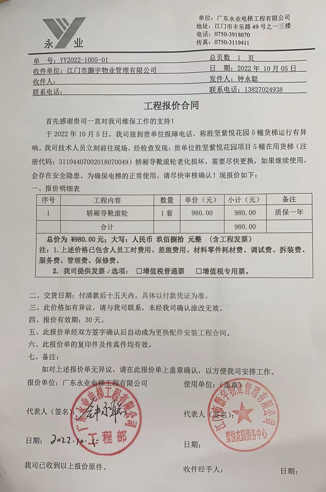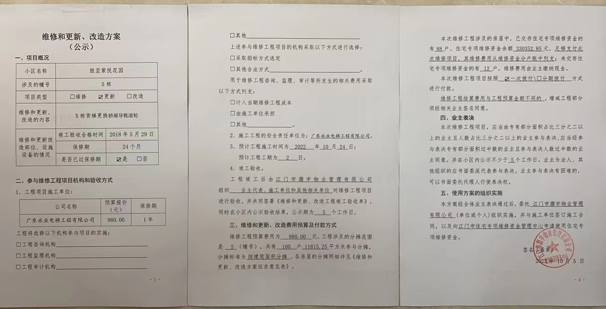 <td VALIGN="top" VALUES="" STYLE="border-width:0" BINDTYPE="0" ROWSPAN="19" COLSPAN="7" DATASOURCE="投票结果" ><font style="font-size:14pt;"><p style="white-space: normal; font-family: 宋体; line-height: 1.75em;">蓬江区胜坚紫悦花园蓬江区胜坚紫悦花园5幢全体业主:</p><p style="white-space: normal; font-family: 宋体; line-height: 1.75em; text-indent: 2em;">本小区关于江门胜坚紫悦花园5栋货梯更换轿厢导靴滚轮使用维修资金的投票的投票已表决结束,询异时间从2022年10月11日开始,投票询异公示期间,业主可通过微信查询自己的表决情况或可凭身份证件申请查询自己的表决情况;如公示的业主表决情况与查询的本人表决意见不一致的,可以以书面形式向投票组织机构申诉,投票组织机构予以纠正并重新公示表决结果。异议提出人对投票组织机构的处理仍有异议的,可以向街道办事处(镇人民政府)反映处理,涉及住宅专项维修资金的,可向属地住宅专项维修资金管理中心反映处理。</p><p style="white-space: normal;"><br/></p><p style="white-space: normal; font-family: 宋体; line-height: 1.75em;"><strong>附件:</strong></p><p style="white-space: normal; font-family: 宋体; line-height: 1.75em;"><strong>一、投票范围</strong></p><p style="white-space: normal; font-family: 宋体; line-height: 1.75em; text-indent: 2em;">蓬江区胜坚紫悦花园蓬江区胜坚紫悦花园5幢</p><p style="white-space: normal; font-family: 宋体; line-height: 1.75em; text-indent: 2em;">总人数(专有部分人数之和):89</p><p style="white-space: normal; font-family: 宋体; line-height: 1.75em; text-indent: 2em;"><span style="font-family: 宋体, SimSun;">总户数:100</span></p><p style="white-space: normal; font-family: 宋体; line-height: 1.75em; text-indent: 2em;">建筑物总面积(专有部分面积之和):11815.25㎡</p><p style="white-space: normal; font-family: 宋体; line-height: 1.75em;"><strong>二、询异公示起止时间</strong></p><p dir="ltr" style="white-space: normal; font-family: 宋体; line-height: 1.75em; text-indent: 2em;"><span style="text-indent: 36px;">2022年10月11日至2022年10月17日</span></p><p style="white-space: normal; font-family: 宋体; line-height: 1.75em;"><strong>三、投票详细描述</strong></p><p style="white-space: normal; font-family: 宋体; line-height: 1.75em; text-indent: 2em;"><p><span style="font-size: 16px;"><font face="宋体"> </font></span><span style="font-family: 宋体, SimSun; font-size: 16px;">本小区5幢货梯运行有异响,经检查是电梯<span style="font-family: 宋体, SimSun;">轿厢导靴滚轮损坏,</span>存在安全隐患,现立即停止使用电梯,需更换电梯<span style="font-family: 宋体, SimSun;">轿厢导靴滚轮</span>。由于5栋电梯保修期已于2019年6月到期。现需申请使用维修资金对5幢货梯进行维修,工程维修预算金额为:980.00元,项目最终费用以施工合同签订金额为准。维修费用的分摊标准为按建筑面积分摊,每平方约:0.083元,详见公示附件。如业主手机不能正常通过微信投票,请联系物业公司进行线下纸质投票,物业电话:0750-3339221。</span></p><p><br/></p></p><p style="white-space: normal; font-family: 宋体; line-height: 1.75em;"><strong>四、计票规则</strong></p><p style="white-space: normal; font-family: 宋体; line-height: 1.75em; text-indent: 2em;">表决事项:使用建筑物及其附属设施的维修资金<br /><p style='text-align: left; font-family: 宋体; font-size: 16px; line-height: 1.75em; text-indent: 2em;'>计票规则:弃权票不并入其它项 未表决票不并入其它项</p></p><p style="white-space: normal; font-family: 宋体; line-height: 1.75em;"><strong>五、通过规则</strong></p><p style="white-space: normal; font-family: 宋体; line-height: 1.75em; text-indent: 2em;">表决事项:使用建筑物及其附属设施的维修资金<br /><p style='text-align: left; font-family: 宋体; font-size: 16px; line-height: 1.75em; text-indent: 2em;'>通过规则:参与表决专有部分面积过半数的业主且参与表决人数过半数的业主同意</p></p><p style="white-space: normal; font-family: 宋体; line-height: 1.75em;"><strong>六、投票结果</strong></p><p style="white-space: normal; font-family: 宋体; line-height: 1.75em; text-indent: 2em;"><div id='resultTable'><table style='table-layout: fixed; font-size:12px; margin-top:10px' width='100%' border='0' cellspacing='0' cellpadding='0'><tr><td height='28' colspan='10' align='center' style='border: 1px solid #666'><strong style='font-size: 14px;'> 使用建筑物及其附属设施的维修资金</strong></td> </tr><tr id='trfirst'><td height='28' colspan='4' style='border-left: 1px solid #666; border-bottom: 1px solid #666'><strong> 申报单位:</strong> 江门市灏宇物业管理有限公司</td><td colspan='3' style='border-left: 1px solid #666; border-bottom: 1px solid #666'><strong> 联系方式:</strong> </td><td colspan='3' style='border-left: 1px solid #666; border-bottom: 1px solid #666; border-right: 1px solid #666'><strong> 申报日期:</strong> 2022年10月6日 </td></tr><tr> <td height='28' colspan='5' style='border-left: 1px solid #666; border-bottom: 1px solid #666'><strong> 总人数(专有部分人数之和):</strong>89人 </td><td colspan='5' style='border-left: 1px solid #666; border-bottom: 1px solid #666; border-right: 1px solid #666'><strong> 建筑物总面积(专有部分面积之和):</strong>11815.25㎡ </td> </tr><tr><td height='28' colspan='10' bgcolor='#F3F3F3' style='border-left: 1px solid #666;border-bottom: 1px solid #666;border-right: 1px solid #666'><strong> 参与人数及面积统计</strong></td></tr><tr><td height='28' colspan='5' style='border-left: 1px solid #666; border-bottom: 1px solid #666'><strong> 参与表决专有部分人数之和:</strong>78人</td><td colspan='5' style='border