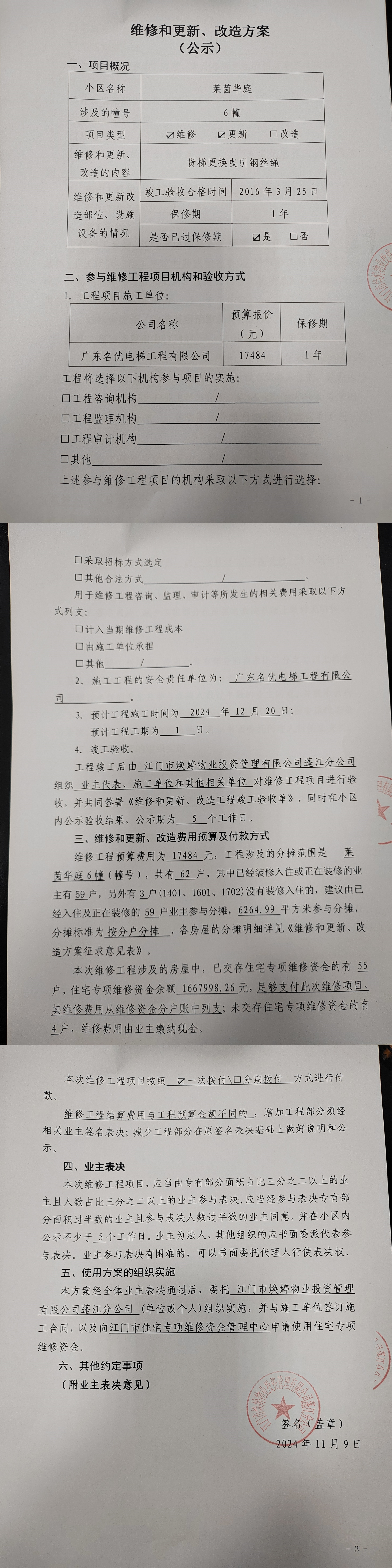 <td VALIGN="top" VALUES="" STYLE="border-width:0" BINDTYPE="0" ROWSPAN="19" COLSPAN="7" DATASOURCE="投票结果" ><font style="font-size:14pt;"><p style="white-space: normal; font-family: 宋体; line-height: 1.75em;">莱茵华庭蓬江区莱茵华庭6幢全体业主:</p><p style="white-space: normal; font-family: 宋体; line-height: 1.75em; text-indent: 2em;">本小区关于莱茵华庭小区6幢货梯更换曳引钢丝绳使用维修资金的投票的投票已表决结束,询异时间从2025年01月03日开始,投票询异公示期间,业主可通过微信查询自己的表决情况或可凭身份证件申请查询自己的表决情况;如公示的业主表决情况与查询的本人表决意见不一致的,可以以书面形式向投票组织机构申诉,投票组织机构予以纠正并重新公示表决结果。异议提出人对投票组织机构的处理仍有异议的,可以向街道办事处(镇人民政府)反映处理,涉及住宅专项维修资金的,可向属地住宅专项维修资金管理中心反映处理。</p><p style="white-space: normal;"><br/></p><p style="white-space: normal; font-family: 宋体; line-height: 1.75em;"><strong>附件:</strong></p><p style="white-space: normal; font-family: 宋体; line-height: 1.75em;"><strong>一、投票范围</strong></p><p style="white-space: normal; font-family: 宋体; line-height: 1.75em; text-indent: 2em;">莱茵华庭蓬江区莱茵华庭6幢</p><p style="white-space: normal; font-family: 宋体; line-height: 1.75em; text-indent: 2em;">总人数(专有部分人数之和):59</p><p style="white-space: normal; font-family: 宋体; line-height: 1.75em; text-indent: 2em;"><span style="font-family: 宋体, SimSun;"><span style="font-family: 宋体; text-indent: 32px;"><span style="font-family: 宋体; text-indent: 32px;">总户数:59</span></span></span></p><p style="white-space: normal; font-family: 宋体; line-height: 1.75em; text-indent: 2em;">建筑物总面积(专有部分面积之和):6264.99㎡</p><p style="white-space: normal; font-family: 宋体; line-height: 1.75em;"><strong>二、询异公示起止时间</strong></p><p dir="ltr" style="white-space: normal; font-family: 宋体; line-height: 1.75em; text-indent: 2em;"><span style="text-indent: 36px;">2025年01月03日至2025年01月13日</span></p><p style="white-space: normal; font-family: 宋体; line-height: 1.75em;"><strong>三、投票详细描述</strong></p><p style="white-space: normal; font-family: 宋体; line-height: 1.75em; text-indent: 2em;"><p style="font-family: "Helvetica Neue", Helvetica, Arial, sans-serif; font-size: 14px; white-space: normal; background-color: rgb(255, 255, 255);">莱茵华庭6幢货梯运行时停有异响,经检查由于电梯曳引钢丝绳散股导致与反绳轮受阻摩擦发出声音,需要更换曳引钢丝绳,才能恢复正常使用。</p><p style="font-family: "Helvetica Neue", Helvetica, Arial, sans-serif; font-size: 14px; white-space: normal; background-color: rgb(255, 255, 255);"> 现对6幢货梯进行维修,工程维修预算金额为17484元。最终费用以施工合同签订金额为准。因已过保修期,维修费用由相关业主按分户分摊,每户约296.34元,详见公示附件。如业主手机不能正常通过微信投票,请联系物业公司进行线下纸质投票,物业电话:0750-3212633。</p><p><br/></p></p><p style="white-space: normal; font-family: 宋体; line-height: 1.75em;"><strong>四、计票规则</strong></p><p style="white-space: normal; font-family: 宋体; line-height: 1.75em; text-indent: 2em;">表决事项:使用建筑物及其附属设施的维修资金<br /><p style='text-align: left; font-family: 宋体; font-size: 16px; line-height: 1.75em; text-indent: 2em;'>计票规则:弃权票不并入其它项 未表决票不并入其它项</p></p><p style="white-space: normal; font-family: 宋体; line-height: 1.75em;"><strong>五、通过规则</strong></p><p style="white-space: normal; font-family: 宋体; line-height: 1.75em;"><strong><strong style="white-space: normal;"><span style="font-family: 宋体, SimSun;"> 根据《中华人民共和国民法典》第二百七十八条规定:业主共同决定事项,应当由专有部分面积占比三分之二以上的业主且人数占比三分之二以上的业主参与表决。</span></strong></strong></p><p style="white-space: normal; font-family: 宋体; line-height: 1.75em; text-indent: 2em;">表决事项:使用建筑物及其附属设施的维修资金<br /><p style='text-align: left; font-family: 宋体; font-size: 16px; line-height: 1.75em; text-indent: 2em;'>通过规则:双2/3以上参与表决,参与表决双过半同意</p></p><p style="white-space: normal; font-family: 宋体; line-height: 1.75em;"><strong>六、投票结果</strong></p><p style="white-space: normal; font-family: 宋体; line-height: 1.75em; text-indent: 2em;"><div id='resultTable'><table style='table-layout: fixed; font-size:12px; margin-top:10px' width='100%' border='0' cellspacing='0' cellpadding='0'><tr><td height='28' colspan='10' align='center' style='border: 1px solid #666'><strong style='font-size: 14px;'> 使用建筑物及其附属设施的维修资金</strong></td> </tr><tr id='trfirst'><td height='28' colspan='4' style='border-left: 1px solid #666; border-bottom: 1px solid #666'><strong> 申报单位:</strong> 江门市焕婷物业投资管理有限公司蓬江分公司</td><td colspan='3' style='border-left: 1px solid #666; border-bottom: 1px solid #666'><strong> 联系方式:</strong> 3211392 </td><td colspan='3' style='border-left: 1px solid #666; border-bottom: 1px solid #666; border-right: 1px solid #666'><strong> 申报日期:</strong> 2024年12月13日 </td></tr><tr> <td height='28' colspan='5' style='border-left: 1px solid #666; border-bottom: 1px solid #666'><strong> 总人数(专有部分人数之和):</strong>59人 </td><td colspan='5' style='border-left: 1px solid #666; border-bottom: 1px solid #666; border-right: 1px solid #666'><strong