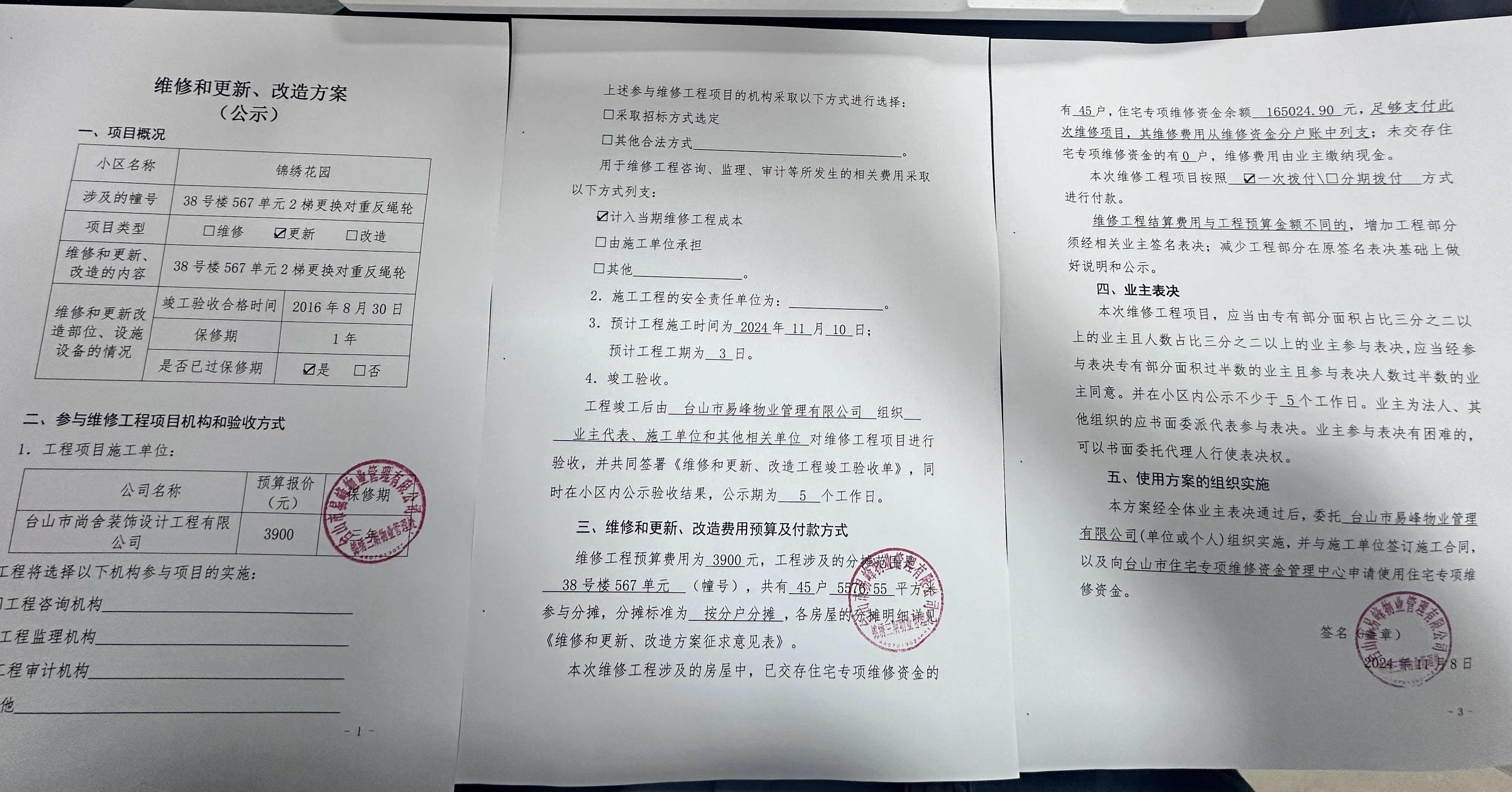 <td VALIGN="top" VALUES="" STYLE="border-width:0" BINDTYPE="0" ROWSPAN="17" COLSPAN="7" DATASOURCE="投票结果" ><font style=" font-family:方正小标宋简体;font-size:14pt;"><p style="line-height: 1.75em;"><span style="font-family: 宋体, SimSun;">各位尊敬的业主:</span><br/></p><p style="text-indent: 2em; line-height: 1.75em;"><span style="font-family: 宋体, SimSun;">根据法律法规的规定,本小区业主利用“江门市物业事项表决管理系统”已对本小区公共事务决策事项进行了表决,在经过7日的询异公示期后,未收到业主有效的异议。现将投票结果公告,并就产生的法律效力说明如下:</span></p><p style="line-height: 1.75em; text-indent: 0em;"><strong style="text-indent: 2em;"><span style="font-family: 宋体, SimSun;">一、投票范围</span></strong></p><p style="text-indent: 2em; line-height: 1.75em;"><span style="font-family: 宋体, SimSun;">锦绣花园台城锦绣花园38号</span></p><p style="text-indent: 2em; line-height: 1.75em;"><span style="font-family: 宋体, SimSun;">总人数(专有部分人数之和):45</span></p><p style="text-indent: 2em; line-height: 1.75em;"><span style="font-family: 宋体, SimSun;"><span style="font-family: 宋体, SimSun; text-indent: 32px;"><span style="font-family: 宋体; text-indent: 32px;"><span style="font-family: 宋体; text-indent: 32px;">总户数:45</span></span></span></span></p><p style="text-indent: 2em; line-height: 1.75em;"><span style="font-family: 宋体, SimSun;">建筑物总面积(专有部分面积之和):5576.55㎡</span></p><p style="line-height: 1.75em;"><strong><span style="font-family: 宋体, SimSun;">二、投票结果公告时间</span></strong></p><p style="text-indent: 2em; line-height: 1.75em;"><span style="font-family: 宋体, SimSun;"><span style="font-family: 宋体, SimSun; text-indent: 32px;">从2024年11月23日开始</span></span></p><p style="line-height: 1.75em;"><strong><span style="font-family: 宋体, SimSun;">三、计票规则</span></strong></p><p style="text-indent: 2em; line-height: 1.75em;"><span style="font-family: 宋体, SimSun;">表决事项:使用建筑物及其附属设施的维修资金<br /><p style='font-family: 宋体, SimSun;line-height: 1.75em; text-indent: 2em;'>计票规则:弃权票不并入其它项&nbsp;&nbsp;&nbsp;&nbsp;未表决票不并入其它项</p></span></p><p style="line-height: 1.75em;"><strong><span style="font-family: 宋体, SimSun;">四、通过规则</span></strong></p><p style="line-height: 1.75em;"><strong><span style="font-family: 宋体, SimSun;">&nbsp; 根据《中华人民共和国民法典》第二百七十八条规定:业主共同决定事项,应当由专有部分面积占比三分之二以上的业主且人数占比三分之二以上的业主参与表决。</span></strong></p><p style="text-indent: 2em; line-height: 1.75em;"><span style="font-family: 宋体, SimSun;"><span style="font-family: 宋体, SimSun; text-indent: 32px;">表决事项:使用建筑物及其附属设施的维修资金<br /><p style='font-family: 宋体, SimSun;line-height: 1.75em; text-indent: 2em;'>通过规则:双2/3以上参与表决,参与表决双过半同意</p></span></span></p><p style="line-height: 1.75em;"><strong><span style="font-family: 宋体, SimSun;">五、投票结果</span></strong></p><p style="line-height: 1.75em; text-indent: 2em;"><span style="font-family: 宋体, SimSun; text-indent: 2em;"><div id='resultTable'><table style='table-layout: fixed; font-size:12px; margin-top:10px' width='100%' border='0' cellspacing='0' cellpadding='0'><tr><td height='28' colspan='10' align='center' style='border: 1px solid #666'><strong style='font-size: 14px;'> 使用建筑物及其附属设施的维修资金</strong></td> </tr><tr id='trfirst'><td height='28' colspan='4' style='border-left: 1px solid #666; border-bottom: 1px solid #666'><strong>&nbsp;申报单位:</strong> 台山市易峰物业管理有限公司</td><td colspan='3' style='border-left: 1px solid #666; border-bottom: 1px solid #666'><strong>&nbsp;联系方式:</strong> 5533007 </td><td colspan='3' style='border-left: 1px solid #666; border-bottom: 1px solid #666; border-right: 1px solid #666'><strong>&nbsp;申报日期:</strong> 2024年11月8日 </td></tr><tr> <td height='28' colspan='5' style='border-left: 1px solid #666; border-bottom: 1px solid #666'><strong>&nbsp;列支总人数(专有部分人数之和):</strong>45人 </td><td colspan='5' style='border-left: 1px solid #666; border-bottom: 1px solid #666; border-right: 1px solid #666'><strong>&nbsp;列支建筑物总面积(专有部分面积之和):</strong>5576.55㎡ </td> </tr><tr><td height='28' colspan='10' bgcolor='#F3F3F3' style='border-left: 1px solid #666;border-bottom: 1px solid #666;border-right: 1px solid #666'><strong>&nbsp;参与表决人数及面积统计</strong></td></tr><tr><td height='28' colspan='5' style='border-left: 1px solid #666; border-bottom: 1px solid #666'><strong>&nbsp;参与表决人数:</strong>39人</td><td colspan='5' style='border-left: 1px solid #666; border-bottom: 1px solid #666; border-right: 1px solid #666'><strong>&nbsp;参与表决人数占总人数比例:</strong>86.67%</td></tr><tr><td height='28' colspan='5' style='border-left: 1px solid #666; border-bottom: 1px solid #666'><strong>&nbsp;参与表决面积:</strong>4828.21㎡</td><td colspan='5' style='border-left: 1px solid #666; border-bottom: 1px solid #666; border-right: 1px solid #666'><strong>&nbsp;参与表决面积占总面积比例:</strong>86.58%</td></tr><tr><td height='28' colspan='10' bgcolor='#F3F3F3' style='border-left: 1px solid #666; border-bottom: 1px solid #666;border-right: 1px solid #666'> <strong>&nbsp;参与表决同意人数及面积统计</strong></td> </tr><tr><td height='28' colspan='5' style='border-left: 1px solid #666; border-bottom: 1px solid #666'><strong>&nbsp;参与表决同意人数:</strong>39人 </td><td colspan='5' style='border-left: 1px solid #666; bord