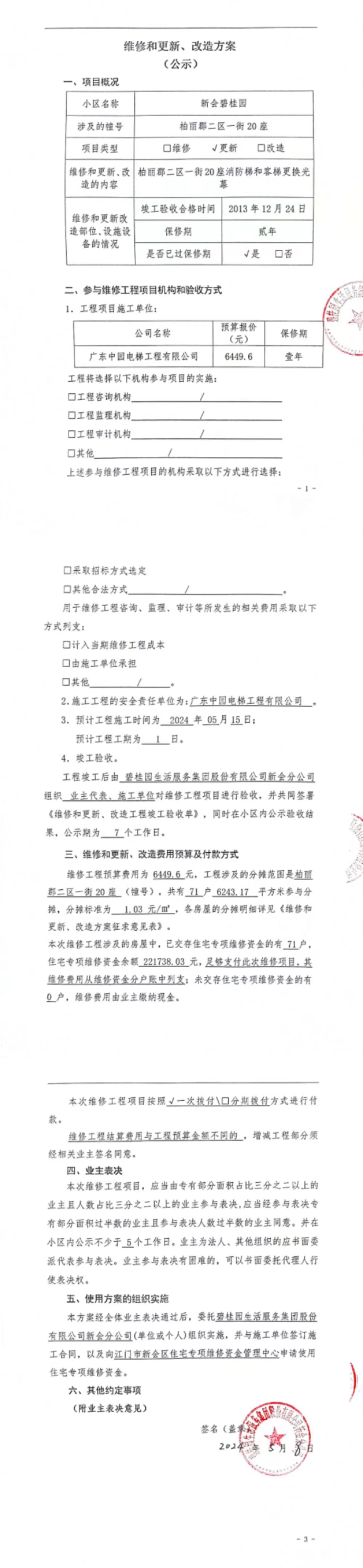 <td VALIGN="top" VALUES="" STYLE="border-width:0" BINDTYPE="0" ROWSPAN="17" COLSPAN="7" DATASOURCE="投票结果" ><font style=" font-family:方正小标宋简体;font-size:14pt;"><p style="line-height: 1.75em;"><span style="font-family: 宋体, SimSun;">各位尊敬的业主:</span><br/></p><p style="text-indent: 2em; line-height: 1.75em;"><span style="font-family: 宋体, SimSun;">根据法律法规的规定,本小区业主利用“江门市物业事项表决管理系统”已对本小区公共事务决策事项进行了表决,在经过7日的询异公示期后,未收到业主有效的异议。现将投票结果公告,并就产生的法律效力说明如下:</span></p><p style="line-height: 1.75em; text-indent: 0em;"><strong style="text-indent: 2em;"><span style="font-family: 宋体, SimSun;">一、投票范围</span></strong></p><p style="text-indent: 2em; line-height: 1.75em;"><span style="font-family: 宋体, SimSun;">新会碧桂园柏丽郡二区一街20座</span></p><p style="text-indent: 2em; line-height: 1.75em;"><span style="font-family: 宋体, SimSun;">总人数(专有部分人数之和):70</span></p><p style="text-indent: 2em; line-height: 1.75em;"><span style="font-family: 宋体, SimSun;"><span style="font-family: 宋体, SimSun; text-indent: 32px;"><span style="font-family: 宋体; text-indent: 32px;"><span style="font-family: 宋体; text-indent: 32px;">总户数:71</span></span></span></span></p><p style="text-indent: 2em; line-height: 1.75em;"><span style="font-family: 宋体, SimSun;">建筑物总面积(专有部分面积之和):6243.17㎡</span></p><p style="line-height: 1.75em;"><strong><span style="font-family: 宋体, SimSun;">二、投票结果公告时间</span></strong></p><p style="text-indent: 2em; line-height: 1.75em;"><span style="font-family: 宋体, SimSun;">从2024年06月05日开始</span></p><p style="line-height: 1.75em;"><strong><span style="font-family: 宋体, SimSun;">三、计票规则</span></strong></p><p style="text-indent: 2em; line-height: 1.75em;"><span style="font-family: 宋体, SimSun;">表决事项:使用建筑物及其附属设施的维修资金<br /><p style='font-family: 宋体, SimSun;line-height: 1.75em; text-indent: 2em;'>计票规则:弃权票不并入其它项&nbsp;&nbsp;&nbsp;&nbsp;未表决票不并入其它项</p></span></p><p style="line-height: 1.75em;"><strong><span style="font-family: 宋体, SimSun;">四、通过规则</span></strong></p><p style="line-height: 1.75em;"><strong><span style="font-family: 宋体, SimSun;">&nbsp; 根据《中华人民共和国民法典》第二百七十八条规定:业主共同决定事项,应当由专有部分面积占比三分之二以上的业主且人数占比三分之二以上的业主参与表决。</span></strong></p><p style="text-indent: 2em; line-height: 1.75em;"><span style="font-family: 宋体, SimSun;"><span style="font-family: 宋体, SimSun; text-indent: 32px;">表决事项:使用建筑物及其附属设施的维修资金<br /><p style='font-family: 宋体, SimSun;line-height: 1.75em; text-indent: 2em;'>通过规则:双2/3以上参与表决,参与表决双过半同意</p></span></span></p><p style="line-height: 1.75em;"><strong><span style="font-family: 宋体, SimSun;">五、投票结果</span></strong></p><p style="line-height: 1.75em; text-indent: 2em;"><span style="font-family: 宋体, SimSun; text-indent: 2em;"><div id='resultTable'><table style='table-layout: fixed; font-size:12px; margin-top:10px' width='100%' border='0' cellspacing='0' cellpadding='0'><tr><td height='28' colspan='10' align='center' style='border: 1px solid #666'><strong style='font-size: 14px;'> 使用建筑物及其附属设施的维修资金</strong></td> </tr><tr id='trfirst'><td height='28' colspan='4' style='border-left: 1px solid #666; border-bottom: 1px solid #666'><strong>&nbsp;申报单位:</strong> 碧桂园生活服务集团股份有限公司新会分公司</td><td colspan='3' style='border-left: 1px solid #666; border-bottom: 1px solid #666'><strong>&nbsp;联系方式:</strong> </td><td colspan='3' style='border-left: 1px solid #666; border-bottom: 1px solid #666; border-right: 1px solid #666'><strong>&nbsp;申报日期:</strong> 2024年5月9日 </td></tr><tr> <td height='28' colspan='5' style='border-left: 1px solid #666; border-bottom: 1px solid #666'><strong>&nbsp;列支总人数(专有部分人数之和):</strong>70人 </td><td colspan='5' style='border-left: 1px solid #666; border-bottom: 1px solid #666; border-right: 1px solid #666'><strong>&nbsp;列支建筑物总面积(专有部分面积之和):</strong>6243.17㎡ </td> </tr><tr><td height='28' colspan='10' bgcolor='#F3F3F3' style='border-left: 1px solid #666;border-bottom: 1px solid #666;border-right: 1px solid #666'><strong>&nbsp;参与表决人数及面积统计</strong></td></tr><tr><td height='28' colspan='5' style='border-left: 1px solid #666; border-bottom: 1px solid #666'><strong>&nbsp;参与表决人数:</strong>51人</td><td colspan='5' style='border-left: 1px solid #666; border-bottom: 1px solid #666; border-right: 1px solid #666'><strong>&nbsp;参与表决人数占总人数比例:</strong>72.86%</td></tr><tr><td height='28' colspan='5' style='border-left: 1px solid #666; border-bottom: 1px solid #666'><strong>&nbsp;参与表决面积:</strong>4485.02㎡</td><td colspan='5' style='border-left: 1px solid #666; border-bottom: 1px solid #666; border-right: 1px solid #666'><strong>&nbsp;参与表决面积占总面积比例:</strong>71.84%</td></tr><tr><td height='28' colspan='10' bgcolor='#F3F3F3' style='border-left: 1px solid #666; border-bottom: 1px solid #666;border-right: 1px solid #666'> <strong>&nbsp;参与表决同意人数及面积统计</strong></td> </tr><tr><td height='28' colspan='5' style='border-left: 1px solid #666; border-bottom: 1px solid #666'><strong>&nbsp;参与表决同意人数:</strong>49人 </td><td colspan='5' style='border-left: 1px solid #666; border-bottom: 1px solid #666; border-right: 1px solid 