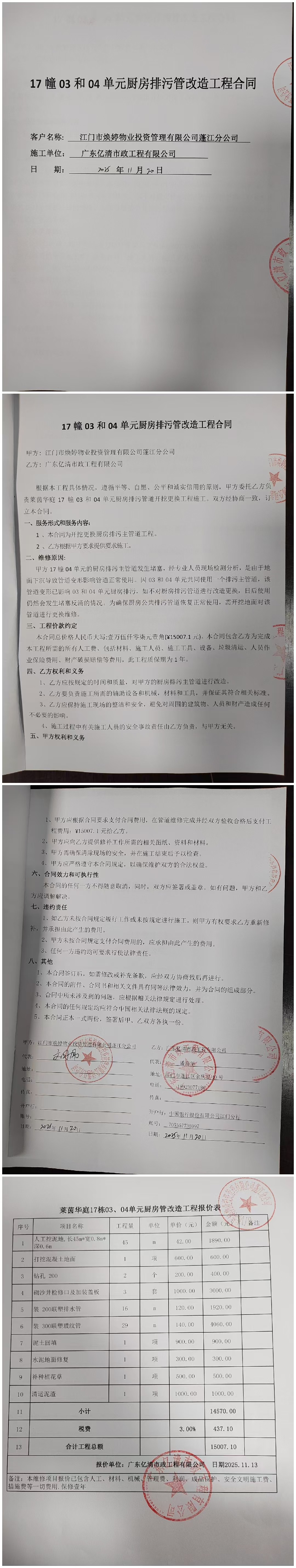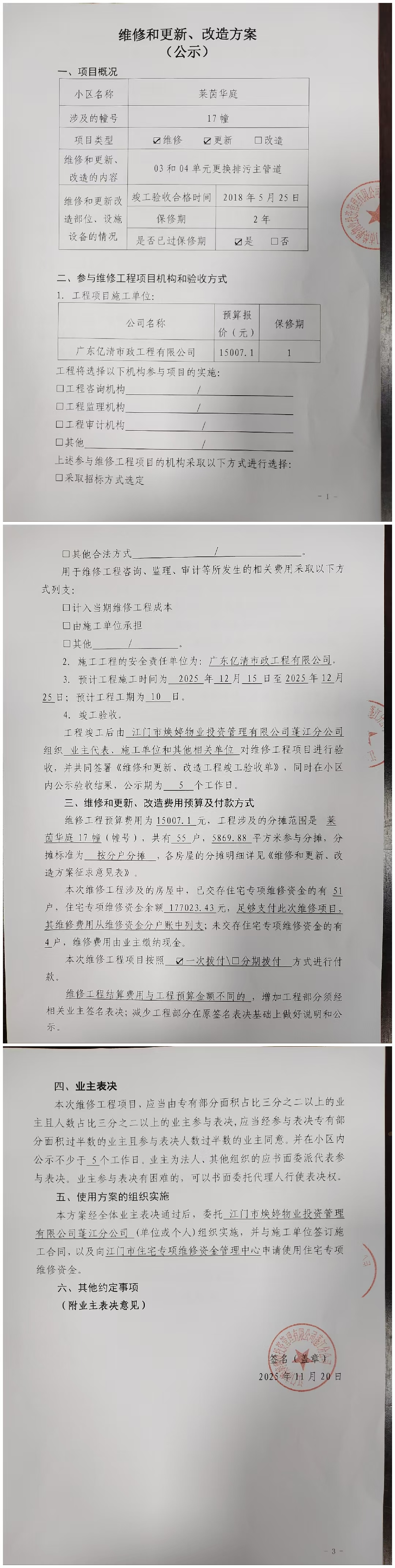 <td VALIGN="top" VALUES="" STYLE="border-width:0" BINDTYPE="0" ROWSPAN="19" COLSPAN="7" DATASOURCE="投票结果" ><font style="font-size:14pt;"><p style="white-space: normal; font-family: 宋体; line-height: 1.75em;">莱茵华庭蓬江区莱茵华庭17幢全体业主:</p><p style="white-space: normal; font-family: 宋体; line-height: 1.75em; text-indent: 2em;">本小区关于莱茵华庭小区17幢03.04单元改造厨房排污管道使用维修资金的投票的投票已表决结束,询异时间从2026年01月07日开始,投票询异公示期间,业主可通过微信查询自己的表决情况或可凭身份证件申请查询自己的表决情况;如公示的业主表决情况与查询的本人表决意见不一致的,可以以书面形式向投票组织机构申诉,投票组织机构予以纠正并重新公示表决结果。异议提出人对投票组织机构的处理仍有异议的,可以向街道办事处(镇人民政府)反映处理,涉及住宅专项维修资金的,可向属地住宅专项维修资金管理中心反映处理。</p><p style="white-space: normal;"><br/></p><p style="white-space: normal; font-family: 宋体; line-height: 1.75em;"><strong>附件:</strong></p><p style="white-space: normal; font-family: 宋体; line-height: 1.75em;"><strong>一、投票范围</strong></p><p style="white-space: normal; font-family: 宋体; line-height: 1.75em; text-indent: 2em;">莱茵华庭蓬江区莱茵华庭17幢</p><p style="white-space: normal; font-family: 宋体; line-height: 1.75em; text-indent: 2em;">总人数(专有部分人数之和):55</p><p style="white-space: normal; font-family: 宋体; line-height: 1.75em; text-indent: 2em;"><span style="font-family: 宋体, SimSun;"><span style="font-family: 宋体; text-indent: 32px;"><span style="font-family: 宋体; text-indent: 32px;">总户数:55</span></span></span></p><p style="white-space: normal; font-family: 宋体; line-height: 1.75em; text-indent: 2em;">建筑物总面积(专有部分面积之和):5869.88㎡</p><p style="white-space: normal; font-family: 宋体; line-height: 1.75em;"><strong>二、询异公示起止时间</strong></p><p dir="ltr" style="white-space: normal; font-family: 宋体; line-height: 1.75em; text-indent: 2em;"><span style="text-indent: 36px;">2026年01月07日至2026年01月14日</span></p><p style="white-space: normal; font-family: 宋体; line-height: 1.75em;"><strong>三、投票详细描述</strong></p><p style="white-space: normal; font-family: 宋体; line-height: 1.75em; text-indent: 2em;"><p><span style="font-family: arial, helvetica, sans-serif;"> 小区17幢</span>04单元厨房公共使用的排污管道发生堵塞情况,污水倒灌浸泡204单元,工程部人员到现场采取紧急措施,将一楼检修口盖子打开用于临时排污。11月10日工程部人员使用疏通机器对该管道进行疏通,在疏通过程中由于管道变形,水管卡在管道中无法进行疏通。经相关人员现场排查分析,原因是地面沉降、泥土流失导致管道变形而影响管道的正常使用。 03和04单元共同使用一个排污主管道,因该管道变形已影响03和04单元厨房排污,如不对厨房排污管道进行改造更换,日后使用仍然会发生堵塞反涌的情况。 </p><p><span style="font-family: arial, helvetica, sans-serif;"> 现对17幢03.04单元厨房排污管道进行改造,工程维修预算金额为15007.1元。最终费用以施工合同签订金额为准。因已过保修期,维修费用由相关业主按分户分摊,每户约272.86元,详见公示附件。如业主手机不能正常通过微信投票,请联系物业公司进行线下纸质投票,物业电话:0750-3212633。</span></p><p><br style="font-family: "Helvetica Neue", Helvetica, Arial, sans-serif; font-size: 14px; white-space: normal; background-color: rgb(255, 255, 255);"/></p><p><br/></p></p><p style="white-space: normal; font-family: 宋体; line-height: 1.75em;"><strong>四、计票规则</strong></p><p style="white-space: normal; font-family: 宋体; line-height: 1.75em; text-indent: 2em;">表决事项:使用建筑物及其附属设施的维修资金<br /><p style='text-align: left; font-family: 宋体; font-size: 16px; line-height: 1.75em; text-indent: 2em;'>计票规则:弃权票不并入其它项 未表决票不并入其它项</p></p><p style="white-space: normal; font-family: 宋体; line-height: 1.75em;"><strong>五、通过规则</strong></p><p style="white-space: normal; font-family: 宋体; line-height: 1.75em;"><strong><strong style="white-space: normal;"><span style="font-family: 宋体, SimSun;"> 根据《中华人民共和国民法典》第二百七十八条规定:业主共同决定事项,应当由专有部分面积占比三分之二以上的业主且人数占比三分之二以上的业主参与表决。</span></strong></strong></p><p style="white-space: normal; font-family: 宋体; line-height: 1.75em; text-indent: 2em;">表决事项:使用建筑物及其附属设施的维修资金<br /><p style='text-align: left; font-family: 宋体; font-size: 16px; line-height: 1.75em; text-indent: 2em;'>通过规则:双2/3以上参与表决,参与表决双过半同意</p></p><p style="white-space: normal; font-family: 宋体; line-height: 1.75em;"><strong>六、投票结果</strong></p><p style="white-space: normal; font-family: 宋体; line-height: 1.75em; text-indent: 2em;"><div id='resultTable'><table style='table-layout: fixed; font-size:12px; margin-top:10px' width='100%' border='0' cellspacing='0' cellpadding='0'><tr><td height='28' colspan='10' align='center' style='border: 1px solid #666'><strong style='font-size: 14px;'> 使用建筑物及其附属设施的维修资金</strong></td> </tr><tr id='trfirst'><td height='28' colspan='4' style='border-left: 1px solid #666; border-bottom: 1px solid #666'><strong> 申报单位:</strong> 江门市焕婷物业投资管理有限公司蓬江分公司</td><td colspan='3' style='border-left: 1px solid #666; border-bottom: 1px solid 