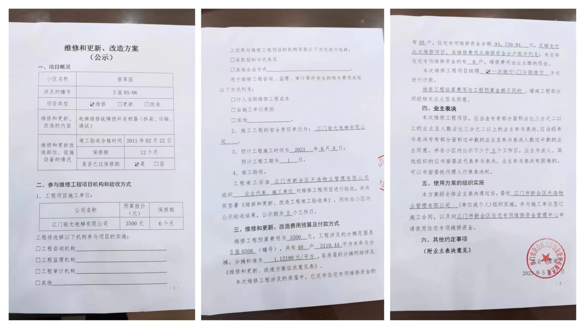 <td VALIGN="top" VALUES="" STYLE="border-width:0" BINDTYPE="0" ROWSPAN="19" COLSPAN="7" DATASOURCE="投票结果" ><font style="font-size:14pt;"><p style="white-space: normal; font-family: 宋体; line-height: 1.75em;">翡翠园翡翠园5座全体业主:</p><p style="white-space: normal; font-family: 宋体; line-height: 1.75em; text-indent: 2em;">本小区关于翡翠园5座05-06电梯维修损坏变频器使用维修资金投票的投票已表决结束,询异时间从2023年06月16日开始,投票询异公示期间,业主可通过微信查询自己的表决情况或可凭身份证件申请查询自己的表决情况;如公示的业主表决情况与查询的本人表决意见不一致的,可以以书面形式向投票组织机构申诉,投票组织机构予以纠正并重新公示表决结果。异议提出人对投票组织机构的处理仍有异议的,可以向街道办事处(镇人民政府)反映处理,涉及住宅专项维修资金的,可向属地住宅专项维修资金管理中心反映处理。</p><p style="white-space: normal;"><br/></p><p style="white-space: normal; font-family: 宋体; line-height: 1.75em;"><strong>附件:</strong></p><p style="white-space: normal; font-family: 宋体; line-height: 1.75em;"><strong>一、投票范围</strong></p><p style="white-space: normal; font-family: 宋体; line-height: 1.75em; text-indent: 2em;">翡翠园翡翠园5座</p><p style="white-space: normal; font-family: 宋体; line-height: 1.75em; text-indent: 2em;">总人数(专有部分人数之和):21</p><p style="white-space: normal; font-family: 宋体; line-height: 1.75em; text-indent: 2em;"><span style="font-family: 宋体, SimSun;">总户数:40</span></p><p style="white-space: normal; font-family: 宋体; line-height: 1.75em; text-indent: 2em;">建筑物总面积(专有部分面积之和):3119.44㎡</p><p style="white-space: normal; font-family: 宋体; line-height: 1.75em;"><strong>二、询异公示起止时间</strong></p><p dir="ltr" style="white-space: normal; font-family: 宋体; line-height: 1.75em; text-indent: 2em;"><span style="text-indent: 36px;">2023年06月16日至2023年06月22日</span></p><p style="white-space: normal; font-family: 宋体; line-height: 1.75em;"><strong>三、投票详细描述</strong></p><p style="white-space: normal; font-family: 宋体; line-height: 1.75em; text-indent: 2em;"><p>翡翠园5座05-06单元电梯故障困人,经检查,是由于电梯变频器使用多年老化故障损坏导致困人 ,已过保修期。现需申请使用维修资金对5座05-06单元的电梯维修,工程维修预算金额为:3500 元,项目最终费用以施工合同签订金额为准。维修费用的分摊标准为 每平方1.122元 ,详见公示附件。物业公司联系电话:0750-6602800</p></p><p style="white-space: normal; font-family: 宋体; line-height: 1.75em;"><strong>四、计票规则</strong></p><p style="white-space: normal; font-family: 宋体; line-height: 1.75em; text-indent: 2em;">表决事项:使用建筑物及其附属设施的维修资金<br /><p style='text-align: left; font-family: 宋体; font-size: 16px; line-height: 1.75em; text-indent: 2em;'>计票规则:弃权票不并入其它项 未表决票不并入其它项</p></p><p style="white-space: normal; font-family: 宋体; line-height: 1.75em;"><strong>五、通过规则</strong></p><p style="white-space: normal; font-family: 宋体; line-height: 1.75em; text-indent: 2em;">表决事项:使用建筑物及其附属设施的维修资金<br /><p style='text-align: left; font-family: 宋体; font-size: 16px; line-height: 1.75em; text-indent: 2em;'>通过规则:参与表决专有部分面积过半数的业主且参与表决人数过半数的业主同意</p></p><p style="white-space: normal; font-family: 宋体; line-height: 1.75em;"><strong>六、投票结果</strong></p><p style="white-space: normal; font-family: 宋体; line-height: 1.75em; text-indent: 2em;"><div id='resultTable'><table style='table-layout: fixed; font-size:12px; margin-top:10px' width='100%' border='0' cellspacing='0' cellpadding='0'><tr><td height='28' colspan='10' align='center' style='border: 1px solid #666'><strong style='font-size: 14px;'> 使用建筑物及其附属设施的维修资金</strong></td> </tr><tr id='trfirst'><td height='28' colspan='4' style='border-left: 1px solid #666; border-bottom: 1px solid #666'><strong> 申报单位:</strong> 江门市新会区天浩物业管理有限公司</td><td colspan='3' style='border-left: 1px solid #666; border-bottom: 1px solid #666'><strong> 联系方式:</strong> </td><td colspan='3' style='border-left: 1px solid #666; border-bottom: 1px solid #666; border-right: 1px solid #666'><strong> 申报日期:</strong> 2023年6月1日 </td></tr><tr> <td height='28' colspan='5' style='border-left: 1px solid #666; border-bottom: 1px solid #666'><strong> 总人数(专有部分人数之和):</strong>21人 </td><td colspan='5' style='border-left: 1px solid #666; border-bottom: 1px solid #666; border-right: 1px solid #666'><strong> 建筑物总面积(专有部分面积之和):</strong>3119.44㎡ </td> </tr><tr><td height='28' colspan='10' bgcolor='#F3F3F3' style='border-left: 1px solid #666;border-bottom: 1px solid #666;border-right: 1px solid #666'><strong> 参与人数及面积统计</strong></td></tr><tr><td height='28' colspan='5' style='border-left: 1px solid #666; border-bottom: 1px solid #666'><strong> 参与表决专有部分人数之和:</strong>19人</td><td colspan='5' style='border-left: 1px solid #666; border-bottom: 1px solid #666; border-right: 1px solid #666'><strong> 参与表决占有表决权总人数比例:</strong>90.48%</td></tr><tr><td height='28' colspan='5' style='border-left: 1px solid #666; border-bottom: 1px solid #666'><strong> 参与表决专有部分面积之和:</strong>2824.88㎡</td><td colspan='5' style='border-left: 1px solid #666; border-bottom: 1px solid #666; border-right: 1px solid #666'><strong> 参与表决占有表决权总面积比例:</stro