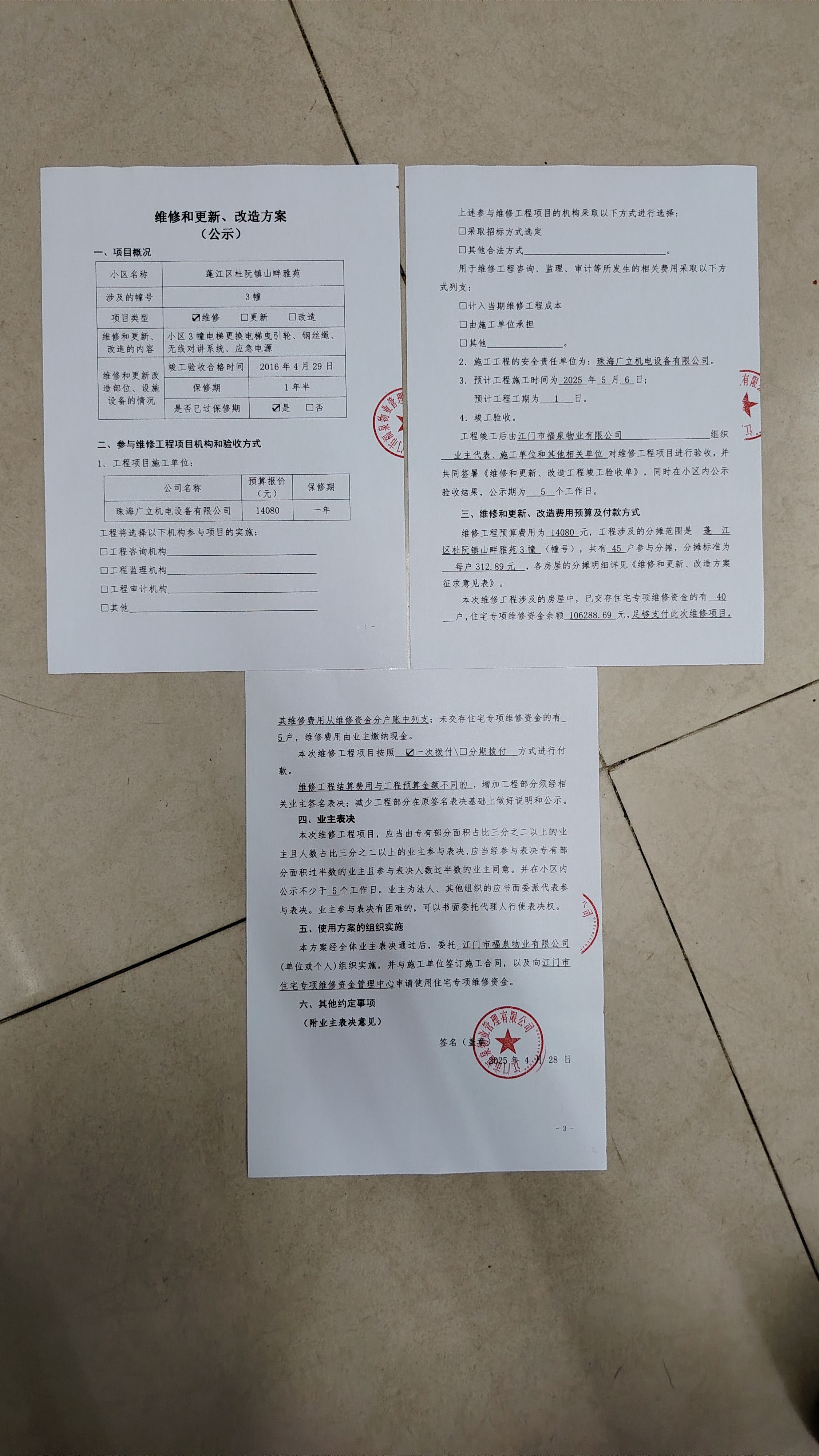 <td VALIGN="top" VALUES="" STYLE="border-width:0" BINDTYPE="0" ROWSPAN="19" COLSPAN="7" DATASOURCE="投票结果" ><font style="font-size:14pt;"><p style="white-space: normal; font-family: 宋体; line-height: 1.75em;">蓬江区杜阮镇山畔雅苑蓬江区山畔雅苑3幢全体业主:</p><p style="white-space: normal; font-family: 宋体; line-height: 1.75em; text-indent: 2em;">本小区关于山畔雅苑3幢更换电梯曳引轮、钢丝绳、无线对讲系统、应急电源使用维修资金的投票的投票已表决结束,询异时间从2025年06月18日开始,投票询异公示期间,业主可通过微信查询自己的表决情况或可凭身份证件申请查询自己的表决情况;如公示的业主表决情况与查询的本人表决意见不一致的,可以以书面形式向投票组织机构申诉,投票组织机构予以纠正并重新公示表决结果。异议提出人对投票组织机构的处理仍有异议的,可以向街道办事处(镇人民政府)反映处理,涉及住宅专项维修资金的,可向属地住宅专项维修资金管理中心反映处理。</p><p style="white-space: normal;"><br/></p><p style="white-space: normal; font-family: 宋体; line-height: 1.75em;"><strong>附件:</strong></p><p style="white-space: normal; font-family: 宋体; line-height: 1.75em;"><strong>一、投票范围</strong></p><p style="white-space: normal; font-family: 宋体; line-height: 1.75em; text-indent: 2em;">蓬江区杜阮镇山畔雅苑蓬江区山畔雅苑3幢</p><p style="white-space: normal; font-family: 宋体; line-height: 1.75em; text-indent: 2em;">总人数(专有部分人数之和):45</p><p style="white-space: normal; font-family: 宋体; line-height: 1.75em; text-indent: 2em;"><span style="font-family: 宋体, SimSun;"><span style="font-family: 宋体; text-indent: 32px;"><span style="font-family: 宋体; text-indent: 32px;">总户数:45</span></span></span></p><p style="white-space: normal; font-family: 宋体; line-height: 1.75em; text-indent: 2em;">建筑物总面积(专有部分面积之和):3401.79㎡</p><p style="white-space: normal; font-family: 宋体; line-height: 1.75em;"><strong>二、询异公示起止时间</strong></p><p dir="ltr" style="white-space: normal; font-family: 宋体; line-height: 1.75em; text-indent: 2em;"><span style="text-indent: 36px;">2025年06月18日至2025年06月28日</span></p><p style="white-space: normal; font-family: 宋体; line-height: 1.75em;"><strong>三、投票详细描述</strong></p><p style="white-space: normal; font-family: 宋体; line-height: 1.75em; text-indent: 2em;"><p>小区3幢的电梯经广东省特种设备检测研究院江门检测院年审时发现电梯的轿厢紧急报警装置和应急照明均已失效,钢丝绳严重氧化出现大量铁粉存在安全隐患,需更换以上零件。</p><p> 现对3幢电梯进行更换零件维修,工程维修金额为14080元,因已过保修期,维修费用由相关业主按户数分摊,一共45户,每户应分摊312.89元,详见公示附件。如业主手机不能正常通过微信投票,请联系物业公司进行线下纸质投票,物业电话:0750-3660112。</p><p><br/></p></p><p style="white-space: normal; font-family: 宋体; line-height: 1.75em;"><strong>四、计票规则</strong></p><p style="white-space: normal; font-family: 宋体; line-height: 1.75em; text-indent: 2em;">表决事项:使用建筑物及其附属设施的维修资金<br /><p style='text-align: left; font-family: 宋体; font-size: 16px; line-height: 1.75em; text-indent: 2em;'>计票规则:弃权票不并入其它项 未表决票不并入其它项</p></p><p style="white-space: normal; font-family: 宋体; line-height: 1.75em;"><strong>五、通过规则</strong></p><p style="white-space: normal; font-family: 宋体; line-height: 1.75em;"><strong><strong style="white-space: normal;"><span style="font-family: 宋体, SimSun;"> 根据《中华人民共和国民法典》第二百七十八条规定:业主共同决定事项,应当由专有部分面积占比三分之二以上的业主且人数占比三分之二以上的业主参与表决。</span></strong></strong></p><p style="white-space: normal; font-family: 宋体; line-height: 1.75em; text-indent: 2em;">表决事项:使用建筑物及其附属设施的维修资金<br /><p style='text-align: left; font-family: 宋体; font-size: 16px; line-height: 1.75em; text-indent: 2em;'>通过规则:双2/3以上参与表决,参与表决双过半同意</p></p><p style="white-space: normal; font-family: 宋体; line-height: 1.75em;"><strong>六、投票结果</strong></p><p style="white-space: normal; font-family: 宋体; line-height: 1.75em; text-indent: 2em;"><div id='resultTable'><table style='table-layout: fixed; font-size:12px; margin-top:10px' width='100%' border='0' cellspacing='0' cellpadding='0'><tr><td height='28' colspan='10' align='center' style='border: 1px solid #666'><strong style='font-size: 14px;'> 使用建筑物及其附属设施的维修资金</strong></td> </tr><tr id='trfirst'><td height='28' colspan='4' style='border-left: 1px solid #666; border-bottom: 1px solid #666'><strong> 申报单位:</strong> 江门市福泉物业管理有限公司</td><td colspan='3' style='border-left: 1px solid #666; border-bottom: 1px solid #666'><strong> 联系方式:</strong> 3660112 </td><td colspan='3' style='border-left: 1px solid #666; border-bottom: 1px solid #666; border-right: 1px solid #666'><strong> 申报日期:</strong> 2025年4月28日 </td></tr><tr> <td height='28' colspan='5' style='border-left: 1px solid #666; border-bottom: 1px solid #666'><strong> 总人数(专有部分人数之和):</strong>45人 </td><td colspan='5' style='border-left: 1px solid #666; border-bottom: 1px solid #666; border-right: 1px solid #666'><strong> 建筑物总面积(专有部分面积之和):</strong>3401.79㎡ </td> </tr><tr><td height='28' colspan='10' bgcolor='#F3F3F3' style='border-left: 1px solid #666;border-bottom: 1px solid #666;border-right: 1px solid #