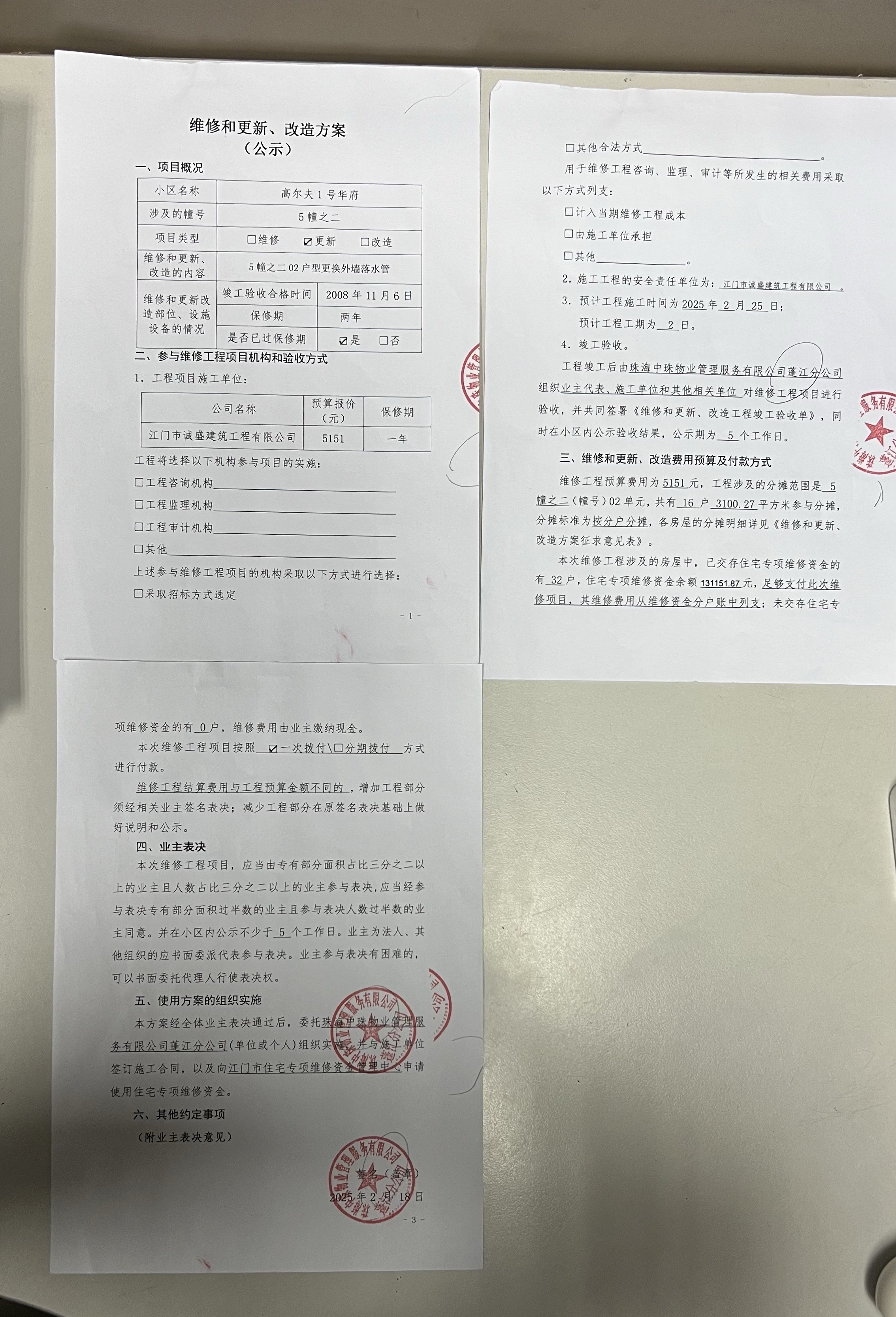 <td VALIGN="top" VALUES="" STYLE="border-width:0" BINDTYPE="0" ROWSPAN="17" COLSPAN="7" DATASOURCE="投票结果" ><font style=" font-family:方正小标宋简体;font-size:14pt;"><p style="line-height: 1.75em;"><span style="font-family: 宋体, SimSun;">各位尊敬的业主:</span><br/></p><p style="text-indent: 2em; line-height: 1.75em;"><span style="font-family: 宋体, SimSun;">根据法律法规的规定,本小区业主利用“江门市物业事项表决管理系统”已对本小区公共事务决策事项(<span style="font-family: 宋体; text-indent: 32px;">高尔夫1号华府5幢之二02户更换外墙落水管使用维修资金的投票</span>)进行了表决,在经过7日的询异公示期后,未收到业主有效的异议。现将投票结果公告,并就产生的法律效力说明如下:</span></p><p style="line-height: 1.75em; text-indent: 0em;"><strong style="text-indent: 2em;"><span style="font-family: 宋体, SimSun;">一、投票范围</span></strong></p><p style="text-indent: 2em; line-height: 1.75em;"><span style="font-family: 宋体, SimSun;">高尔夫1号华府蓬江区绿茵豪苑高尔夫1号华府5幢之二</span></p><p style="text-indent: 2em; line-height: 1.75em;"><span style="font-family: 宋体, SimSun;">总人数(专有部分人数之和):16</span></p><p style="text-indent: 2em; line-height: 1.75em;"><span style="font-family: 宋体, SimSun;"><span style="font-family: 宋体, SimSun; text-indent: 32px;"><span style="font-family: 宋体; text-indent: 32px;"><span style="font-family: 宋体; text-indent: 32px;">总户数:16</span></span></span></span></p><p style="text-indent: 2em; line-height: 1.75em;"><span style="font-family: 宋体, SimSun;">建筑物总面积(专有部分面积之和):3100.27㎡</span></p><p style="line-height: 1.75em;"><strong><span style="font-family: 宋体, SimSun;">二、投票结果公告时间</span></strong></p><p style="text-indent: 2em; line-height: 1.75em;"><span style="font-family: 宋体, SimSun;"><span style="font-family: 宋体, SimSun; text-indent: 32px;">从2025年05月13日开始</span></span></p><p style="line-height: 1.75em;"><strong><span style="font-family: 宋体, SimSun;">三、计票规则</span></strong></p><p style="text-indent: 2em; line-height: 1.75em;"><span style="font-family: 宋体, SimSun;">表决事项:使用建筑物及其附属设施的维修资金<br /><p style='font-family: 宋体, SimSun;line-height: 1.75em; text-indent: 2em;'>计票规则:弃权票不并入其它项&nbsp;&nbsp;&nbsp;&nbsp;未表决票不并入其它项</p></span></p><p style="line-height: 1.75em;"><strong><span style="font-family: 宋体, SimSun;">四、通过规则</span></strong></p><p style="line-height: 1.75em;"><strong><span style="font-family: 宋体, SimSun;">&nbsp; 根据《中华人民共和国民法典》第二百七十八条规定:业主共同决定事项,应当由专有部分面积占比三分之二以上的业主且人数占比三分之二以上的业主参与表决。</span></strong></p><p style="text-indent: 2em; line-height: 1.75em;"><span style="font-family: 宋体, SimSun;"><span style="font-family: 宋体, SimSun; text-indent: 32px;">表决事项:使用建筑物及其附属设施的维修资金<br /><p style='font-family: 宋体, SimSun;line-height: 1.75em; text-indent: 2em;'>通过规则:双2/3以上参与表决,参与表决双过半同意</p></span></span></p><p style="line-height: 1.75em;"><strong><span style="font-family: 宋体, SimSun;">五、投票结果</span></strong></p><p style="line-height: 1.75em; text-indent: 2em;"><span style="font-family: 宋体, SimSun; text-indent: 2em;"><div id='resultTable'><table style='table-layout: fixed; font-size:12px; margin-top:10px' width='100%' border='0' cellspacing='0' cellpadding='0'><tr><td height='28' colspan='10' align='center' style='border: 1px solid #666'><strong style='font-size: 14px;'> 使用建筑物及其附属设施的维修资金</strong></td> </tr><tr id='trfirst'><td height='28' colspan='4' style='border-left: 1px solid #666; border-bottom: 1px solid #666'><strong>&nbsp;申报单位:</strong> 珠海中珠物业管理服务有限公司蓬江分公司</td><td colspan='3' style='border-left: 1px solid #666; border-bottom: 1px solid #666'><strong>&nbsp;联系方式:</strong> </td><td colspan='3' style='border-left: 1px solid #666; border-bottom: 1px solid #666; border-right: 1px solid #666'><strong>&nbsp;申报日期:</strong> 2025年2月24日 </td></tr><tr> <td height='28' colspan='5' style='border-left: 1px solid #666; border-bottom: 1px solid #666'><strong>&nbsp;列支总人数(专有部分人数之和):</strong>16人 </td><td colspan='5' style='border-left: 1px solid #666; border-bottom: 1px solid #666; border-right: 1px solid #666'><strong>&nbsp;列支建筑物总面积(专有部分面积之和):</strong>3100.27㎡ </td> </tr><tr><td height='28' colspan='10' bgcolor='#F3F3F3' style='border-left: 1px solid #666;border-bottom: 1px solid #666;border-right: 1px solid #666'><strong>&nbsp;参与表决人数及面积统计</strong></td></tr><tr><td height='28' colspan='5' style='border-left: 1px solid #666; border-bottom: 1px solid #666'><strong>&nbsp;参与表决人数:</strong>11人</td><td colspan='5' style='border-left: 1px solid #666; border-bottom: 1px solid #666; border-right: 1px solid #666'><strong>&nbsp;参与表决人数占总人数比例:</strong>68.75%</td></tr><tr><td height='28' colspan='5' style='border-left: 1px solid #666; border-bottom: 1px solid #666'><strong>&nbsp;参与表决面积:</strong>2090.39㎡</td><td colspan='5' style='border-left: 1px solid #666; border-bottom: 1px solid #666; border-right: 1px solid #666'><strong>&nbsp;参与表决面积占总面积比例:</strong>67.43%</td></tr><tr><td height='28' colspan='10' bgcolor='#F3F3F3' style='border-left: 1px solid #666; border-bottom: 1px solid #666;border-right: 1px solid #666'> <strong>&nbsp;参与表决同意人数及面积统计</strong></td> </tr><tr><td height='28' colsp