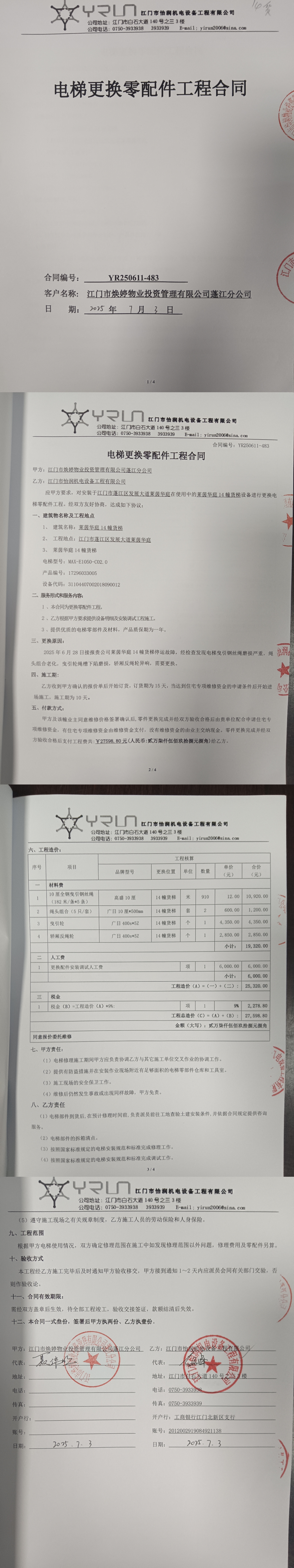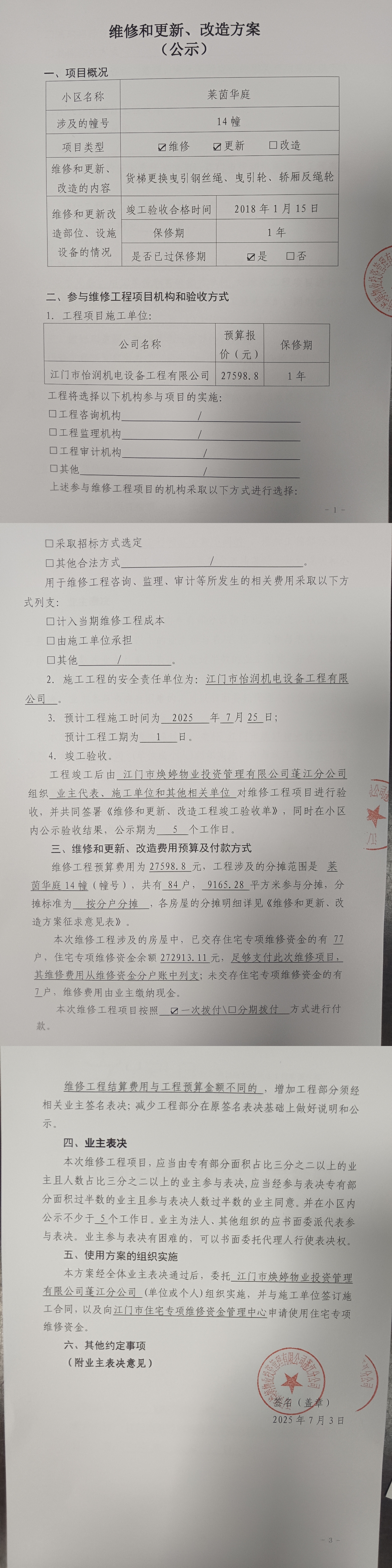 <td VALIGN="top" VALUES="" STYLE="border-width:0" BINDTYPE="0" ROWSPAN="19" COLSPAN="7" DATASOURCE="投票结果" ><font style="font-size:14pt;"><p style="white-space: normal; font-family: 宋体; line-height: 1.75em;">莱茵华庭蓬江区莱茵华庭14幢全体业主:</p><p style="white-space: normal; font-family: 宋体; line-height: 1.75em; text-indent: 2em;">本小区关于莱茵华庭小区14幢货梯更换曳引钢丝绳、曳引轮、轿厢反绳轮使用维修资金的投票的投票已表决结束,询异时间从2025年08月08日开始,投票询异公示期间,业主可通过微信查询自己的表决情况或可凭身份证件申请查询自己的表决情况;如公示的业主表决情况与查询的本人表决意见不一致的,可以以书面形式向投票组织机构申诉,投票组织机构予以纠正并重新公示表决结果。异议提出人对投票组织机构的处理仍有异议的,可以向街道办事处(镇人民政府)反映处理,涉及住宅专项维修资金的,可向属地住宅专项维修资金管理中心反映处理。</p><p style="white-space: normal;"><br/></p><p style="white-space: normal; font-family: 宋体; line-height: 1.75em;"><strong>附件:</strong></p><p style="white-space: normal; font-family: 宋体; line-height: 1.75em;"><strong>一、投票范围</strong></p><p style="white-space: normal; font-family: 宋体; line-height: 1.75em; text-indent: 2em;">莱茵华庭蓬江区莱茵华庭14幢</p><p style="white-space: normal; font-family: 宋体; line-height: 1.75em; text-indent: 2em;">总人数(专有部分人数之和):84</p><p style="white-space: normal; font-family: 宋体; line-height: 1.75em; text-indent: 2em;"><span style="font-family: 宋体, SimSun;"><span style="font-family: 宋体; text-indent: 32px;"><span style="font-family: 宋体; text-indent: 32px;">总户数:84</span></span></span></p><p style="white-space: normal; font-family: 宋体; line-height: 1.75em; text-indent: 2em;">建筑物总面积(专有部分面积之和):9165.28㎡</p><p style="white-space: normal; font-family: 宋体; line-height: 1.75em;"><strong>二、询异公示起止时间</strong></p><p dir="ltr" style="white-space: normal; font-family: 宋体; line-height: 1.75em; text-indent: 2em;"><span style="text-indent: 36px;">2025年08月08日至2025年08月18日</span></p><p style="white-space: normal; font-family: 宋体; line-height: 1.75em;"><strong>三、投票详细描述</strong></p><p style="white-space: normal; font-family: 宋体; line-height: 1.75em; text-indent: 2em;"><p>小区14幢货梯运行时有晃动,偶尔出现不平层情况,经电梯维保公司检查发现曳引轮绳槽磨损下陷,曳引钢丝绳磨损导致曳引力不均匀而产生电梯晃动并影响电梯不平层精度下降,需要更换电梯曳引钢丝绳、曳引轮和轿厢反绳轮才能消除电梯的故障。</p><p> 现对14幢货梯进行维修,工程维修预算金额为27598.8元,项目最终费用以施工合同签订金额为准。因已过保修期,维修费用由相关业主按分户分摊,每户约328.56元,详见公示附件。如业主手机不能正常通过微信投票,请联系物业公司进行线下纸质投票,物业电话:0750-3212633。</p><p><br style="font-family: "Helvetica Neue", Helvetica, Arial, sans-serif; font-size: 14px; white-space: normal; background-color: rgb(255, 255, 255);"/></p><p><br/></p></p><p style="white-space: normal; font-family: 宋体; line-height: 1.75em;"><strong>四、计票规则</strong></p><p style="white-space: normal; font-family: 宋体; line-height: 1.75em; text-indent: 2em;">表决事项:使用建筑物及其附属设施的维修资金<br /><p style='text-align: left; font-family: 宋体; font-size: 16px; line-height: 1.75em; text-indent: 2em;'>计票规则:弃权票不并入其它项 未表决票不并入其它项</p></p><p style="white-space: normal; font-family: 宋体; line-height: 1.75em;"><strong>五、通过规则</strong></p><p style="white-space: normal; font-family: 宋体; line-height: 1.75em;"><strong><strong style="white-space: normal;"><span style="font-family: 宋体, SimSun;"> 根据《中华人民共和国民法典》第二百七十八条规定:业主共同决定事项,应当由专有部分面积占比三分之二以上的业主且人数占比三分之二以上的业主参与表决。</span></strong></strong></p><p style="white-space: normal; font-family: 宋体; line-height: 1.75em; text-indent: 2em;">表决事项:使用建筑物及其附属设施的维修资金<br /><p style='text-align: left; font-family: 宋体; font-size: 16px; line-height: 1.75em; text-indent: 2em;'>通过规则:双2/3以上参与表决,参与表决双过半同意</p></p><p style="white-space: normal; font-family: 宋体; line-height: 1.75em;"><strong>六、投票结果</strong></p><p style="white-space: normal; font-family: 宋体; line-height: 1.75em; text-indent: 2em;"><div id='resultTable'><table style='table-layout: fixed; font-size:12px; margin-top:10px' width='100%' border='0' cellspacing='0' cellpadding='0'><tr><td height='28' colspan='10' align='center' style='border: 1px solid #666'><strong style='font-size: 14px;'> 使用建筑物及其附属设施的维修资金</strong></td> </tr><tr id='trfirst'><td height='28' colspan='4' style='border-left: 1px solid #666; border-bottom: 1px solid #666'><strong> 申报单位:</strong> 江门市焕婷物业投资管理有限公司蓬江分公司</td><td colspan='3' style='border-left: 1px solid #666; border-bottom: 1px solid #666'><strong> 联系方式:</strong> 3211392 </td><td colspan='3' style='border-left: 1px solid #666; border-bottom: 1px solid #666; border-right: 1px solid #666'><strong> 申报日期:</strong> 2025年7月4日 </td></tr><tr> <td height='28' colspan='5' style='border-left: 1px solid #666; border-bottom: 1px solid #666'><strong> 总人数(专有部分人数之和):</strong>84人 </td><td colspan='5' style='border-left: 1px solid #666; border-bottom: 1px solid #