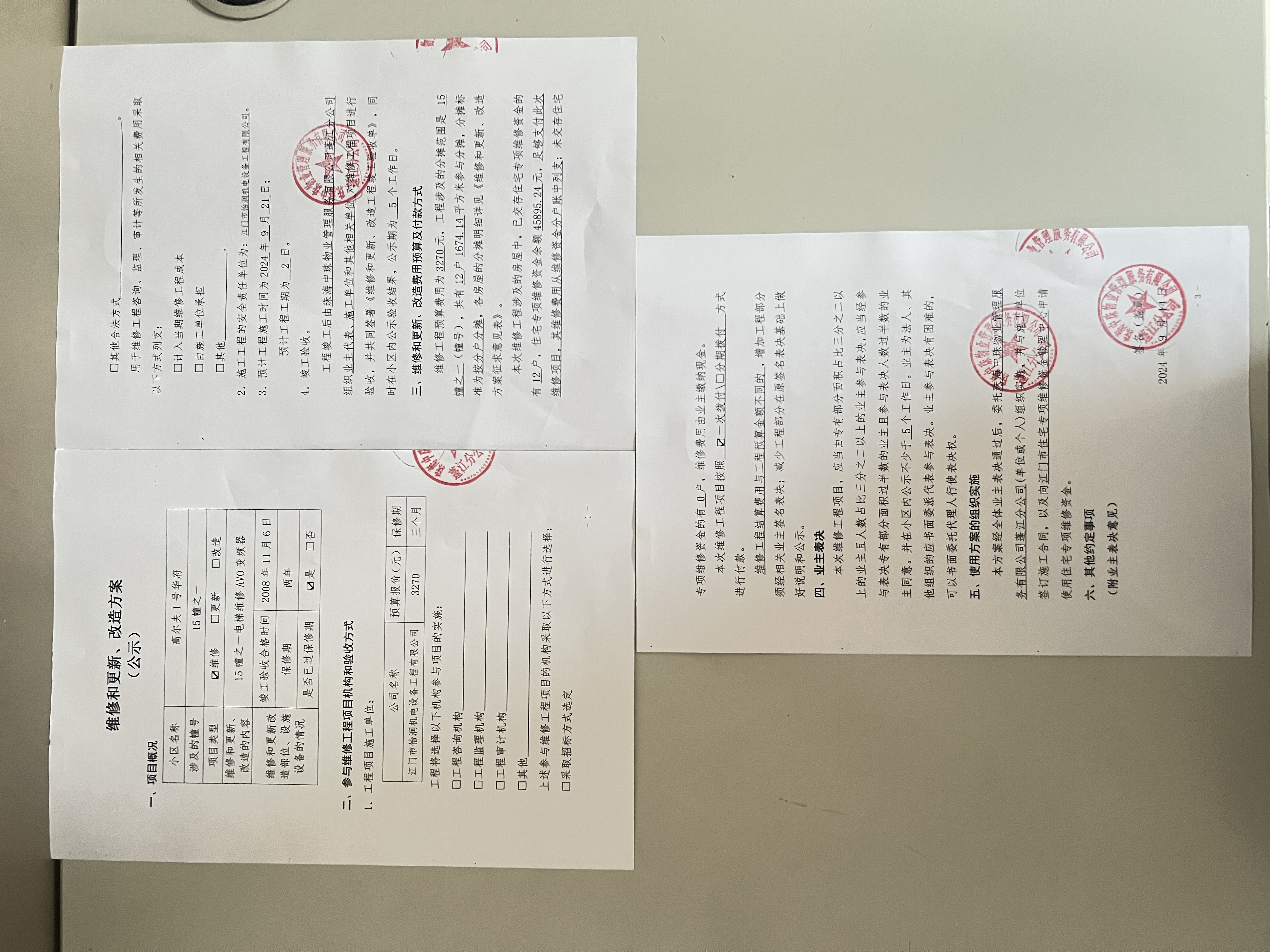 <td VALIGN="top" VALUES="" STYLE="border-width:0" BINDTYPE="0" ROWSPAN="19" COLSPAN="7" DATASOURCE="投票结果" ><font style="font-size:14pt;"><p style="white-space: normal; font-family: 宋体; line-height: 1.75em;">高尔夫1号华府蓬江区绿茵豪苑高尔夫1号华府15幢之一全体业主:</p><p style="white-space: normal; font-family: 宋体; line-height: 1.75em; text-indent: 2em;">本小区关于高尔夫1号华府15幢之一电梯维修AVO变频器的投票的投票已表决结束,询异时间从2025年01月10日开始,投票询异公示期间,业主可通过微信查询自己的表决情况或可凭身份证件申请查询自己的表决情况;如公示的业主表决情况与查询的本人表决意见不一致的,可以以书面形式向投票组织机构申诉,投票组织机构予以纠正并重新公示表决结果。异议提出人对投票组织机构的处理仍有异议的,可以向街道办事处(镇人民政府)反映处理,涉及住宅专项维修资金的,可向属地住宅专项维修资金管理中心反映处理。</p><p style="white-space: normal;"><br/></p><p style="white-space: normal; font-family: 宋体; line-height: 1.75em;"><strong>附件:</strong></p><p style="white-space: normal; font-family: 宋体; line-height: 1.75em;"><strong>一、投票范围</strong></p><p style="white-space: normal; font-family: 宋体; line-height: 1.75em; text-indent: 2em;">高尔夫1号华府蓬江区绿茵豪苑高尔夫1号华府15幢之一</p><p style="white-space: normal; font-family: 宋体; line-height: 1.75em; text-indent: 2em;">总人数(专有部分人数之和):12</p><p style="white-space: normal; font-family: 宋体; line-height: 1.75em; text-indent: 2em;"><span style="font-family: 宋体, SimSun;"><span style="font-family: 宋体; text-indent: 32px;"><span style="font-family: 宋体; text-indent: 32px;">总户数:12</span></span></span></p><p style="white-space: normal; font-family: 宋体; line-height: 1.75em; text-indent: 2em;">建筑物总面积(专有部分面积之和):1674.14㎡</p><p style="white-space: normal; font-family: 宋体; line-height: 1.75em;"><strong>二、询异公示起止时间</strong></p><p dir="ltr" style="white-space: normal; font-family: 宋体; line-height: 1.75em; text-indent: 2em;"><span style="text-indent: 36px;">2025年01月10日至2025年01月20日</span></p><p style="white-space: normal; font-family: 宋体; line-height: 1.75em;"><strong>三、投票详细描述</strong></p><p style="white-space: normal; font-family: 宋体; line-height: 1.75em; text-indent: 2em;"><p><span style="font-family: "Helvetica Neue", Helvetica, Arial, sans-serif; font-size: 14px; text-wrap: wrap; background-color: rgb(255, 255, 255);">高尔夫1号华府小区15幢之一的电梯日常运行时出现异常,导致停止运行,经检查,是由于电梯AVO变频器故障不能运行,因使用时间较长,电路板电子原件出现老化而不能正常运行。</span><br style="font-family: "Helvetica Neue", Helvetica, Arial, sans-serif; font-size: 14px; text-wrap: wrap; background-color: rgb(255, 255, 255);"/><span style="font-family: "Helvetica Neue", Helvetica, Arial, sans-serif; font-size: 14px; text-wrap: wrap; background-color: rgb(255, 255, 255);"> 现对15幢之一的电梯进行维修,工程维修预算金额为3270元,项目最终费用以施工合同签订金额为准。因已过保修期,维修费用由相关业主按分户分摊,每户为272.5元,详见公示附件。如业主手机不能正常通过微信投票,请联系物业公司进行线下纸质投票,物业电话:0750-3068388。</span></p></p><p style="white-space: normal; font-family: 宋体; line-height: 1.75em;"><strong>四、计票规则</strong></p><p style="white-space: normal; font-family: 宋体; line-height: 1.75em; text-indent: 2em;">表决事项:使用建筑物及其附属设施的维修资金<br /><p style='text-align: left; font-family: 宋体; font-size: 16px; line-height: 1.75em; text-indent: 2em;'>计票规则:弃权票不并入其它项 未表决票不并入其它项</p></p><p style="white-space: normal; font-family: 宋体; line-height: 1.75em;"><strong>五、通过规则</strong></p><p style="white-space: normal; font-family: 宋体; line-height: 1.75em;"><strong><strong style="white-space: normal;"><span style="font-family: 宋体, SimSun;"> 根据《中华人民共和国民法典》第二百七十八条规定:业主共同决定事项,应当由专有部分面积占比三分之二以上的业主且人数占比三分之二以上的业主参与表决。</span></strong></strong></p><p style="white-space: normal; font-family: 宋体; line-height: 1.75em; text-indent: 2em;">表决事项:使用建筑物及其附属设施的维修资金<br /><p style='text-align: left; font-family: 宋体; font-size: 16px; line-height: 1.75em; text-indent: 2em;'>通过规则:双2/3以上参与表决,参与表决双过半同意</p></p><p style="white-space: normal; font-family: 宋体; line-height: 1.75em;"><strong>六、投票结果</strong></p><p style="white-space: normal; font-family: 宋体; line-height: 1.75em; text-indent: 2em;"><div id='resultTable'><table style='table-layout: fixed; font-size:12px; margin-top:10px' width='100%' border='0' cellspacing='0' cellpadding='0'><tr><td height='28' colspan='10' align='center' style='border: 1px solid #666'><strong style='font-size: 14px;'> 使用建筑物及其附属设施的维修资金</strong></td> </tr><tr id='trfirst'><td height='28' colspan='4' style='border-left: 1px solid #666; border-bottom: 1px solid #666'><strong> 申报单位:</strong> 珠海中珠物业管理服务有限公司蓬江分公司</td><td colspan='3' style='border-left: 1px solid #666; border-bottom: 1px solid #666'><strong> 联系方式:</strong> </td><td colspan='3' style='border-left: 1px solid #666; border-bottom: 1px solid #666; border-right: 1px solid #666'><strong> 申报日期:</strong> 2024年10月11日 </td></tr><tr> <td height='28' colspan='5' style='bor