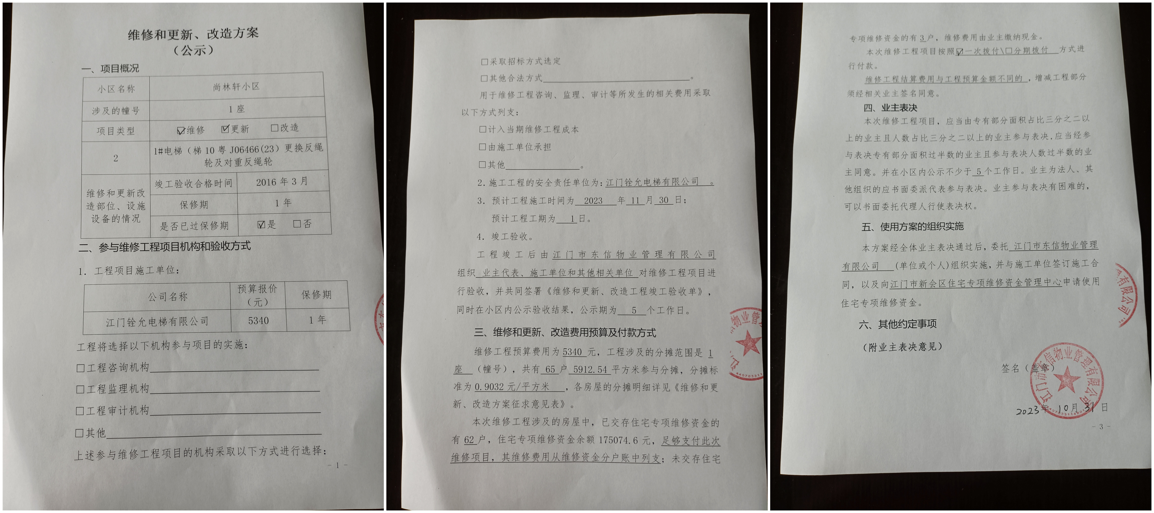 <td VALIGN="top" VALUES="" STYLE="border-width:0" BINDTYPE="0" ROWSPAN="19" COLSPAN="7" DATASOURCE="投票结果" ><font style="font-size:14pt;"><p style="white-space: normal; font-family: 宋体; line-height: 1.75em;">尚林轩小区尚林轩1座全体业主:</p><p style="white-space: normal; font-family: 宋体; line-height: 1.75em; text-indent: 2em;">本小区关于尚林轩小区1座1#电梯(梯10粤J06466(23)更换反绳轮使用维修资金的投票的投票已表决结束,询异时间从2023年11月18日开始,投票询异公示期间,业主可通过微信查询自己的表决情况或可凭身份证件申请查询自己的表决情况;如公示的业主表决情况与查询的本人表决意见不一致的,可以以书面形式向投票组织机构申诉,投票组织机构予以纠正并重新公示表决结果。异议提出人对投票组织机构的处理仍有异议的,可以向街道办事处(镇人民政府)反映处理,涉及住宅专项维修资金的,可向属地住宅专项维修资金管理中心反映处理。</p><p style="white-space: normal;"><br/></p><p style="white-space: normal; font-family: 宋体; line-height: 1.75em;"><strong>附件:</strong></p><p style="white-space: normal; font-family: 宋体; line-height: 1.75em;"><strong>一、投票范围</strong></p><p style="white-space: normal; font-family: 宋体; line-height: 1.75em; text-indent: 2em;">尚林轩小区尚林轩1座</p><p style="white-space: normal; font-family: 宋体; line-height: 1.75em; text-indent: 2em;">总人数(专有部分人数之和):65</p><p style="white-space: normal; font-family: 宋体; line-height: 1.75em; text-indent: 2em;"><span style="font-family: 宋体, SimSun;">总户数:65</span></p><p style="white-space: normal; font-family: 宋体; line-height: 1.75em; text-indent: 2em;">建筑物总面积(专有部分面积之和):5912.54㎡</p><p style="white-space: normal; font-family: 宋体; line-height: 1.75em;"><strong>二、询异公示起止时间</strong></p><p dir="ltr" style="white-space: normal; font-family: 宋体; line-height: 1.75em; text-indent: 2em;"><span style="text-indent: 36px;">2023年11月18日至2023年11月24日</span></p><p style="white-space: normal; font-family: 宋体; line-height: 1.75em;"><strong>三、投票详细描述</strong></p><p style="white-space: normal; font-family: 宋体; line-height: 1.75em; text-indent: 2em;"><p>尚林轩小区1座1#电梯(梯10粤J06466(23) 轿厢顶部反绳轮以及对重反绳轮运行中异响,经检查确认,存在安全隐患,为确保电梯安全运行,需更换轿厢顶部反绳轮以及对重反绳轮。已过保修期,现需申请使用维修资金对1座1#电梯维修,工程维修预算金额为 5340 元 , 项目最终费用以施工合同签订金额为准。维修费用的分摊标准为 0.9032平方米 , 详见公示附件。物业公司联系电话:6683199<br/></p></p><p style="white-space: normal; font-family: 宋体; line-height: 1.75em;"><strong>四、计票规则</strong></p><p style="white-space: normal; font-family: 宋体; line-height: 1.75em; text-indent: 2em;">表决事项:使用建筑物及其附属设施的维修资金<br /><p style='text-align: left; font-family: 宋体; font-size: 16px; line-height: 1.75em; text-indent: 2em;'>计票规则:弃权票不并入其它项 未表决票不并入其它项</p></p><p style="white-space: normal; font-family: 宋体; line-height: 1.75em;"><strong>五、通过规则</strong></p><p style="white-space: normal; font-family: 宋体; line-height: 1.75em;"><strong><strong style="white-space: normal;"><span style="font-family: 宋体, SimSun;">&nbsp; 根据《中华人民共和国民法典》第二百七十八条规定:业主共同决定事项,应当由专有部分面积占比三分之二以上的业主且人数占比三分之二以上的业主参与表决。</span></strong></strong></p><p style="white-space: normal; font-family: 宋体; line-height: 1.75em; text-indent: 2em;">表决事项:使用建筑物及其附属设施的维修资金<br /><p style='text-align: left; font-family: 宋体; font-size: 16px; line-height: 1.75em; text-indent: 2em;'>通过规则:参与表决专有部分面积过半数的业主且参与表决人数过半数的业主同意</p></p><p style="white-space: normal; font-family: 宋体; line-height: 1.75em;"><strong>六、投票结果</strong></p><p style="white-space: normal; font-family: 宋体; line-height: 1.75em; text-indent: 2em;"><div id='resultTable'><table style='table-layout: fixed; font-size:12px; margin-top:10px' width='100%' border='0' cellspacing='0' cellpadding='0'><tr><td height='28' colspan='10' align='center' style='border: 1px solid #666'><strong style='font-size: 14px;'> 使用建筑物及其附属设施的维修资金</strong></td> </tr><tr id='trfirst'><td height='28' colspan='4' style='border-left: 1px solid #666; border-bottom: 1px solid #666'><strong> 申报单位:</strong> 江门市东信物业管理有限公司</td><td colspan='3' style='border-left: 1px solid #666; border-bottom: 1px solid #666'><strong> 联系方式:</strong> 0750-6683199 </td><td colspan='3' style='border-left: 1px solid #666; border-bottom: 1px solid #666; border-right: 1px solid #666'><strong> 申报日期:</strong> 2023年11月1日 </td></tr><tr> <td height='28' colspan='5' style='border-left: 1px solid #666; border-bottom: 1px solid #666'><strong> 总人数(专有部分人数之和):</strong>65人 </td><td colspan='5' style='border-left: 1px solid #666; border-bottom: 1px solid #666; border-right: 1px solid #666'><strong> 建筑物总面积(专有部分面积之和):</strong>5912.54㎡ </td> </tr><tr><td height='28' colspan='10' bgcolor='#F3F3F3' style='border-left: 1px solid #666;border-bottom: 1px solid #666;border-right: 1px solid #666'><strong> 参与人数及面积统计</strong></td></tr><tr><td height='28' colspan='5' style='border-left: 1px solid #666; border-bottom: 1px solid #666'><strong> 参与表决专有部分人数之和:</strong>46人<