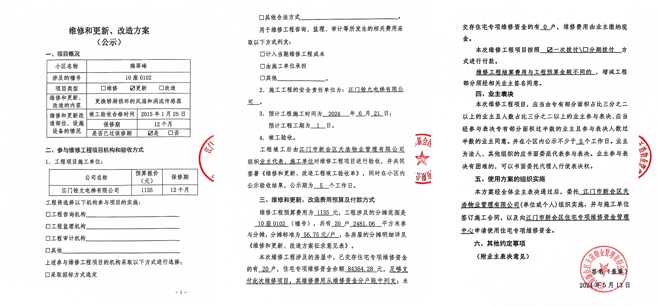 <td VALIGN="top" VALUES="" STYLE="border-width:0" BINDTYPE="0" ROWSPAN="19" COLSPAN="7" DATASOURCE="投票结果" ><font style="font-size:14pt;"><p style="white-space: normal; font-family: 宋体; line-height: 1.75em;">雍翠峰雍翠峰10座全体业主:</p><p style="white-space: normal; font-family: 宋体; line-height: 1.75em; text-indent: 2em;">本小区关于雍翠峰10座0102单元电梯【梯粤JX4426】更换轿厢损坏的风扇和故障的涡流传感器使用维修资金的投票的投票已表决结束,询异时间从2024年05月15日开始,投票询异公示期间,业主可通过微信查询自己的表决情况或可凭身份证件申请查询自己的表决情况;如公示的业主表决情况与查询的本人表决意见不一致的,可以以书面形式向投票组织机构申诉,投票组织机构予以纠正并重新公示表决结果。异议提出人对投票组织机构的处理仍有异议的,可以向街道办事处(镇人民政府)反映处理,涉及住宅专项维修资金的,可向属地住宅专项维修资金管理中心反映处理。</p><p style="white-space: normal;"><br/></p><p style="white-space: normal; font-family: 宋体; line-height: 1.75em;"><strong>附件:</strong></p><p style="white-space: normal; font-family: 宋体; line-height: 1.75em;"><strong>一、投票范围</strong></p><p style="white-space: normal; font-family: 宋体; line-height: 1.75em; text-indent: 2em;">雍翠峰雍翠峰10座</p><p style="white-space: normal; font-family: 宋体; line-height: 1.75em; text-indent: 2em;">总人数(专有部分人数之和):20</p><p style="white-space: normal; font-family: 宋体; line-height: 1.75em; text-indent: 2em;"><span style="font-family: 宋体, SimSun;"><span style="font-family: 宋体; text-indent: 32px;"><span style="font-family: 宋体; text-indent: 32px;">总户数:20</span></span></span></p><p style="white-space: normal; font-family: 宋体; line-height: 1.75em; text-indent: 2em;">建筑物总面积(专有部分面积之和):2481.06㎡</p><p style="white-space: normal; font-family: 宋体; line-height: 1.75em;"><strong>二、询异公示起止时间</strong></p><p dir="ltr" style="white-space: normal; font-family: 宋体; line-height: 1.75em; text-indent: 2em;"><span style="text-indent: 36px;">2024年05月15日至2024年05月21日</span></p><p style="white-space: normal; font-family: 宋体; line-height: 1.75em;"><strong>三、投票详细描述</strong></p><p style="white-space: normal; font-family: 宋体; line-height: 1.75em; text-indent: 2em;"><p> 小区10座0102电梯【梯粤JX4426】日常运行时出现异响,经检查,是由于电梯的轿内风扇日常使用时间较长,异响为自然磨损损坏导致;轿底称重涡流传感器故障(日常使用,自然损坏)。 现对10座0102电梯【梯粤JX4426】进行维修,工程维修预算金额为1135元,项目最终费用以施工合同签订金额为准。因已过保修期,维修费用由相关业主按分户分摊,每户56.75元,详见公示附件。如业主手机不能正常通过微信投票,请联系物业公司进行线下纸质投票,物业电话:0750-6125500。</p></p><p style="white-space: normal; font-family: 宋体; line-height: 1.75em;"><strong>四、计票规则</strong></p><p style="white-space: normal; font-family: 宋体; line-height: 1.75em; text-indent: 2em;">表决事项:使用建筑物及其附属设施的维修资金<br /><p style='text-align: left; font-family: 宋体; font-size: 16px; line-height: 1.75em; text-indent: 2em;'>计票规则:弃权票不并入其它项 未表决票不并入其它项</p></p><p style="white-space: normal; font-family: 宋体; line-height: 1.75em;"><strong>五、通过规则</strong></p><p style="white-space: normal; font-family: 宋体; line-height: 1.75em;"><strong><strong style="white-space: normal;"><span style="font-family: 宋体, SimSun;"> 根据《中华人民共和国民法典》第二百七十八条规定:业主共同决定事项,应当由专有部分面积占比三分之二以上的业主且人数占比三分之二以上的业主参与表决。</span></strong></strong></p><p style="white-space: normal; font-family: 宋体; line-height: 1.75em; text-indent: 2em;">表决事项:使用建筑物及其附属设施的维修资金<br /><p style='text-align: left; font-family: 宋体; font-size: 16px; line-height: 1.75em; text-indent: 2em;'>通过规则:双2/3以上参与表决,参与表决双过半同意</p></p><p style="white-space: normal; font-family: 宋体; line-height: 1.75em;"><strong>六、投票结果</strong></p><p style="white-space: normal; font-family: 宋体; line-height: 1.75em; text-indent: 2em;"><div id='resultTable'><table style='table-layout: fixed; font-size:12px; margin-top:10px' width='100%' border='0' cellspacing='0' cellpadding='0'><tr><td height='28' colspan='10' align='center' style='border: 1px solid #666'><strong style='font-size: 14px;'> 使用建筑物及其附属设施的维修资金</strong></td> </tr><tr id='trfirst'><td height='28' colspan='4' style='border-left: 1px solid #666; border-bottom: 1px solid #666'><strong> 申报单位:</strong> 江门市新会区天浩物业管理有限公司</td><td colspan='3' style='border-left: 1px solid #666; border-bottom: 1px solid #666'><strong> 联系方式:</strong> </td><td colspan='3' style='border-left: 1px solid #666; border-bottom: 1px solid #666; border-right: 1px solid #666'><strong> 申报日期:</strong> 2024年5月13日 </td></tr><tr> <td height='28' colspan='5' style='border-left: 1px solid #666; border-bottom: 1px solid #666'><strong> 总人数(专有部分人数之和):</strong>20人 </td><td colspan='5' style='border-left: 1px solid #666; border-bottom: 1px solid #666; border-right: 1px solid #666'><strong> 建筑物总面积(专有部分面积之和):</strong>2481.06㎡ </td> </tr><tr><td height='28' colspan='10' bgcolor='#F3F3F3' style='border-left: 1px solid #666;border-bottom: 1px solid #666;border-right: 1px solid #666'><strong> 参
