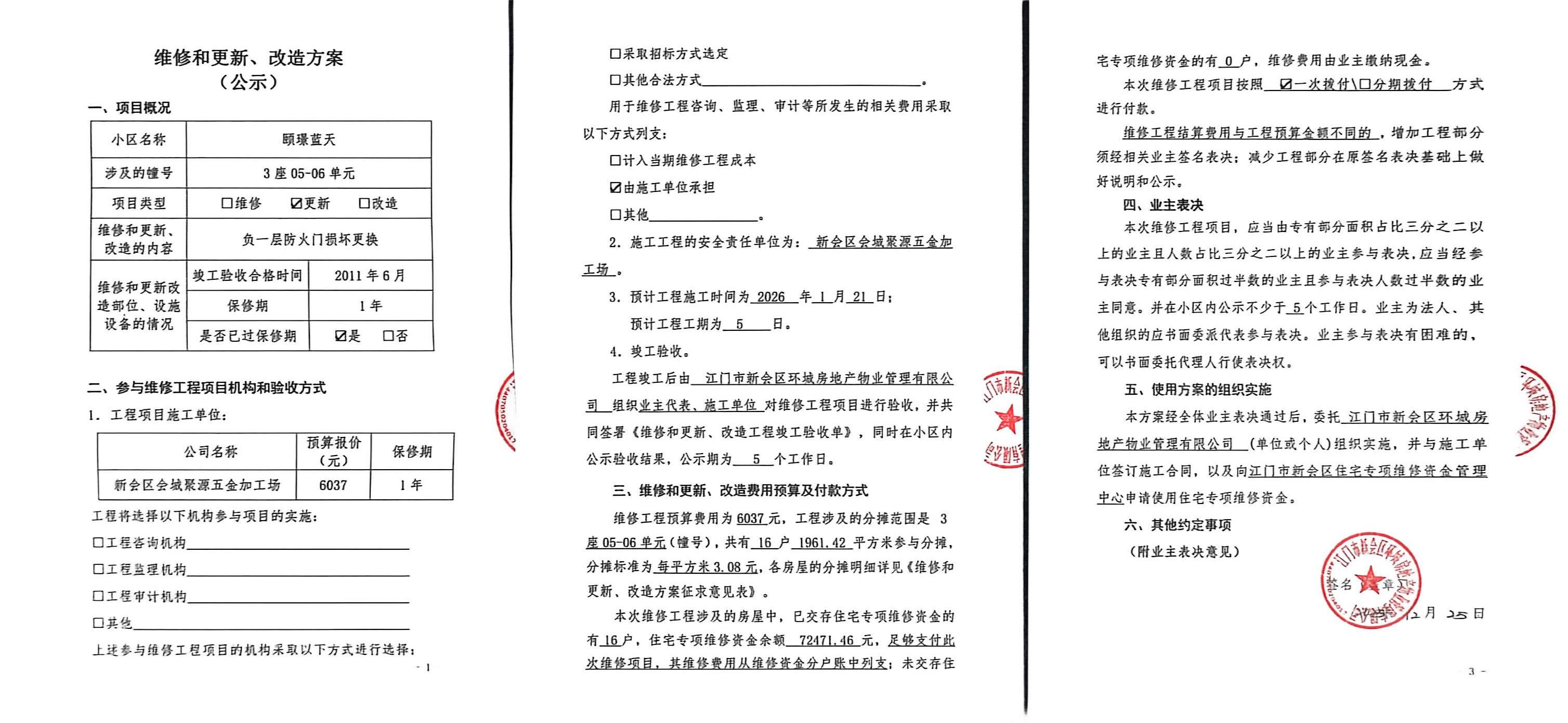 <td VALIGN="top" VALUES="" STYLE="border-width:0" BINDTYPE="0" ROWSPAN="19" COLSPAN="7" DATASOURCE="投票结果" ><font style="font-size:14pt;"><p style="white-space: normal; font-family: 宋体; line-height: 1.75em;">颐璟蓝天颐璟蓝天二期3座全体业主:</p><p style="white-space: normal; font-family: 宋体; line-height: 1.75em; text-indent: 2em;">本小区关于会城侨光北路11号颐璟蓝天3座05-06单元负一层防火门更换使用维修资金的投票的投票已表决结束,询异时间从2026年03月13日开始,投票询异公示期间,业主可通过微信查询自己的表决情况或可凭身份证件申请查询自己的表决情况;如公示的业主表决情况与查询的本人表决意见不一致的,可以以书面形式向投票组织机构申诉,投票组织机构予以纠正并重新公示表决结果。异议提出人对投票组织机构的处理仍有异议的,可以向街道办事处(镇人民政府)反映处理,涉及住宅专项维修资金的,可向属地住宅专项维修资金管理中心反映处理。</p><p style="white-space: normal;"><br/></p><p style="white-space: normal; font-family: 宋体; line-height: 1.75em;"><strong>附件:</strong></p><p style="white-space: normal; font-family: 宋体; line-height: 1.75em;"><strong>一、投票范围</strong></p><p style="white-space: normal; font-family: 宋体; line-height: 1.75em; text-indent: 2em;">颐璟蓝天颐璟蓝天二期3座</p><p style="white-space: normal; font-family: 宋体; line-height: 1.75em; text-indent: 2em;">总人数(专有部分人数之和):15</p><p style="white-space: normal; font-family: 宋体; line-height: 1.75em; text-indent: 2em;"><span style="font-family: 宋体, SimSun;"><span style="font-family: 宋体; text-indent: 32px;"><span style="font-family: 宋体; text-indent: 32px;">总户数:16</span></span></span></p><p style="white-space: normal; font-family: 宋体; line-height: 1.75em; text-indent: 2em;">建筑物总面积(专有部分面积之和):1961.42㎡</p><p style="white-space: normal; font-family: 宋体; line-height: 1.75em;"><strong>二、询异公示起止时间</strong></p><p dir="ltr" style="white-space: normal; font-family: 宋体; line-height: 1.75em; text-indent: 2em;"><span style="text-indent: 36px;">2026年03月13日至2026年03月23日</span></p><p style="white-space: normal; font-family: 宋体; line-height: 1.75em;"><strong>三、投票详细描述</strong></p><p style="white-space: normal; font-family: 宋体; line-height: 1.75em; text-indent: 2em;"><p><span style="font-size: 14px;"><span style="font-family: 宋体;">会城侨光北路</span><span style="font-family: Calibri;">11</span><span style="font-family: 宋体;">号颐璟蓝天</span><font face="Calibri">3</font><span style="font-family: 宋体;">座</span><span style="font-family: Calibri;">05-06</span><span style="font-family: 宋体;">单元负一层防火门损坏严重。现需申请使用维修资金对</span><font face="Calibri">3</font><span style="font-family: 宋体;">座</span><span style="font-family: Calibri;">05-06</span><span style="font-family: 宋体;">单元负一层防火门进行更换,工程维修预算金额为</span><span style="font-family: Calibri;">6037.00</span><span style="font-family: 宋体;">元,项目最终费用以施工合同签订金额为准。因已过保修期,维修费用由相关业主按建筑面积分摊,约</span><font face="Calibri">3.08</font><span style="font-family: 宋体;">元每平方,详见公示附件。如业主手机不能正常通过微信投票,请联系物业公司进行线下纸质投票,物业公司联系电话:</span><span style="font-family: Calibri;">0750-6780780</span><span style="font-family: 宋体;">。</span></span></p><p><br/></p></p><p style="white-space: normal; font-family: 宋体; line-height: 1.75em;"><strong>四、计票规则</strong></p><p style="white-space: normal; font-family: 宋体; line-height: 1.75em; text-indent: 2em;">表决事项:使用建筑物及其附属设施的维修资金<br /><p style='text-align: left; font-family: 宋体; font-size: 16px; line-height: 1.75em; text-indent: 2em;'>计票规则:弃权票不并入其它项 未表决票不并入其它项</p></p><p style="white-space: normal; font-family: 宋体; line-height: 1.75em;"><strong>五、通过规则</strong></p><p style="white-space: normal; font-family: 宋体; line-height: 1.75em;"><strong><strong style="white-space: normal;"><span style="font-family: 宋体, SimSun;"> 根据《中华人民共和国民法典》第二百七十八条规定:业主共同决定事项,应当由专有部分面积占比三分之二以上的业主且人数占比三分之二以上的业主参与表决。</span></strong></strong></p><p style="white-space: normal; font-family: 宋体; line-height: 1.75em; text-indent: 2em;">表决事项:使用建筑物及其附属设施的维修资金<br /><p style='text-align: left; font-family: 宋体; font-size: 16px; line-height: 1.75em; text-indent: 2em;'>通过规则:双2/3以上参与表决,参与表决双过半同意</p></p><p style="white-space: normal; font-family: 宋体; line-height: 1.75em;"><strong>六、投票结果</strong></p><p style="white-space: normal; font-family: 宋体; line-height: 1.75em; text-indent: 2em;"><div id='resultTable'><table style='table-layout: fixed; font-size:12px; margin-top:10px' width='100%' border='0' cellspacing='0' cellpadding='0'><tr><td height='28' colspan='10' align='center' style='border: 1px solid #666'><strong style='font-size: 14px;'> 使用建筑物及其附属设施的维修资金</strong></td> </tr><tr id='trfirst'><td height='28' colspan='4' style='border-left: 1px solid #666; border-bottom: 1px solid #666'><strong> 申报单位:</strong> 新会区环城房地产物业管理有限公司</td><td colspan='3' style='border-left: 1px solid #666; border-bottom: 1px solid #666'><strong> 联系方式:</strong> </td><td colspan='3' style='border-left: 1px solid #666; border-bottom: 1