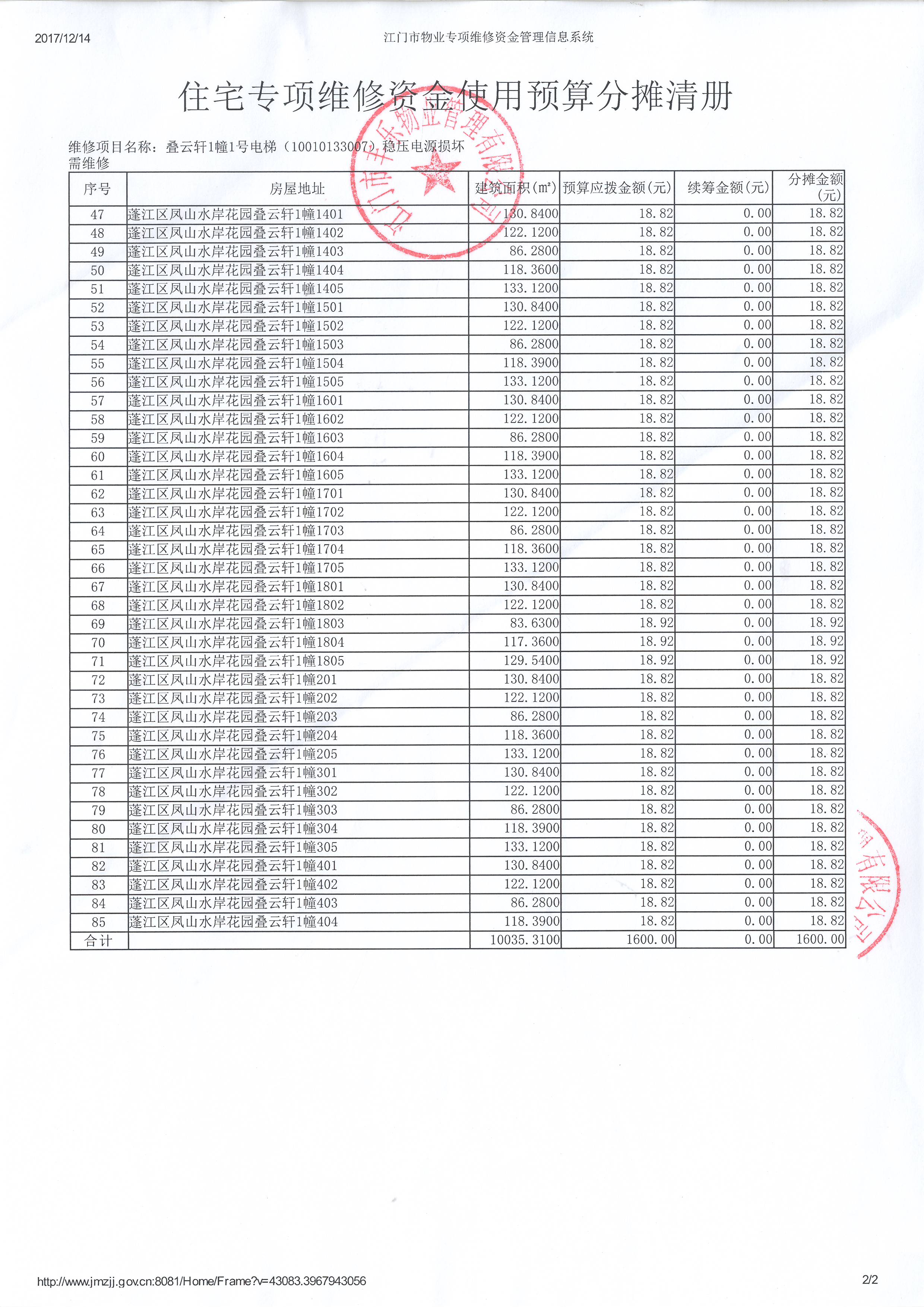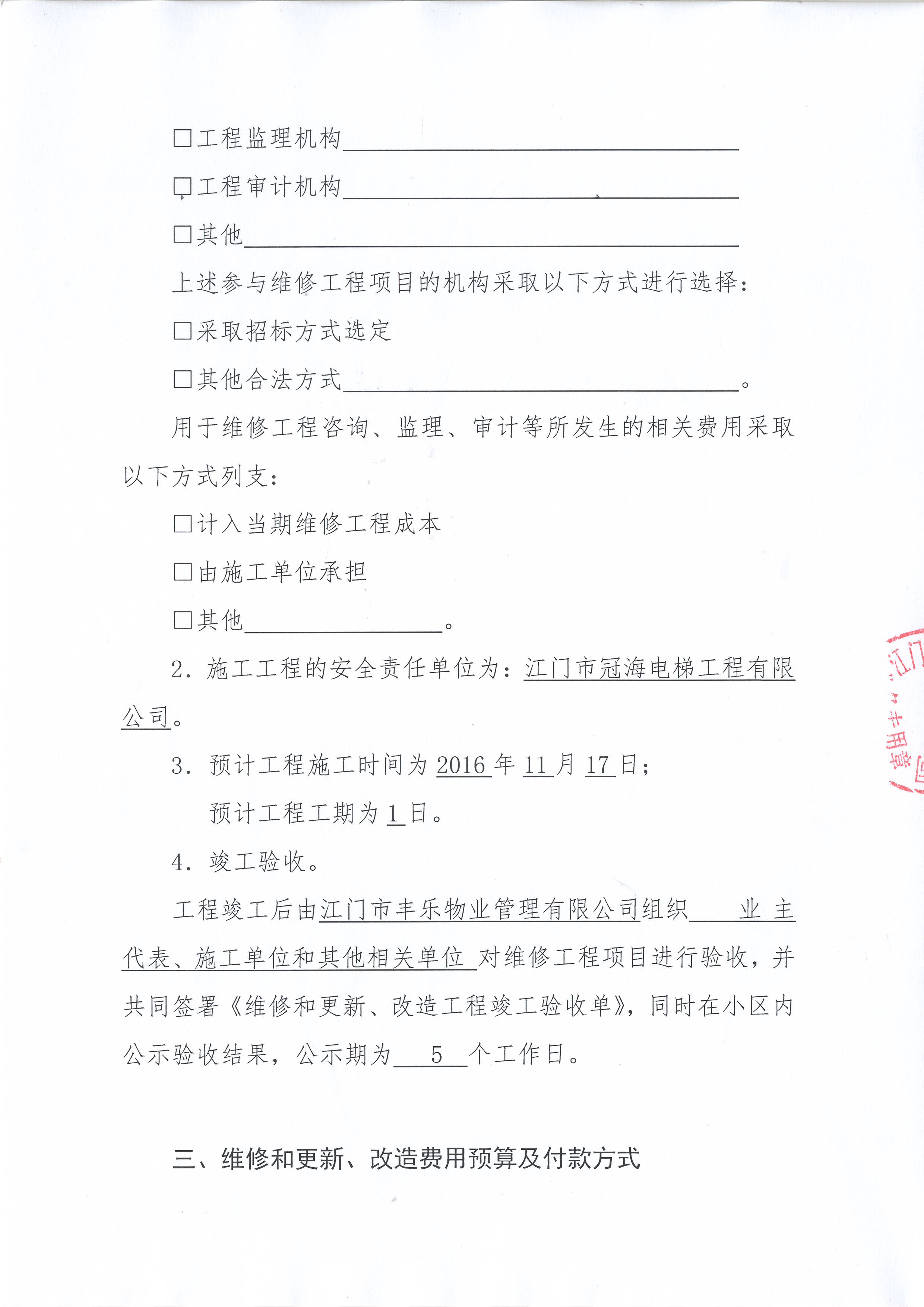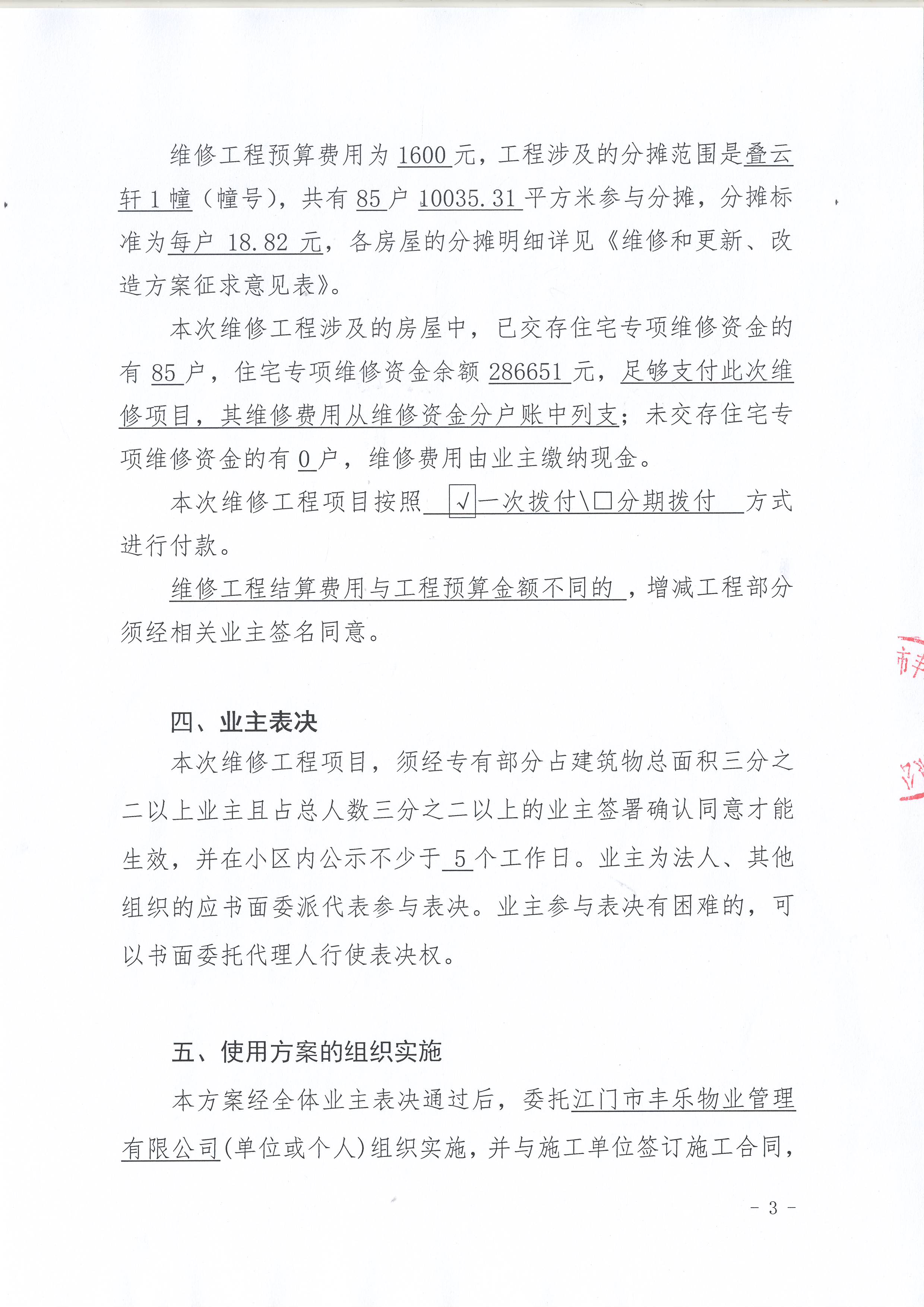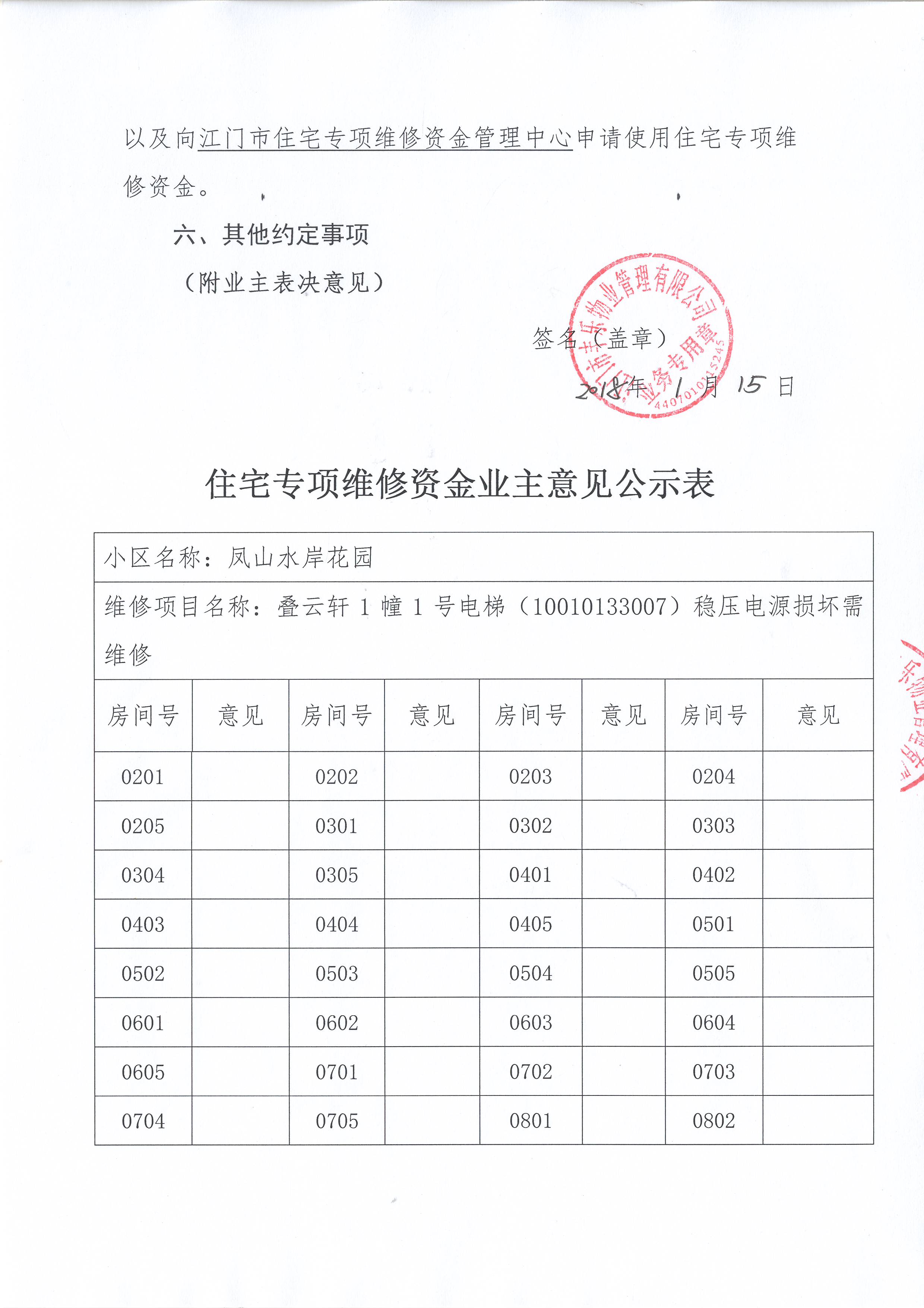 <div style="font-family: 宋体; font-size: 16px;"><p style="text-align: left;">各位尊敬的业主:</p><p style="text-align: left;"> 根据法律法规的规定,本小区业主利用“江门市物业管理公众服务平台”已对本小区公共事务决策事项进行了表决,在经过7日的询异公示期后,未收到业主有效的异议。现将投票结果公告,并就产生的法律效力说明如下:</p><p style="text-align: left;">一、投票范围</p><p style="text-align: left;"> 凤山水岸花园叠云轩1幢</p><p style="text-align: left;"> 总人数(专有部分人数之和):85</p><p style="text-align: left;"> 建筑物总面积(专有部分面积之和):10035.31㎡</p><p style="text-align: left;">二、投票起止时间</p><p style="text-align: left;"> 投票表决时间:从2018年01月16日到2018年02月04日止</p><p style="text-align: left;"> 投票询异公示时间:从2018年02月05日开始</p><p style="text-align: left;"> 投票结果通知公告时间:从2018年02月12日开始</p><p style="text-align: left;">三、投票结果 </p><p style="text-align: left;"><table style='table-layout: fixed; font-size:12px; margin-top:10px' width='100%' border='0' cellspacing='0' cellpadding='0'><tr><td height='28' colspan='10' align='center' style='border: 1px solid #666'><strong style='font-size: 14px;'> 叠云轩1幢1号电梯稳压电源损坏需维修</strong></td> </tr><tr><td height='28' colspan='4' style='border-left: 1px solid #666; border-bottom: 1px solid #666'><strong> 申报单位:</strong> 江门市丰乐物业管理有限公司</td><td colspan='3' style='border-left: 1px solid #666; border-bottom: 1px solid #666'><strong> 联系方式:</strong> 13512344321 </td><td colspan='3' style='border-left: 1px solid #666; border-bottom: 1px solid #666; border-right: 1px solid #666'><strong> 申报日期:</strong> 2018年1月15日 </td></tr><tr> <td height='28' colspan='5' style='border-left: 1px solid #666; border-bottom: 1px solid #666'><strong> 总人数(专有部分人数之和):</strong>85人 </td><td colspan='5' style='border-left: 1px solid #666; border-bottom: 1px solid #666; border-right: 1px solid #666'><strong> 建筑物总面积(专有部分面积之和):</strong>10035.31㎡ </td> </tr><tr><td height='28' colspan='10' bgcolor='#F3F3F3' style='border-left: 1px solid #666;border-bottom: 1px solid #666;border-right: 1px solid #666'><strong> 参与人数及面积统计</strong></td></tr><tr><td height='28' colspan='5' style='border-left: 1px solid #666; border-bottom: 1px solid #666'><strong> 参与表决专有部分人数之和:</strong>13人</td><td colspan='5' style='border-left: 1px solid #666; border-bottom: 1px solid #666; border-right: 1px solid #666'><strong> 参与表决占有表决权总人数比例:</strong>15.29%</td></tr><tr><td height='28' colspan='5' style='border-left: 1px solid #666; border-bottom: 1px solid #666'><strong> 参与表决专有部分面积之和:</strong>1511.62㎡</td><td colspan='5' style='border-left: 1px solid #666; border-bottom: 1px solid #666; border-right: 1px solid #666'><strong> 参与表决占有表决权总面积比例:</strong>15.06%</td></tr><tr><td height='28' colspan='10' bgcolor='#F3F3F3' style='border-left: 1px solid #666; border-bottom: 1px solid #666;border-right: 1px solid #666'> <strong> 未参与人数及面积统计</strong></td> </tr><tr><td height='28' colspan='5' style='border-left: 1px solid #666; border-bottom: 1px solid #666'><strong> 未参与表决专有部分人数之和:</strong>72人 </td><td colspan='5' style='border-left: 1px solid #666; border-bottom: 1px solid #666; border-right: 1px solid #666'><strong> 未参与表决占有表决权总人数比例:</strong>84.71%</td></tr><tr><td height='28' colspan='5' style='border-left: 1px solid #666; border-bottom: 1px solid #666'><strong> 未参与表决专有部分面积之和:</strong>8523.69㎡</td><td colspan='5' style='border-left: 1px solid #666; border-bottom: 1px solid #666; border-right: 1px solid #666'><strong> 未参与表决占有表决权总面积比例:</strong>84.94% </td> </tr><tr><td width='6%' rowspan='2' align='center' bgcolor='#F3F3F3' style='border-left: 1px solid #666; border-bottom: 1px solid #666'><strong>序号</strong></td><td width='11%' rowspan='2' align='center' bgcolor='#F3F3F3' style='border-left: 1px solid #666; border-bottom: 1px solid #666'><strong>候选项</strong></td><td height='28' colspan='2' align='center' bgcolor='#F3F3F3' style='border-left: 1px solid #666; border-bottom: 1px solid #666'><strong>表决人数情况</strong> </td><td colspan='2' align='center' bgcolor='#F3F3F3' style='border-left: 1px solid #666; border-bottom: 1px solid #666'><strong>表决面积情况</strong></td><td colspan='4' align='center' bgcolor='#F3F3F3' style='border-left: 1px solid #666; border-bottom: 1px solid #666; border-right: 1px solid #666'><strong>表决方式</strong></td></tr><tr><td width='11%' height='28' align='center' bgcolor='#F3F3F3' style='border-left: 1px solid #666;border-bottom: 1px solid #666'><strong>参与表决<br />专有部分<br />人数之和</strong> </td><td width='11%' align='center' bgcolor='#F3F3F3' style='border-left: 1px solid #666; border-bottom: 1px solid #666'><strong>占有<br /> 表决权<br /> 总人数比例<br /> </strong></td><td width='11%' align='center' bgcolor='#F3F3F3' style='border-left: 1px solid #666; border-bottom: 1px solid #666'><strong>参与表决<br /> 专有部分<br /> 面积之和<br /> </strong></td><td width='13%' align='center' bgcolor='#F3F3F3' style='border-left: 1px solid #666; border-bottom: 1px solid #666'><strong>占有<br />表决权<br />总面积比例</strong></td><td width='9%' align='center' bgcolor='#F3F3F3' style='border-left: 1px solid #666; border-bottom: 1px solid #666'><strong>微信<br /> 投票<br /> </strong></td><td width='7%' align='center' bgcolor='#F3F3F3' style='border-left: 1px solid #666; border-bottom: 1px solid #666'><strong>投票器<b
