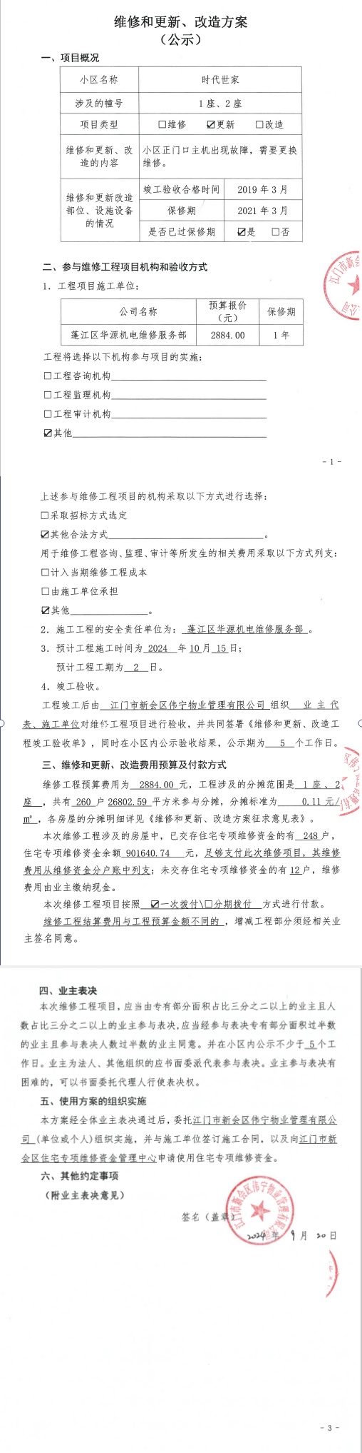 <td VALIGN="top" VALUES="" STYLE="border-width:0" BINDTYPE="0" ROWSPAN="19" COLSPAN="7" DATASOURCE="投票结果" ><font style="font-size:14pt;"><p style="white-space: normal; font-family: 宋体; line-height: 1.75em;">时代世家1座、2座全体业主:</p><p style="white-space: normal; font-family: 宋体; line-height: 1.75em; text-indent: 2em;">本小区关于时代世家正门口对讲机主机更换使用维修资金的投票的投票已表决结束,询异时间从2024年12月13日开始,投票询异公示期间,业主可通过微信查询自己的表决情况或可凭身份证件申请查询自己的表决情况;如公示的业主表决情况与查询的本人表决意见不一致的,可以以书面形式向投票组织机构申诉,投票组织机构予以纠正并重新公示表决结果。异议提出人对投票组织机构的处理仍有异议的,可以向街道办事处(镇人民政府)反映处理,涉及住宅专项维修资金的,可向属地住宅专项维修资金管理中心反映处理。</p><p style="white-space: normal;"><br/></p><p style="white-space: normal; font-family: 宋体; line-height: 1.75em;"><strong>附件:</strong></p><p style="white-space: normal; font-family: 宋体; line-height: 1.75em;"><strong>一、投票范围</strong></p><p style="white-space: normal; font-family: 宋体; line-height: 1.75em; text-indent: 2em;">时代世家1座、2座</p><p style="white-space: normal; font-family: 宋体; line-height: 1.75em; text-indent: 2em;">总人数(专有部分人数之和):258</p><p style="white-space: normal; font-family: 宋体; line-height: 1.75em; text-indent: 2em;"><span style="font-family: 宋体, SimSun;"><span style="font-family: 宋体; text-indent: 32px;"><span style="font-family: 宋体; text-indent: 32px;">总户数:260</span></span></span></p><p style="white-space: normal; font-family: 宋体; line-height: 1.75em; text-indent: 2em;">建筑物总面积(专有部分面积之和):26802.59㎡</p><p style="white-space: normal; font-family: 宋体; line-height: 1.75em;"><strong>二、询异公示起止时间</strong></p><p dir="ltr" style="white-space: normal; font-family: 宋体; line-height: 1.75em; text-indent: 2em;"><span style="text-indent: 36px;">2024年12月13日至2024年12月23日</span></p><p style="white-space: normal; font-family: 宋体; line-height: 1.75em;"><strong>三、投票详细描述</strong></p><p style="white-space: normal; font-family: 宋体; line-height: 1.75em; text-indent: 2em;"><p style="font-family: "Helvetica Neue", Helvetica, Arial, sans-serif; font-size: 14px; text-wrap: wrap; background-color: rgb(255, 255, 255);">小区正门对讲机主机出现故障,不能正常使用。经检查,是由于主机内部硬件出现故障导致对讲机不能正常运行。</p><p style="font-family: "Helvetica Neue", Helvetica, Arial, sans-serif; font-size: 14px; text-wrap: wrap; background-color: rgb(255, 255, 255);">现对正门口对讲机主机进行维修更换,工程维修预算金额为:2884元,项目最终费用以施工合同签订金额为准。因已过保修期,维修费用由相关业主按建筑面积分摊,每平方约0.11元,详见公示附件。如业主手机不能正常通过微信投票,请联系物业公司进行线下纸质投票,物业电话:0750-6131111。</p><p><br/></p></p><p style="white-space: normal; font-family: 宋体; line-height: 1.75em;"><strong>四、计票规则</strong></p><p style="white-space: normal; font-family: 宋体; line-height: 1.75em; text-indent: 2em;">表决事项:使用建筑物及其附属设施的维修资金<br /><p style='text-align: left; font-family: 宋体; font-size: 16px; line-height: 1.75em; text-indent: 2em;'>计票规则:弃权票不并入其它项 未表决票不并入其它项</p></p><p style="white-space: normal; font-family: 宋体; line-height: 1.75em;"><strong>五、通过规则</strong></p><p style="white-space: normal; font-family: 宋体; line-height: 1.75em;"><strong><strong style="white-space: normal;"><span style="font-family: 宋体, SimSun;"> 根据《中华人民共和国民法典》第二百七十八条规定:业主共同决定事项,应当由专有部分面积占比三分之二以上的业主且人数占比三分之二以上的业主参与表决。</span></strong></strong></p><p style="white-space: normal; font-family: 宋体; line-height: 1.75em; text-indent: 2em;">表决事项:使用建筑物及其附属设施的维修资金<br /><p style='text-align: left; font-family: 宋体; font-size: 16px; line-height: 1.75em; text-indent: 2em;'>通过规则:双2/3以上参与表决,参与表决双过半同意</p></p><p style="white-space: normal; font-family: 宋体; line-height: 1.75em;"><strong>六、投票结果</strong></p><p style="white-space: normal; font-family: 宋体; line-height: 1.75em; text-indent: 2em;"><div id='resultTable'><table style='table-layout: fixed; font-size:12px; margin-top:10px' width='100%' border='0' cellspacing='0' cellpadding='0'><tr><td height='28' colspan='10' align='center' style='border: 1px solid #666'><strong style='font-size: 14px;'> 使用建筑物及其附属设施的维修资金</strong></td> </tr><tr id='trfirst'><td height='28' colspan='4' style='border-left: 1px solid #666; border-bottom: 1px solid #666'><strong> 申报单位:</strong> 江门市新会区伟宁物业管理有限公司</td><td colspan='3' style='border-left: 1px solid #666; border-bottom: 1px solid #666'><strong> 联系方式:</strong> 6109605 </td><td colspan='3' style='border-left: 1px solid #666; border-bottom: 1px solid #666; border-right: 1px solid #666'><strong> 申报日期:</strong> 2024年12月8日 </td></tr><tr> <td height='28' colspan='5' style='border-left: 1px solid #666; border-bottom: 1px solid #666'><strong> 总人数(专有部分人数之和):</strong>258人 </td><td colspan='5' style='border-left: 1px solid #666; border-bottom: 1px solid #666; border-right: 1px solid #666'><strong> 建筑物总面积(专有部分面积之和):</strong>2680
