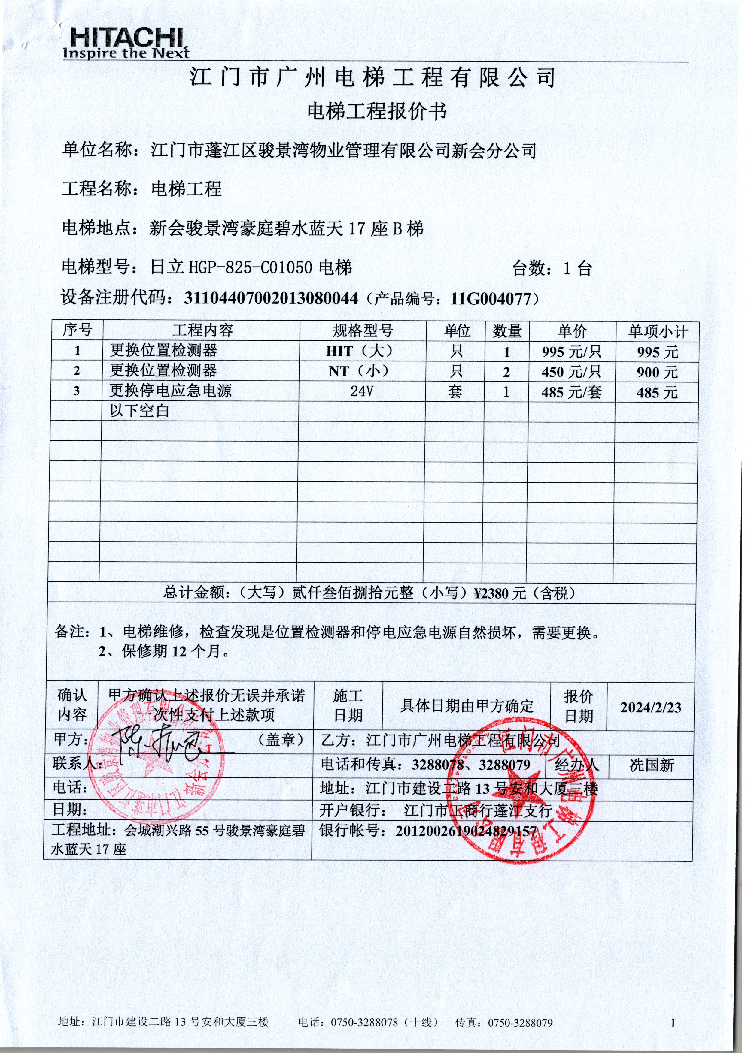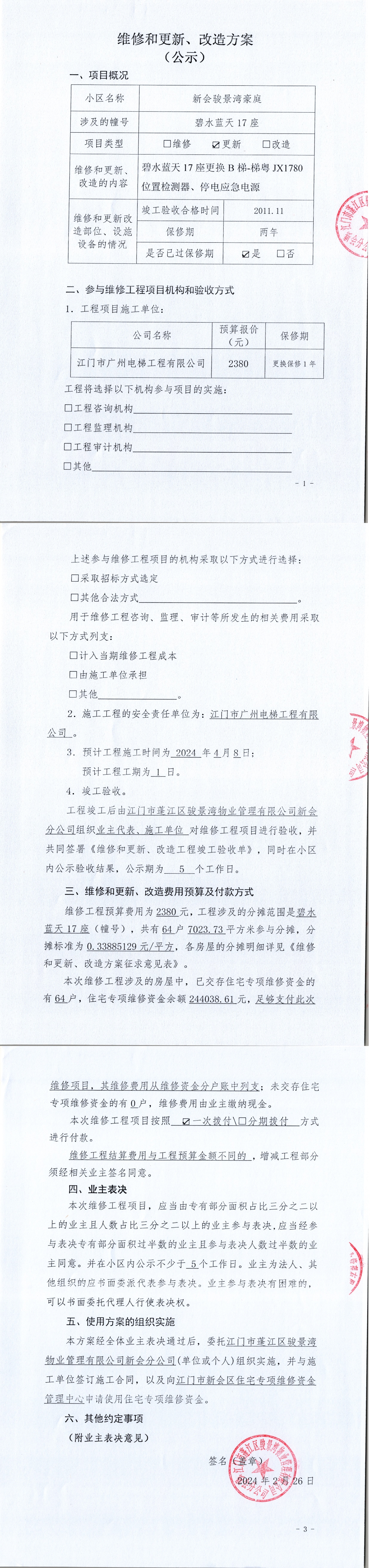 <td VALIGN="top" VALUES="" STYLE="border-width:0" BINDTYPE="0" ROWSPAN="19" COLSPAN="7" DATASOURCE="投票结果" ><font style="font-size:14pt;"><p style="white-space: normal; font-family: 宋体; line-height: 1.75em;">新会骏景湾豪庭碧水蓝天17座全体业主:</p><p style="white-space: normal; font-family: 宋体; line-height: 1.75em; text-indent: 2em;">本小区关于新会骏景湾豪庭碧水蓝天17座B电梯更换位置检测器、停电应急电源使用维修资金的投票的投票已表决结束,询异时间从2024年03月12日开始,投票询异公示期间,业主可通过微信查询自己的表决情况或可凭身份证件申请查询自己的表决情况;如公示的业主表决情况与查询的本人表决意见不一致的,可以以书面形式向投票组织机构申诉,投票组织机构予以纠正并重新公示表决结果。异议提出人对投票组织机构的处理仍有异议的,可以向街道办事处(镇人民政府)反映处理,涉及住宅专项维修资金的,可向属地住宅专项维修资金管理中心反映处理。</p><p style="white-space: normal;"><br/></p><p style="white-space: normal; font-family: 宋体; line-height: 1.75em;"><strong>附件:</strong></p><p style="white-space: normal; font-family: 宋体; line-height: 1.75em;"><strong>一、投票范围</strong></p><p style="white-space: normal; font-family: 宋体; line-height: 1.75em; text-indent: 2em;">新会骏景湾豪庭碧水蓝天17座</p><p style="white-space: normal; font-family: 宋体; line-height: 1.75em; text-indent: 2em;">总人数(专有部分人数之和):64</p><p style="white-space: normal; font-family: 宋体; line-height: 1.75em; text-indent: 2em;"><span style="font-family: 宋体, SimSun;"><span style="font-family: 宋体; text-indent: 32px;"><span style="font-family: 宋体; text-indent: 32px;">总户数:64</span></span></span></p><p style="white-space: normal; font-family: 宋体; line-height: 1.75em; text-indent: 2em;">建筑物总面积(专有部分面积之和):7023.88㎡</p><p style="white-space: normal; font-family: 宋体; line-height: 1.75em;"><strong>二、询异公示起止时间</strong></p><p dir="ltr" style="white-space: normal; font-family: 宋体; line-height: 1.75em; text-indent: 2em;"><span style="text-indent: 36px;">2024年03月12日至2024年03月18日</span></p><p style="white-space: normal; font-family: 宋体; line-height: 1.75em;"><strong>三、投票详细描述</strong></p><p style="white-space: normal; font-family: 宋体; line-height: 1.75em; text-indent: 2em;"><p> 小区碧水蓝天17幢的B梯停在-1楼不运行,经检查,发现是位置检测器和停电应急电源自然损坏,需要更换。</p><p> 现对碧水蓝天17幢B梯进行维修,工程维修预算金额为2380元,项目最终费用以施工合同签订金额为准。因已过保修期,维修费用由相关业主按建筑面积分摊,每平方约0.33885129元,详见公示附件。如业主手机不能正常通过微信投票,请联系物业公司进行线下纸质投票,物业电话:0750-6179992。</p><p><br/></p></p><p style="white-space: normal; font-family: 宋体; line-height: 1.75em;"><strong>四、计票规则</strong></p><p style="white-space: normal; font-family: 宋体; line-height: 1.75em; text-indent: 2em;">表决事项:使用建筑物及其附属设施的维修资金<br /><p style='text-align: left; font-family: 宋体; font-size: 16px; line-height: 1.75em; text-indent: 2em;'>计票规则:弃权票不并入其它项 未表决票不并入其它项</p></p><p style="white-space: normal; font-family: 宋体; line-height: 1.75em;"><strong>五、通过规则</strong></p><p style="white-space: normal; font-family: 宋体; line-height: 1.75em;"><strong><strong style="white-space: normal;"><span style="font-family: 宋体, SimSun;"> 根据《中华人民共和国民法典》第二百七十八条规定:业主共同决定事项,应当由专有部分面积占比三分之二以上的业主且人数占比三分之二以上的业主参与表决。</span></strong></strong></p><p style="white-space: normal; font-family: 宋体; line-height: 1.75em; text-indent: 2em;">表决事项:使用建筑物及其附属设施的维修资金<br /><p style='text-align: left; font-family: 宋体; font-size: 16px; line-height: 1.75em; text-indent: 2em;'>通过规则:双2/3以上参与表决,参与表决双过半同意</p></p><p style="white-space: normal; font-family: 宋体; line-height: 1.75em;"><strong>六、投票结果</strong></p><p style="white-space: normal; font-family: 宋体; line-height: 1.75em; text-indent: 2em;"><div id='resultTable'><table style='table-layout: fixed; font-size:12px; margin-top:10px' width='100%' border='0' cellspacing='0' cellpadding='0'><tr><td height='28' colspan='10' align='center' style='border: 1px solid #666'><strong style='font-size: 14px;'> 使用建筑物及其附属设施的维修资金</strong></td> </tr><tr id='trfirst'><td height='28' colspan='4' style='border-left: 1px solid #666; border-bottom: 1px solid #666'><strong> 申报单位:</strong> 江门市蓬江区骏景湾物业管理有限公司新会分公司</td><td colspan='3' style='border-left: 1px solid #666; border-bottom: 1px solid #666'><strong> 联系方式:</strong> </td><td colspan='3' style='border-left: 1px solid #666; border-bottom: 1px solid #666; border-right: 1px solid #666'><strong> 申报日期:</strong> 2024年2月27日 </td></tr><tr> <td height='28' colspan='5' style='border-left: 1px solid #666; border-bottom: 1px solid #666'><strong> 总人数(专有部分人数之和):</strong>64人 </td><td colspan='5' style='border-left: 1px solid #666; border-bottom: 1px solid #666; border-right: 1px solid #666'><strong> 建筑物总面积(专有部分面积之和):</strong>7023.88㎡ </td> </tr><tr><td height='28' colspan='10' bgcolor='#F3F3F3' style='border-left: 1px solid #666;border-bottom: 1px solid #666;border-right: 1px solid #666'><strong> 参与人数及面积统计</strong></td><
