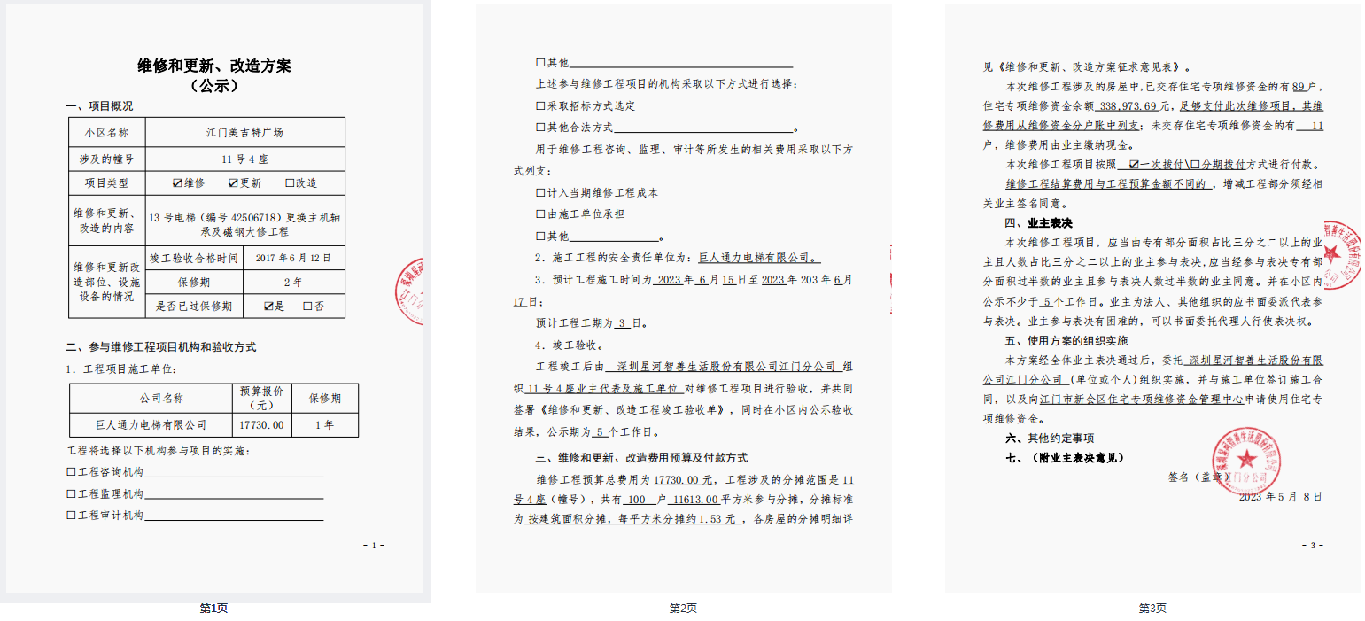 <td valign="top" values="" style="border-width:0" bindtype="0" rowspan="17" colspan="7" datasource="投票结果"><font style=" font-family:方正小标宋简体;font-size:14pt;"><p style="line-height: 1.75em;"><span style="font-family: 宋体, SimSun;">各位尊敬的业主:</span><br></p><p style="text-indent: 2em; line-height: 1.75em;"><span style="font-family: 宋体, SimSun;">根据法律法规的规定,本小区业主利用“物业公共事务决策系统”已对本小区公共事务决策事项进行了表决,在经过7日的询异公示期后,未收到业主有效的异议。现将投票结果公告,并就产生的法律效力说明如下:</span></p><p style="line-height: 1.75em; text-indent: 0em;"><strong style="text-indent: 2em;"><span style="font-family: 宋体, SimSun;">一、投票范围</span></strong></p><p style="text-indent: 2em; line-height: 1.75em;"><span style="font-family: 宋体, SimSun;">江门美吉特广场会城启超大道11号4座</span></p><p style="text-indent: 2em; line-height: 1.75em;"><span style="font-family: 宋体, SimSun;">总人数(专有部分人数之和):100</span></p><p style="text-indent: 2em; line-height: 1.75em;"><span style="font-family: 宋体, SimSun;"><span style="font-family: 宋体, SimSun; text-indent: 32px;">总户数:100</span></span></p><p style="text-indent: 2em; line-height: 1.75em;"><span style="font-family: 宋体, SimSun;">建筑物总面积(专有部分面积之和):11613.00㎡</span></p><p style="line-height: 1.75em;"><strong><span style="font-family: 宋体, SimSun;">二、投票起止时间</span></strong></p><p style="text-indent: 2em; line-height: 1.75em;"><span style="font-family: 宋体, SimSun;">投票表决时间:从2023年05月10日到2023年05月15日止</span></p><p style="text-indent: 2em; line-height: 1.75em;"><span style="font-family: 宋体, SimSun;">投票询异公示时间:从2023年05月16日开始</span></p><p style="text-indent: 2em; line-height: 1.75em;"><span style="font-family: 宋体, SimSun;">投票结果通知公告时间:从2023年05月23日开始</span></p><p style="line-height: 1.75em;"><strong><span style="font-family: 宋体, SimSun;">三、计票规则</span></strong></p><p style="text-indent: 2em; line-height: 1.75em;"><span style="font-family: 宋体, SimSun;">表决事项:使用建筑物及其附属设施的维修资金<br></span></p><p style="font-family: 宋体, SimSun;line-height: 1.75em; text-indent: 2em;">计票规则:弃权票不并入其它项 未表决票不并入其它项</p><p></p><p style="line-height: 1.75em;"><strong><span style="font-family: 宋体, SimSun;">四、通过规则</span></strong></p><p style="text-indent: 2em; line-height: 1.75em;"><span style="font-family: 宋体, SimSun;"><span style="font-family: 宋体, SimSun; text-indent: 32px;">表决事项:使用建筑物及其附属设施的维修资金<br></span></span></p><p style="font-family: 宋体, SimSun;line-height: 1.75em; text-indent: 2em;">通过规则:参与表决专有部分面积过半数的业主且参与表决人数过半数的业主同意</p><p></p><p style="line-height: 1.75em;"><strong><span style="font-family: 宋体, SimSun;">五、投票结果</span></strong></p><p style="line-height: 1.75em; text-indent: 2em;"><span style="font-family: 宋体, SimSun; text-indent: 2em;"></span></p><div id="resultTable"><table style="table-layout: fixed; font-size:12px; margin-top:10px" width="100%" border="0" cellspacing="0" cellpadding="0"><tbody><tr><td height="28" colspan="10" align="center" style="border: 1px solid #666"><strong style="font-size: 14px;"> 使用建筑物及其附属设施的维修资金</strong></td> </tr><tr id="trfirst"><td height="28" colspan="4" style="border-left: 1px solid #666; border-bottom: 1px solid #666"><strong> 申报单位:</strong> 深圳星河智善生活股份有限公司江门分公司</td><td colspan="3" style="border-left: 1px solid #666; border-bottom: 1px solid #666"><strong> 联系方式:</strong> (0750) 3871336 3829717 </td><td colspan="3" style="border-left: 1px solid #666; border-bottom: 1px solid #666; border-right: 1px solid #666"><strong> 申报日期:</strong> 2023年5月9日 </td></tr><tr> <td height="28" colspan="5" style="border-left: 1px solid #666; border-bottom: 1px solid #666"><strong> 总人数(专有部分人数之和):</strong>100人 </td><td colspan="5" style="border-left: 1px solid #666; border-bottom: 1px solid #666; border-right: 1px solid #666"><strong> 建筑物总面积(专有部分面积之和):</strong>11613.00㎡ </td> </tr><tr><td height="28" colspan="10" bgcolor="#F3F3F3" style="border-left: 1px solid #666;border-bottom: 1px solid #666;border-right: 1px solid #666"><strong> 参与人数及面积统计</strong></td></tr><tr><td height="28" colspan="5" style="border-left: 1px solid #666; border-bottom: 1px solid #666"><strong> 参与表决专有部分人数之和:</strong>73人</td><td colspan="5" style="border-left: 1px solid #666; border-bottom: 1px solid #666; border-right: 1px solid #666"><strong> 参与表决占有表决权总人数比例:</strong>73.00%</td></tr><tr><td height="28" colspan="5" style="border-left: 1px solid #666; border-bottom: 1px solid #666"><strong> 参与表决专有部分面积之和:</strong>8504.58㎡</td><td colspan="5" style="border-left: 1px solid #666; border-bottom: 1px solid #666; border-right: 1px solid #666"><strong> 参与表决占有表决权总面积比例:</strong>73.23%</td></tr><tr><td height="28" colspan="10" bgcolor="#F3F3F3" style="border-left: 1px solid #666; border-bottom: 1px solid #666;border-right: 1px solid #666"> <strong> 未参与人数及面积统计</strong></td> </tr><tr><td height="28" colspan="5" style="border-left: 1px solid #666; border-bottom: 1px solid #666"><strong> 未参与表决专有部分人数之和:</strong>27人 </td><td colspan="5" style="border-left: 1px solid #666; border-bottom: 1px solid #666; border-right: 1px solid #666"><strong> 未参与表决占有表决权总人数