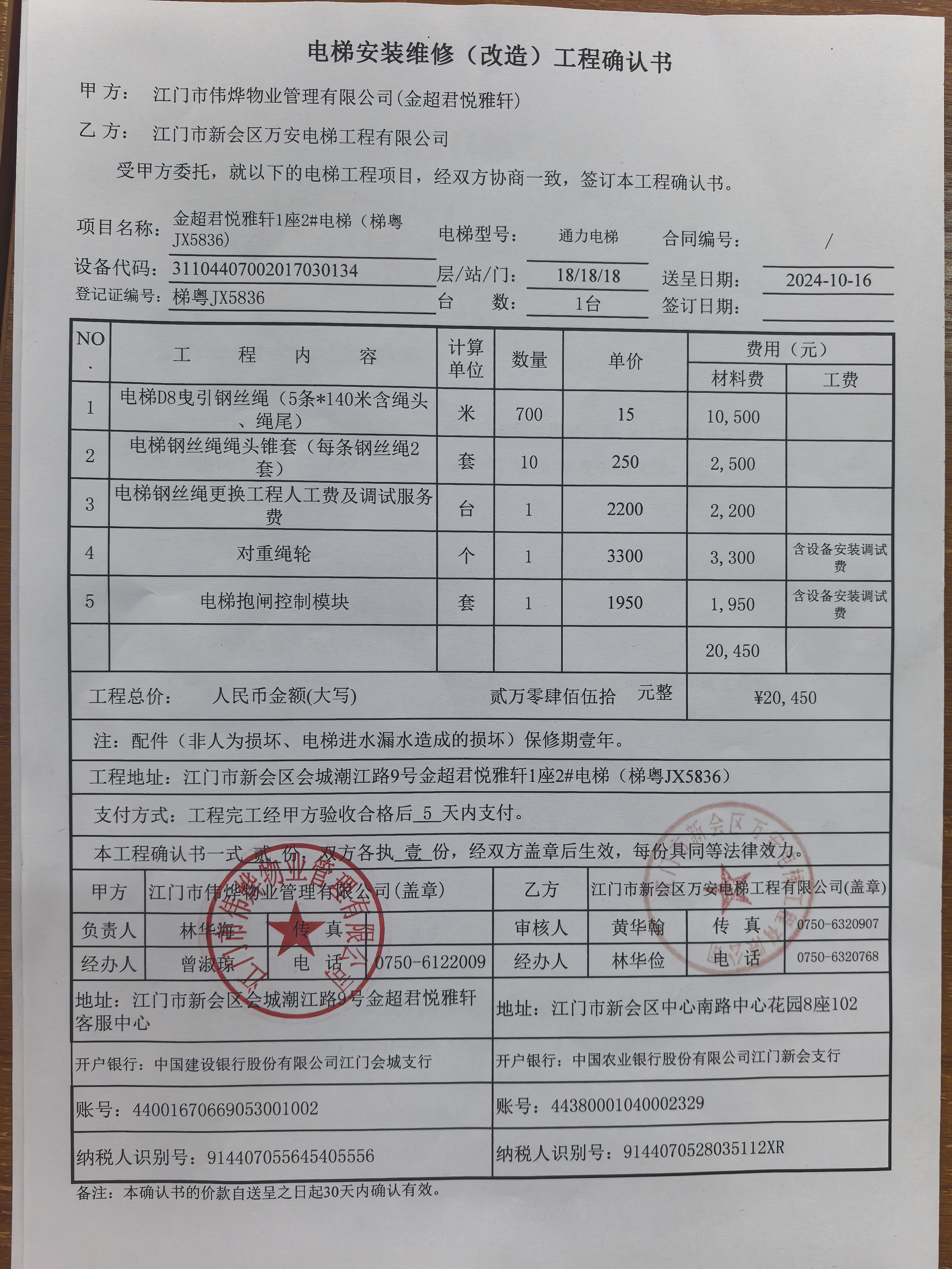 <td VALIGN="top" VALUES="" STYLE="border-width:0" BINDTYPE="0" ROWSPAN="19" COLSPAN="7" DATASOURCE="投票结果" ><font style="font-size:14pt;"><p style="white-space: normal; font-family: 宋体; line-height: 1.75em;">金超君悦雅轩1座全体业主:</p><p style="white-space: normal; font-family: 宋体; line-height: 1.75em; text-indent: 2em;">本小区关于金超君悦雅轩1座2#电梯(梯粤JX5836)更换电梯曳引钢丝绳、对重绳轮、抱闸控制模块使用维修资金的投票的投票已表决结束,询异时间从2024年10月25日开始,投票询异公示期间,业主可通过微信查询自己的表决情况或可凭身份证件申请查询自己的表决情况;如公示的业主表决情况与查询的本人表决意见不一致的,可以以书面形式向投票组织机构申诉,投票组织机构予以纠正并重新公示表决结果。异议提出人对投票组织机构的处理仍有异议的,可以向街道办事处(镇人民政府)反映处理,涉及住宅专项维修资金的,可向属地住宅专项维修资金管理中心反映处理。</p><p style="white-space: normal;"><br/></p><p style="white-space: normal; font-family: 宋体; line-height: 1.75em;"><strong>附件:</strong></p><p style="white-space: normal; font-family: 宋体; line-height: 1.75em;"><strong>一、投票范围</strong></p><p style="white-space: normal; font-family: 宋体; line-height: 1.75em; text-indent: 2em;">金超君悦雅轩1座</p><p style="white-space: normal; font-family: 宋体; line-height: 1.75em; text-indent: 2em;">总人数(专有部分人数之和):62</p><p style="white-space: normal; font-family: 宋体; line-height: 1.75em; text-indent: 2em;"><span style="font-family: 宋体, SimSun;"><span style="font-family: 宋体; text-indent: 32px;"><span style="font-family: 宋体; text-indent: 32px;">总户数:63</span></span></span></p><p style="white-space: normal; font-family: 宋体; line-height: 1.75em; text-indent: 2em;">建筑物总面积(专有部分面积之和):6298.67㎡</p><p style="white-space: normal; font-family: 宋体; line-height: 1.75em;"><strong>二、询异公示起止时间</strong></p><p dir="ltr" style="white-space: normal; font-family: 宋体; line-height: 1.75em; text-indent: 2em;"><span style="text-indent: 36px;">2024年10月25日至2024年11月04日</span></p><p style="white-space: normal; font-family: 宋体; line-height: 1.75em;"><strong>三、投票详细描述</strong></p><p style="white-space: normal; font-family: 宋体; line-height: 1.75em; text-indent: 2em;"><p>本小区 1座2 #电梯(梯粤JX5836)日常运行时出现异响,经检查,是由于 1 座2#电梯(梯粤JX5836)因对重反绳轮和电梯抱闸控制模块、钢丝绳出现故障导致不能运行 ,已过保修期。现需申请使用维修资金对1座2 # 电梯(梯粤JX5836)更换电梯曳引钢丝绳、对重绳轮、抱闸控制模块,工程维修预算金额为 20450 元,项目最终费用以施工合同签订金额为准。维修费用的分摊标准为按建筑面积分摊,每平方约:3.2468元,详见公示附件。如业主手机不能正常通过微信投票,请联系物业公司进行线下纸质投票,物业公司联系电话:0750-6122009</p></p><p style="white-space: normal; font-family: 宋体; line-height: 1.75em;"><strong>四、计票规则</strong></p><p style="white-space: normal; font-family: 宋体; line-height: 1.75em; text-indent: 2em;">表决事项:使用建筑物及其附属设施的维修资金<br /><p style='text-align: left; font-family: 宋体; font-size: 16px; line-height: 1.75em; text-indent: 2em;'>计票规则:弃权票不并入其它项 未表决票不并入其它项</p></p><p style="white-space: normal; font-family: 宋体; line-height: 1.75em;"><strong>五、通过规则</strong></p><p style="white-space: normal; font-family: 宋体; line-height: 1.75em;"><strong><strong style="white-space: normal;"><span style="font-family: 宋体, SimSun;"> 根据《中华人民共和国民法典》第二百七十八条规定:业主共同决定事项,应当由专有部分面积占比三分之二以上的业主且人数占比三分之二以上的业主参与表决。</span></strong></strong></p><p style="white-space: normal; font-family: 宋体; line-height: 1.75em; text-indent: 2em;">表决事项:使用建筑物及其附属设施的维修资金<br /><p style='text-align: left; font-family: 宋体; font-size: 16px; line-height: 1.75em; text-indent: 2em;'>通过规则:双2/3以上参与表决,参与表决双过半同意</p></p><p style="white-space: normal; font-family: 宋体; line-height: 1.75em;"><strong>六、投票结果</strong></p><p style="white-space: normal; font-family: 宋体; line-height: 1.75em; text-indent: 2em;"><div id='resultTable'><table style='table-layout: fixed; font-size:12px; margin-top:10px' width='100%' border='0' cellspacing='0' cellpadding='0'><tr><td height='28' colspan='10' align='center' style='border: 1px solid #666'><strong style='font-size: 14px;'> 使用建筑物及其附属设施的维修资金</strong></td> </tr><tr id='trfirst'><td height='28' colspan='4' style='border-left: 1px solid #666; border-bottom: 1px solid #666'><strong> 申报单位:</strong> 江门市伟烨物业管理有限公司</td><td colspan='3' style='border-left: 1px solid #666; border-bottom: 1px solid #666'><strong> 联系方式:</strong> 0750-6123828 </td><td colspan='3' style='border-left: 1px solid #666; border-bottom: 1px solid #666; border-right: 1px solid #666'><strong> 申报日期:</strong> 2024年10月18日 </td></tr><tr> <td height='28' colspan='5' style='border-left: 1px solid #666; border-bottom: 1px solid #666'><strong> 总人数(专有部分人数之和):</strong>62人 </td><td colspan='5' style='border-left: 1px solid #666; border-bottom: 1px solid #666; border-right: 1px solid #666'><strong> 建筑物总面积(专有部分面积之和):</strong>6298.67㎡ </td> </tr><tr><td height='28' colspan='10' bgcolor='#F3F3F3' style='border-left: 1px solid