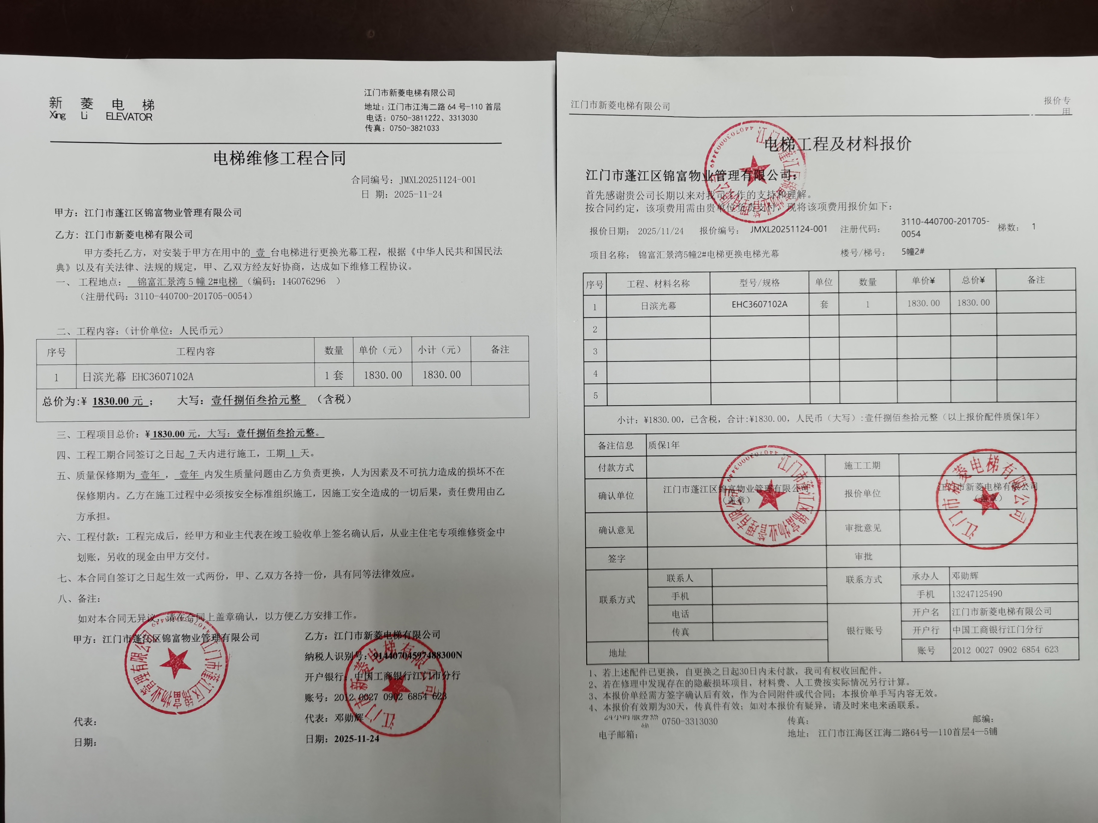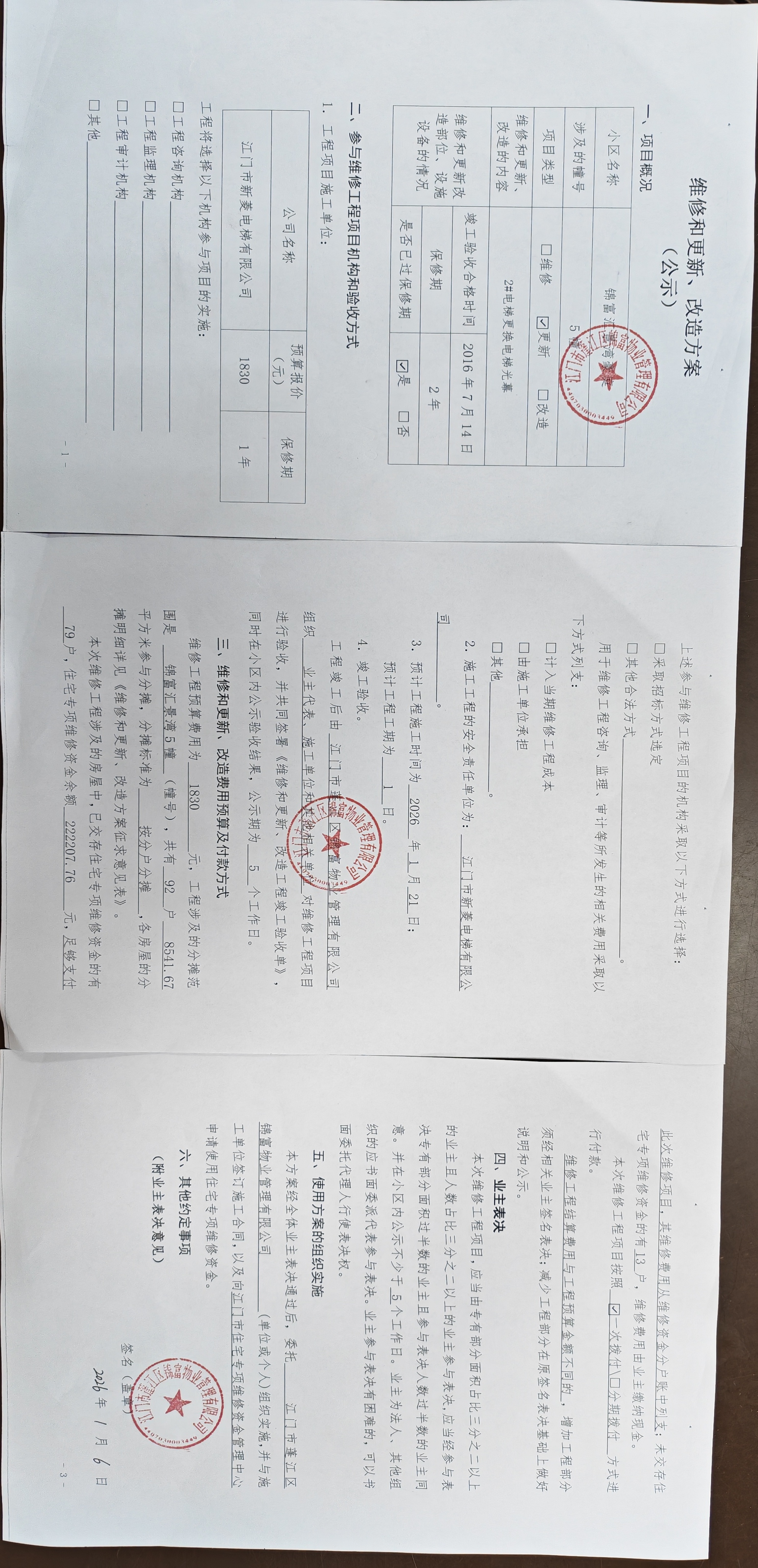 <td VALIGN="top" VALUES="" STYLE="border-width:0" BINDTYPE="0" ROWSPAN="19" COLSPAN="7" DATASOURCE="投票结果" ><font style="font-size:14pt;"><p style="white-space: normal; font-family: 宋体; line-height: 1.75em;">江门市蓬江区锦富汇景湾豪庭蓬江区棠下镇锦富汇景湾豪庭5幢全体业主:</p><p style="white-space: normal; font-family: 宋体; line-height: 1.75em; text-indent: 2em;">本小区关于锦富汇景湾5幢2#电梯更换电梯光幕使用维修资金的投票的投票已表决结束,询异时间从2026年02月14日开始,投票询异公示期间,业主可通过微信查询自己的表决情况或可凭身份证件申请查询自己的表决情况;如公示的业主表决情况与查询的本人表决意见不一致的,可以以书面形式向投票组织机构申诉,投票组织机构予以纠正并重新公示表决结果。异议提出人对投票组织机构的处理仍有异议的,可以向街道办事处(镇人民政府)反映处理,涉及住宅专项维修资金的,可向属地住宅专项维修资金管理中心反映处理。</p><p style="white-space: normal;"><br/></p><p style="white-space: normal; font-family: 宋体; line-height: 1.75em;"><strong>附件:</strong></p><p style="white-space: normal; font-family: 宋体; line-height: 1.75em;"><strong>一、投票范围</strong></p><p style="white-space: normal; font-family: 宋体; line-height: 1.75em; text-indent: 2em;">江门市蓬江区锦富汇景湾豪庭蓬江区棠下镇锦富汇景湾豪庭5幢</p><p style="white-space: normal; font-family: 宋体; line-height: 1.75em; text-indent: 2em;">总人数(专有部分人数之和):92</p><p style="white-space: normal; font-family: 宋体; line-height: 1.75em; text-indent: 2em;"><span style="font-family: 宋体, SimSun;"><span style="font-family: 宋体; text-indent: 32px;"><span style="font-family: 宋体; text-indent: 32px;">总户数:92</span></span></span></p><p style="white-space: normal; font-family: 宋体; line-height: 1.75em; text-indent: 2em;">建筑物总面积(专有部分面积之和):8541.67㎡</p><p style="white-space: normal; font-family: 宋体; line-height: 1.75em;"><strong>二、询异公示起止时间</strong></p><p dir="ltr" style="white-space: normal; font-family: 宋体; line-height: 1.75em; text-indent: 2em;"><span style="text-indent: 36px;">2026年02月14日至2026年02月21日</span></p><p style="white-space: normal; font-family: 宋体; line-height: 1.75em;"><strong>三、投票详细描述</strong></p><p style="white-space: normal; font-family: 宋体; line-height: 1.75em; text-indent: 2em;"><p><span style="font-family: 宋体; font-size: 14px;">小区5幢的电梯日常维保期间,维保发现<span style="font-family: Calibri;">2#</span>电梯光幕出现故障不能正常运行。</span></p><p><span style="font-family: 宋体; font-size: 14px;"> 现对5幢<span style="font-family: Calibri;">2#</span>电梯进行维修,工程维修预算金额为<span style="font-family: Calibri;">1830</span>元,项目最终费用以施工合同签订金额为准。因已过保修期,维修费用由相关业主按分户分摊,每户约<span style="font-family: Calibri;">19.89</span>元,详见公示附件。如业主手机不能正常通过微信投票,请联系物业公司进行线下纸质投票,物业电话:<span style="font-family: Calibri;">0750-3598316 </span>管理员:<span style="font-family: Calibri;">13726176850</span></span></p><p><br style="font-family: "Helvetica Neue", Helvetica, Arial, sans-serif; font-size: 14px; text-wrap-mode: wrap; background-color: rgb(255, 255, 255);"/></p><p><br/></p></p><p style="white-space: normal; font-family: 宋体; line-height: 1.75em;"><strong>四、计票规则</strong></p><p style="white-space: normal; font-family: 宋体; line-height: 1.75em; text-indent: 2em;">表决事项:使用建筑物及其附属设施的维修资金<br /><p style='text-align: left; font-family: 宋体; font-size: 16px; line-height: 1.75em; text-indent: 2em;'>计票规则:弃权票不并入其它项 未表决票不并入其它项</p></p><p style="white-space: normal; font-family: 宋体; line-height: 1.75em;"><strong>五、通过规则</strong></p><p style="white-space: normal; font-family: 宋体; line-height: 1.75em;"><strong><strong style="white-space: normal;"><span style="font-family: 宋体, SimSun;"> 根据《中华人民共和国民法典》第二百七十八条规定:业主共同决定事项,应当由专有部分面积占比三分之二以上的业主且人数占比三分之二以上的业主参与表决。</span></strong></strong></p><p style="white-space: normal; font-family: 宋体; line-height: 1.75em; text-indent: 2em;">表决事项:使用建筑物及其附属设施的维修资金<br /><p style='text-align: left; font-family: 宋体; font-size: 16px; line-height: 1.75em; text-indent: 2em;'>通过规则:双2/3以上参与表决,参与表决双过半同意</p></p><p style="white-space: normal; font-family: 宋体; line-height: 1.75em;"><strong>六、投票结果</strong></p><p style="white-space: normal; font-family: 宋体; line-height: 1.75em; text-indent: 2em;"><div id='resultTable'><table style='table-layout: fixed; font-size:12px; margin-top:10px' width='100%' border='0' cellspacing='0' cellpadding='0'><tr><td height='28' colspan='10' align='center' style='border: 1px solid #666'><strong style='font-size: 14px;'> 使用建筑物及其附属设施的维修资金</strong></td> </tr><tr id='trfirst'><td height='28' colspan='4' style='border-left: 1px solid #666; border-bottom: 1px solid #666'><strong> 申报单位:</strong> 江门市蓬江区锦富物业管理有限公司</td><td colspan='3' style='border-left: 1px solid #666; border-bottom: 1px solid #666'><strong> 联系方式:</strong> 3598316 </td><td colspan='3' style='border-left: 1px solid #666; border-bottom: 1px solid #666; border-right: 1px solid #666'><strong> 申报日期:</strong> 2026年1月6日 </td></tr><tr> <td height='28' colspan='5' 