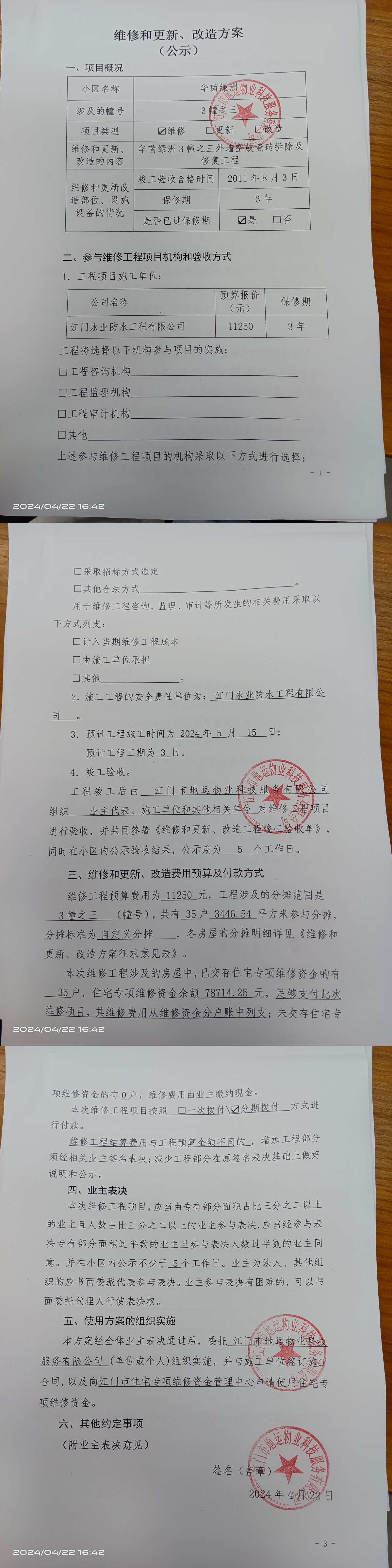 <td VALIGN="top" VALUES="" STYLE="border-width:0" BINDTYPE="0" ROWSPAN="17" COLSPAN="7" DATASOURCE="投票结果" ><font style=" font-family:方正小标宋简体;font-size:14pt;"><p style="line-height: 1.75em;"><span style="font-family: 宋体, SimSun;">各位尊敬的业主:</span><br/></p><p style="text-indent: 2em; line-height: 1.75em;"><span style="font-family: 宋体, SimSun;">根据法律法规的规定,本小区业主利用“江门市物业事项表决管理系统”已对本小区公共事务决策事项进行了表决,在经过7日的询异公示期后,未收到业主有效的异议。现将投票结果公告,并就产生的法律效力说明如下:</span></p><p style="line-height: 1.75em; text-indent: 0em;"><strong style="text-indent: 2em;"><span style="font-family: 宋体, SimSun;">一、投票范围</span></strong></p><p style="text-indent: 2em; line-height: 1.75em;"><span style="font-family: 宋体, SimSun;">华茵绿洲江门市江海区华茵绿洲3幢</span></p><p style="text-indent: 2em; line-height: 1.75em;"><span style="font-family: 宋体, SimSun;">总人数(专有部分人数之和):35</span></p><p style="text-indent: 2em; line-height: 1.75em;"><span style="font-family: 宋体, SimSun;"><span style="font-family: 宋体, SimSun; text-indent: 32px;"><span style="font-family: 宋体; text-indent: 32px;"><span style="font-family: 宋体; text-indent: 32px;">总户数:35</span></span></span></span></p><p style="text-indent: 2em; line-height: 1.75em;"><span style="font-family: 宋体, SimSun;">建筑物总面积(专有部分面积之和):3446.54㎡</span></p><p style="line-height: 1.75em;"><strong><span style="font-family: 宋体, SimSun;">二、投票结果公告时间</span></strong></p><p style="text-indent: 2em; line-height: 1.75em;"><span style="font-family: 宋体, SimSun;">从2024年05月21日开始</span></p><p style="line-height: 1.75em;"><strong><span style="font-family: 宋体, SimSun;">三、计票规则</span></strong></p><p style="text-indent: 2em; line-height: 1.75em;"><span style="font-family: 宋体, SimSun;">表决事项:使用建筑物及其附属设施的维修资金<br /><p style='font-family: 宋体, SimSun;line-height: 1.75em; text-indent: 2em;'>计票规则:弃权票不并入其它项&nbsp;&nbsp;&nbsp;&nbsp;未表决票不并入其它项</p></span></p><p style="line-height: 1.75em;"><strong><span style="font-family: 宋体, SimSun;">四、通过规则</span></strong></p><p style="line-height: 1.75em;"><strong><span style="font-family: 宋体, SimSun;">&nbsp; 根据《中华人民共和国民法典》第二百七十八条规定:业主共同决定事项,应当由专有部分面积占比三分之二以上的业主且人数占比三分之二以上的业主参与表决。</span></strong></p><p style="text-indent: 2em; line-height: 1.75em;"><span style="font-family: 宋体, SimSun;"><span style="font-family: 宋体, SimSun; text-indent: 32px;">表决事项:使用建筑物及其附属设施的维修资金<br /><p style='font-family: 宋体, SimSun;line-height: 1.75em; text-indent: 2em;'>通过规则:双2/3以上参与表决,参与表决双过半同意</p></span></span></p><p style="line-height: 1.75em;"><strong><span style="font-family: 宋体, SimSun;">五、投票结果</span></strong></p><p style="line-height: 1.75em; text-indent: 2em;"><span style="font-family: 宋体, SimSun; text-indent: 2em;"><div id='resultTable'><table style='table-layout: fixed; font-size:12px; margin-top:10px' width='100%' border='0' cellspacing='0' cellpadding='0'><tr><td height='28' colspan='10' align='center' style='border: 1px solid #666'><strong style='font-size: 14px;'> 使用建筑物及其附属设施的维修资金</strong></td> </tr><tr id='trfirst'><td height='28' colspan='4' style='border-left: 1px solid #666; border-bottom: 1px solid #666'><strong>&nbsp;申报单位:</strong> 江门市地运物业科技服务有限公司</td><td colspan='3' style='border-left: 1px solid #666; border-bottom: 1px solid #666'><strong>&nbsp;联系方式:</strong> </td><td colspan='3' style='border-left: 1px solid #666; border-bottom: 1px solid #666; border-right: 1px solid #666'><strong>&nbsp;申报日期:</strong> 2024年4月21日 </td></tr><tr> <td height='28' colspan='5' style='border-left: 1px solid #666; border-bottom: 1px solid #666'><strong>&nbsp;列支总人数(专有部分人数之和):</strong>35人 </td><td colspan='5' style='border-left: 1px solid #666; border-bottom: 1px solid #666; border-right: 1px solid #666'><strong>&nbsp;列支建筑物总面积(专有部分面积之和):</strong>3446.54㎡ </td> </tr><tr><td height='28' colspan='10' bgcolor='#F3F3F3' style='border-left: 1px solid #666;border-bottom: 1px solid #666;border-right: 1px solid #666'><strong>&nbsp;参与表决人数及面积统计</strong></td></tr><tr><td height='28' colspan='5' style='border-left: 1px solid #666; border-bottom: 1px solid #666'><strong>&nbsp;参与表决人数:</strong>29人</td><td colspan='5' style='border-left: 1px solid #666; border-bottom: 1px solid #666; border-right: 1px solid #666'><strong>&nbsp;参与表决人数占总人数比例:</strong>82.86%</td></tr><tr><td height='28' colspan='5' style='border-left: 1px solid #666; border-bottom: 1px solid #666'><strong>&nbsp;参与表决面积:</strong>2833.54㎡</td><td colspan='5' style='border-left: 1px solid #666; border-bottom: 1px solid #666; border-right: 1px solid #666'><strong>&nbsp;参与表决面积占总面积比例:</strong>82.21%</td></tr><tr><td height='28' colspan='10' bgcolor='#F3F3F3' style='border-left: 1px solid #666; border-bottom: 1px solid #666;border-right: 1px solid #666'> <strong>&nbsp;参与表决同意人数及面积统计</strong></td> </tr><tr><td height='28' colspan='5' style='border-left: 1px solid #666; border-bottom: 1px solid #666'><strong>&nbsp;参与表决同意人数:</strong>28人 </td><td colspan='5' style='border-left: 1px solid #666; border-bottom: 1px solid #666; border-right: 1px solid #666'><st