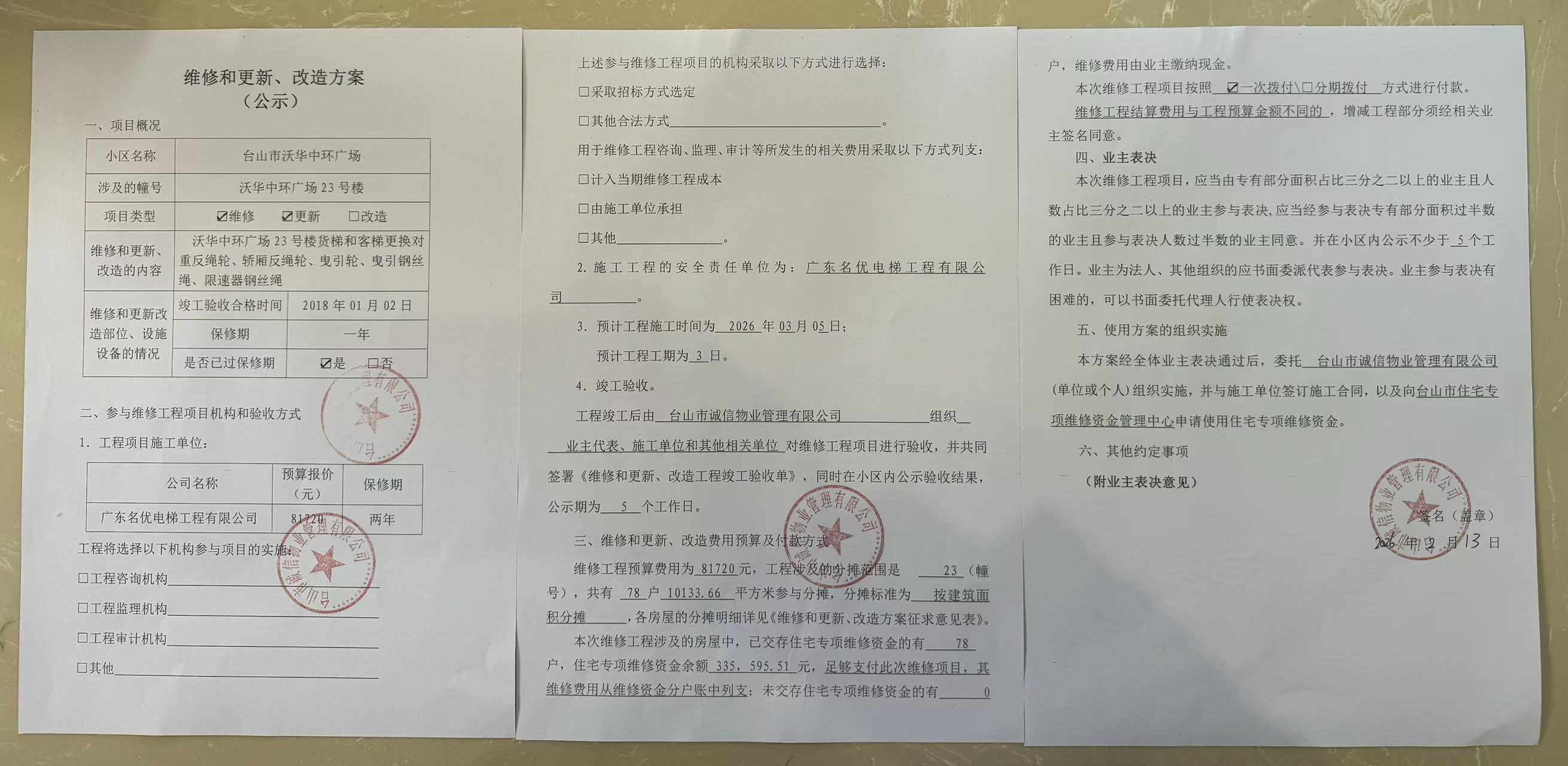 <td VALIGN="top" VALUES="" STYLE="border-width:0" BINDTYPE="0" ROWSPAN="18" COLSPAN="7" DATASOURCE="投票内容" ><font style="font-size:12pt;"><p style="text-align: left; font-family: 宋体; font-size: 16px; line-height: 1.75em; text-indent: 0em;">台山沃华中环广场台山沃华中环广场23号楼全体业主:</p><p style="text-align: left; font-family: 宋体; font-size: 16px; line-height: 1.75em; text-indent: 2em;">本小区关于沃华中环广场23号楼货梯和客梯更换对重反绳轮、轿厢反绳轮、曳引轮等配件使用维修资金的投票的投票因投票没有完成而延期,延期后投票结束时间由2026年03月15日延至2026年04月15日,由此带来不便,敬请谅解。<br/><br/></p><p style="text-align: left; font-family: 宋体; font-size: 18px; line-height: 1.75em;"><span style="font-size: 16px;"><strong>附件:</strong></span></p><p style="text-align: left; font-family: 宋体; font-size: 16px; line-height: 1.75em;"><br/></p><p style="white-space: normal; font-family: 宋体; font-size: 16px;line-height: 1.75em;"><strong>一、投票范围</strong></p><p style="white-space: normal; font-family: 宋体; font-size: 16px; line-height: 1.75em; text-indent: 2em;">台山沃华中环广场台山沃华中环广场23号楼</p><p style="white-space: normal; font-family: 宋体; font-size: 16px; line-height: 1.75em; text-indent: 2em;">总人数(专有部分人数之和):78</p><p style="white-space: normal; font-family: 宋体; font-size: 16px; line-height: 1.75em; text-indent: 2em;"><span style="font-family: 宋体, SimSun; text-indent: 32px;"><span style="font-family: 宋体; text-indent: 32px;">总户数:78</span></span></p><p style="white-space: normal; font-family: 宋体; font-size: 16px; line-height: 1.75em; text-indent: 2em;">建筑物总面积(专有部分面积之和):10133.66㎡</p><p style="white-space: normal; font-family: 宋体;font-size: 16px; line-height: 1.75em;"><strong>二、投票起止时间</strong></p><p dir="ltr" style="white-space: normal; font-family: 宋体; line-height: 1.75em; text-indent: 2em;">投票表决时间:从2026年02月14日到2026年04月15日止</p><p dir="ltr" style="white-space: normal; font-family: 宋体; line-height: 1.75em; text-indent: 2em;">投票补录时间:从2026年04月16日到2026年04月21日止</p><p style="white-space: normal; font-family: 宋体; font-size: 16px;line-height: 1.75em;"><strong>三、投票详细描述</strong></p><p style="white-space: normal; font-family: 宋体; font-size: 16px; line-height: 1.75em; text-indent: 2em;"><p>小区23号楼货梯和客梯进行本年度的定期检验,检验不合格,经检查,是由于货梯和客梯检查到曳引钢丝绳和限速器钢丝绳磨损老化,钢丝绳表面有明显外部磨损现象,受使用频繁程度、荷载状态等因素影响曳引钢丝绳磨损由原8mm钢丝绳实测为6.8mm,磨损量超过10%,限速器钢丝绳磨损由原8mm钢丝绳实测为7.1mm,磨损量超过10%,已达到国家安全报废标准,存在较大的安全隐患。曳引轮、轿厢反绳轮和对重反绳轮磨损严重,部分绳槽磨损下沉超过2mm,各绳槽深浅不均匀,且每转动一圈其周长误差相应增加,存在安全隐患,已达到国家安全标准报废标准。</p><p>现对23号楼货梯和客梯进行维修,工程维修预算金额为81720元,项目最终费用以施工合同签订金额为准。因已过保修期,维修费用由相关业主按建筑面积分摊,每平方约8.06元,详见公示附件。如业主手机不能正常通过微信投票,请联系物业公司进行线下纸质投票,物业电话:0750-5555839、5555819</p></p><p style="white-space: normal; font-family: 宋体;font-size: 16px; line-height: 1.75em;"><strong>四、计票规则</strong></p><p style="white-space: normal; font-family: 宋体; font-size: 16px; line-height: 1.75em; text-indent: 2em;">表决事项:使用建筑物及其附属设施的维修资金<br /><p style='text-align: left; font-family: 宋体; font-size: 16px; line-height: 1.75em; text-indent: 2em;'>计票规则:弃权票不并入其它项 未表决票不并入其它项</p></p><p style="white-space: normal; font-family: 宋体;font-size: 16px; line-height: 1.75em;"><strong>五、通过规则</strong></p><p style="white-space: normal; font-family: 宋体;font-size: 16px; line-height: 1.75em;"><strong><strong style="white-space: normal;"><span style="font-family: 宋体, SimSun;">&nbsp; 根据《中华人民共和国民法典》第二百七十八条规定:业主共同决定事项,应当由专有部分面积占比三分之二以上的业主且人数占比三分之二以上的业主参与表决。</span></strong></strong></p><p style="white-space: normal; font-family: 宋体; font-size: 16px; line-height: 1.75em; text-indent: 2em;"><span style="font-family: 宋体; text-indent: 32px;">表决事项:使用建筑物及其附属设施的维修资金<br /><p style='text-align: left; font-family: 宋体; font-size: 16px; line-height: 1.75em; text-indent: 2em;'>通过规则:双2/3以上参与表决,参与表决双过半同意</p></span></p><p style="text-align: left; font-family: 宋体; font-size: 16px; line-height: 1.75em;"><strong>六、投票方式</strong></p><p style="text-align: left; font-family: 宋体; font-size: 16px; line-height: 1.75em; text-indent: 2em;"><span style="font-family: 宋体; line-height: 28px;">在投票事项通知公告日起,请业主扫描二维码或者关注微信公众号(<strong>江门住建易办事</strong>)查看详细情况并进行投票。</span></p><p><br/></p><p style="text-align: right; font-family: 宋体; font-size: 16px; line-height: 1.75em;">申报单位:台山市诚信物业管理有限公司<br/>2026年03月13日</p></font></td>