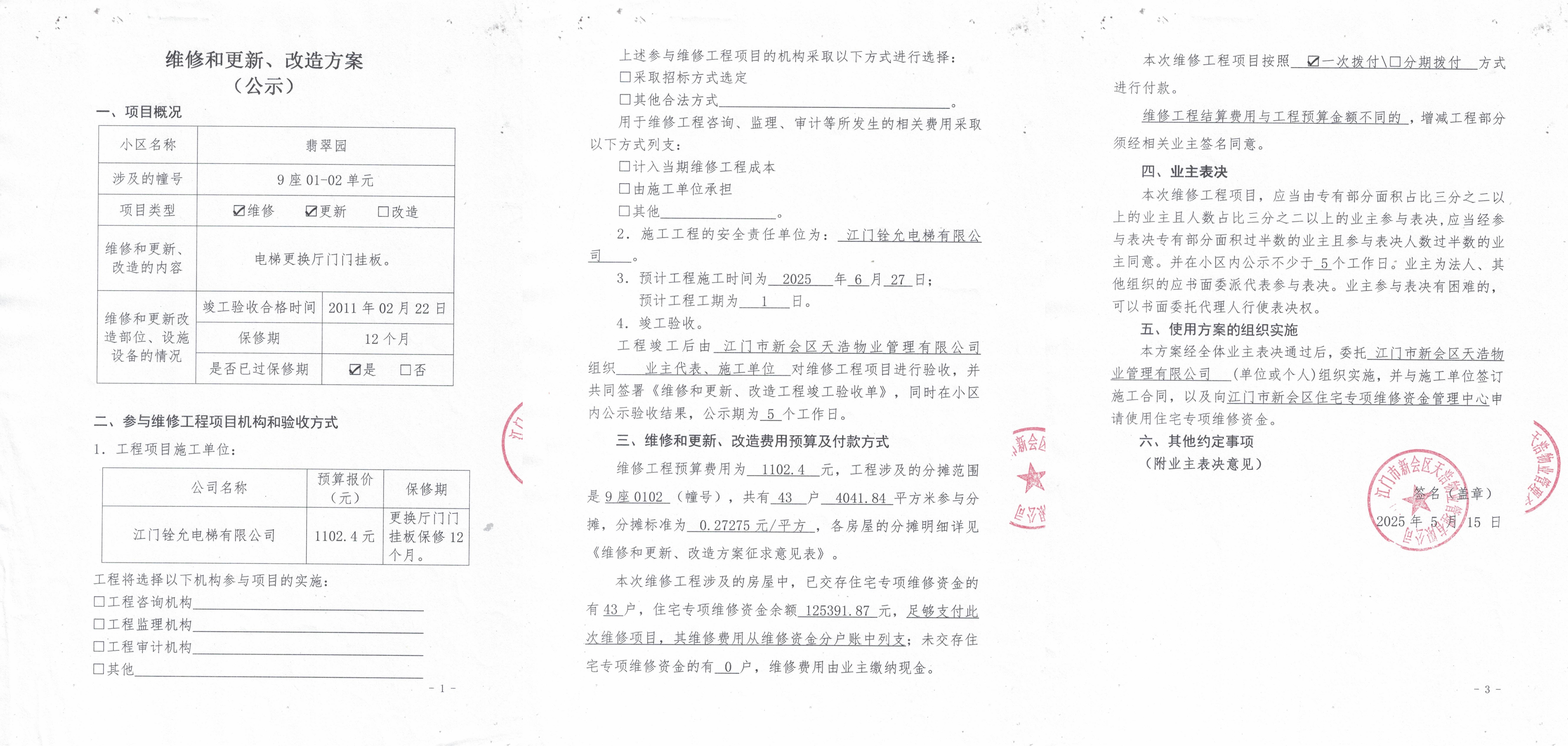 <td VALIGN="top" VALUES="" STYLE="border-width:0" BINDTYPE="0" ROWSPAN="19" COLSPAN="7" DATASOURCE="投票结果" ><font style="font-size:14pt;"><p style="white-space: normal; font-family: 宋体; line-height: 1.75em;">翡翠园翡翠园9座全体业主:</p><p style="white-space: normal; font-family: 宋体; line-height: 1.75em; text-indent: 2em;">本小区关于翡翠园9座0102电梯(梯粤JX5580)更换厅门门挂板使用维修资金的投票的投票已表决结束,询异时间从2025年05月23日开始,投票询异公示期间,业主可通过微信查询自己的表决情况或可凭身份证件申请查询自己的表决情况;如公示的业主表决情况与查询的本人表决意见不一致的,可以以书面形式向投票组织机构申诉,投票组织机构予以纠正并重新公示表决结果。异议提出人对投票组织机构的处理仍有异议的,可以向街道办事处(镇人民政府)反映处理,涉及住宅专项维修资金的,可向属地住宅专项维修资金管理中心反映处理。</p><p style="white-space: normal;"><br/></p><p style="white-space: normal; font-family: 宋体; line-height: 1.75em;"><strong>附件:</strong></p><p style="white-space: normal; font-family: 宋体; line-height: 1.75em;"><strong>一、投票范围</strong></p><p style="white-space: normal; font-family: 宋体; line-height: 1.75em; text-indent: 2em;">翡翠园翡翠园9座</p><p style="white-space: normal; font-family: 宋体; line-height: 1.75em; text-indent: 2em;">总人数(专有部分人数之和):25</p><p style="white-space: normal; font-family: 宋体; line-height: 1.75em; text-indent: 2em;"><span style="font-family: 宋体, SimSun;"><span style="font-family: 宋体; text-indent: 32px;"><span style="font-family: 宋体; text-indent: 32px;">总户数:43</span></span></span></p><p style="white-space: normal; font-family: 宋体; line-height: 1.75em; text-indent: 2em;">建筑物总面积(专有部分面积之和):4041.84㎡</p><p style="white-space: normal; font-family: 宋体; line-height: 1.75em;"><strong>二、询异公示起止时间</strong></p><p dir="ltr" style="white-space: normal; font-family: 宋体; line-height: 1.75em; text-indent: 2em;"><span style="text-indent: 36px;">2025年05月23日至2025年06月02日</span></p><p style="white-space: normal; font-family: 宋体; line-height: 1.75em;"><strong>三、投票详细描述</strong></p><p style="white-space: normal; font-family: 宋体; line-height: 1.75em; text-indent: 2em;"><p><span style="font-size: 14px;"> 翡翠园9座0102电梯(梯粤JX5580)电梯故障,经检测发现电梯6楼、7楼厅门开关门异常,门挂板滑轮老化损坏,需更换门挂板,已过保修期。</span></p><p><span style="font-size: 14px;"> 现需申请使用维修资金对9座0102电梯(梯粤JX5580)进行维修,工程维修预算金额为1102.4元,项目最终费用以施工合同签订金额为准。因已过保修期,维修费用由相关业主按建筑面积分摊 ,每平方约0.27275元,详见公示附件。如业主手机不能正常通过微信投票,请联系物业公司进行线下纸质投票,物业电话:0750-6602800。</span></p><p><br/></p></p><p style="white-space: normal; font-family: 宋体; line-height: 1.75em;"><strong>四、计票规则</strong></p><p style="white-space: normal; font-family: 宋体; line-height: 1.75em; text-indent: 2em;">表决事项:使用建筑物及其附属设施的维修资金<br /><p style='text-align: left; font-family: 宋体; font-size: 16px; line-height: 1.75em; text-indent: 2em;'>计票规则:弃权票不并入其它项 未表决票不并入其它项</p></p><p style="white-space: normal; font-family: 宋体; line-height: 1.75em;"><strong>五、通过规则</strong></p><p style="white-space: normal; font-family: 宋体; line-height: 1.75em;"><strong><strong style="white-space: normal;"><span style="font-family: 宋体, SimSun;"> 根据《中华人民共和国民法典》第二百七十八条规定:业主共同决定事项,应当由专有部分面积占比三分之二以上的业主且人数占比三分之二以上的业主参与表决。</span></strong></strong></p><p style="white-space: normal; font-family: 宋体; line-height: 1.75em; text-indent: 2em;">表决事项:使用建筑物及其附属设施的维修资金<br /><p style='text-align: left; font-family: 宋体; font-size: 16px; line-height: 1.75em; text-indent: 2em;'>通过规则:双2/3以上参与表决,参与表决双过半同意</p></p><p style="white-space: normal; font-family: 宋体; line-height: 1.75em;"><strong>六、投票结果</strong></p><p style="white-space: normal; font-family: 宋体; line-height: 1.75em; text-indent: 2em;"><div id='resultTable'><table style='table-layout: fixed; font-size:12px; margin-top:10px' width='100%' border='0' cellspacing='0' cellpadding='0'><tr><td height='28' colspan='10' align='center' style='border: 1px solid #666'><strong style='font-size: 14px;'> 使用建筑物及其附属设施的维修资金</strong></td> </tr><tr id='trfirst'><td height='28' colspan='4' style='border-left: 1px solid #666; border-bottom: 1px solid #666'><strong> 申报单位:</strong> 江门市新会区天浩物业管理有限公司</td><td colspan='3' style='border-left: 1px solid #666; border-bottom: 1px solid #666'><strong> 联系方式:</strong> </td><td colspan='3' style='border-left: 1px solid #666; border-bottom: 1px solid #666; border-right: 1px solid #666'><strong> 申报日期:</strong> 2025年5月16日 </td></tr><tr> <td height='28' colspan='5' style='border-left: 1px solid #666; border-bottom: 1px solid #666'><strong> 总人数(专有部分人数之和):</strong>25人 </td><td colspan='5' style='border-left: 1px solid #666; border-bottom: 1px solid #666; border-right: 1px solid #666'><strong> 建筑物总面积(专有部分面积之和):</strong>4041.84㎡ </td> </tr><tr><td height='28' colspan='10' bgcolor='#F3F3F3' style='border-left: 1px solid #666;border-bottom: 1px solid #666;border-right: 1