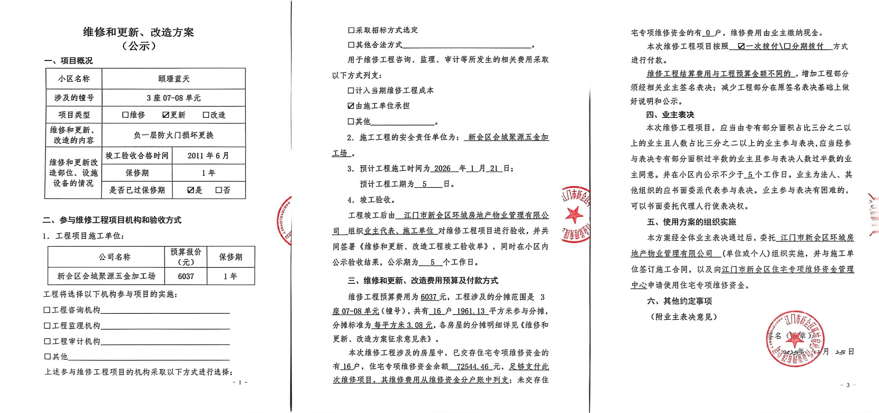 <td VALIGN="top" VALUES="" STYLE="border-width:0" BINDTYPE="0" ROWSPAN="17" COLSPAN="7" DATASOURCE="投票结果" ><font style=" font-family:方正小标宋简体;font-size:14pt;"><p style="line-height: 1.75em;"><span style="font-family: 宋体, SimSun;">各位尊敬的业主:</span><br/></p><p style="text-indent: 2em; line-height: 1.75em;"><span style="font-family: 宋体, SimSun;">根据法律法规的规定,本小区业主利用“江门市物业事项表决管理系统”已对本小区公共事务决策事项(<span style="font-family: 宋体; text-indent: 32px;">会城侨光北路11号颐璟蓝天3座07-08单元负一层防火门更换使用维修资金的投票</span>)进行了表决,在经过7日的询异公示期后,未收到业主有效的异议。现将投票结果公告,并就产生的法律效力说明如下:</span></p><p style="line-height: 1.75em; text-indent: 0em;"><strong style="text-indent: 2em;"><span style="font-family: 宋体, SimSun;">一、投票范围</span></strong></p><p style="text-indent: 2em; line-height: 1.75em;"><span style="font-family: 宋体, SimSun;">颐璟蓝天颐璟蓝天二期3座</span></p><p style="text-indent: 2em; line-height: 1.75em;"><span style="font-family: 宋体, SimSun;">总人数(专有部分人数之和):16</span></p><p style="text-indent: 2em; line-height: 1.75em;"><span style="font-family: 宋体, SimSun;"><span style="font-family: 宋体, SimSun; text-indent: 32px;"><span style="font-family: 宋体; text-indent: 32px;"><span style="font-family: 宋体; text-indent: 32px;">总户数:16</span></span></span></span></p><p style="text-indent: 2em; line-height: 1.75em;"><span style="font-family: 宋体, SimSun;">建筑物总面积(专有部分面积之和):1961.13㎡</span></p><p style="line-height: 1.75em;"><strong><span style="font-family: 宋体, SimSun;">二、投票结果公告时间</span></strong></p><p style="text-indent: 2em; line-height: 1.75em;"><span style="font-family: 宋体, SimSun;"><span style="font-family: 宋体, SimSun; text-indent: 32px;">从2026年03月25日开始</span></span></p><p style="line-height: 1.75em;"><strong><span style="font-family: 宋体, SimSun;">三、计票规则</span></strong></p><p style="text-indent: 2em; line-height: 1.75em;"><span style="font-family: 宋体, SimSun;">表决事项:使用建筑物及其附属设施的维修资金<br /><p style='font-family: 宋体, SimSun;line-height: 1.75em; text-indent: 2em;'>计票规则:弃权票不并入其它项&nbsp;&nbsp;&nbsp;&nbsp;未表决票不并入其它项</p></span></p><p style="line-height: 1.75em;"><strong><span style="font-family: 宋体, SimSun;">四、通过规则</span></strong></p><p style="line-height: 1.75em;"><strong><span style="font-family: 宋体, SimSun;">&nbsp; 根据《中华人民共和国民法典》第二百七十八条规定:业主共同决定事项,应当由专有部分面积占比三分之二以上的业主且人数占比三分之二以上的业主参与表决。</span></strong></p><p style="text-indent: 2em; line-height: 1.75em;"><span style="font-family: 宋体, SimSun;"><span style="font-family: 宋体, SimSun; text-indent: 32px;">表决事项:使用建筑物及其附属设施的维修资金<br /><p style='font-family: 宋体, SimSun;line-height: 1.75em; text-indent: 2em;'>通过规则:双2/3以上参与表决,参与表决双过半同意</p></span></span></p><p style="line-height: 1.75em;"><strong><span style="font-family: 宋体, SimSun;">五、投票结果</span></strong></p><p style="line-height: 1.75em; text-indent: 2em;"><span style="font-family: 宋体, SimSun; text-indent: 2em;"><div id='resultTable'><table style='table-layout: fixed; font-size:12px; margin-top:10px' width='100%' border='0' cellspacing='0' cellpadding='0'><tr><td height='28' colspan='10' align='center' style='border: 1px solid #666'><strong style='font-size: 14px;'> 使用建筑物及其附属设施的维修资金</strong></td> </tr><tr id='trfirst'><td height='28' colspan='4' style='border-left: 1px solid #666; border-bottom: 1px solid #666'><strong>&nbsp;申报单位:</strong> 新会区环城房地产物业管理有限公司</td><td colspan='3' style='border-left: 1px solid #666; border-bottom: 1px solid #666'><strong>&nbsp;联系方式:</strong> </td><td colspan='3' style='border-left: 1px solid #666; border-bottom: 1px solid #666; border-right: 1px solid #666'><strong>&nbsp;申报日期:</strong> 2025年12月25日 </td></tr><tr> <td height='28' colspan='5' style='border-left: 1px solid #666; border-bottom: 1px solid #666'><strong>&nbsp;列支总人数(专有部分人数之和):</strong>16人 </td><td colspan='5' style='border-left: 1px solid #666; border-bottom: 1px solid #666; border-right: 1px solid #666'><strong>&nbsp;列支建筑物总面积(专有部分面积之和):</strong>1961.13㎡ </td> </tr><tr><td height='28' colspan='10' bgcolor='#F3F3F3' style='border-left: 1px solid #666;border-bottom: 1px solid #666;border-right: 1px solid #666'><strong>&nbsp;参与表决人数及面积统计</strong></td></tr><tr><td height='28' colspan='5' style='border-left: 1px solid #666; border-bottom: 1px solid #666'><strong>&nbsp;参与表决人数:</strong>12人</td><td colspan='5' style='border-left: 1px solid #666; border-bottom: 1px solid #666; border-right: 1px solid #666'><strong>&nbsp;参与表决人数占总人数比例:</strong>75.00%</td></tr><tr><td height='28' colspan='5' style='border-left: 1px solid #666; border-bottom: 1px solid #666'><strong>&nbsp;参与表决面积:</strong>1508.88㎡</td><td colspan='5' style='border-left: 1px solid #666; border-bottom: 1px solid #666; border-right: 1px solid #666'><strong>&nbsp;参与表决面积占总面积比例:</strong>76.94%</td></tr><tr><td height='28' colspan='10' bgcolor='#F3F3F3' style='border-left: 1px solid #666; border-bottom: 1px solid #666;border-right: 1px solid #666'> <strong>&nbsp;参与表决同意人数及面积统计</strong></td> </tr><tr><td height='28' colspan='5' style='border-lef