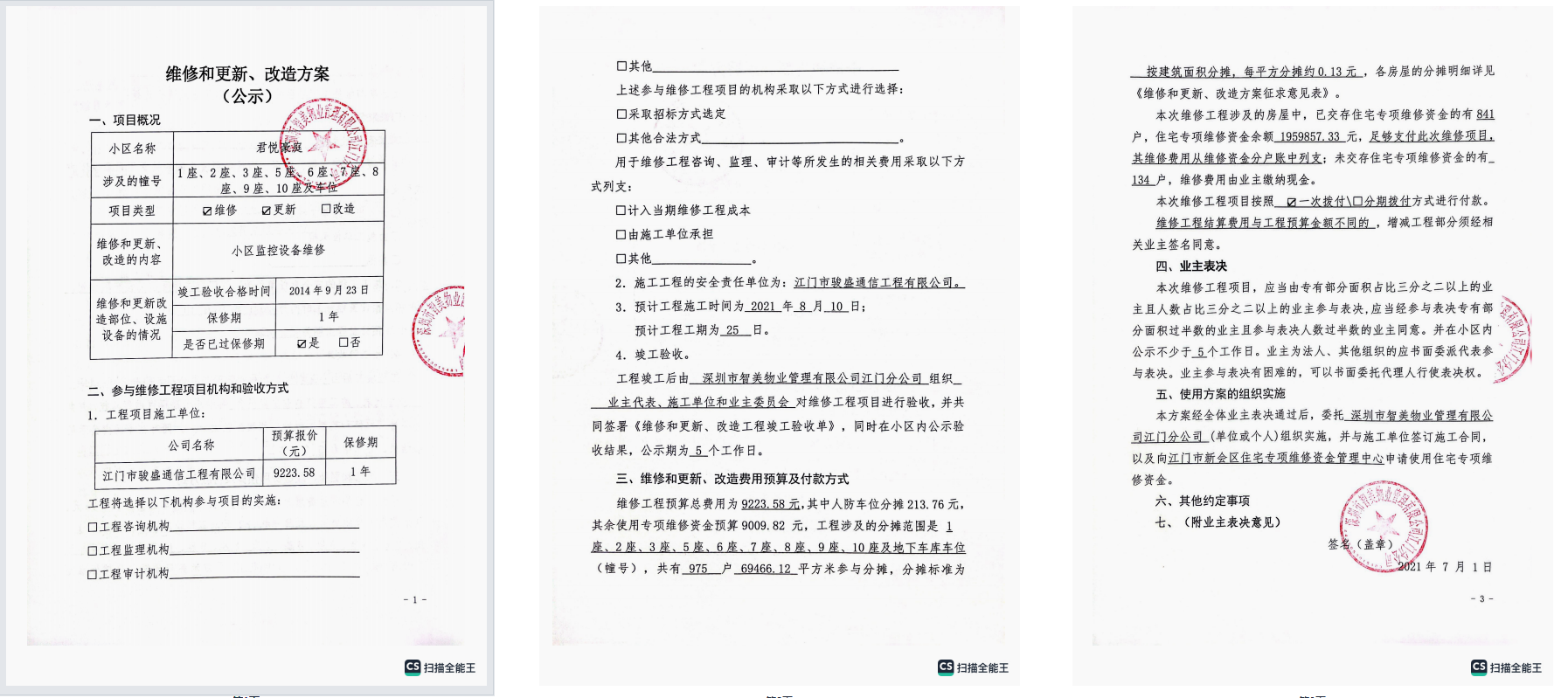 <td valign="top" values="" style="border-width:0" bindtype="0" rowspan="17" colspan="7" datasource="投票结果"><font style=" font-family:方正小标宋简体;font-size:14pt;"><p style="line-height: 1.75em;"><span style="font-family: 宋体, SimSun;">各位尊敬的业主:</span><br></p><p style="text-indent: 2em; line-height: 1.75em;"><span style="font-family: 宋体, SimSun;">根据法律法规的规定,本小区业主利用“物业公共事务决策系统”已对本小区公共事务决策事项进行了表决,在经过7日的询异公示期后,未收到业主有效的异议。现将投票结果公告,并就产生的法律效力说明如下:</span></p><p style="line-height: 1.75em; text-indent: 0em;"><strong style="text-indent: 2em;"><span style="font-family: 宋体, SimSun;">一、投票范围</span></strong></p><p style="text-indent: 2em; line-height: 1.75em;"><span style="font-family: 宋体, SimSun;">君悦豪庭君悦豪庭10座、君悦豪庭1座、君悦豪庭2座、君悦豪庭3座、君悦豪庭5座、君悦豪庭6座、君悦豪庭7座、君悦豪庭8座、君悦豪庭9座、君悦豪庭车位</span></p><p style="text-indent: 2em; line-height: 1.75em;"><span style="font-family: 宋体, SimSun;">总人数(专有部分人数之和):529</span></p><p style="text-indent: 2em; line-height: 1.75em;"><span style="font-family: 宋体, SimSun;"><span style="font-family: 宋体, SimSun; text-indent: 32px;">总户数:975</span></span></p><p style="text-indent: 2em; line-height: 1.75em;"><span style="font-family: 宋体, SimSun;">建筑物总面积(专有部分面积之和):69466.07㎡</span></p><p style="line-height: 1.75em;"><strong><span style="font-family: 宋体, SimSun;">二、投票起止时间</span></strong></p><p style="text-indent: 2em; line-height: 1.75em;"><span style="font-family: 宋体, SimSun;">投票表决时间:从2023年05月22日到2023年08月31日止</span></p><p style="text-indent: 2em; line-height: 1.75em;"><span style="font-family: 宋体, SimSun;">投票询异公示时间:从2023年09月01日开始</span></p><p style="text-indent: 2em; line-height: 1.75em;"><span style="font-family: 宋体, SimSun;">投票结果通知公告时间:从2023年09月08日开始</span></p><p style="line-height: 1.75em;"><strong><span style="font-family: 宋体, SimSun;">三、计票规则</span></strong></p><p style="text-indent: 2em; line-height: 1.75em;"><span style="font-family: 宋体, SimSun;">表决事项:使用建筑物及其附属设施的维修资金<br></span></p><p style="font-family: 宋体, SimSun;line-height: 1.75em; text-indent: 2em;">计票规则:弃权票不并入其它项 未表决票不并入其它项</p><p></p><p style="line-height: 1.75em;"><strong><span style="font-family: 宋体, SimSun;">四、通过规则</span></strong></p><p style="text-indent: 2em; line-height: 1.75em;"><span style="font-family: 宋体, SimSun;"><span style="font-family: 宋体, SimSun; text-indent: 32px;">表决事项:使用建筑物及其附属设施的维修资金<br></span></span></p><p style="font-family: 宋体, SimSun;line-height: 1.75em; text-indent: 2em;">通过规则:参与表决专有部分面积过半数的业主且参与表决人数过半数的业主同意</p><p></p><p style="line-height: 1.75em;"><strong><span style="font-family: 宋体, SimSun;">五、投票结果</span></strong></p><p style="line-height: 1.75em; text-indent: 2em;"><span style="font-family: 宋体, SimSun; text-indent: 2em;"></span></p><div id="resultTable"><table style="table-layout: fixed; font-size:12px; margin-top:10px" width="100%" border="0" cellspacing="0" cellpadding="0"><tbody><tr><td height="28" colspan="10" align="center" style="border: 1px solid #666"><strong style="font-size: 14px;"> 使用建筑物及其附属设施的维修资金</strong></td> </tr><tr id="trfirst"><td height="28" colspan="4" style="border-left: 1px solid #666; border-bottom: 1px solid #666"><strong> 申报单位:</strong> 深圳市智美物业管理有限公司江门分公司</td><td colspan="3" style="border-left: 1px solid #666; border-bottom: 1px solid #666"><strong> 联系方式:</strong> </td><td colspan="3" style="border-left: 1px solid #666; border-bottom: 1px solid #666; border-right: 1px solid #666"><strong> 申报日期:</strong> 2023年5月22日 </td></tr><tr> <td height="28" colspan="5" style="border-left: 1px solid #666; border-bottom: 1px solid #666"><strong> 总人数(专有部分人数之和):</strong>529人 </td><td colspan="5" style="border-left: 1px solid #666; border-bottom: 1px solid #666; border-right: 1px solid #666"><strong> 建筑物总面积(专有部分面积之和):</strong>69466.07㎡ </td> </tr><tr><td height="28" colspan="10" bgcolor="#F3F3F3" style="border-left: 1px solid #666;border-bottom: 1px solid #666;border-right: 1px solid #666"><strong> 参与人数及面积统计</strong></td></tr><tr><td height="28" colspan="5" style="border-left: 1px solid #666; border-bottom: 1px solid #666"><strong> 参与表决专有部分人数之和:</strong>363人</td><td colspan="5" style="border-left: 1px solid #666; border-bottom: 1px solid #666; border-right: 1px solid #666"><strong> 参与表决占有表决权总人数比例:</strong>68.62%</td></tr><tr><td height="28" colspan="5" style="border-left: 1px solid #666; border-bottom: 1px solid #666"><strong> 参与表决专有部分面积之和:</strong>48711.98㎡</td><td colspan="5" style="border-left: 1px solid #666; border-bottom: 1px solid #666; border-right: 1px solid #666"><strong> 参与表决占有表决权总面积比例:</strong>70.12%</td></tr><tr><td height="28" colspan="10" bgcolor="#F3F3F3" style="border-left: 1px solid #666; border-bottom: 1px solid #666;border-right: 1px solid #666"> <strong> 未参与人数及面积统计</strong></td> </tr><tr><td height="28" colspan="5" style="border-left: 1px solid #666; border-bottom: 1px solid #666"><strong> 未参与表决专有部分人数之和:</strong>166人 </td><td colspan="5" style="border-