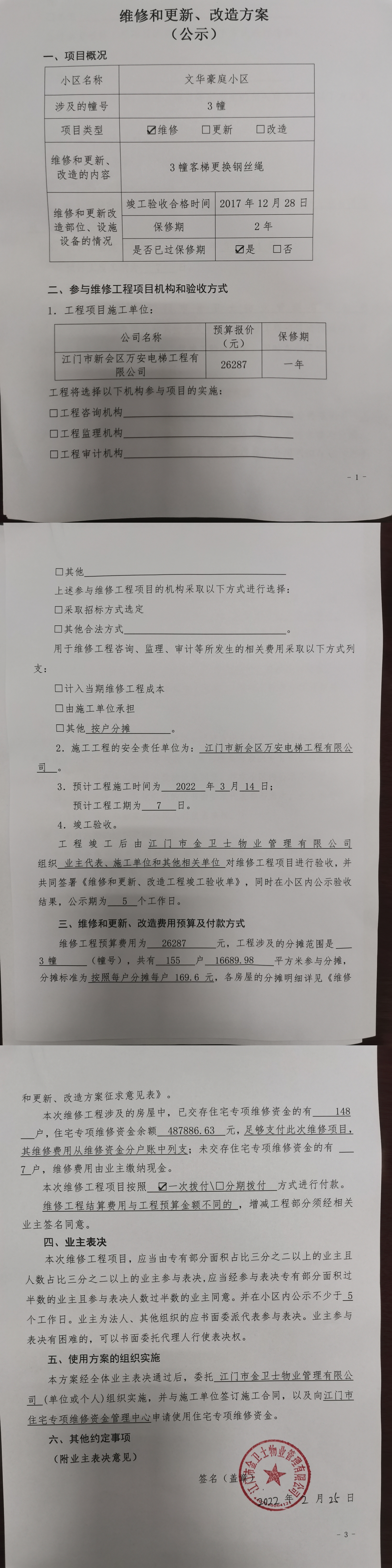 <td VALIGN="top" VALUES="" STYLE="border-width:0" BINDTYPE="0" ROWSPAN="19" COLSPAN="7" DATASOURCE="投票结果" ><font style="font-size:14pt;"><p style="text-align: left; font-family: 宋体; font-size: 16px; line-height: 1.75em;"><span style="font-family: 宋体;">文华豪庭江海区礼乐文华豪庭3幢全体业主:</span></p><p style="text-align: left; font-family: 宋体; font-size: 16px; line-height: 1.75em; text-indent: 2em;">本小区关于文华豪庭3幢客梯更换钢丝绳使用维修资金投票的投票已表决结束,询异时间从2022年03月25日开始,投票询异公示期间,业主可通过微信查询自己的表决情况或可凭身份证件赴发起机构申请查询自己的表决情况;如公示的业主表决情况与在服务平台查询的本人表决意见不一致的,可以以书面形式向发起机构核查。经核查业主反映情况属实的,发起机构应当予以纠正并重新公示表决结果。</p><p><br/></p><p style="text-align: left; font-family: 宋体; font-size: 16px; line-height: 1.75em;"><strong><span style="font-family: 宋体">附件:</span></strong></p><p style="text-align: left; font-family: 宋体; font-size: 16px; line-height: 1.75em;"><strong>一、投票范围</strong></p><p style="text-align: left; font-family: 宋体; font-size: 16px; line-height: 1.75em; text-indent: 2em;">文华豪庭江海区礼乐文华豪庭3幢</p><p style="text-align: left; font-family: 宋体; font-size: 16px; line-height: 1.75em; text-indent: 2em;">总人数(专有部分人数之和):148</p><p style="text-align: left; font-family: 宋体; font-size: 16px; line-height: 1.75em; text-indent: 2em;">建筑物总面积(专有部分面积之和):16698.89㎡</p><p style="text-align: left; font-family: 宋体; font-size: 16px; line-height: 1.75em;"><strong>二、投票起止时间</strong></p><p dir="ltr" style="text-align: left; font-family: 宋体; font-size: 16px; line-height: 1.75em; text-indent: 2em;">投票表决时间:从2022年03月01日到2022年03月24日止</p><p dir="ltr" style="text-align: left; font-family: 宋体; font-size: 16px; line-height: 1.75em; text-indent: 2em;">投票询异公示时间:从2022年03月25日开始</p><p dir="ltr" style="text-align: left; font-family: 宋体; font-size: 16px; line-height: 1.75em; text-indent: 2em;">投票结果通知公告时间:从2022年04月01日开始<br/></p><p style="text-align: left; font-family: 宋体; font-size: 16px; line-height: 1.75em;"><strong>三、投票详细描述</strong></p><p style="text-align: left; font-family: 宋体; font-size: 16px; line-height: 1.75em; text-indent: 2em;"><p style="margin-left:0;text-indent:0;line-height:25px;background:white"><span style="font-size:14px;font-family:宋体;color:black">一、</span><span style="font-size:14px;font-family:宋体;color:black;background:white">文华豪庭3幢因电梯钢丝绳断开导致该电梯现在不能使用,该幢房屋竣工验收日期是2018年6月30日,设备验收时间为2017年12月28日,保修期是2年,已过保修期。现需申请使用维修资金对天文华豪庭3幢客梯钢丝绳进行更换,工程维修预算金额为 26287元,项目最终费用以施工合同签订金额为准。维修费用的分摊标准为按分户分摊,共155户,每户分摊169.6元&nbsp;,详见公示附件。</span></p><p style="margin-left:0;text-indent:0;line-height:25px;background:white"><span style="font-size:14px;font-family:宋体;color:black">二、</span><span style="font-size:14px;font-family:宋体;color:black;background:white">本次投票以微信电子投票为主,书面表决投票作补充投票的方式,同一户出现微信电子投票和书面表决投票同时存在情况的,以该住户的微信电子投票为准计入表决统计数。如业主手机不能正常通过微信投票,请联系物业公司进行线下纸质投票,电话0750-3610608</span></p><p><br/></p></p><p style="text-align: left; font-family: 宋体; font-size: 16px; line-height: 1.75em;"><strong>四、计票规则</strong></p><p style="text-align: left; font-family: 宋体; font-size: 16px; line-height: 1.75em; text-indent: 2em;">表决事项:使用建筑物及其附属设施的维修资金<br /><p style='text-align: left; font-family: 宋体; font-size: 16px; line-height: 1.75em; text-indent: 2em;'>计票规则:弃权票不并入其它项&nbsp;&nbsp;&nbsp;&nbsp;未表决票不并入其它项</p></p><p style="text-align: left; font-family: 宋体; font-size: 16px; line-height: 1.75em;"><strong>五、通过规则</strong></p><p style="text-align: left; font-family: 宋体; font-size: 16px; line-height: 1.75em; text-indent: 2em;"><span style="font-family: 宋体; text-indent: 32px;">表决事项:使用建筑物及其附属设施的维修资金<br /><p style='text-align: left; font-family: 宋体; font-size: 16px; line-height: 1.75em; text-indent: 2em;'>通过规则:参与表决专有部分面积过半数的业主且参与表决人数过半数的业主同意</p></span></p><p style="text-align: left; font-family: 宋体; font-size: 16px; line-height: 1.75em;"><strong>六、投票结果</strong></p><p style="text-align: left; font-family: 宋体; font-size: 16px; line-height: 1.75em; text-indent: 2em;"><div id='resultTable'><table style='table-layout: fixed; font-size:12px; margin-top:10px' width='100%' border='0' cellspacing='0' cellpadding='0'><tr><td height='28' colspan='10' align='center' style='border: 1px solid #666'><strong style='font-size: 14px;'> 使用建筑物及其附属设施的维修资金</strong></td> </tr><tr id='trfirst'><td height='28' colspan='4' style='border-left: 1px solid #666; border-bottom: 1px solid #666'><strong>&nbsp;申报单位:</strong> 江门市金卫士物业管理有限公司</td><td colspan='3' style='border-left: 1px solid #666; border-bottom: 1px solid #666'><strong>&nbsp;联系方式:</strong> 3610608 </td><td colspan='3' style='border-left: 1px solid #666; border-bottom: 1px solid #666; border-right: 1px sol