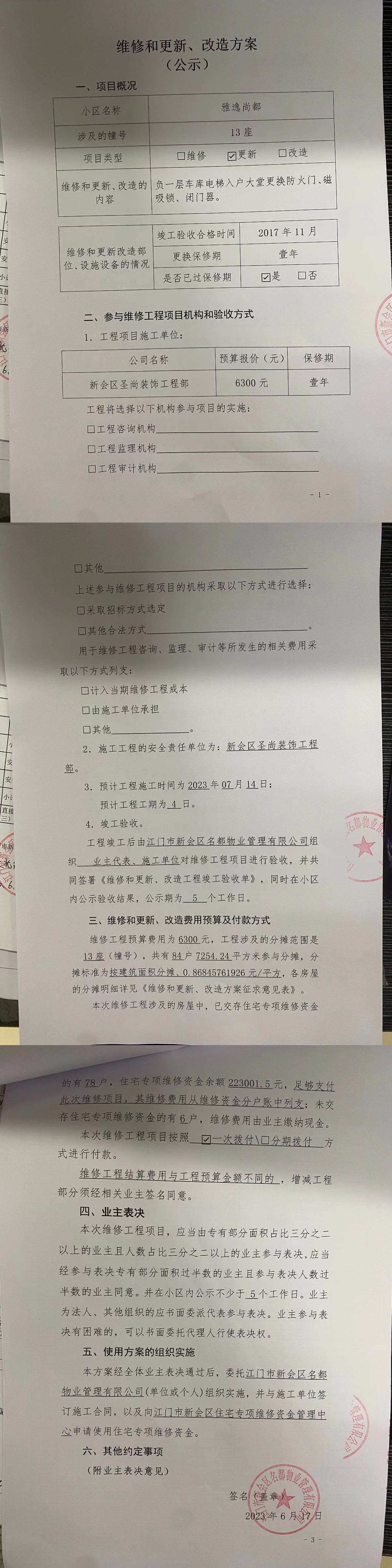 <td valign="top" values="" style="border-width:0" bindtype="0" rowspan="17" colspan="7" datasource="投票结果"><font style=" font-family:方正小标宋简体;font-size:14pt;"><p style="line-height: 1.75em;"><span style="font-family: 宋体, SimSun;">各位尊敬的业主:</span><br></p><p style="text-indent: 2em; line-height: 1.75em;"><span style="font-family: 宋体, SimSun;">根据法律法规的规定,本小区业主利用“物业公共事务决策系统”已对本小区公共事务决策事项进行了表决,在经过7日的询异公示期后,未收到业主有效的异议。现将投票结果公告,并就产生的法律效力说明如下:</span></p><p style="line-height: 1.75em; text-indent: 0em;"><strong style="text-indent: 2em;"><span style="font-family: 宋体, SimSun;">一、投票范围</span></strong></p><p style="text-indent: 2em; line-height: 1.75em;"><span style="font-family: 宋体, SimSun;">雅逸尚都雅逸尚都13座</span></p><p style="text-indent: 2em; line-height: 1.75em;"><span style="font-family: 宋体, SimSun;">总人数(专有部分人数之和):84</span></p><p style="text-indent: 2em; line-height: 1.75em;"><span style="font-family: 宋体, SimSun;"><span style="font-family: 宋体, SimSun; text-indent: 32px;">总户数:84</span></span></p><p style="text-indent: 2em; line-height: 1.75em;"><span style="font-family: 宋体, SimSun;">建筑物总面积(专有部分面积之和):7254.24㎡</span></p><p style="line-height: 1.75em;"><strong><span style="font-family: 宋体, SimSun;">二、投票起止时间</span></strong></p><p style="text-indent: 2em; line-height: 1.75em;"><span style="font-family: 宋体, SimSun;">投票表决时间:从2023年06月19日到2023年07月14日止</span></p><p style="text-indent: 2em; line-height: 1.75em;"><span style="font-family: 宋体, SimSun;">投票询异公示时间:从2023年07月15日开始</span></p><p style="text-indent: 2em; line-height: 1.75em;"><span style="font-family: 宋体, SimSun;">投票结果通知公告时间:从2023年07月22日开始</span></p><p style="line-height: 1.75em;"><strong><span style="font-family: 宋体, SimSun;">三、计票规则</span></strong></p><p style="text-indent: 2em; line-height: 1.75em;"><span style="font-family: 宋体, SimSun;">表决事项:使用建筑物及其附属设施的维修资金<br></span></p><p style="font-family: 宋体, SimSun;line-height: 1.75em; text-indent: 2em;">计票规则:弃权票不并入其它项 未表决票不并入其它项</p><p></p><p style="line-height: 1.75em;"><strong><span style="font-family: 宋体, SimSun;">四、通过规则</span></strong></p><p style="text-indent: 2em; line-height: 1.75em;"><span style="font-family: 宋体, SimSun;"><span style="font-family: 宋体, SimSun; text-indent: 32px;">表决事项:使用建筑物及其附属设施的维修资金<br></span></span></p><p style="font-family: 宋体, SimSun;line-height: 1.75em; text-indent: 2em;">通过规则:参与表决专有部分面积过半数的业主且参与表决人数过半数的业主同意</p><p></p><p style="line-height: 1.75em;"><strong><span style="font-family: 宋体, SimSun;">五、投票结果</span></strong></p><p style="line-height: 1.75em; text-indent: 2em;"><span style="font-family: 宋体, SimSun; text-indent: 2em;"></span></p><div id="resultTable"><table style="table-layout: fixed; font-size:12px; margin-top:10px" width="100%" border="0" cellspacing="0" cellpadding="0"><tbody><tr><td height="28" colspan="10" align="center" style="border: 1px solid #666"><strong style="font-size: 14px;"> 使用建筑物及其附属设施的维修资金</strong></td> </tr><tr id="trfirst"><td height="28" colspan="4" style="border-left: 1px solid #666; border-bottom: 1px solid #666"><strong> 申报单位:</strong> 江门市新会区名都物业管理有限公司</td><td colspan="3" style="border-left: 1px solid #666; border-bottom: 1px solid #666"><strong> 联系方式:</strong> 6609908 </td><td colspan="3" style="border-left: 1px solid #666; border-bottom: 1px solid #666; border-right: 1px solid #666"><strong> 申报日期:</strong> 2023年6月19日 </td></tr><tr> <td height="28" colspan="5" style="border-left: 1px solid #666; border-bottom: 1px solid #666"><strong> 总人数(专有部分人数之和):</strong>84人 </td><td colspan="5" style="border-left: 1px solid #666; border-bottom: 1px solid #666; border-right: 1px solid #666"><strong> 建筑物总面积(专有部分面积之和):</strong>7254.24㎡ </td> </tr><tr><td height="28" colspan="10" bgcolor="#F3F3F3" style="border-left: 1px solid #666;border-bottom: 1px solid #666;border-right: 1px solid #666"><strong> 参与人数及面积统计</strong></td></tr><tr><td height="28" colspan="5" style="border-left: 1px solid #666; border-bottom: 1px solid #666"><strong> 参与表决专有部分人数之和:</strong>39人</td><td colspan="5" style="border-left: 1px solid #666; border-bottom: 1px solid #666; border-right: 1px solid #666"><strong> 参与表决占有表决权总人数比例:</strong>46.43%</td></tr><tr><td height="28" colspan="5" style="border-left: 1px solid #666; border-bottom: 1px solid #666"><strong> 参与表决专有部分面积之和:</strong>3421.86㎡</td><td colspan="5" style="border-left: 1px solid #666; border-bottom: 1px solid #666; border-right: 1px solid #666"><strong> 参与表决占有表决权总面积比例:</strong>47.17%</td></tr><tr><td height="28" colspan="10" bgcolor="#F3F3F3" style="border-left: 1px solid #666; border-bottom: 1px solid #666;border-right: 1px solid #666"> <strong> 未参与人数及面积统计</strong></td> </tr><tr><td height="28" colspan="5" style="border-left: 1px solid #666; border-bottom: 1px solid #666"><strong> 未参与表决专有部分人数之和:</strong>45人 </td><td colspan="5" style="border-left: 1px solid #666; border-bottom: 1px solid #666; border-right: 1px solid #666"><strong> 未参与表决占有表决权总人数比例:</strong>53.57%</td></tr><tr><td height="