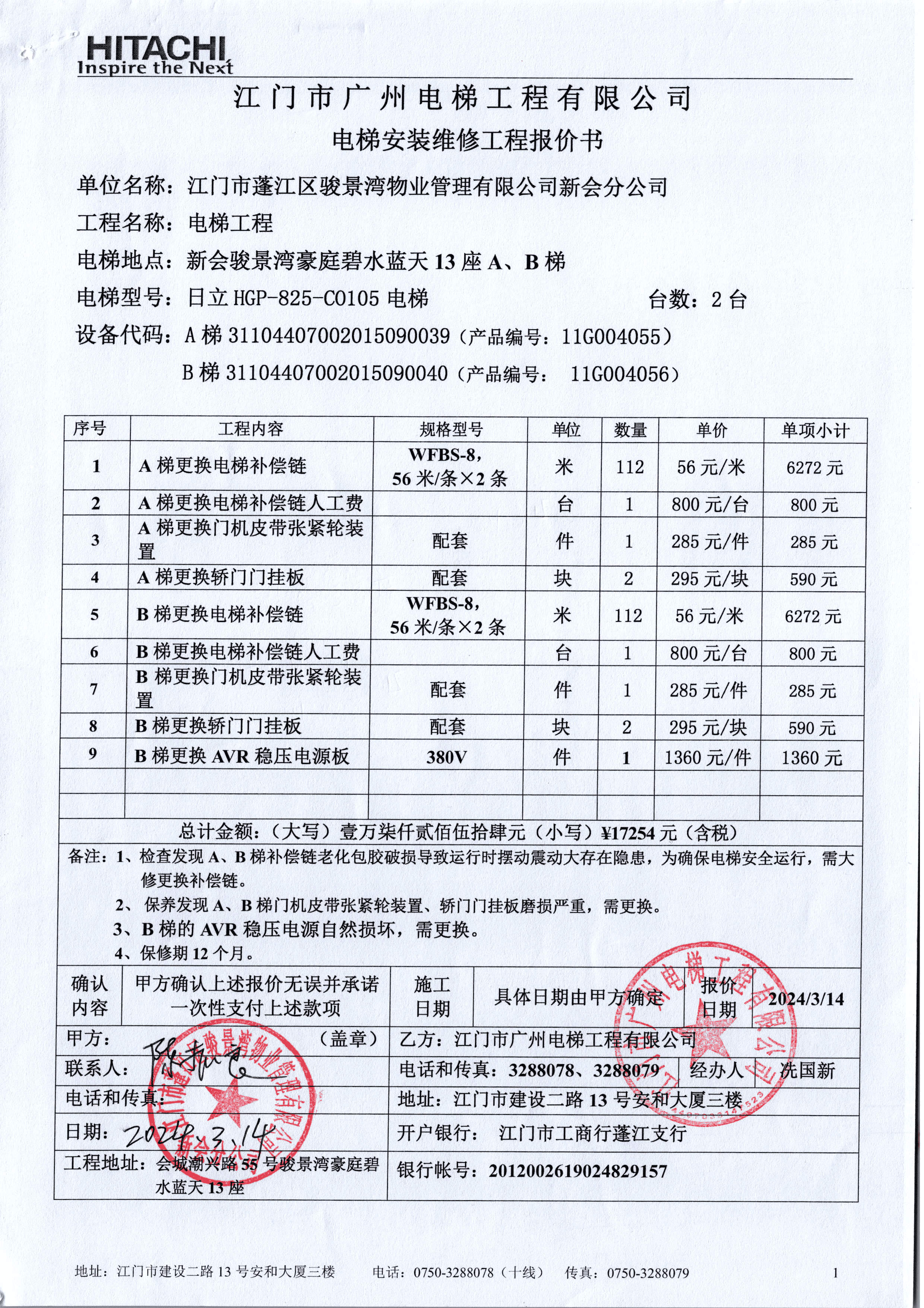 <td VALIGN="top" VALUES="" STYLE="border-width:0" BINDTYPE="0" ROWSPAN="19" COLSPAN="7" DATASOURCE="投票结果" ><font style="font-size:14pt;"><p style="white-space: normal; font-family: 宋体; line-height: 1.75em;">新会骏景湾豪庭碧水蓝天13座全体业主:</p><p style="white-space: normal; font-family: 宋体; line-height: 1.75em; text-indent: 2em;">本小区关于新会骏景湾豪庭碧水蓝天13座AB电梯更换补偿链、门机皮带张紧轮装置、轿门门挂板;B梯更换AVR电源板使用维修资金的投票的投票已表决结束,询异时间从2024年04月17日开始,投票询异公示期间,业主可通过微信查询自己的表决情况或可凭身份证件申请查询自己的表决情况;如公示的业主表决情况与查询的本人表决意见不一致的,可以以书面形式向投票组织机构申诉,投票组织机构予以纠正并重新公示表决结果。异议提出人对投票组织机构的处理仍有异议的,可以向街道办事处(镇人民政府)反映处理,涉及住宅专项维修资金的,可向属地住宅专项维修资金管理中心反映处理。</p><p style="white-space: normal;"><br/></p><p style="white-space: normal; font-family: 宋体; line-height: 1.75em;"><strong>附件:</strong></p><p style="white-space: normal; font-family: 宋体; line-height: 1.75em;"><strong>一、投票范围</strong></p><p style="white-space: normal; font-family: 宋体; line-height: 1.75em; text-indent: 2em;">新会骏景湾豪庭碧水蓝天13座</p><p style="white-space: normal; font-family: 宋体; line-height: 1.75em; text-indent: 2em;">总人数(专有部分人数之和):64</p><p style="white-space: normal; font-family: 宋体; line-height: 1.75em; text-indent: 2em;"><span style="font-family: 宋体, SimSun;"><span style="font-family: 宋体; text-indent: 32px;"><span style="font-family: 宋体; text-indent: 32px;">总户数:64</span></span></span></p><p style="white-space: normal; font-family: 宋体; line-height: 1.75em; text-indent: 2em;">建筑物总面积(专有部分面积之和):6834.44㎡</p><p style="white-space: normal; font-family: 宋体; line-height: 1.75em;"><strong>二、询异公示起止时间</strong></p><p dir="ltr" style="white-space: normal; font-family: 宋体; line-height: 1.75em; text-indent: 2em;"><span style="text-indent: 36px;">2024年04月17日至2024年04月23日</span></p><p style="white-space: normal; font-family: 宋体; line-height: 1.75em;"><strong>三、投票详细描述</strong></p><p style="white-space: normal; font-family: 宋体; line-height: 1.75em; text-indent: 2em;"><p> 新会骏景湾豪庭碧水蓝天13座的AB梯日常运行时出现异响,经检查,是由于AB补偿链老化包胶破损导致运行时摆动震动大存在隐患,为确保电梯安全运行,需大修更换补偿链。B梯AVR稳压电源板在使用过程中自然损坏,需更换。保养发现AB梯门机皮带张紧轮装置、轿门门挂板磨损严重,需更换。</p><p> 现对碧水蓝天13座AB梯进行维修,工程维修预算金额为17254元,项目最终费用以施工合同签订金额为准。因已过保修期,维修费用由相关业主按建筑面积分摊,每平方约2.52456675元,详见公示附件。如业主手机不能正常通过微信投票,请联系物业公司进行线下纸质投票,物业电话:0750-6179992。</p><p><br/></p></p><p style="white-space: normal; font-family: 宋体; line-height: 1.75em;"><strong>四、计票规则</strong></p><p style="white-space: normal; font-family: 宋体; line-height: 1.75em; text-indent: 2em;">表决事项:使用建筑物及其附属设施的维修资金<br /><p style='text-align: left; font-family: 宋体; font-size: 16px; line-height: 1.75em; text-indent: 2em;'>计票规则:弃权票不并入其它项 未表决票不并入其它项</p></p><p style="white-space: normal; font-family: 宋体; line-height: 1.75em;"><strong>五、通过规则</strong></p><p style="white-space: normal; font-family: 宋体; line-height: 1.75em;"><strong><strong style="white-space: normal;"><span style="font-family: 宋体, SimSun;"> 根据《中华人民共和国民法典》第二百七十八条规定:业主共同决定事项,应当由专有部分面积占比三分之二以上的业主且人数占比三分之二以上的业主参与表决。</span></strong></strong></p><p style="white-space: normal; font-family: 宋体; line-height: 1.75em; text-indent: 2em;">表决事项:使用建筑物及其附属设施的维修资金<br /><p style='text-align: left; font-family: 宋体; font-size: 16px; line-height: 1.75em; text-indent: 2em;'>通过规则:双2/3以上参与表决,参与表决双过半同意</p></p><p style="white-space: normal; font-family: 宋体; line-height: 1.75em;"><strong>六、投票结果</strong></p><p style="white-space: normal; font-family: 宋体; line-height: 1.75em; text-indent: 2em;"><div id='resultTable'><table style='table-layout: fixed; font-size:12px; margin-top:10px' width='100%' border='0' cellspacing='0' cellpadding='0'><tr><td height='28' colspan='10' align='center' style='border: 1px solid #666'><strong style='font-size: 14px;'> 使用建筑物及其附属设施的维修资金</strong></td> </tr><tr id='trfirst'><td height='28' colspan='4' style='border-left: 1px solid #666; border-bottom: 1px solid #666'><strong> 申报单位:</strong> 江门市蓬江区骏景湾物业管理有限公司新会分公司</td><td colspan='3' style='border-left: 1px solid #666; border-bottom: 1px solid #666'><strong> 联系方式:</strong> </td><td colspan='3' style='border-left: 1px solid #666; border-bottom: 1px solid #666; border-right: 1px solid #666'><strong> 申报日期:</strong> 2024年3月18日 </td></tr><tr> <td height='28' colspan='5' style='border-left: 1px solid #666; border-bottom: 1px solid #666'><strong> 总人数(专有部分人数之和):</strong>64人 </td><td colspan='5' style='border-left: 1px solid #666; border-bottom: 1px solid #666; border-right: 1px solid #66