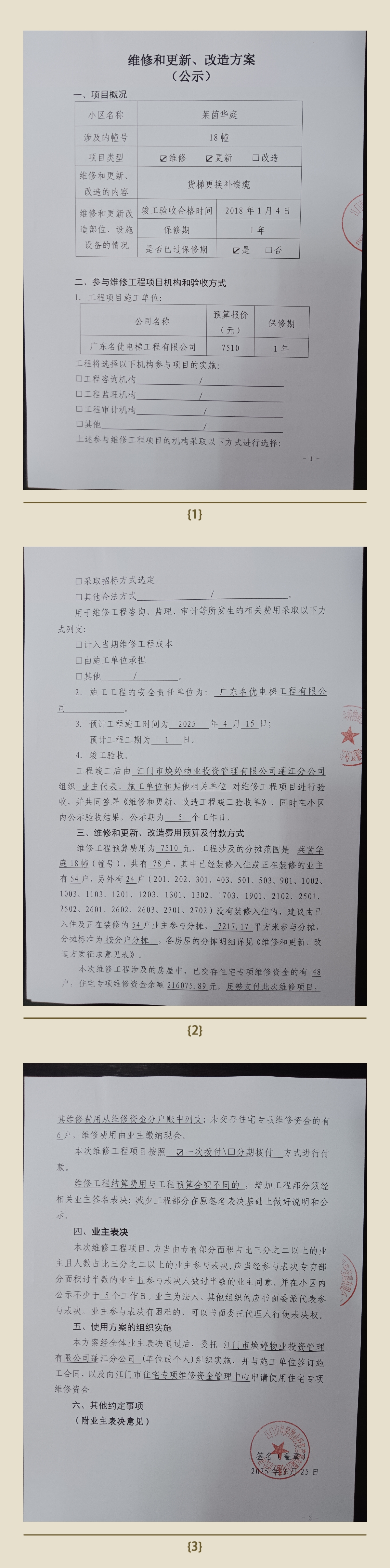 <td VALIGN="top" VALUES="" STYLE="border-width:0" BINDTYPE="0" ROWSPAN="19" COLSPAN="7" DATASOURCE="投票结果" ><font style="font-size:14pt;"><p style="white-space: normal; font-family: 宋体; line-height: 1.75em;">莱茵华庭蓬江区莱茵华庭18幢全体业主:</p><p style="white-space: normal; font-family: 宋体; line-height: 1.75em; text-indent: 2em;">本小区关于莱茵华庭小区18幢货梯更换补偿缆使用维修资金的投票的投票已表决结束,询异时间从2025年04月30日开始,投票询异公示期间,业主可通过微信查询自己的表决情况或可凭身份证件申请查询自己的表决情况;如公示的业主表决情况与查询的本人表决意见不一致的,可以以书面形式向投票组织机构申诉,投票组织机构予以纠正并重新公示表决结果。异议提出人对投票组织机构的处理仍有异议的,可以向街道办事处(镇人民政府)反映处理,涉及住宅专项维修资金的,可向属地住宅专项维修资金管理中心反映处理。</p><p style="white-space: normal;"><br/></p><p style="white-space: normal; font-family: 宋体; line-height: 1.75em;"><strong>附件:</strong></p><p style="white-space: normal; font-family: 宋体; line-height: 1.75em;"><strong>一、投票范围</strong></p><p style="white-space: normal; font-family: 宋体; line-height: 1.75em; text-indent: 2em;">莱茵华庭蓬江区莱茵华庭18幢</p><p style="white-space: normal; font-family: 宋体; line-height: 1.75em; text-indent: 2em;">总人数(专有部分人数之和):54</p><p style="white-space: normal; font-family: 宋体; line-height: 1.75em; text-indent: 2em;"><span style="font-family: 宋体, SimSun;"><span style="font-family: 宋体; text-indent: 32px;"><span style="font-family: 宋体; text-indent: 32px;">总户数:54</span></span></span></p><p style="white-space: normal; font-family: 宋体; line-height: 1.75em; text-indent: 2em;">建筑物总面积(专有部分面积之和):7217.17㎡</p><p style="white-space: normal; font-family: 宋体; line-height: 1.75em;"><strong>二、询异公示起止时间</strong></p><p dir="ltr" style="white-space: normal; font-family: 宋体; line-height: 1.75em; text-indent: 2em;"><span style="text-indent: 36px;">2025年04月30日至2025年05月10日</span></p><p style="white-space: normal; font-family: 宋体; line-height: 1.75em;"><strong>三、投票详细描述</strong></p><p style="white-space: normal; font-family: 宋体; line-height: 1.75em; text-indent: 2em;"><p> 小区18幢的货梯在电梯维保人员对电梯补偿缆进行专项检查时发现18幢货梯补偿缆(右侧)老化,有开裂现象;电梯暂时还可以使用,但开裂的位置在运行时容易发生折曲导致补偿缆会折断,引致其它零部件损坏和困人故障,需要更换电梯补偿缆才能保障电梯的正常运行。</p><p> 现对18幢货梯进行维修,工程维修预算金额为7510元,项目最终费用以施工合同签订金额为准。因已过保修期,维修费用由相关业主按分户分摊,每户约139.08元,详见公示附件。如业主手机不能正常通过微信投票,请联系物业公司进行线下纸质投票,物业电话:0750-3212633。</p><p><br/></p></p><p style="white-space: normal; font-family: 宋体; line-height: 1.75em;"><strong>四、计票规则</strong></p><p style="white-space: normal; font-family: 宋体; line-height: 1.75em; text-indent: 2em;">表决事项:使用建筑物及其附属设施的维修资金<br /><p style='text-align: left; font-family: 宋体; font-size: 16px; line-height: 1.75em; text-indent: 2em;'>计票规则:弃权票不并入其它项 未表决票不并入其它项</p></p><p style="white-space: normal; font-family: 宋体; line-height: 1.75em;"><strong>五、通过规则</strong></p><p style="white-space: normal; font-family: 宋体; line-height: 1.75em;"><strong><strong style="white-space: normal;"><span style="font-family: 宋体, SimSun;"> 根据《中华人民共和国民法典》第二百七十八条规定:业主共同决定事项,应当由专有部分面积占比三分之二以上的业主且人数占比三分之二以上的业主参与表决。</span></strong></strong></p><p style="white-space: normal; font-family: 宋体; line-height: 1.75em; text-indent: 2em;">表决事项:使用建筑物及其附属设施的维修资金<br /><p style='text-align: left; font-family: 宋体; font-size: 16px; line-height: 1.75em; text-indent: 2em;'>通过规则:双2/3以上参与表决,参与表决双过半同意</p></p><p style="white-space: normal; font-family: 宋体; line-height: 1.75em;"><strong>六、投票结果</strong></p><p style="white-space: normal; font-family: 宋体; line-height: 1.75em; text-indent: 2em;"><div id='resultTable'><table style='table-layout: fixed; font-size:12px; margin-top:10px' width='100%' border='0' cellspacing='0' cellpadding='0'><tr><td height='28' colspan='10' align='center' style='border: 1px solid #666'><strong style='font-size: 14px;'> 使用建筑物及其附属设施的维修资金</strong></td> </tr><tr id='trfirst'><td height='28' colspan='4' style='border-left: 1px solid #666; border-bottom: 1px solid #666'><strong> 申报单位:</strong> 江门市焕婷物业投资管理有限公司蓬江分公司</td><td colspan='3' style='border-left: 1px solid #666; border-bottom: 1px solid #666'><strong> 联系方式:</strong> 3211392 </td><td colspan='3' style='border-left: 1px solid #666; border-bottom: 1px solid #666; border-right: 1px solid #666'><strong> 申报日期:</strong> 2025年3月26日 </td></tr><tr> <td height='28' colspan='5' style='border-left: 1px solid #666; border-bottom: 1px solid #666'><strong> 总人数(专有部分人数之和):</strong>54人 </td><td colspan='5' style='border-left: 1px solid #666; border-bottom: 1px solid #666; border-right: 1px solid #666'><strong> 建筑物总面积(专有部分面积之和):</strong>7217.17㎡ </td> </tr><tr><td height='28' colspan='10' bgcolor='#F3F3F3' 