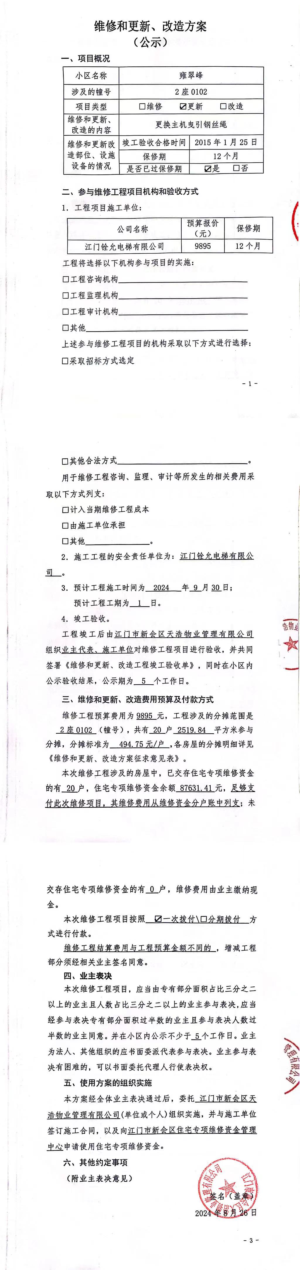 <br/>决定“(一)制定和修改业主大会议事规则”、“(二)制定和修改管理规约”、“(三)选举业主委员会或者更换业主委员会成员”、“(四)选聘和解聘物业服务企业或者其他管理人”、“(五)使用建筑物及其附属设施的维修资金”、“(九)有关共有和共同管理权利的其他重大事项”事项,应当经参与表决专有部分面积过半数的业主且参与表决人数过半数的业主同意。<span style="font-family: 宋体, SimSun; text-indent: 32px;"></span></span></p><p style="text-indent: 2em; line-height: 1.75em;"><span style="font-family: 宋体, SimSun;"></span></p><p style="text-indent: 2em; line-height: 1.75em;"><span style="font-family: 宋体, SimSun;">特此公告。</span></p><p><br/></p><p style="text-align: right; font-family: 宋体; font-size: 16px; line-height: 1.75em;"><span style="font-family: 宋体, SimSun;">江门市新会区天浩物业管理有限公司</span></p><p style="text-align: right; font-family: 宋体; font-size: 16px; line-height: 1.75em;"><span style="font-family: 宋体, SimSun;">2024年09月05日</span></p></font></td>