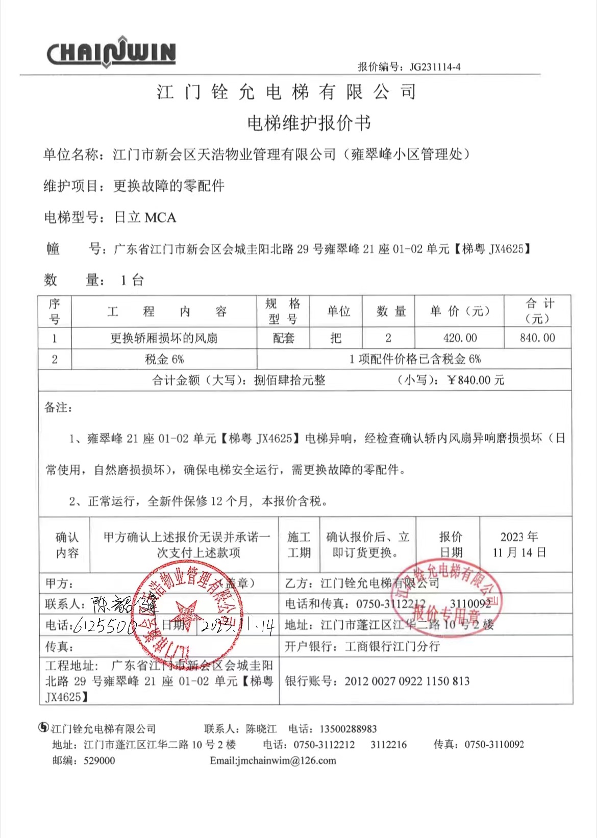 <td VALIGN="top" VALUES="" STYLE="border-width:0" BINDTYPE="0" ROWSPAN="19" COLSPAN="7" DATASOURCE="投票结果" ><font style="font-size:14pt;"><p style="white-space: normal; font-family: 宋体; line-height: 1.75em;">雍翠峰雍翠峰21座全体业主:</p><p style="white-space: normal; font-family: 宋体; line-height: 1.75em; text-indent: 2em;">本小区关于雍翠峰21座0102【梯粤JX4625】电梯更换轿厢损坏的风扇使用维修资金的投票的投票已表决结束,询异时间从2023年11月28日开始,投票询异公示期间,业主可通过微信查询自己的表决情况或可凭身份证件申请查询自己的表决情况;如公示的业主表决情况与查询的本人表决意见不一致的,可以以书面形式向投票组织机构申诉,投票组织机构予以纠正并重新公示表决结果。异议提出人对投票组织机构的处理仍有异议的,可以向街道办事处(镇人民政府)反映处理,涉及住宅专项维修资金的,可向属地住宅专项维修资金管理中心反映处理。</p><p style="white-space: normal;"><br/></p><p style="white-space: normal; font-family: 宋体; line-height: 1.75em;"><strong>附件:</strong></p><p style="white-space: normal; font-family: 宋体; line-height: 1.75em;"><strong>一、投票范围</strong></p><p style="white-space: normal; font-family: 宋体; line-height: 1.75em; text-indent: 2em;">雍翠峰雍翠峰21座</p><p style="white-space: normal; font-family: 宋体; line-height: 1.75em; text-indent: 2em;">总人数(专有部分人数之和):20</p><p style="white-space: normal; font-family: 宋体; line-height: 1.75em; text-indent: 2em;"><span style="font-family: 宋体, SimSun;">总户数:20</span></p><p style="white-space: normal; font-family: 宋体; line-height: 1.75em; text-indent: 2em;">建筑物总面积(专有部分面积之和):3692.24㎡</p><p style="white-space: normal; font-family: 宋体; line-height: 1.75em;"><strong>二、询异公示起止时间</strong></p><p dir="ltr" style="white-space: normal; font-family: 宋体; line-height: 1.75em; text-indent: 2em;"><span style="text-indent: 36px;">2023年11月28日至2023年12月04日</span></p><p style="white-space: normal; font-family: 宋体; line-height: 1.75em;"><strong>三、投票详细描述</strong></p><p style="white-space: normal; font-family: 宋体; line-height: 1.75em; text-indent: 2em;"><p>雍翠峰21座0102【梯粤JX4625】的电梯异响,经检查确认为轿厢内风扇异响磨损损坏(日常使用,自然磨损损坏)已过保修期。现需申请使用维修资金对21座0102电梯【梯粤JX4625】进行维修,工程维修预算金额为840元,项目最终费用以施工合同签订金额为准。维修费用的分摊标准为按分户分摊,每户分摊42元,详见公示附件。如业主不能正常通过微信投票,请联系物业公司进行线下纸质投票,物业电话:0750-6125500</p></p><p style="white-space: normal; font-family: 宋体; line-height: 1.75em;"><strong>四、计票规则</strong></p><p style="white-space: normal; font-family: 宋体; line-height: 1.75em; text-indent: 2em;">表决事项:使用建筑物及其附属设施的维修资金<br /><p style='text-align: left; font-family: 宋体; font-size: 16px; line-height: 1.75em; text-indent: 2em;'>计票规则:弃权票不并入其它项 未表决票不并入其它项</p></p><p style="white-space: normal; font-family: 宋体; line-height: 1.75em;"><strong>五、通过规则</strong></p><p style="white-space: normal; font-family: 宋体; line-height: 1.75em;"><strong><strong style="white-space: normal;"><span style="font-family: 宋体, SimSun;">&nbsp; 根据《中华人民共和国民法典》第二百七十八条规定:业主共同决定事项,应当由专有部分面积占比三分之二以上的业主且人数占比三分之二以上的业主参与表决。</span></strong></strong></p><p style="white-space: normal; font-family: 宋体; line-height: 1.75em; text-indent: 2em;">表决事项:使用建筑物及其附属设施的维修资金<br /><p style='text-align: left; font-family: 宋体; font-size: 16px; line-height: 1.75em; text-indent: 2em;'>通过规则:参与表决专有部分面积过半数的业主且参与表决人数过半数的业主同意</p></p><p style="white-space: normal; font-family: 宋体; line-height: 1.75em;"><strong>六、投票结果</strong></p><p style="white-space: normal; font-family: 宋体; line-height: 1.75em; text-indent: 2em;"><div id='resultTable'><table style='table-layout: fixed; font-size:12px; margin-top:10px' width='100%' border='0' cellspacing='0' cellpadding='0'><tr><td height='28' colspan='10' align='center' style='border: 1px solid #666'><strong style='font-size: 14px;'> 使用建筑物及其附属设施的维修资金</strong></td> </tr><tr id='trfirst'><td height='28' colspan='4' style='border-left: 1px solid #666; border-bottom: 1px solid #666'><strong> 申报单位:</strong> 江门市新会区天浩物业管理有限公司</td><td colspan='3' style='border-left: 1px solid #666; border-bottom: 1px solid #666'><strong> 联系方式:</strong> </td><td colspan='3' style='border-left: 1px solid #666; border-bottom: 1px solid #666; border-right: 1px solid #666'><strong> 申报日期:</strong> 2023年11月14日 </td></tr><tr> <td height='28' colspan='5' style='border-left: 1px solid #666; border-bottom: 1px solid #666'><strong> 总人数(专有部分人数之和):</strong>20人 </td><td colspan='5' style='border-left: 1px solid #666; border-bottom: 1px solid #666; border-right: 1px solid #666'><strong> 建筑物总面积(专有部分面积之和):</strong>3692.24㎡ </td> </tr><tr><td height='28' colspan='10' bgcolor='#F3F3F3' style='border-left: 1px solid #666;border-bottom: 1px solid #666;border-right: 1px solid #666'><strong> 参与人数及面积统计</strong></td></tr><tr><td height='28' colspan='5' style='border-left: 1px solid #666; border-bottom: 1px solid #666'><strong> 参与表决专有部分人数
