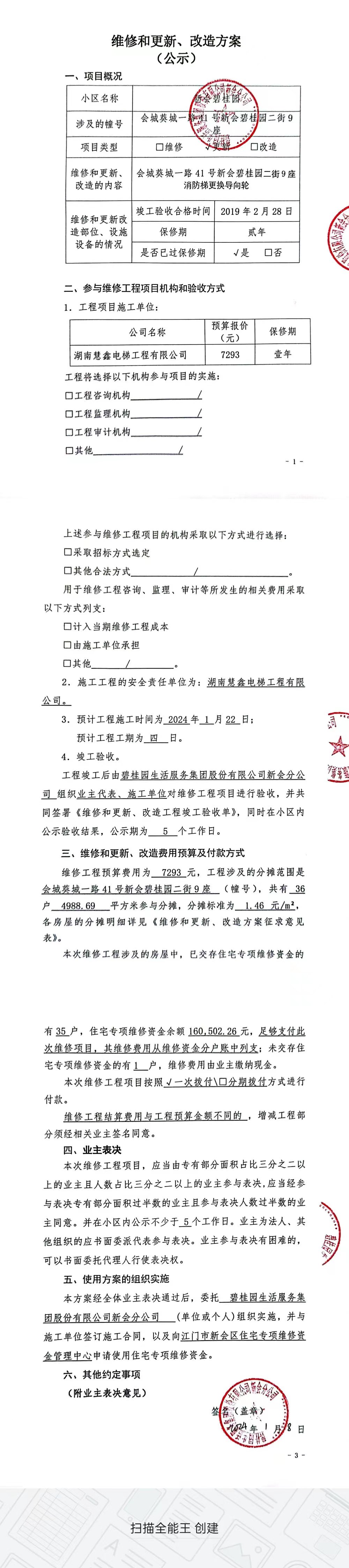 <td valign="top" values="" style="border-width:0" bindtype="0" rowspan="17" colspan="7" datasource="投票结果"><font style=" font-family:方正小标宋简体;font-size:14pt;"><p style="line-height: 1.75em;"><span style="font-family: 宋体, SimSun;">各位尊敬的业主:</span><br></p><p style="text-indent: 2em; line-height: 1.75em;"><span style="font-family: 宋体, SimSun;">根据法律法规的规定,本小区业主利用“江门市物业事项表决管理系统”已对本小区公共事务决策事项进行了表决,在经过7日的询异公示期后,未收到业主有效的异议。现将投票结果公告,并就产生的法律效力说明如下:</span></p><p style="line-height: 1.75em; text-indent: 0em;"><strong style="text-indent: 2em;"><span style="font-family: 宋体, SimSun;">一、投票范围</span></strong></p><p style="text-indent: 2em; line-height: 1.75em;"><span style="font-family: 宋体, SimSun;">新会碧桂园葵城一路41号02街09座</span></p><p style="text-indent: 2em; line-height: 1.75em;"><span style="font-family: 宋体, SimSun;">总人数(专有部分人数之和):36</span></p><p style="text-indent: 2em; line-height: 1.75em;"><span style="font-family: 宋体, SimSun;"><span style="font-family: 宋体, SimSun; text-indent: 32px;"><span style="font-family: 宋体; text-indent: 32px;"><span style="font-family: 宋体; text-indent: 32px;">总户数:36</span></span></span></span></p><p style="text-indent: 2em; line-height: 1.75em;"><span style="font-family: 宋体, SimSun;">建筑物总面积(专有部分面积之和):4988.69㎡</span></p><p style="line-height: 1.75em;"><strong><span style="font-family: 宋体, SimSun;">二、投票结果公告时间</span></strong></p><p style="text-indent: 2em; line-height: 1.75em;"><span style="font-family: 宋体, SimSun;">从2024年01月24日开始</span></p><p style="line-height: 1.75em;"><strong><span style="font-family: 宋体, SimSun;">三、计票规则</span></strong></p><p style="text-indent: 2em; line-height: 1.75em;"><span style="font-family: 宋体, SimSun;">表决事项:使用建筑物及其附属设施的维修资金<br></span></p><p style="font-family: 宋体, SimSun;line-height: 1.75em; text-indent: 2em;">计票规则:弃权票不并入其它项 未表决票不并入其它项</p><p></p><p style="line-height: 1.75em;"><strong><span style="font-family: 宋体, SimSun;">四、通过规则</span></strong></p><p style="line-height: 1.75em;"><strong><span style="font-family: 宋体, SimSun;"> 根据《中华人民共和国民法典》第二百七十八条规定:业主共同决定事项,应当由专有部分面积占比三分之二以上的业主且人数占比三分之二以上的业主参与表决。</span></strong></p><p style="text-indent: 2em; line-height: 1.75em;"><span style="font-family: 宋体, SimSun;"><span style="font-family: 宋体, SimSun; text-indent: 32px;">表决事项:使用建筑物及其附属设施的维修资金<br></span></span></p><p style="font-family: 宋体, SimSun;line-height: 1.75em; text-indent: 2em;">通过规则:参与表决专有部分面积过半数的业主且参与表决人数过半数的业主同意</p><p></p><p style="line-height: 1.75em;"><strong><span style="font-family: 宋体, SimSun;">五、投票结果</span></strong></p><p style="line-height: 1.75em; text-indent: 2em;"><span style="font-family: 宋体, SimSun; text-indent: 2em;"></span></p><div id="resultTable"><table style="table-layout: fixed; font-size:12px; margin-top:10px" width="100%" border="0" cellspacing="0" cellpadding="0"><tbody><tr><td height="28" colspan="10" align="center" style="border: 1px solid #666"><strong style="font-size: 14px;"> 使用建筑物及其附属设施的维修资金</strong></td> </tr><tr id="trfirst"><td height="28" colspan="4" style="border-left: 1px solid #666; border-bottom: 1px solid #666"><strong> 申报单位:</strong> 碧桂园生活服务集团股份有限公司新会分公司</td><td colspan="3" style="border-left: 1px solid #666; border-bottom: 1px solid #666"><strong> 联系方式:</strong> </td><td colspan="3" style="border-left: 1px solid #666; border-bottom: 1px solid #666; border-right: 1px solid #666"><strong> 申报日期:</strong> 2024年1月9日 </td></tr><tr> <td height="28" colspan="5" style="border-left: 1px solid #666; border-bottom: 1px solid #666"><strong> 总人数(专有部分人数之和):</strong>36人 </td><td colspan="5" style="border-left: 1px solid #666; border-bottom: 1px solid #666; border-right: 1px solid #666"><strong> 建筑物总面积(专有部分面积之和):</strong>4988.69㎡ </td> </tr><tr><td height="28" colspan="10" bgcolor="#F3F3F3" style="border-left: 1px solid #666;border-bottom: 1px solid #666;border-right: 1px solid #666"><strong> 参与人数及面积统计</strong></td></tr><tr><td height="28" colspan="5" style="border-left: 1px solid #666; border-bottom: 1px solid #666"><strong> 参与表决专有部分人数之和:</strong>26人</td><td colspan="5" style="border-left: 1px solid #666; border-bottom: 1px solid #666; border-right: 1px solid #666"><strong> 参与表决占有表决权总人数比例:</strong>72.22%</td></tr><tr><td height="28" colspan="5" style="border-left: 1px solid #666; border-bottom: 1px solid #666"><strong> 参与表决专有部分面积之和:</strong>3600.20㎡</td><td colspan="5" style="border-left: 1px solid #666; border-bottom: 1px solid #666; border-right: 1px solid #666"><strong> 参与表决占有表决权总面积比例:</strong>72.17%</td></tr><tr><td height="28" colspan="10" bgcolor="#F3F3F3" style="border-left: 1px solid #666; border-bottom: 1px solid #666;border-right: 1px solid #666"> <strong> 未参与人数及面积统计</strong></td> </tr><tr><td height="28" colspan="5" style="border-left: 1px solid #666; border-bottom: 1px solid #666"><strong> 未参与表决专有部分人数之和:</strong>10人 </td><td colspan="5" style="border-left: 1px solid #666; border-bottom: 1px solid #666; border-ri