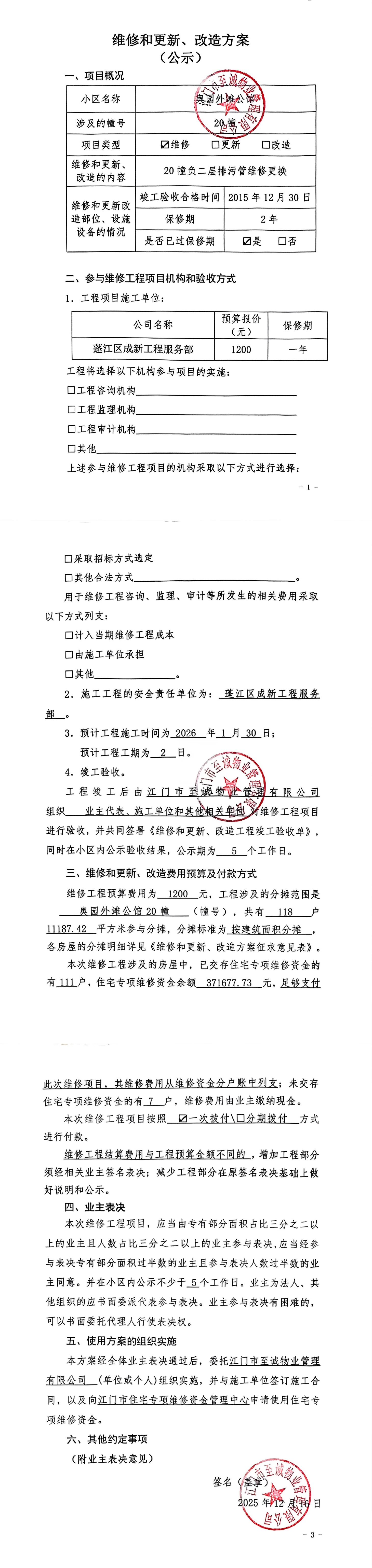 <br/>现对小区20幢负二层排污管维修更换,工程维修预算金额为1200元,项目最终费用以施工合同签订金额为准。因已过保修期,维修费用由相关业主按建筑面积分摊,每平方约0.11元,详见公示附件。如业主手机不能正常通过微信投票,请联系物业公司进行线下纸质投票,物业电话:0750-3851968。</p><p style="white-space: normal; font-family: 宋体; line-height: 1.75em;"><strong>四、计票规则</strong></p><p style="white-space: normal; font-family: 宋体; line-height: 1.75em; text-indent: 2em;">表决事项:使用建筑物及其附属设施的维修资金<br /><p style='text-align: left; font-family: 宋体; font-size: 16px; line-height: 1.75em; text-indent: 2em;'>计票规则:弃权票不并入其它项 未表决票不并入其它项</p></p><p style="white-space: normal; font-family: 宋体; line-height: 1.75em;"><strong>五、通过规则</strong></p><p style="white-space: normal; font-family: 宋体; line-height: 1.75em;"><strong><strong style="white-space: normal;"><span style="font-family: 宋体, SimSun;"> 根据《中华人民共和国民法典》第二百七十八条规定:业主共同决定事项,应当由专有部分面积占比三分之二以上的业主且人数占比三分之二以上的业主参与表决。</span></strong></strong></p><p style="white-space: normal; font-family: 宋体; line-height: 1.75em; text-indent: 2em;">表决事项:使用建筑物及其附属设施的维修资金<br /><p style='text-align: left; font-family: 宋体; font-size: 16px; line-height: 1.75em; text-indent: 2em;'>通过规则:双2/3以上参与表决,参与表决双过半同意</p></p><p style="white-space: normal; font-family: 宋体; line-height: 1.75em;"><strong>六、投票结果</strong></p><p style="white-space: normal; font-family: 宋体; line-height: 1.75em; text-indent: 2em;"><div id='resultTable'><table style='table-layout: fixed; font-size:12px; margin-top:10px' width='100%' border='0' cellspacing='0' cellpadding='0'><tr><td height='28' colspan='10' align='center' style='border: 1px solid #666'><strong style='font-size: 14px;'> 使用建筑物及其附属设施的维修资金</strong></td> </tr><tr id='trfirst'><td height='28' colspan='4' style='border-left: 1px solid #666; border-bottom: 1px solid #666'><strong> 申报单位:</strong> 江门市至诚物业管理有限公司</td><td colspan='3' style='border-left: 1px solid #666; border-bottom: 1px solid #666'><strong> 联系方式:</strong> 3851968 </td><td colspan='3' style='border-left: 1px solid #666; border-bottom: 1px solid #666; border-right: 1px solid #666'><strong> 申报日期:</strong> 2025年12月16日 </td></tr><tr> <td height='28' colspan='5' style='border-left: 1px solid #666; border-bottom: 1px solid #666'><strong> 总人数(专有部分人数之和):</strong>118人 </td><td colspan='5' style='border-left: 1px solid #666; border-bottom: 1px solid #666; border-right: 1px solid #666'><strong> 建筑物总面积(专有部分面积之和):</strong>11187.42㎡ </td> </tr><tr><td height='28' colspan='10' bgcolor='#F3F3F3' style='border-left: 1px solid #666;border-bottom: 1px solid #666;border-right: 1px solid #666'><strong> 参与人数及面积统计</strong></td></tr><tr><td height='28' colspan='5' style='border-left: 1px solid #666; border-bottom: 1px solid #666'><strong> 参与表决专有部分人数之和:</strong>82人</td><td colspan='5' style='border-left: 1px solid #666; border-bottom: 1px solid #666; border-right: 1px solid #666'><strong> 参与表决占有表决权总人数比例:</strong>69.49%</td></tr><tr><td height='28' colspan='5' style='border-left: 1px solid #666; border-bottom: 1px solid #666'><strong> 参与表决专有部分面积之和:</strong>7799.54㎡</td><td colspan='5' style='border-left: 1px solid #666; border-bottom: 1px solid #666; border-right: 1px solid #666'><strong> 参与表决占有表决权总面积比例:</strong>69.72%</td></tr><tr><td height='28' colspan='10' bgcolor='#F3F3F3' style='border-left: 1px solid #666; border-bottom: 1px solid #666;border-right: 1px solid #666'> <strong> 参与表决同意人数及面积统计</strong></td> </tr><tr><td height='28' colspan='5' style='border-left: 1px solid #666; border-bottom: 1px solid #666'><strong> 参与表决同意人数:</strong>81人 </td><td colspan='5' style='border-left: 1px solid #666; border-bottom: 1px solid #666; border-right: 1px solid #666'><strong> 参与表决同意人数占参与表决人数比例:</strong>98.78%</td></tr><tr><td height='28' colspan='5' style='border-left: 1px solid #666; border-bottom: 1px solid #666'><strong> 参与表决同意面积:</strong>7715.73㎡</td><td colspan='5' style='border-left: 1px solid #666; border-bottom: 1px solid #666; border-right: 1px solid #666'><strong> 参与表决同意面积占参与表决面积比例:</strong>98.93% </td> </tr><tr><td width='6%' rowspan='2' align='center' bgcolor='#F3F3F3' style='border-left: 1px solid #666; border-bottom: 1px solid #666'><strong>序号</strong></td><td width='11%' rowspan='2' align='center' bgcolor='#F3F3F3' style='border-left: 1px solid #666; border-bottom: 1px solid #666'><strong>候选项</strong></td><td height='28' colspan='2' align='center' bgcolor='#F3F3F3' style='border-left: 1px solid #666; border-bottom: 1px solid #666'><strong>表决人数情况</strong> </td><td colspan='2' align='center' bgcolor='#F3F3F3' style='border-left: 1px solid #666; border-bottom: 1px solid #666'><strong>表决面积情况</strong></td><td colspan='4' align='center' bgcolor='#F3F3F3' style='border-left: 1px solid #666; border-bottom: 1px solid #666; border-right: 1px solid #666'><strong>表决方式</strong></td></tr><tr><td width='11%' height='28' align='center' bgcolor='#F3F3F3' style='border-left: 1px solid #666;border-bottom: 1px solid #666'><strong>参与表<br />决人数</strong> </td><td width='11%' align='center' bgcolor='#F3F3F3' style='border-left: 1px solid #6