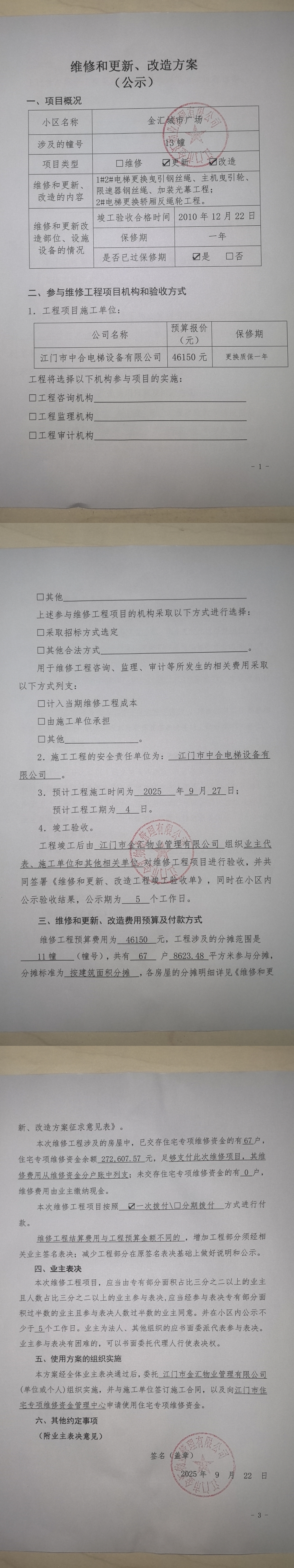 <td VALIGN="top" VALUES="" STYLE="border-width:0" BINDTYPE="0" ROWSPAN="19" COLSPAN="7" DATASOURCE="投票结果" ><font style="font-size:14pt;"><p style="white-space: normal; font-family: 宋体; line-height: 1.75em;">金汇城市广场蓬江区金汇城市广场13幢全体业主:</p><p style="white-space: normal; font-family: 宋体; line-height: 1.75em; text-indent: 2em;">本小区关于金汇城市广场13幢1#2#电梯更换钢丝绳、更换主机曳引轮、更换限速器钢丝绳等等工程维修资金的投票的投票已表决结束,询异时间从2026年03月05日开始,投票询异公示期间,业主可通过微信查询自己的表决情况或可凭身份证件申请查询自己的表决情况;如公示的业主表决情况与查询的本人表决意见不一致的,可以以书面形式向投票组织机构申诉,投票组织机构予以纠正并重新公示表决结果。异议提出人对投票组织机构的处理仍有异议的,可以向街道办事处(镇人民政府)反映处理,涉及住宅专项维修资金的,可向属地住宅专项维修资金管理中心反映处理。</p><p style="white-space: normal;"><br/></p><p style="white-space: normal; font-family: 宋体; line-height: 1.75em;"><strong>附件:</strong></p><p style="white-space: normal; font-family: 宋体; line-height: 1.75em;"><strong>一、投票范围</strong></p><p style="white-space: normal; font-family: 宋体; line-height: 1.75em; text-indent: 2em;">金汇城市广场蓬江区金汇城市广场13幢</p><p style="white-space: normal; font-family: 宋体; line-height: 1.75em; text-indent: 2em;">总人数(专有部分人数之和):66</p><p style="white-space: normal; font-family: 宋体; line-height: 1.75em; text-indent: 2em;"><span style="font-family: 宋体, SimSun;"><span style="font-family: 宋体; text-indent: 32px;"><span style="font-family: 宋体; text-indent: 32px;">总户数:67</span></span></span></p><p style="white-space: normal; font-family: 宋体; line-height: 1.75em; text-indent: 2em;">建筑物总面积(专有部分面积之和):8623.48㎡</p><p style="white-space: normal; font-family: 宋体; line-height: 1.75em;"><strong>二、询异公示起止时间</strong></p><p dir="ltr" style="white-space: normal; font-family: 宋体; line-height: 1.75em; text-indent: 2em;"><span style="text-indent: 36px;">2026年03月05日至2026年03月12日</span></p><p style="white-space: normal; font-family: 宋体; line-height: 1.75em;"><strong>三、投票详细描述</strong></p><p style="white-space: normal; font-family: 宋体; line-height: 1.75em; text-indent: 2em;"><p><span style="font-family: "Helvetica Neue", Helvetica, Arial, sans-serif; font-size: 14px; background-color: rgb(255, 255, 255);">金汇城市广场13幢1#2#电梯突然出现故障,经检查,由</span><span style="font-family: "Helvetica Neue", Helvetica, Arial, sans-serif; font-size: 14px; background-color: rgb(255, 255, 255);">于1#2#电梯<span style="font-family: "Helvetica Neue", Helvetica, Arial, sans-serif; font-size: 14px; background-color: rgb(255, 255, 255);">曳引</span>钢丝绳、主机曳引轮、限速器钢丝绳等等的</span><span style="font-family: "Helvetica Neue", Helvetica, Arial, sans-serif; font-size: 14px; background-color: rgb(255, 255, 255);">原件出现老化而不能正常运行。现对</span><span style="font-family: "Helvetica Neue", Helvetica, Arial, sans-serif; font-size: 14px; background-color: rgb(255, 255, 255);"><span style="font-family: "Helvetica Neue", Helvetica, Arial, sans-serif; font-size: 14px; background-color: rgb(255, 255, 255);">13幢1#2#电梯</span></span><span style="font-family: "Helvetica Neue", Helvetica, Arial, sans-serif; font-size: 14px; background-color: rgb(255, 255, 255);">相关设备进行更换,工程维修预算金额为46150元,项目最终费用以施工合同签订金额为准。因已过保修期,维修费用由相关业主按建筑面积分摊,每平方约5.35元,详见公示附件。 如业主手机不能正常通过微信投票,请联系物业公司进行线下纸质投票,物业电话:0750-3929003。</span></p></p><p style="white-space: normal; font-family: 宋体; line-height: 1.75em;"><strong>四、计票规则</strong></p><p style="white-space: normal; font-family: 宋体; line-height: 1.75em; text-indent: 2em;">表决事项:使用建筑物及其附属设施的维修资金<br /><p style='text-align: left; font-family: 宋体; font-size: 16px; line-height: 1.75em; text-indent: 2em;'>计票规则:弃权票不并入其它项 未表决票不并入其它项</p></p><p style="white-space: normal; font-family: 宋体; line-height: 1.75em;"><strong>五、通过规则</strong></p><p style="white-space: normal; font-family: 宋体; line-height: 1.75em;"><strong><strong style="white-space: normal;"><span style="font-family: 宋体, SimSun;"> 根据《中华人民共和国民法典》第二百七十八条规定:业主共同决定事项,应当由专有部分面积占比三分之二以上的业主且人数占比三分之二以上的业主参与表决。</span></strong></strong></p><p style="white-space: normal; font-family: 宋体; line-height: 1.75em; text-indent: 2em;">表决事项:使用建筑物及其附属设施的维修资金<br /><p style='text-align: left; font-family: 宋体; font-size: 16px; line-height: 1.75em; text-indent: 2em;'>通过规则:双2/3以上参与表决,参与表决双过半同意</p></p><p style="white-space: normal; font-family: 宋体; line-height: 1.75em;"><strong>六、投票结果</strong></p><p style="white-space: normal; font-family: 宋体; line-height: 1.75em; text-indent: 2em;"><div id='resultTable'><table style='table-layout: fixed; font-size:12px; margin-top:10px' width='100%' border='0' cellspacing='0' cellpadding='0'><tr><td height='28' colspan='10' align='center' style='border: 1px solid #666'><strong style='font-size: 14px;'> 使用建筑物及其附属设施的维修资金</strong></td> </tr><tr id='trfirst'><td height='28' col