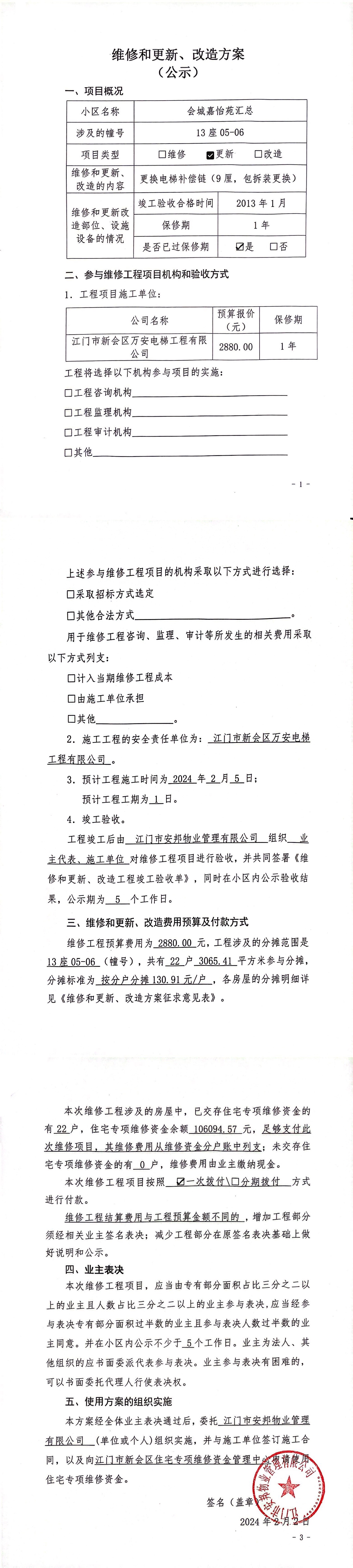 <td VALIGN="top" VALUES="" STYLE="border-width:0" BINDTYPE="0" ROWSPAN="19" COLSPAN="7" DATASOURCE="投票结果" ><font style="font-size:14pt;"><p style="white-space: normal; font-family: 宋体; line-height: 1.75em;">会城嘉怡苑汇总嘉怡苑13座全体业主:</p><p style="white-space: normal; font-family: 宋体; line-height: 1.75em; text-indent: 2em;">本小区关于会城嘉怡苑汇总13座05-06单元更换电梯补偿链使用维修资金的投票的投票已表决结束,询异时间从2024年02月20日开始,投票询异公示期间,业主可通过微信查询自己的表决情况或可凭身份证件申请查询自己的表决情况;如公示的业主表决情况与查询的本人表决意见不一致的,可以以书面形式向投票组织机构申诉,投票组织机构予以纠正并重新公示表决结果。异议提出人对投票组织机构的处理仍有异议的,可以向街道办事处(镇人民政府)反映处理,涉及住宅专项维修资金的,可向属地住宅专项维修资金管理中心反映处理。</p><p style="white-space: normal;"><br/></p><p style="white-space: normal; font-family: 宋体; line-height: 1.75em;"><strong>附件:</strong></p><p style="white-space: normal; font-family: 宋体; line-height: 1.75em;"><strong>一、投票范围</strong></p><p style="white-space: normal; font-family: 宋体; line-height: 1.75em; text-indent: 2em;">会城嘉怡苑汇总嘉怡苑13座</p><p style="white-space: normal; font-family: 宋体; line-height: 1.75em; text-indent: 2em;">总人数(专有部分人数之和):22</p><p style="white-space: normal; font-family: 宋体; line-height: 1.75em; text-indent: 2em;"><span style="font-family: 宋体, SimSun;"><span style="font-family: 宋体; text-indent: 32px;"><span style="font-family: 宋体; text-indent: 32px;">总户数:22</span></span></span></p><p style="white-space: normal; font-family: 宋体; line-height: 1.75em; text-indent: 2em;">建筑物总面积(专有部分面积之和):3065.41㎡</p><p style="white-space: normal; font-family: 宋体; line-height: 1.75em;"><strong>二、询异公示起止时间</strong></p><p dir="ltr" style="white-space: normal; font-family: 宋体; line-height: 1.75em; text-indent: 2em;"><span style="text-indent: 36px;">2024年02月20日至2024年02月26日</span></p><p style="white-space: normal; font-family: 宋体; line-height: 1.75em;"><strong>三、投票详细描述</strong></p><p style="white-space: normal; font-family: 宋体; line-height: 1.75em; text-indent: 2em;"><p><span style="text-wrap: wrap;">本小区13座05-06单元的电梯出现故障,经检查,是由于电梯补偿链的问题,已过保修期。现需申请使用维修资金</span><span style="text-wrap: wrap;">更换</span><span style="text-wrap: wrap;">13座05-06单元电梯补偿链,工程维修预算金额为2880.00元,项目最终费用以施工合同签订金额为准。维修费用的分摊标准为按分户分摊130.91元/户,详见公示附件。如业主手机不能正常通过微信投票,请联系物业公司进行线下纸质投票,物业电话:13923073998。</span></p></p><p style="white-space: normal; font-family: 宋体; line-height: 1.75em;"><strong>四、计票规则</strong></p><p style="white-space: normal; font-family: 宋体; line-height: 1.75em; text-indent: 2em;">表决事项:使用建筑物及其附属设施的维修资金<br /><p style='text-align: left; font-family: 宋体; font-size: 16px; line-height: 1.75em; text-indent: 2em;'>计票规则:弃权票不并入其它项 未表决票不并入其它项</p></p><p style="white-space: normal; font-family: 宋体; line-height: 1.75em;"><strong>五、通过规则</strong></p><p style="white-space: normal; font-family: 宋体; line-height: 1.75em;"><strong><strong style="white-space: normal;"><span style="font-family: 宋体, SimSun;"> 根据《中华人民共和国民法典》第二百七十八条规定:业主共同决定事项,应当由专有部分面积占比三分之二以上的业主且人数占比三分之二以上的业主参与表决。</span></strong></strong></p><p style="white-space: normal; font-family: 宋体; line-height: 1.75em; text-indent: 2em;">表决事项:使用建筑物及其附属设施的维修资金<br /><p style='text-align: left; font-family: 宋体; font-size: 16px; line-height: 1.75em; text-indent: 2em;'>通过规则:双2/3以上参与表决,参与表决双过半同意</p></p><p style="white-space: normal; font-family: 宋体; line-height: 1.75em;"><strong>六、投票结果</strong></p><p style="white-space: normal; font-family: 宋体; line-height: 1.75em; text-indent: 2em;"><div id='resultTable'><table style='table-layout: fixed; font-size:12px; margin-top:10px' width='100%' border='0' cellspacing='0' cellpadding='0'><tr><td height='28' colspan='10' align='center' style='border: 1px solid #666'><strong style='font-size: 14px;'> 使用建筑物及其附属设施的维修资金</strong></td> </tr><tr id='trfirst'><td height='28' colspan='4' style='border-left: 1px solid #666; border-bottom: 1px solid #666'><strong> 申报单位:</strong> 江门市安邦物业管理有限公司</td><td colspan='3' style='border-left: 1px solid #666; border-bottom: 1px solid #666'><strong> 联系方式:</strong> 13923073998 </td><td colspan='3' style='border-left: 1px solid #666; border-bottom: 1px solid #666; border-right: 1px solid #666'><strong> 申报日期:</strong> 2024年2月4日 </td></tr><tr> <td height='28' colspan='5' style='border-left: 1px solid #666; border-bottom: 1px solid #666'><strong> 总人数(专有部分人数之和):</strong>22人 </td><td colspan='5' style='border-left: 1px solid #666; border-bottom: 1px solid #666; border-right: 1px solid #666'><strong> 建筑物总面积(专有部分面积之和):</strong>3065.41㎡ </td> </tr><tr><td height='28' colspan='10' bgcolor='#F3F3F3' style='border-left: 1px solid #666;border-bottom: 1px solid #666;border-right: 1px solid #666'><strong> 参与人数及面积统计</s